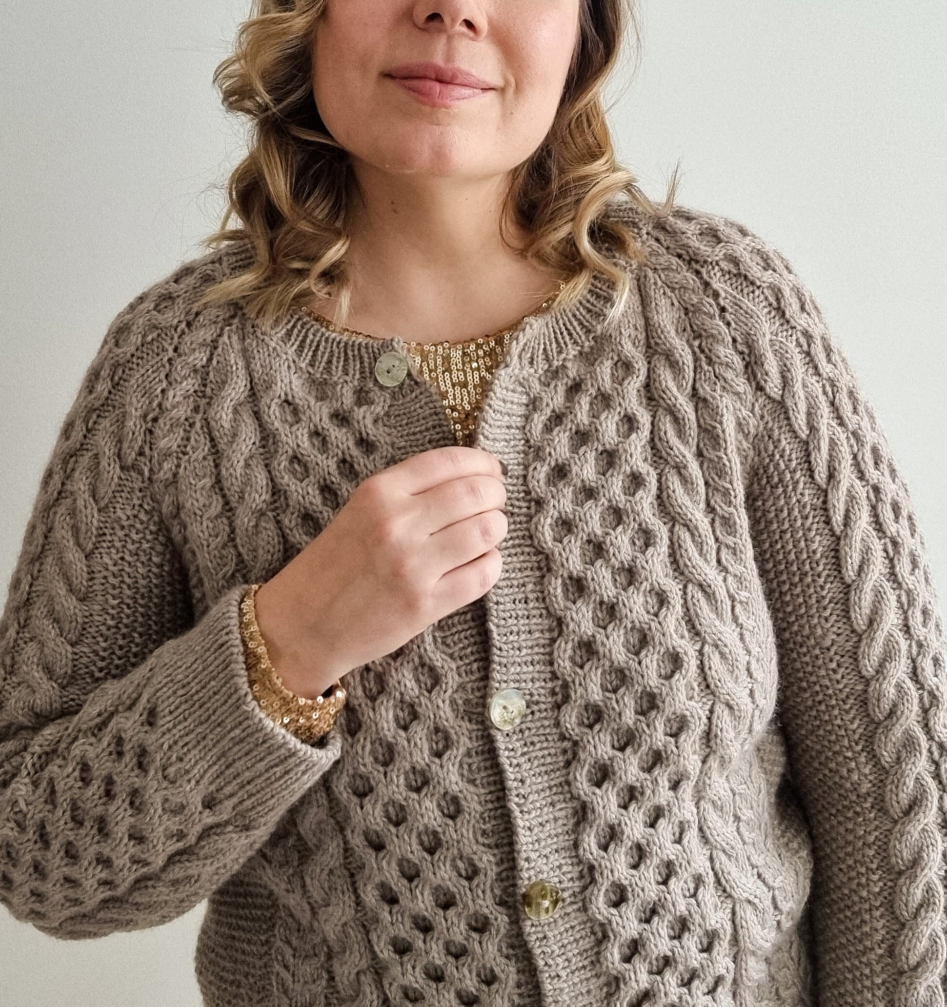 The Billie cardigan is knitted seamlessly top-down starting at the neckline. The cable pattern is easy to memorize and raglan increases over the cable pattern are charted. The sleeves and body are separated at the underarm and knitted separately. Lastly the buttonbands and the neckband are picked up from the body and knitted in the 1x1 ribbing.