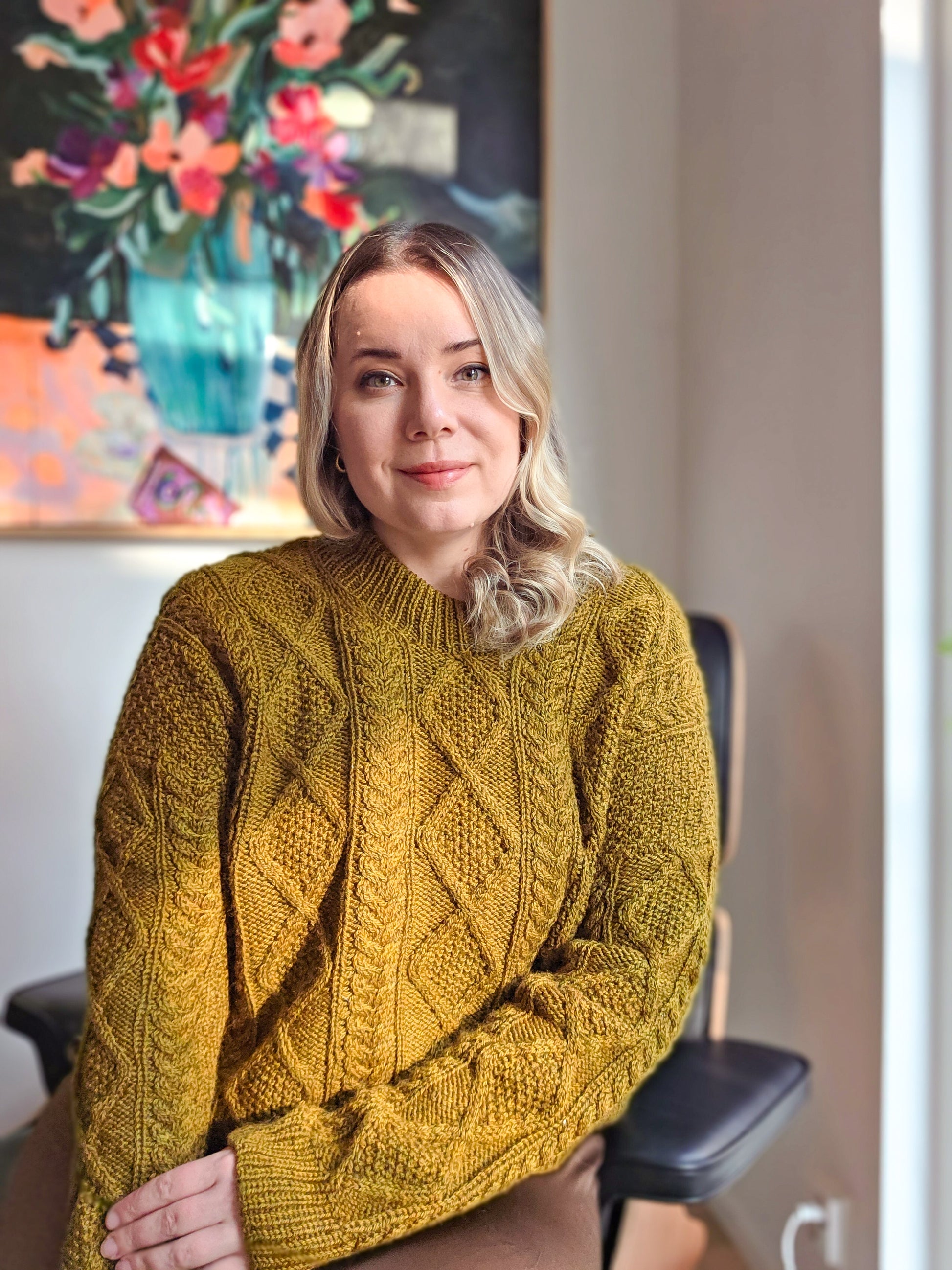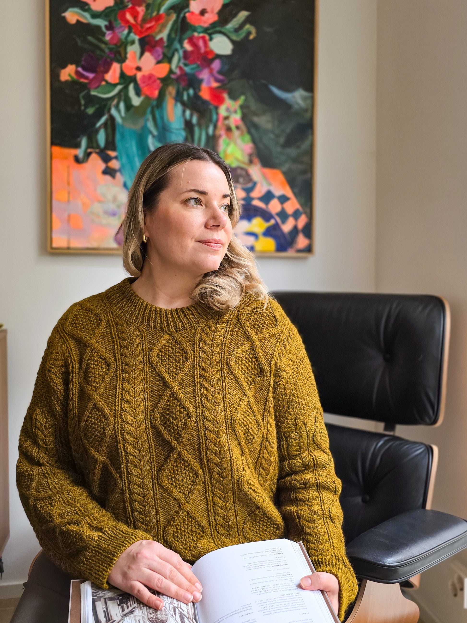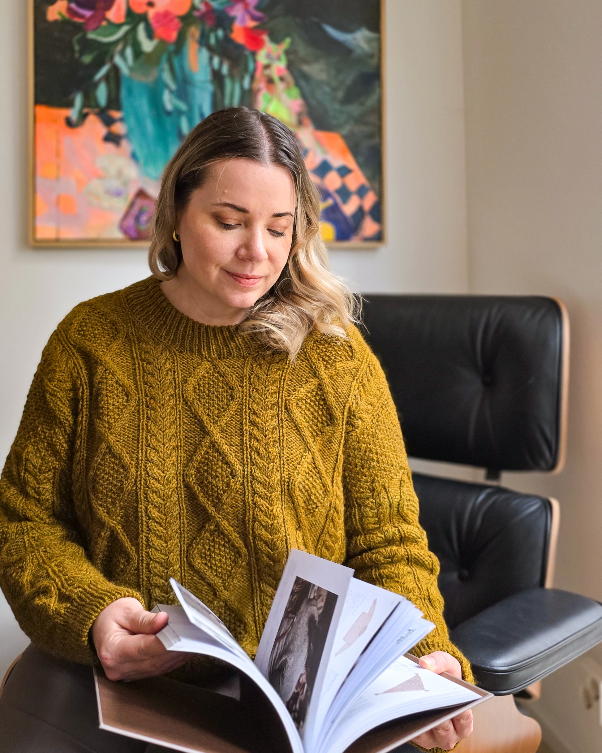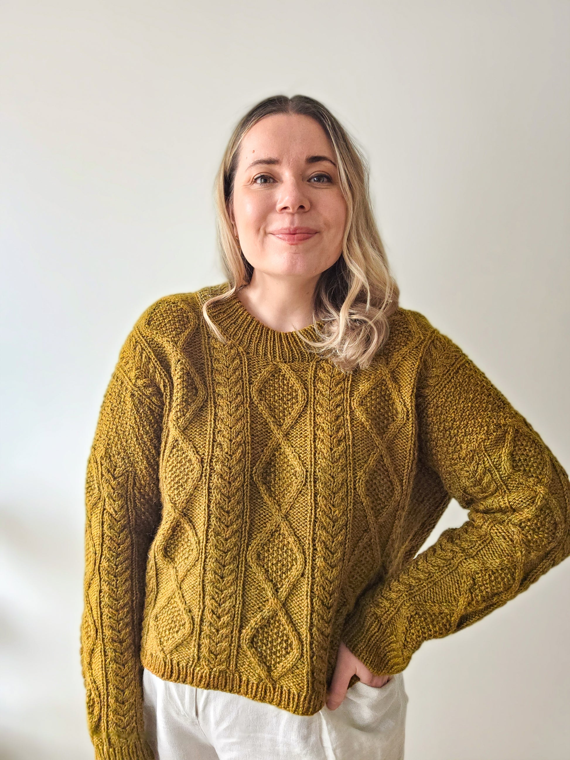 The Book Club pullover has a relaxed and slightly boxy fit. It is knitted seamlessly top down with a diamond cable pattern that is a lot easier than it first appears and is suitable for knitters who are just learning to knit cables.