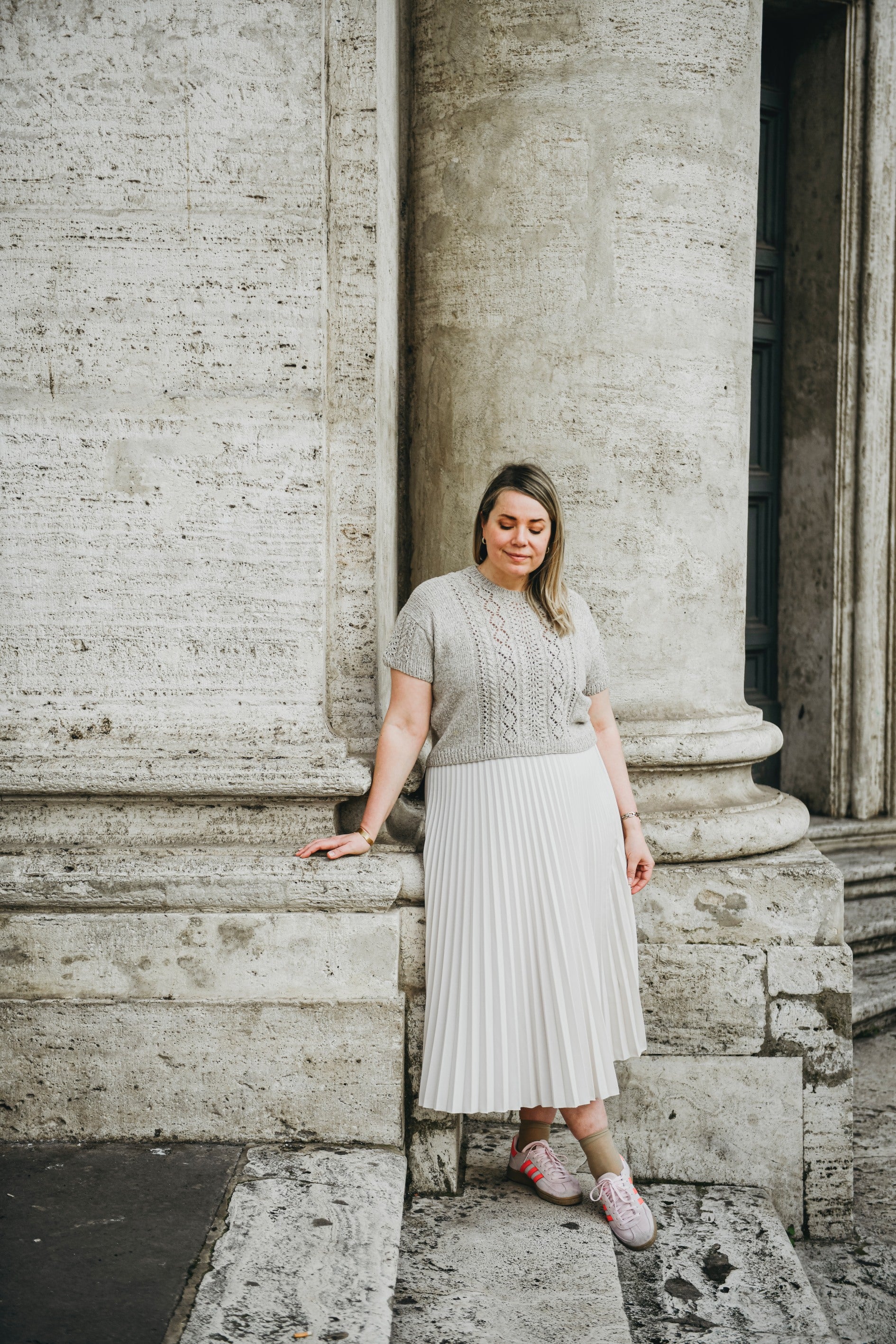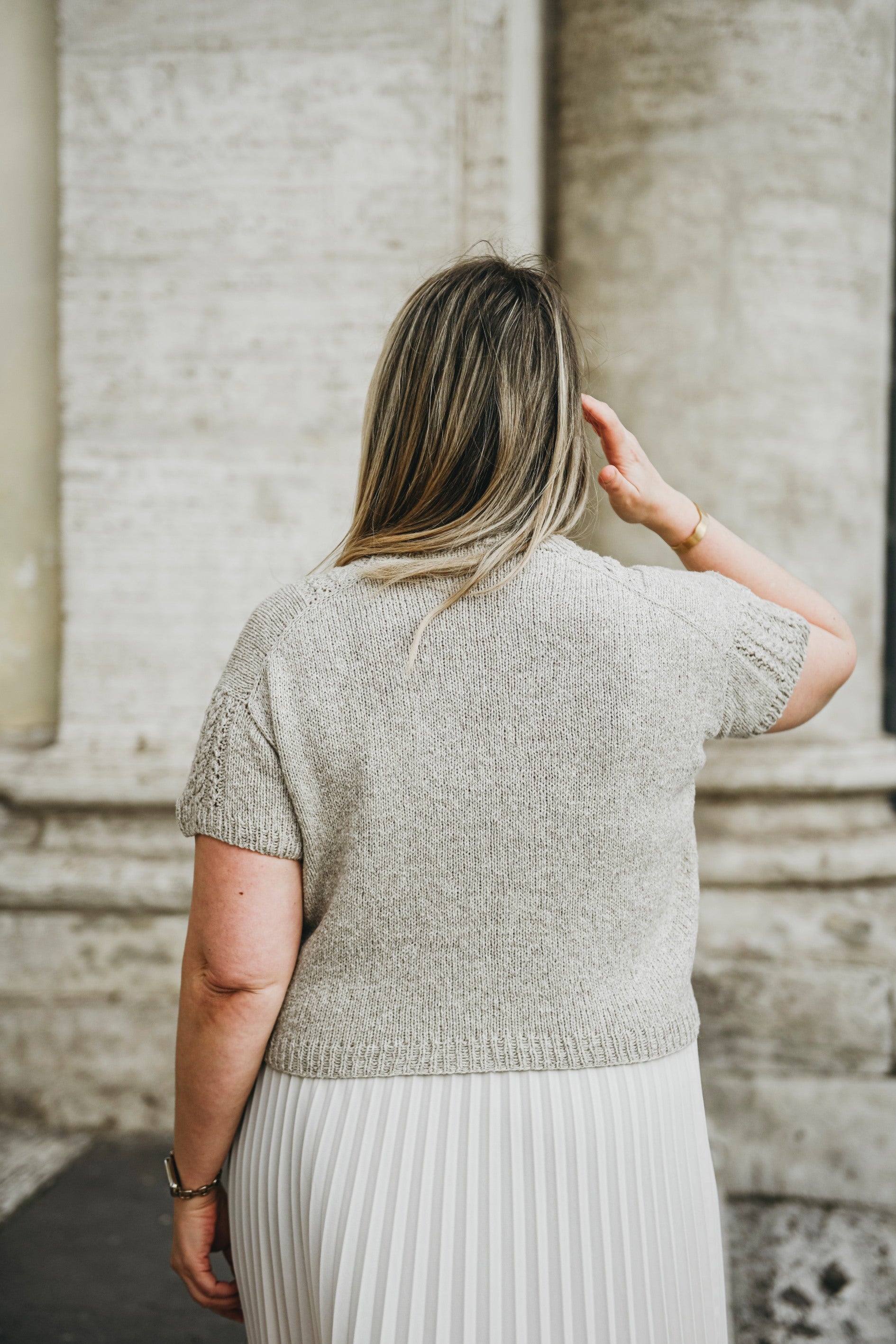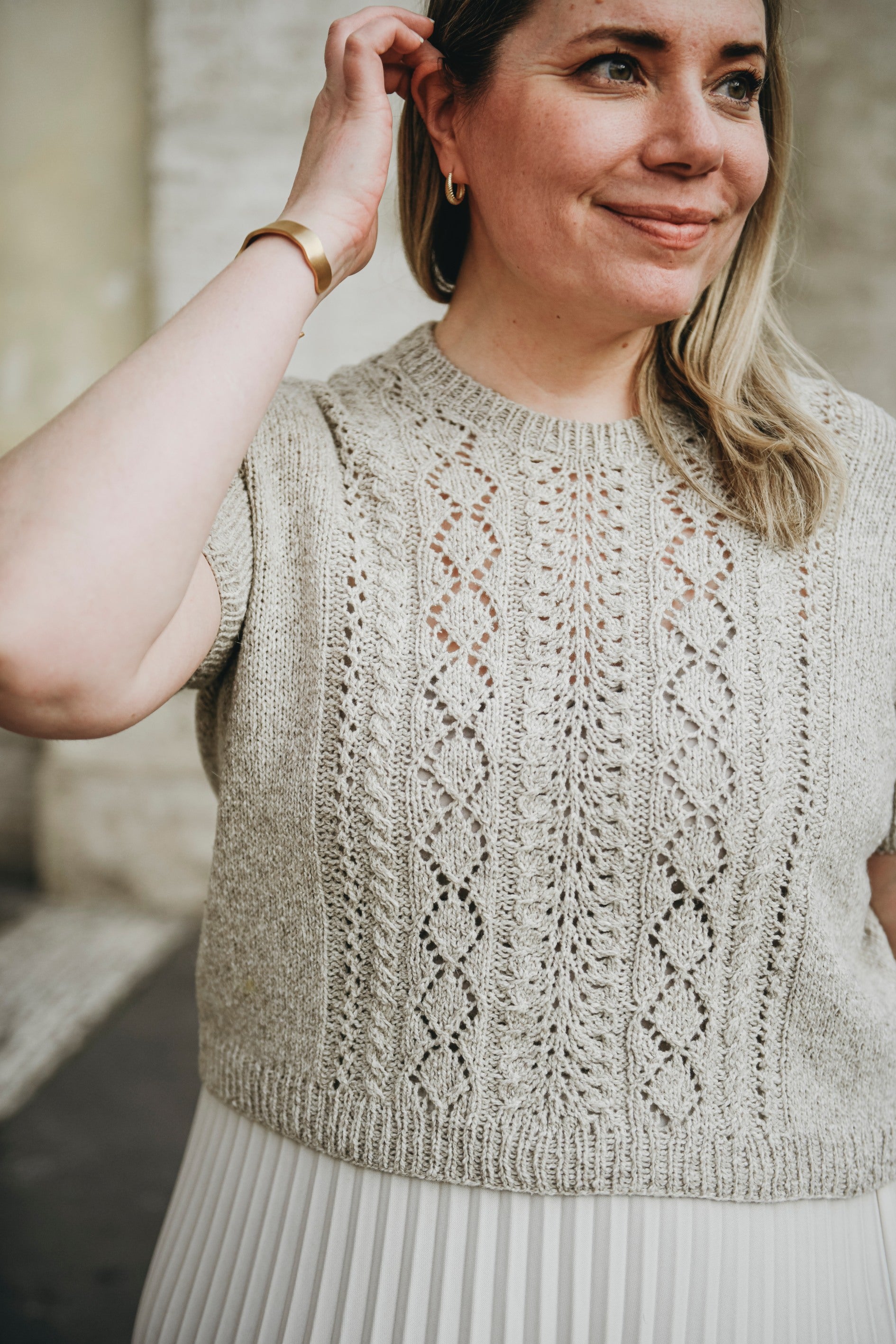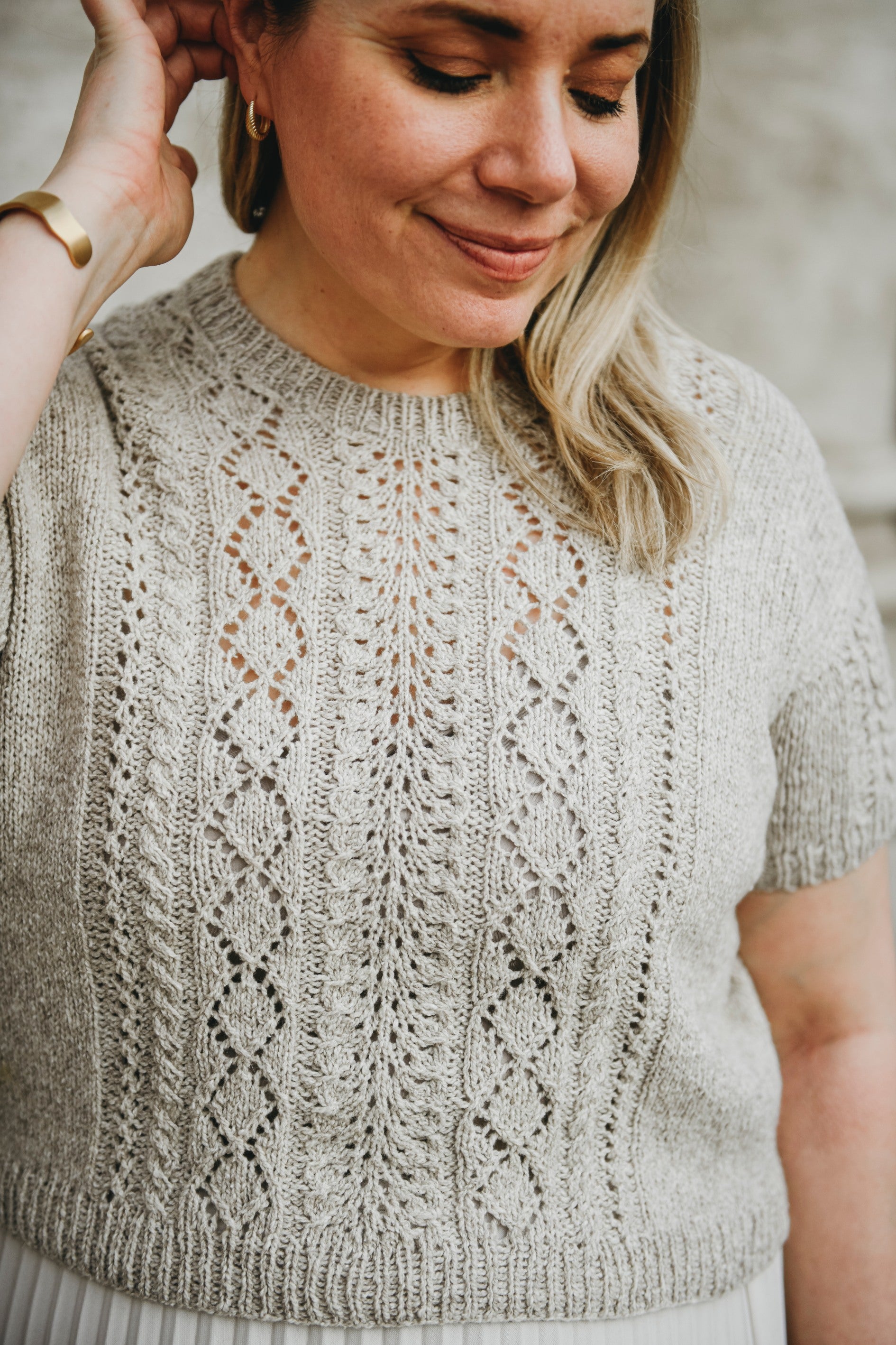 The Dido tee has a boxy fit and dropped shoulders. It is knitted seamlessly top-down with a lace and cable pattern on the front and the sleeves. The tee is started at the back neck and increased to the full width of the back. Then stitches are picked up for the shoulders and worked as the front of the tee. The front and back are joined at the underarm and the body is then worked in the round. The stitches for the sleeves are picked up from the body and the sleeves are worked in the round with a bit of short-row shaping at the sleeve caps to improve the fit. Lastly, stitches for the neckband are picked from the neck opening and worked in ribbing in the round. The neckband, hem and cuffs are finished with a tubular bind off, which provides a beautiful and stretchy edge that looks like the stitches roll over the edge to the other side of the ribbing.