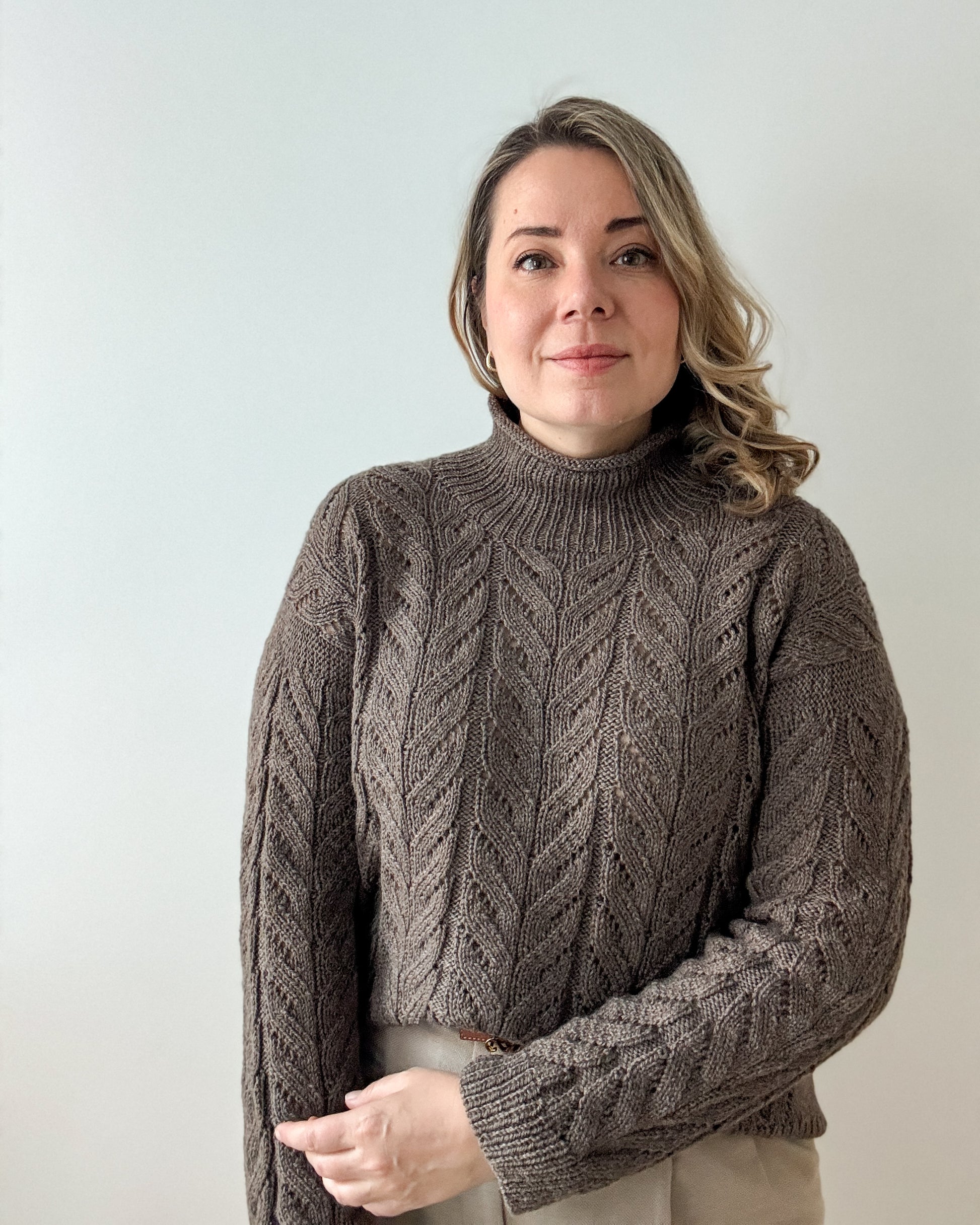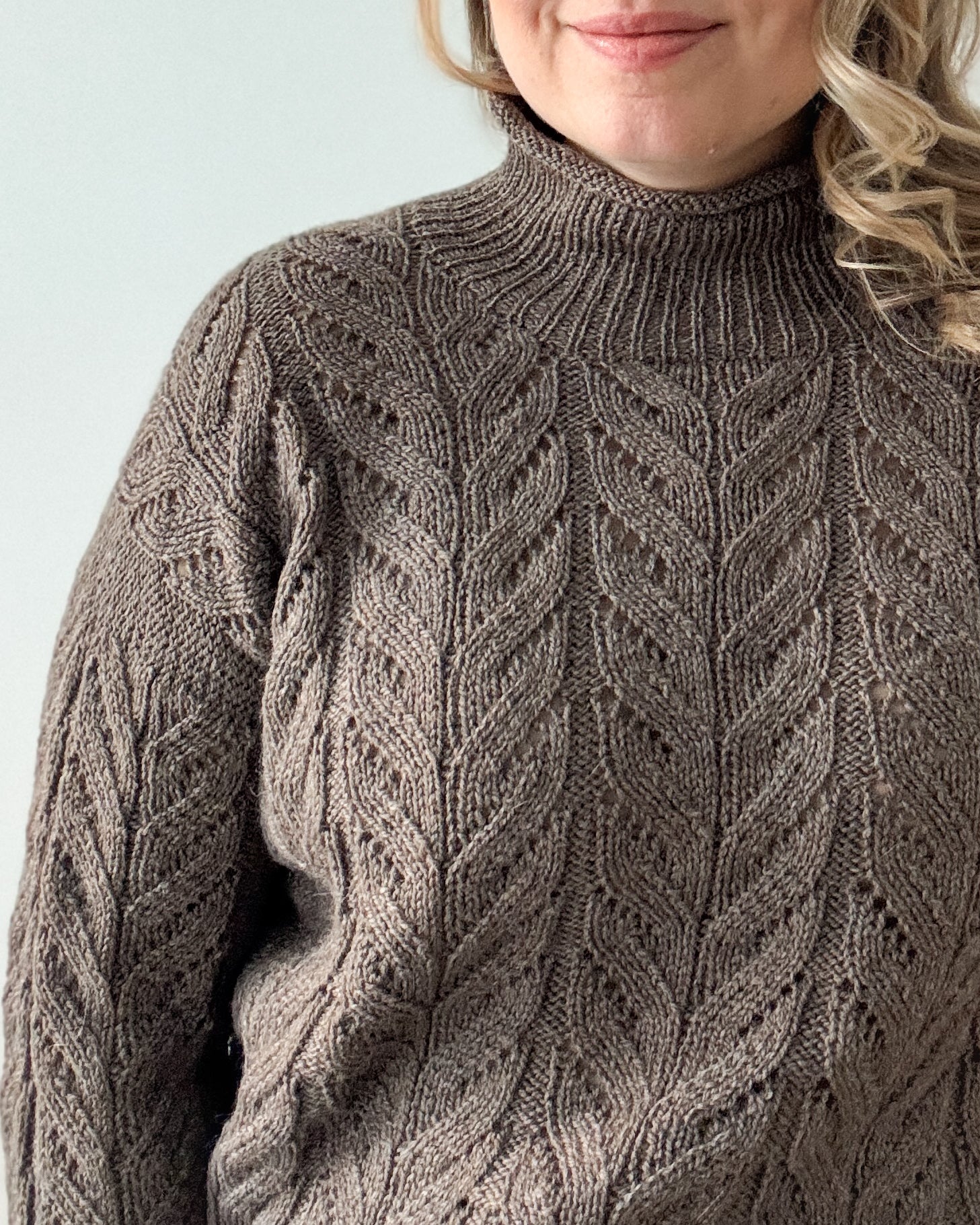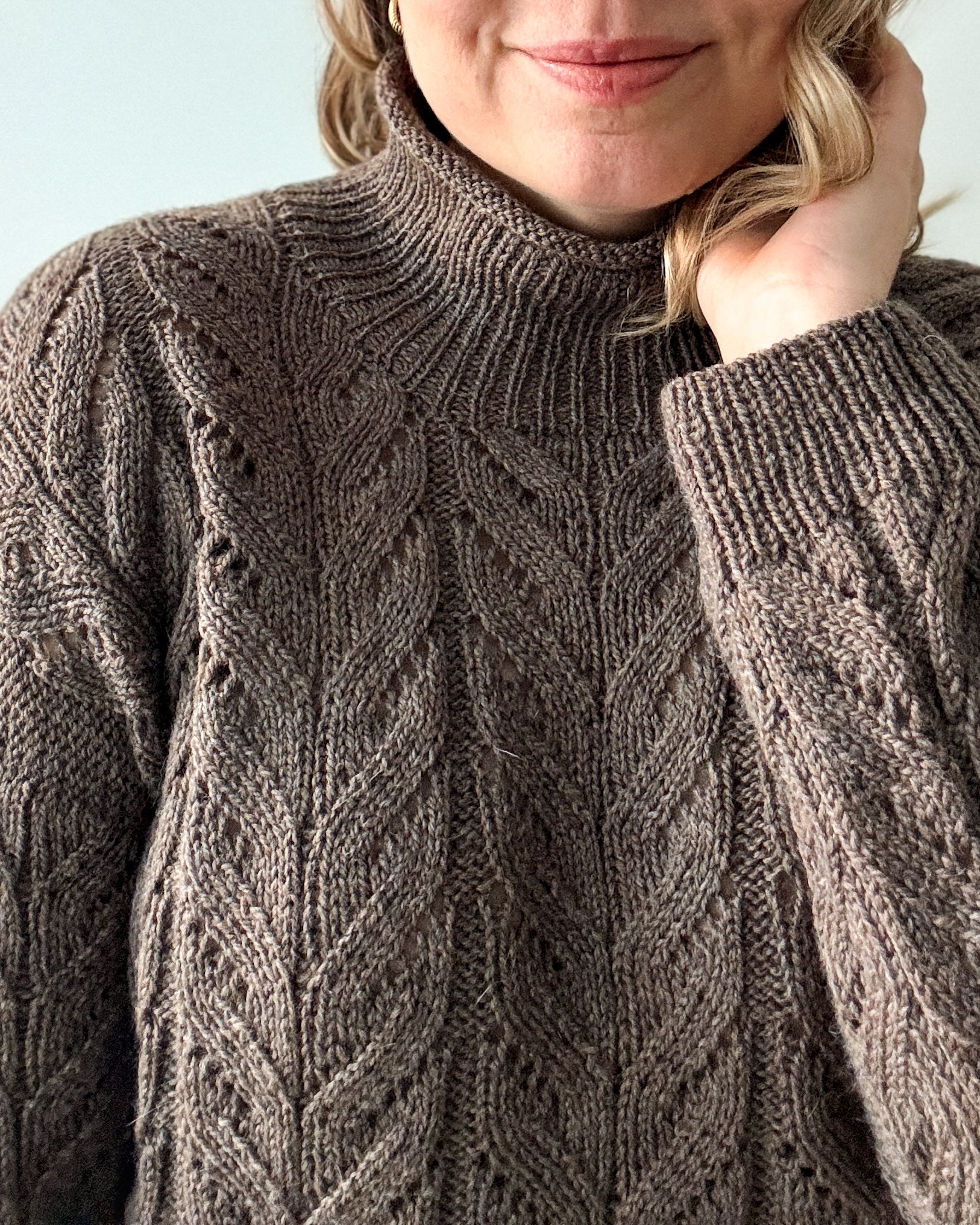 The Ebba pullover has a boxy fit and dropped shoulders. It is knitted seamlessly top-down with a lace pattern that looks like cables.