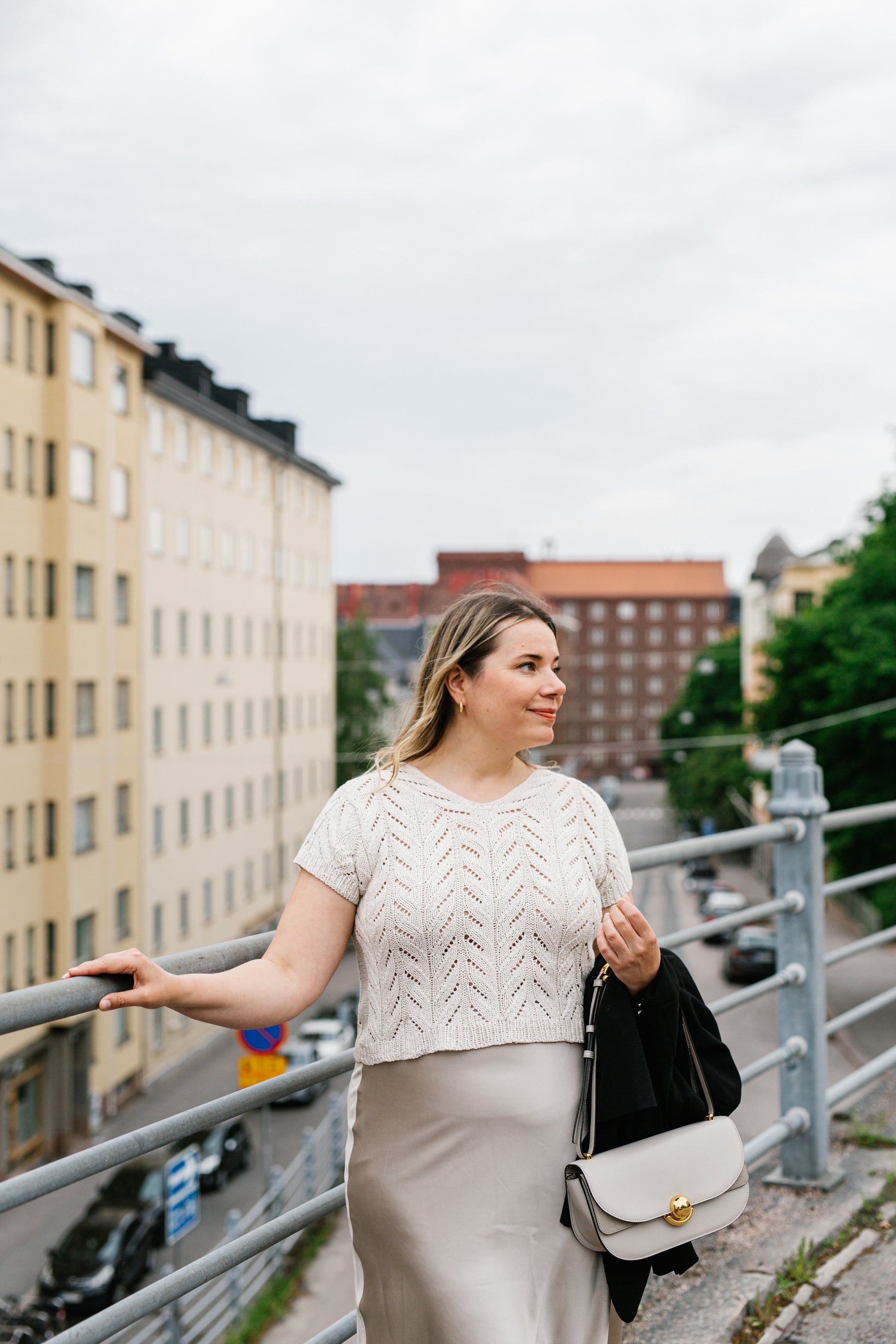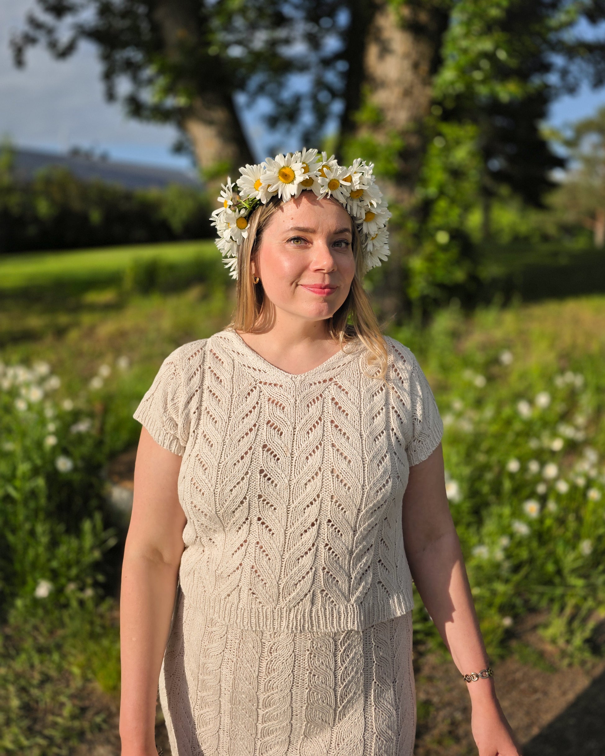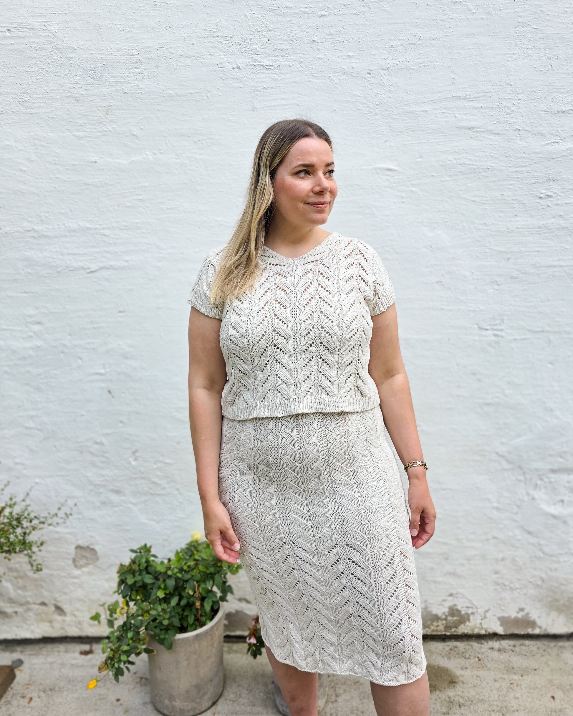 For the stitch patterns to show best, I recommend choosing unicolor or slightly tonal colorways. The Ebba tee is worked in DK weight yarn but you can also knit it by holding one strand of fingering weight yarn together with a strand of silk mohair.