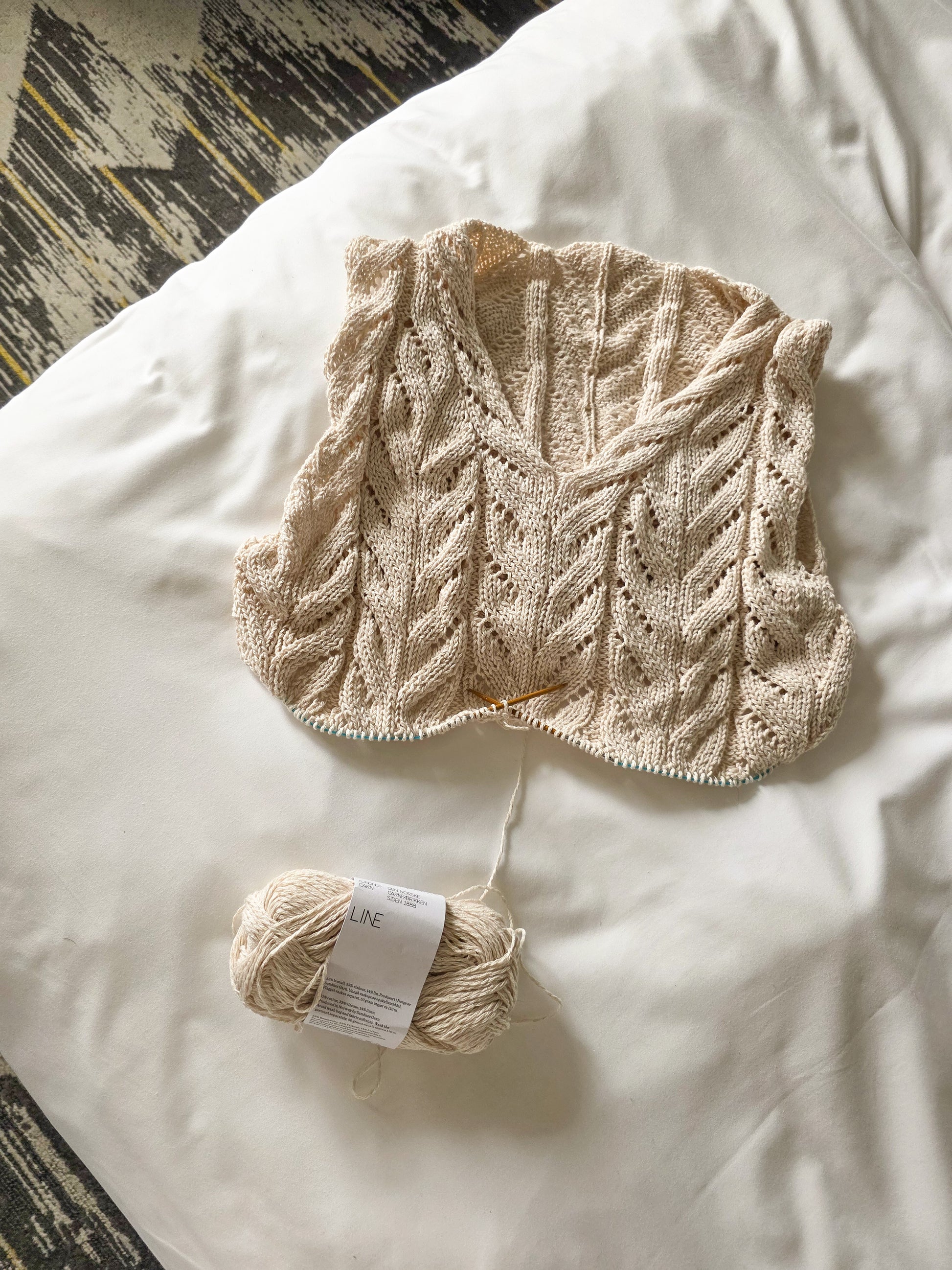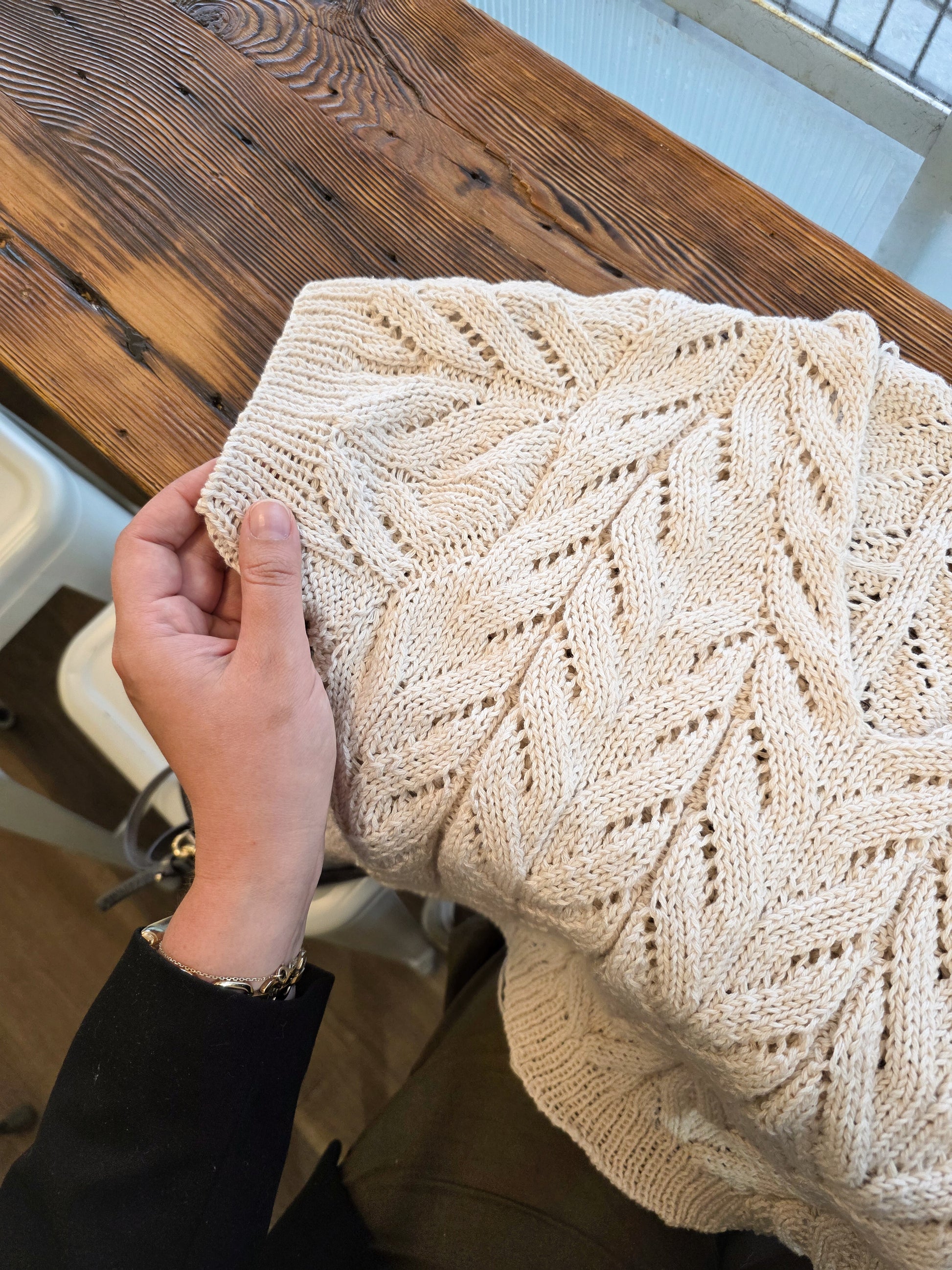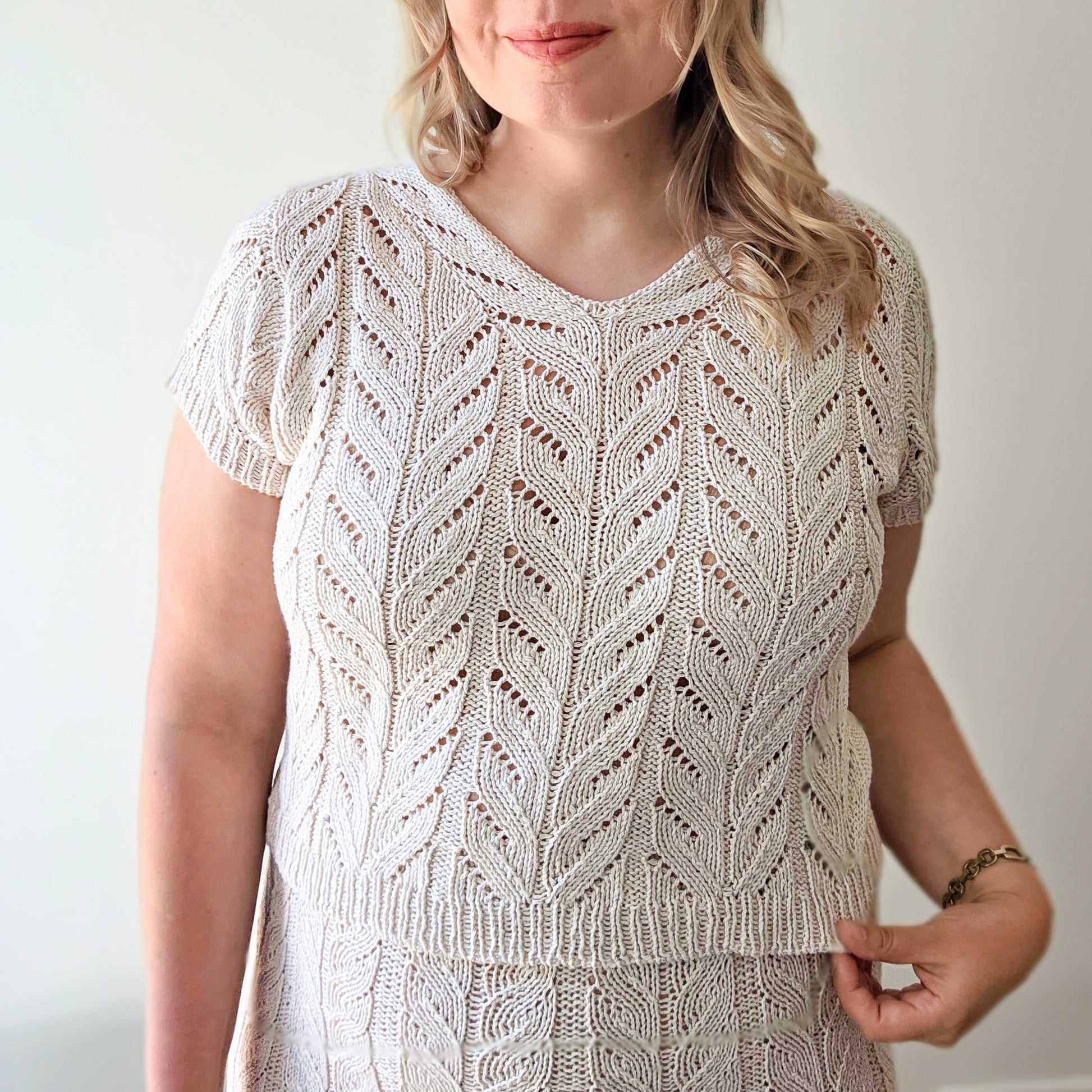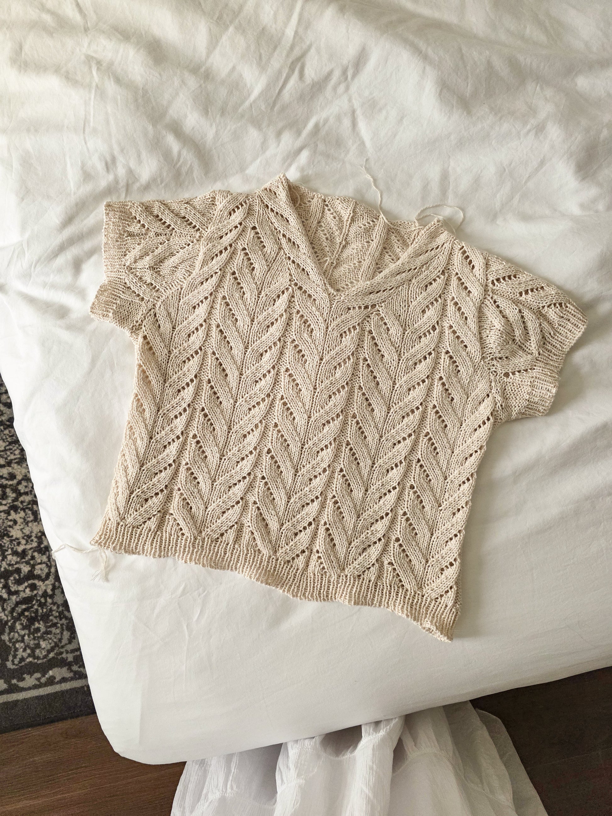 The Ebba tee is knitted seamlessly top-down with a lace pattern that looks like cables. The lace pattern follows the neck shaping on the front, then joining at the bottom of the v-neck. The increases in the lace pattern are fully charted.