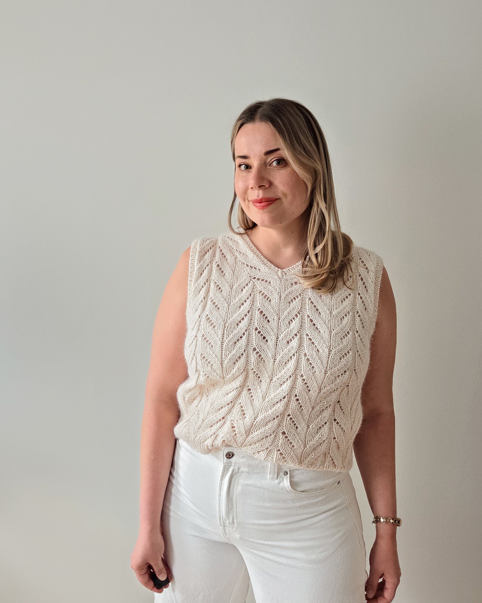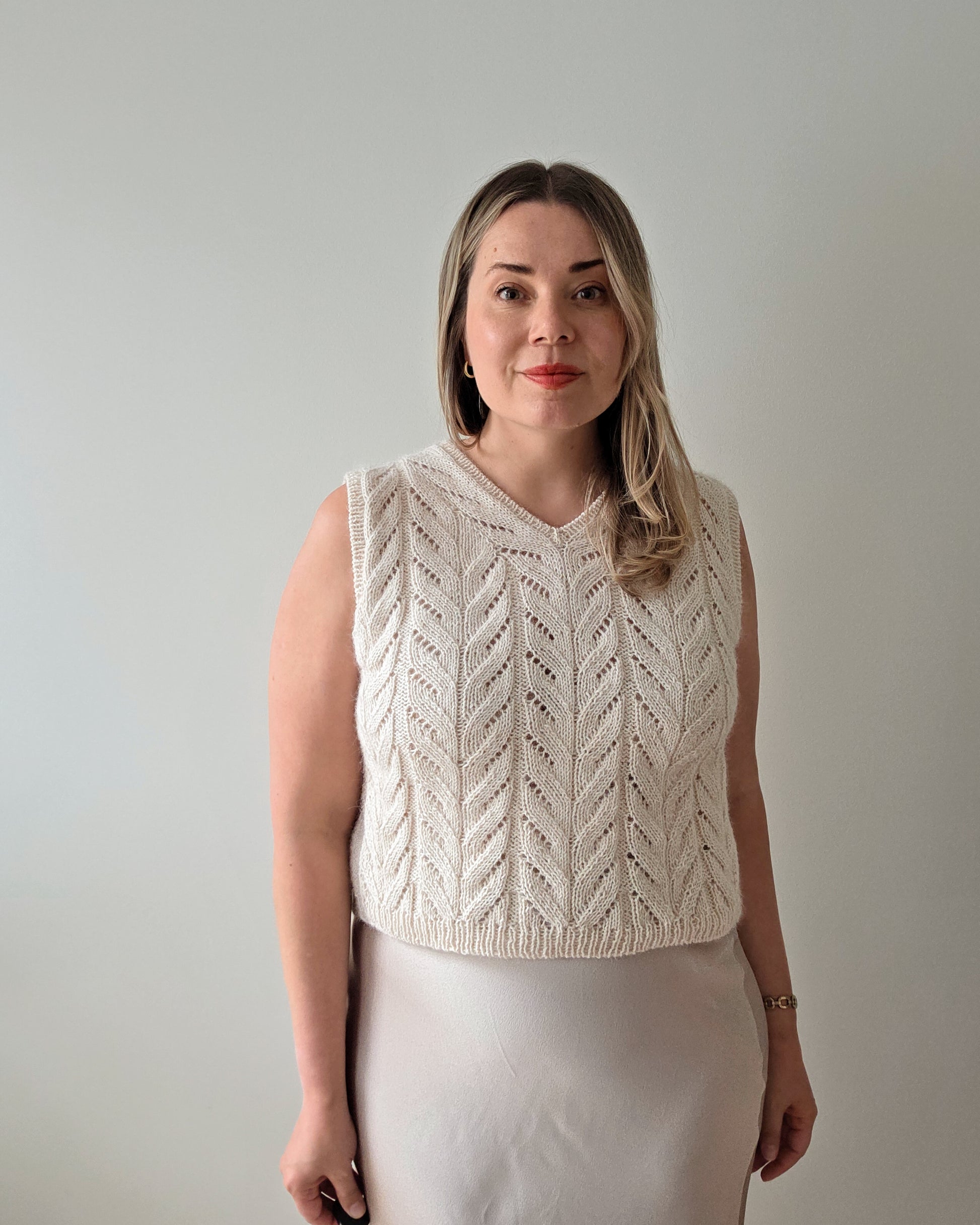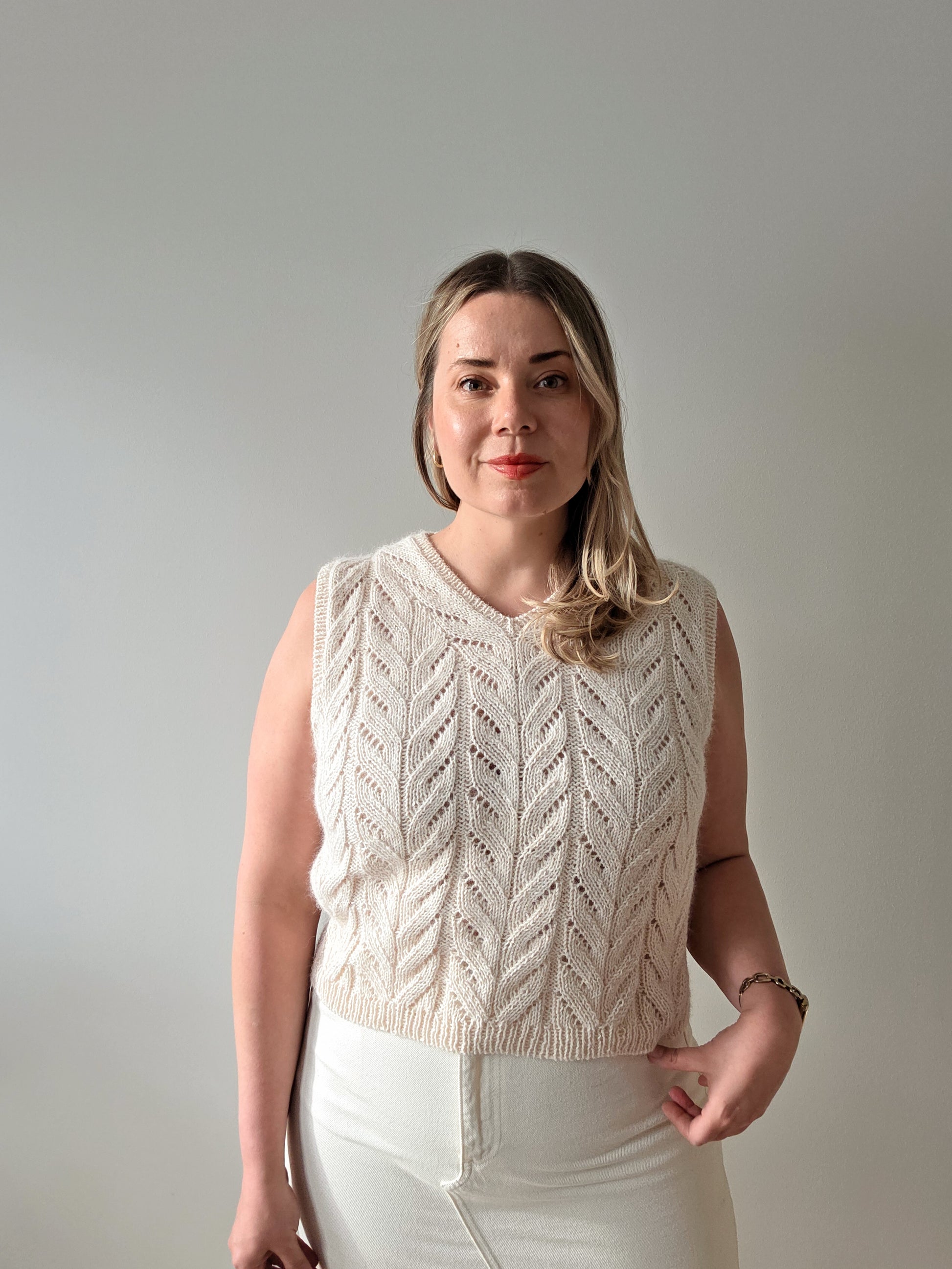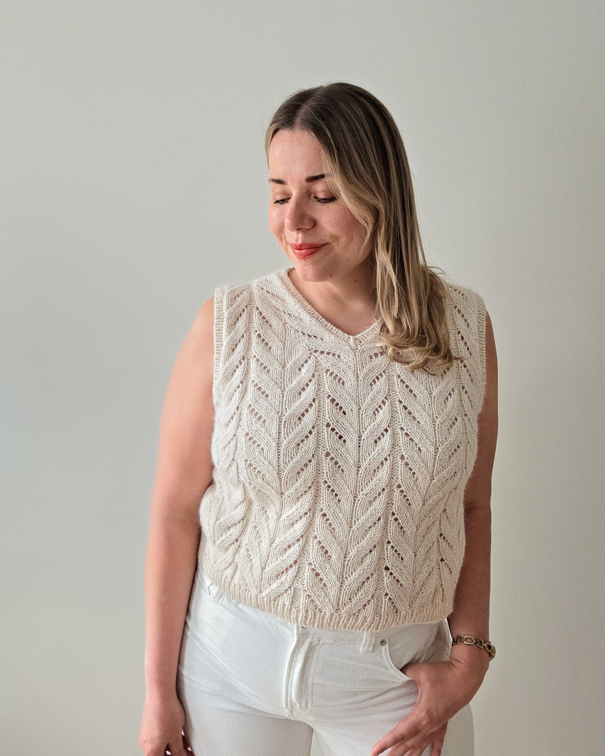 The Ebba vest is knitted seamlessly top-down with a lace pattern that looks like cables. The lace pattern follows the neck shaping on the front, then joining at the bottom of the v-neck. The increases in the lace pattern are fully charted.