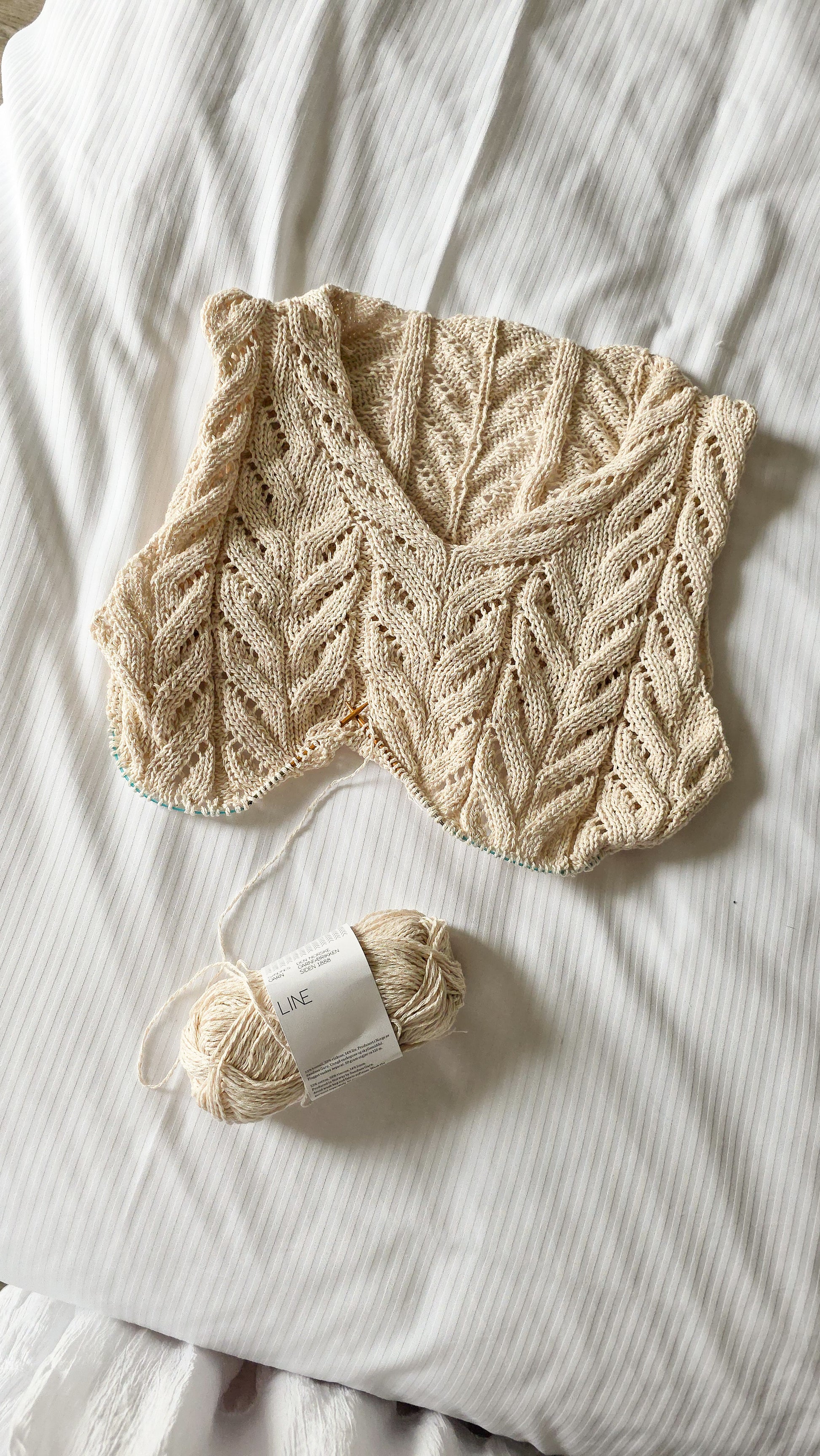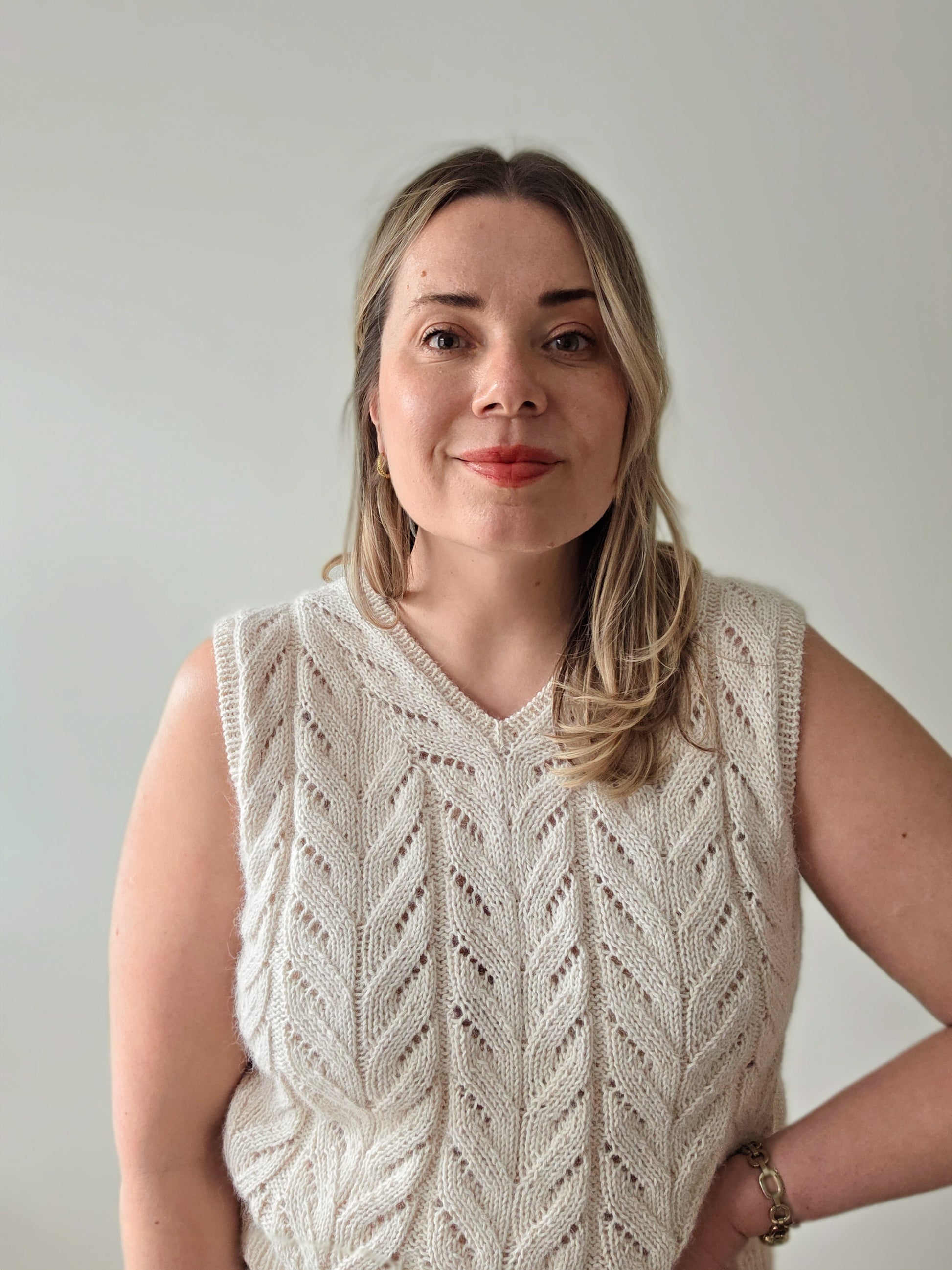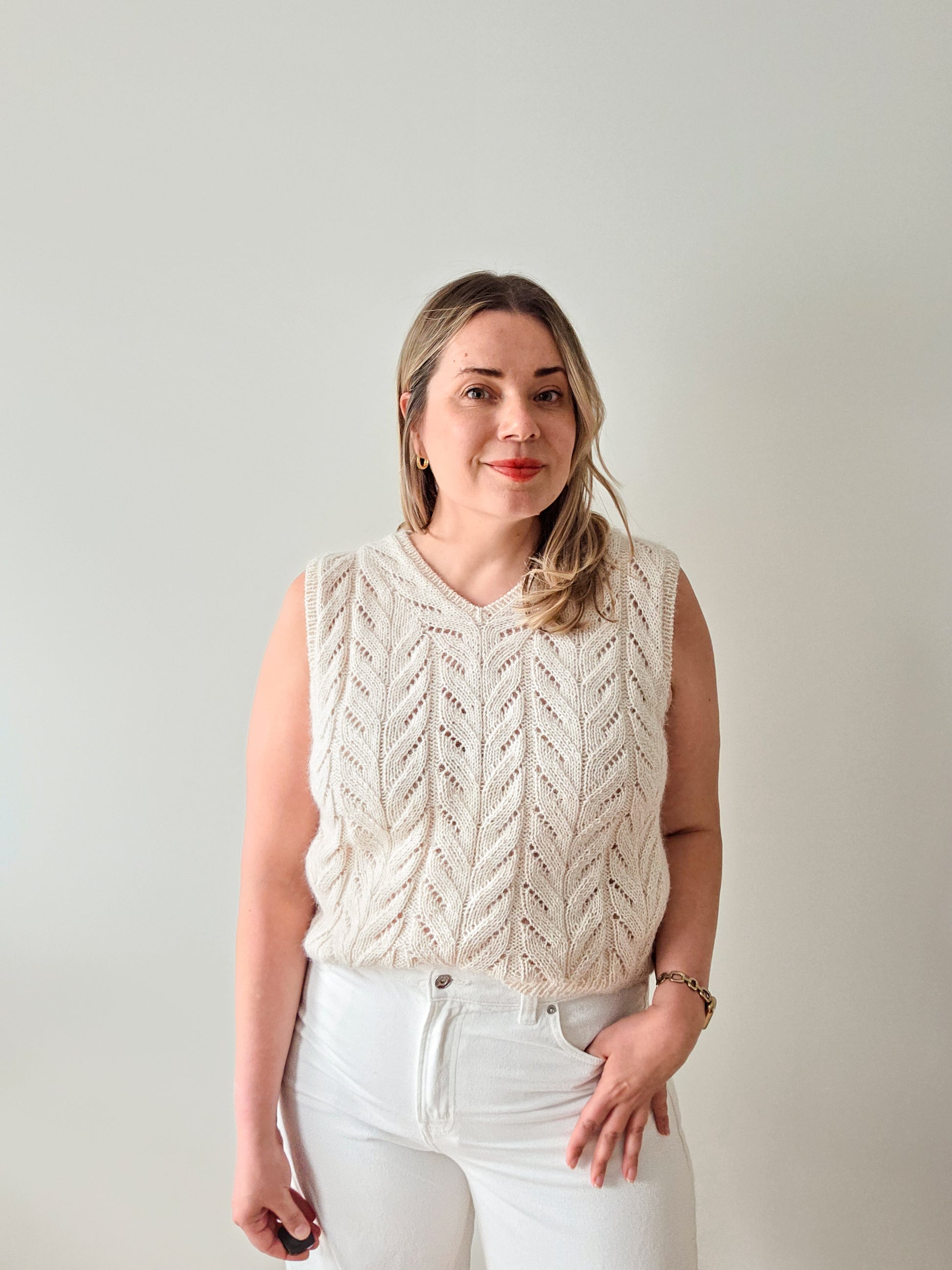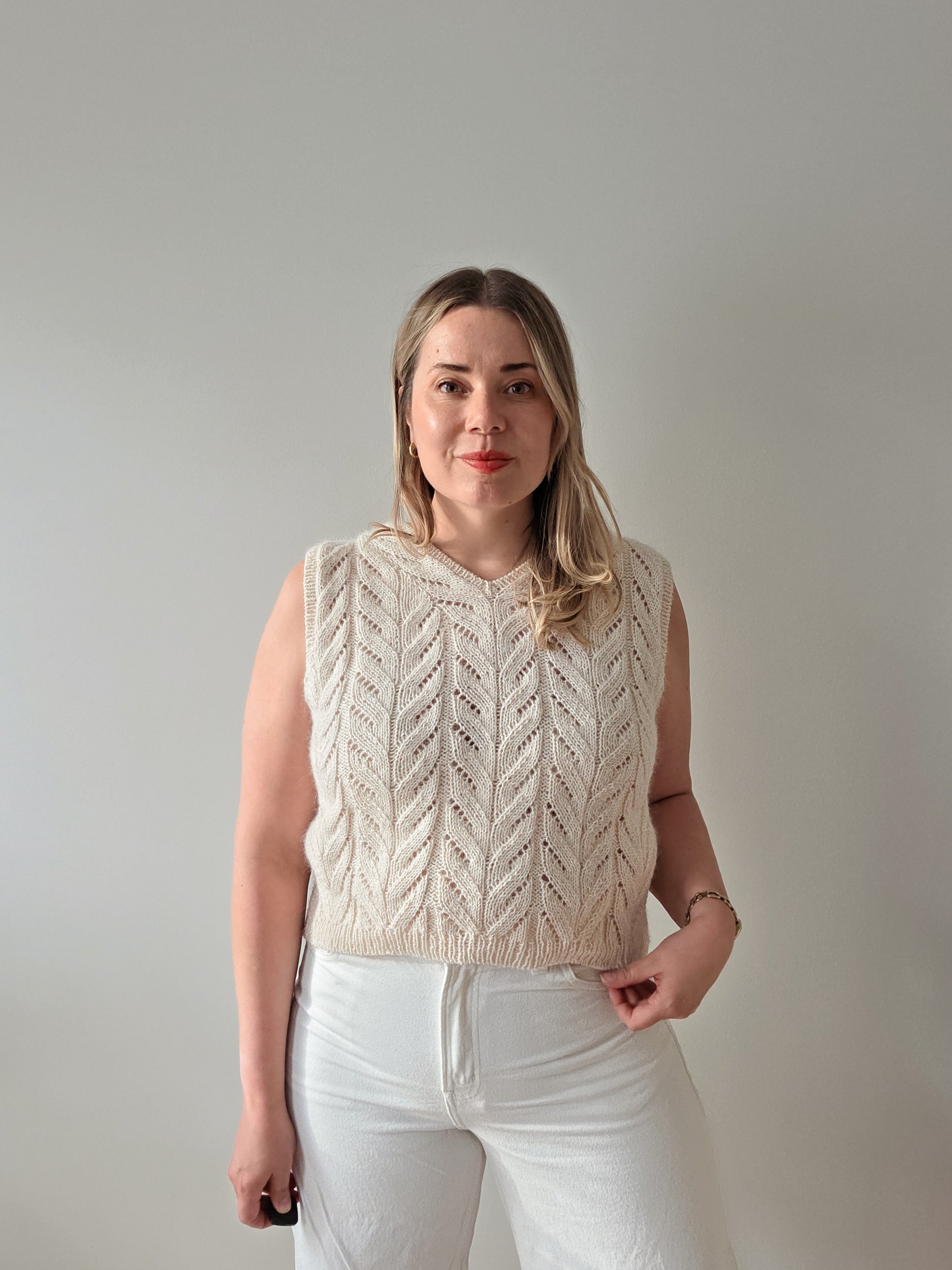 The Ebba vest is knitted seamlessly top-down with a lace pattern that looks like cables. The lace pattern follows the neck shaping on the front, then joining at the bottom of the v-neck. The increases in the lace pattern are fully charted.