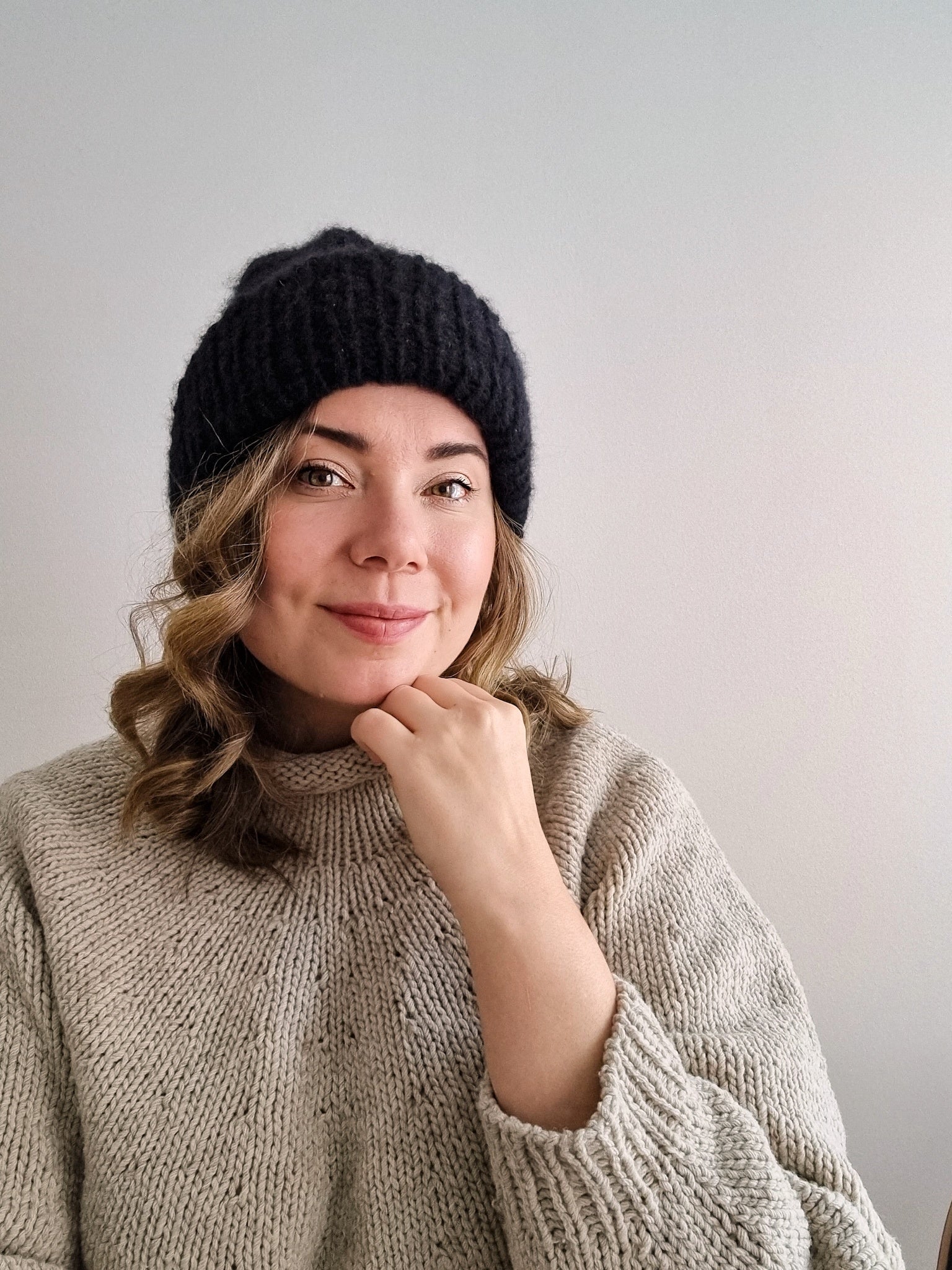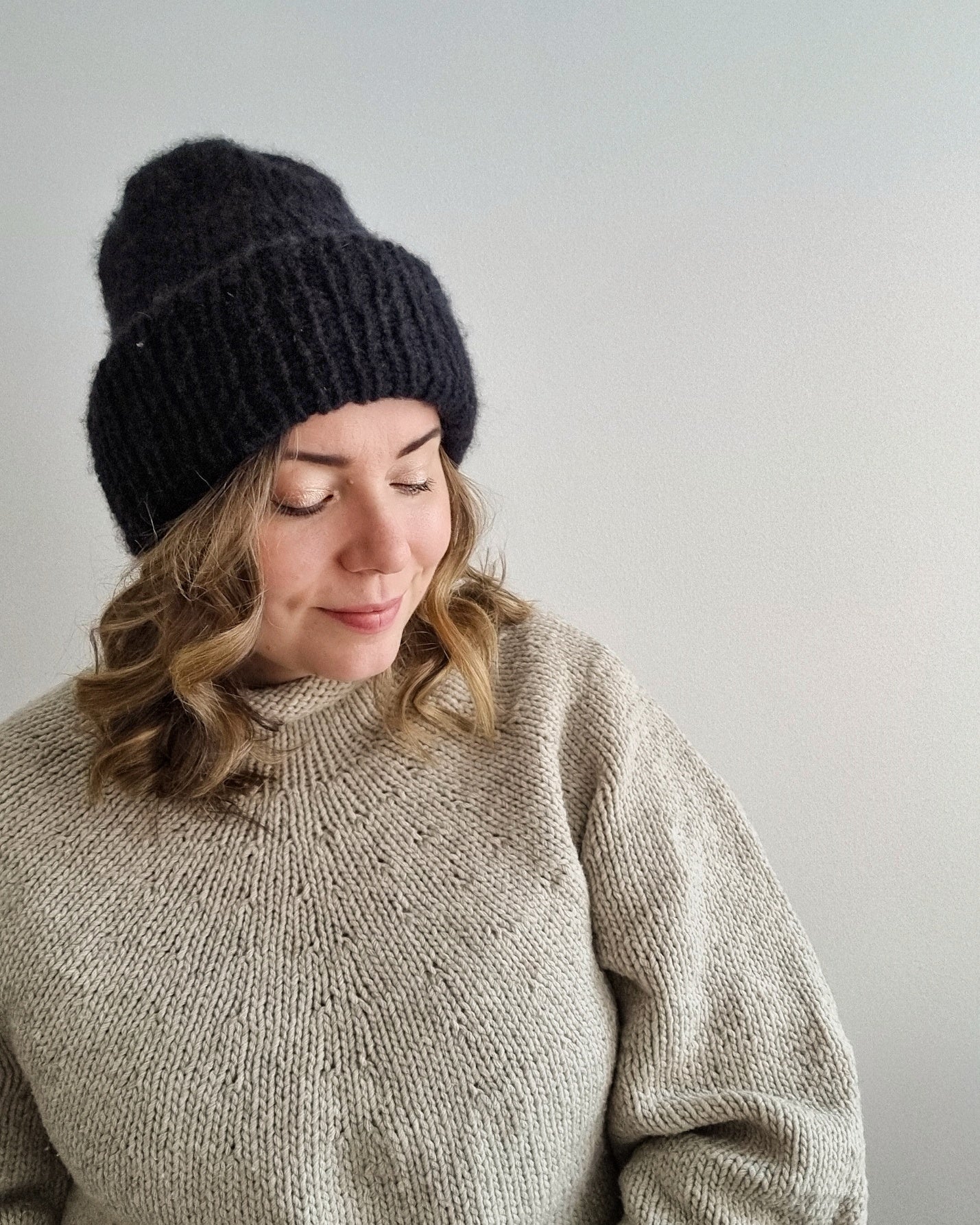 You can easily adjust the length of the hat to get the fit you want. The hat is knitted from top down, so you can try it on as you knit it to make sure the length is just perfect for your head and you don’t end up with any leftover yarn. I used Cardiff Cashmere Brushmere for my samples, and since I knitted the hats top down, I could make sure I could use all of the precious yarn.