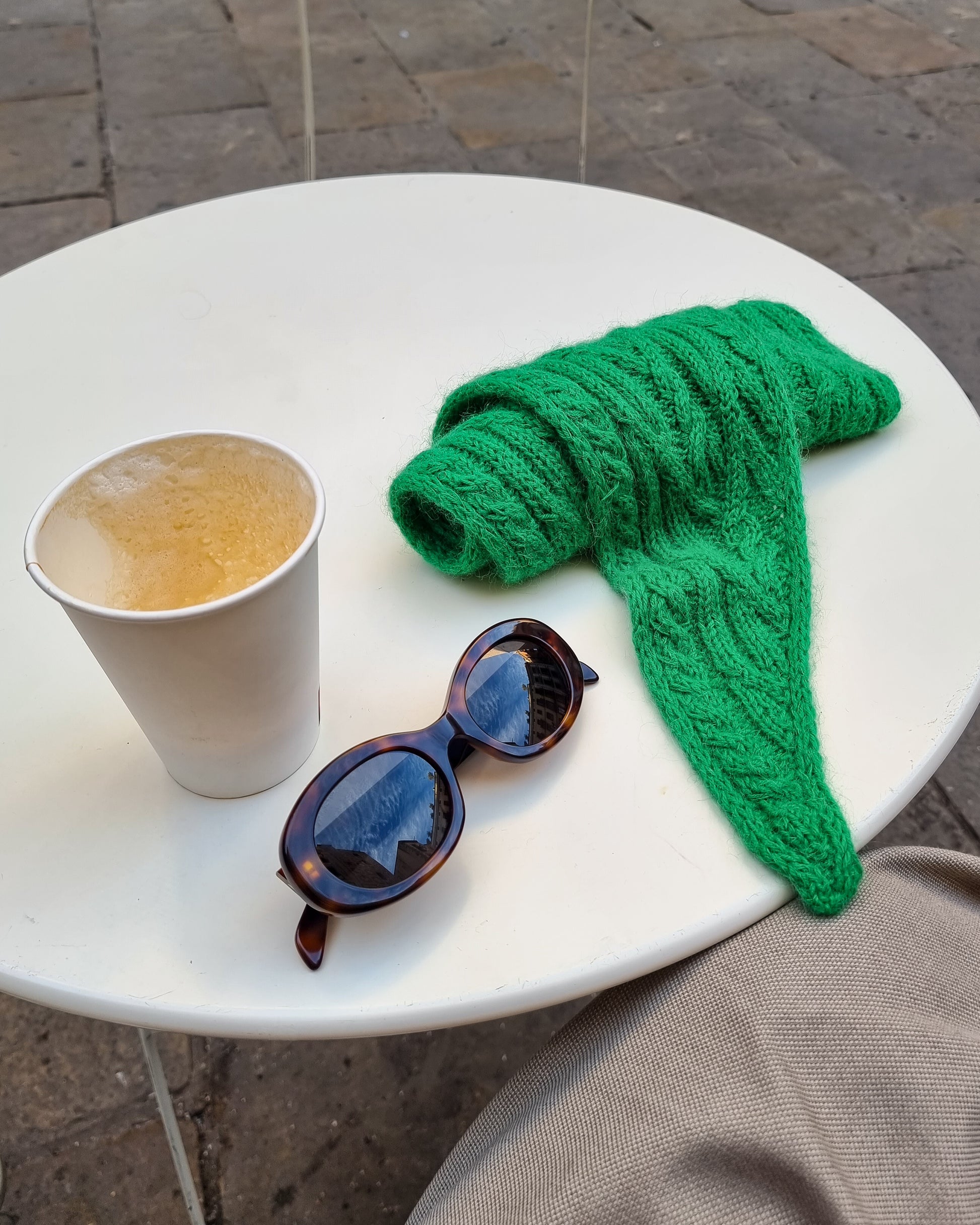 Green sample (size 1): 1 ball of Kaos Yarn Organic Soft Merino (100% merino; 250 meters / 273 yards per 50 g) shown in the colorway Confident and 1 ball of Kaos Yarn Organic Brushed Alpaca (100% organic alpaca; 225 m / 246 yards per 25 g), shown in colorway Zealous.