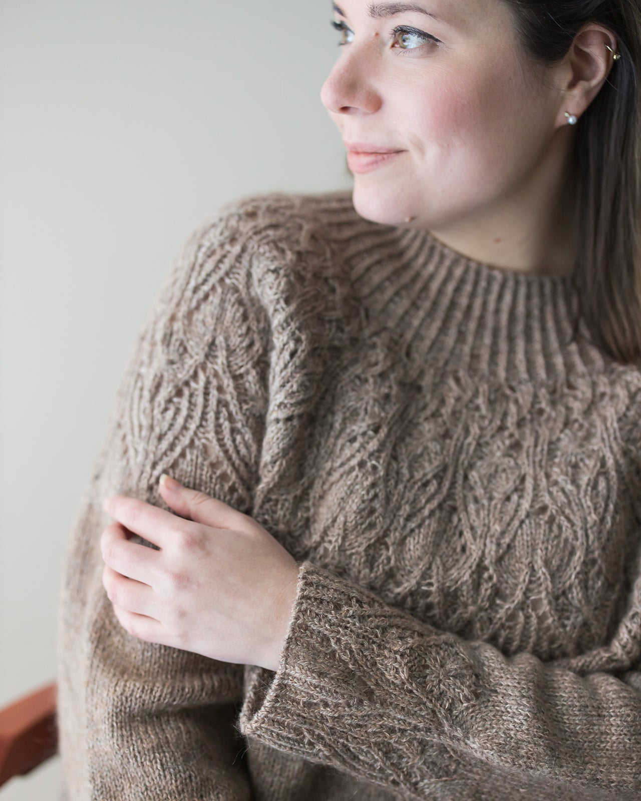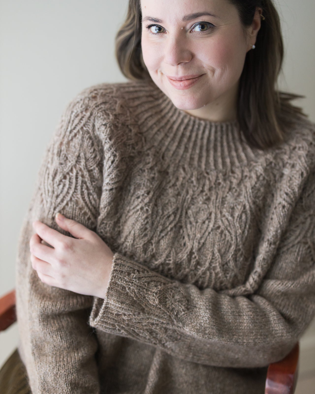 The Kuutar pullover is knitted seamlessly top-down starting at the neckband. The sleeves and body are separated at underarm and knitted separately. The back is shaped with short-rows to give it a bit more length and to improve the fit.