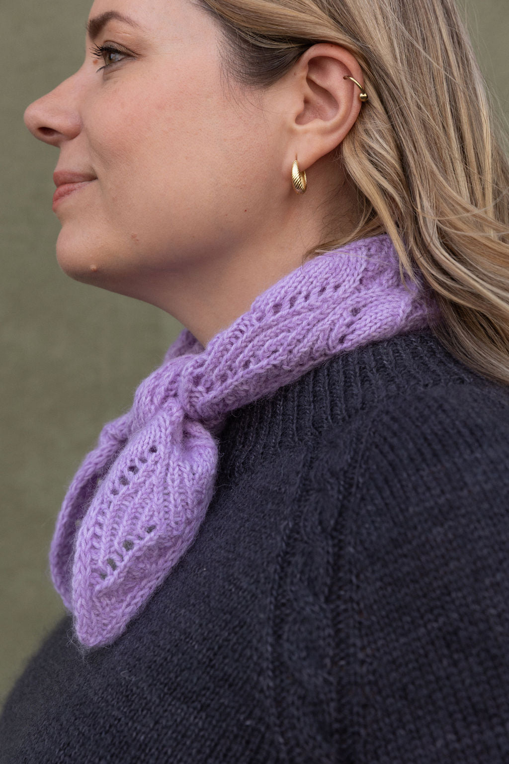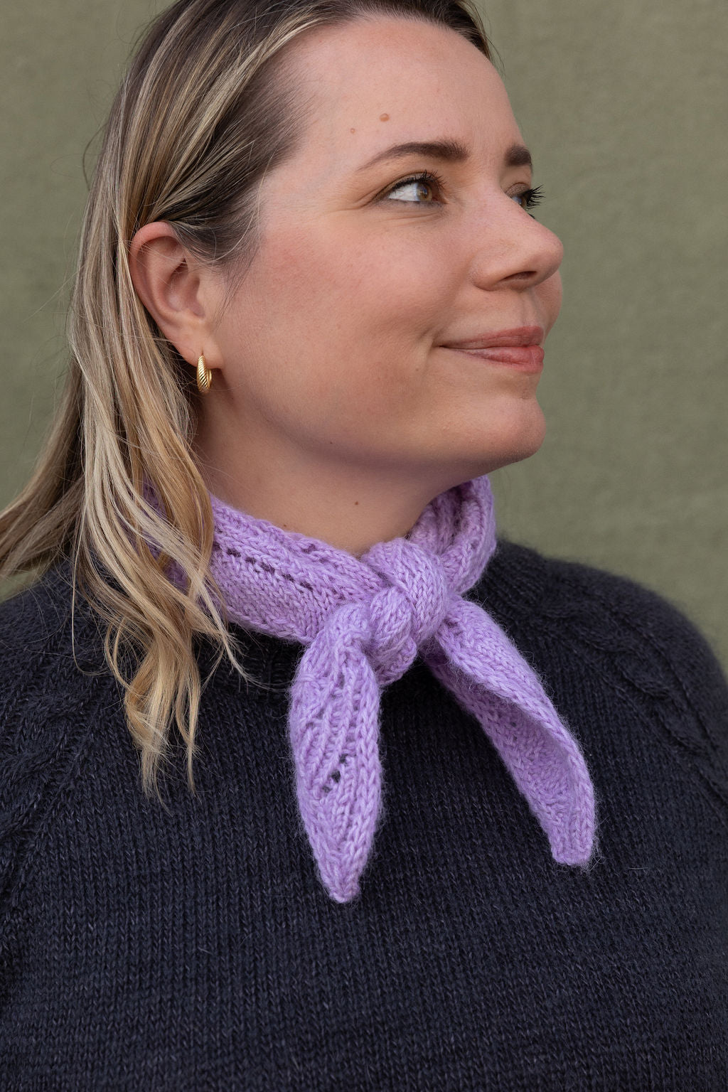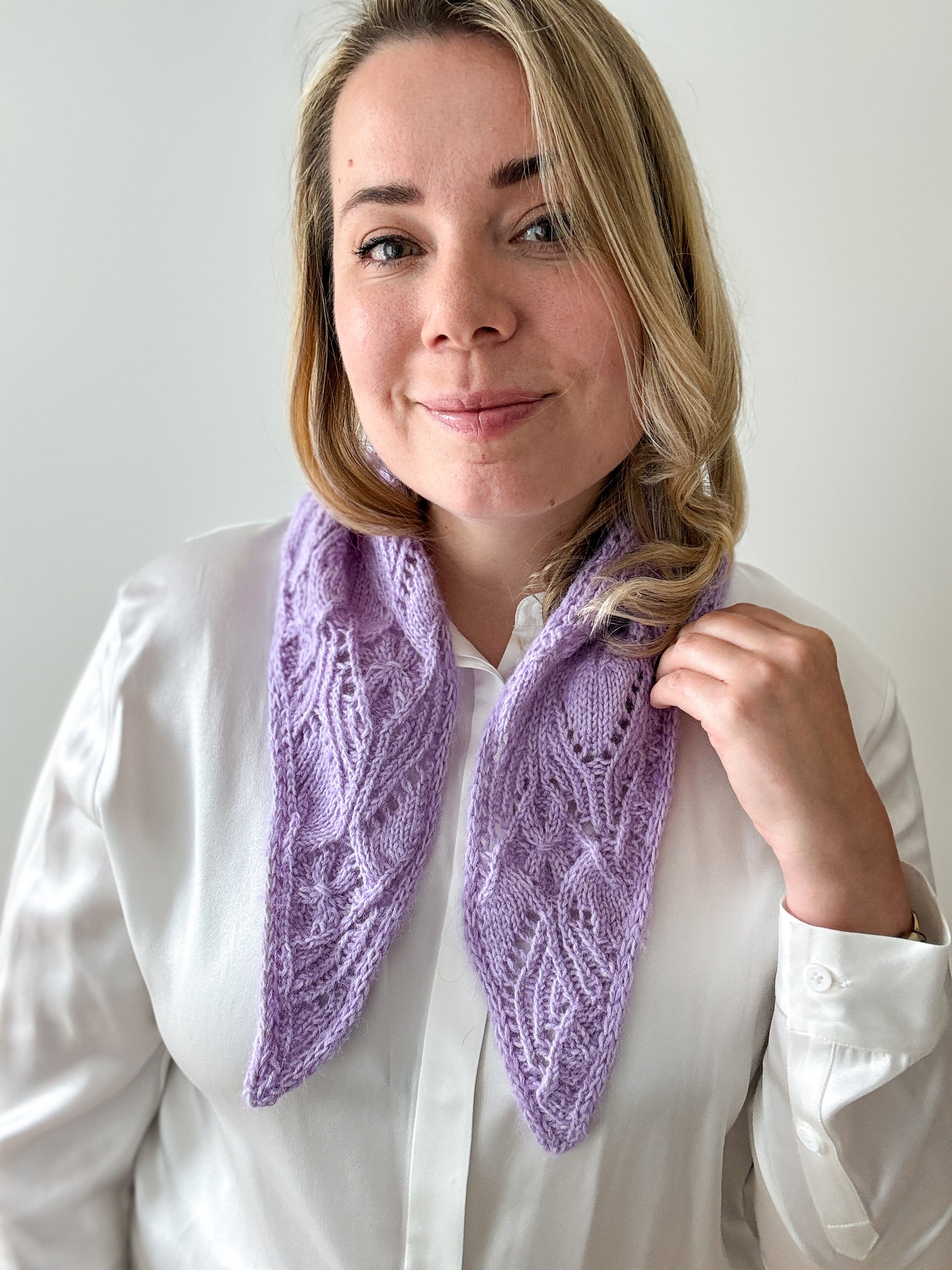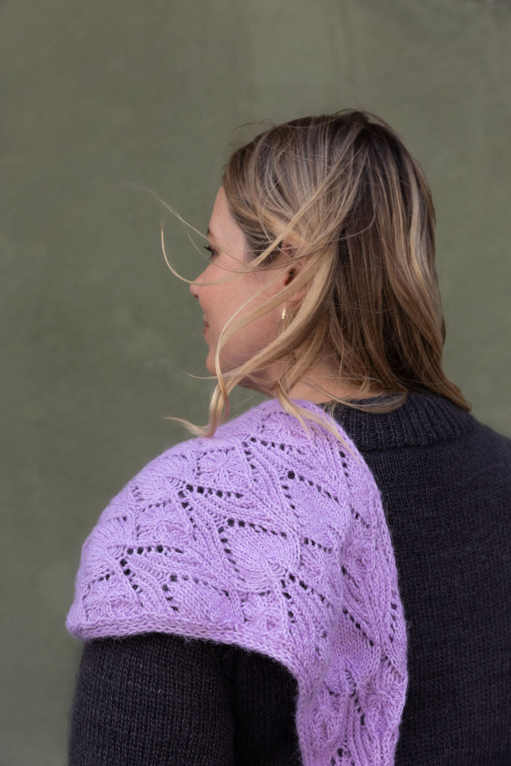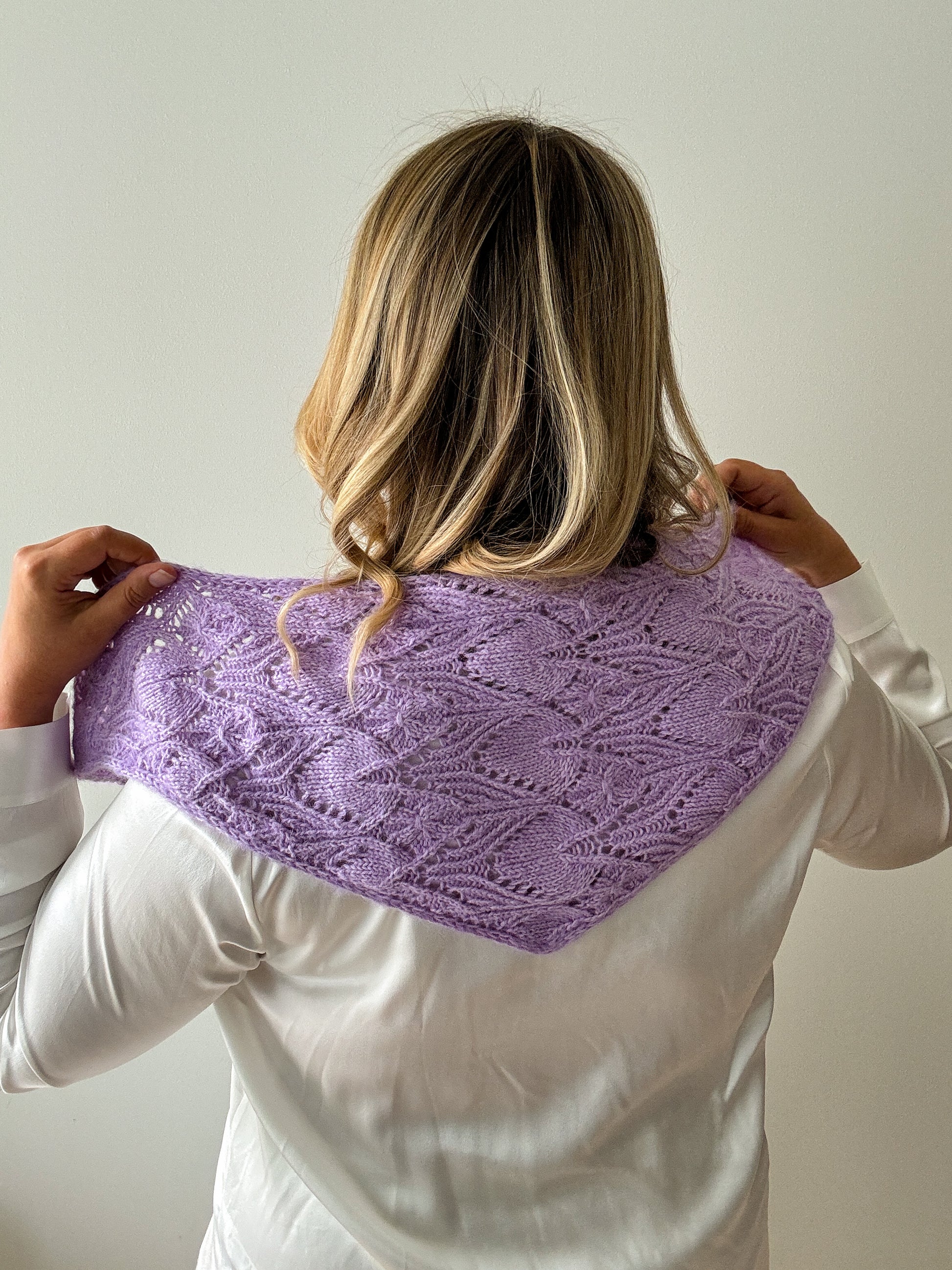 The Kuutar shawl is a little triangular kerchief that can be worn in multiple ways. It is started at the tip of the shawl, then increased on every right side row until the full width before decreasing your way back to the other tip. The size can easily be modified by adding more pattern repeats for a larger shawl.