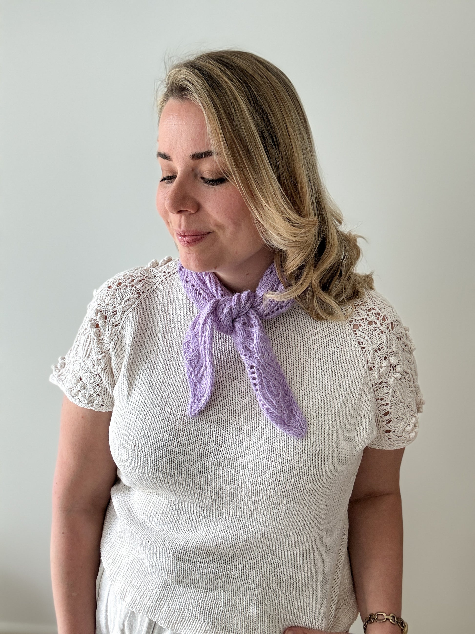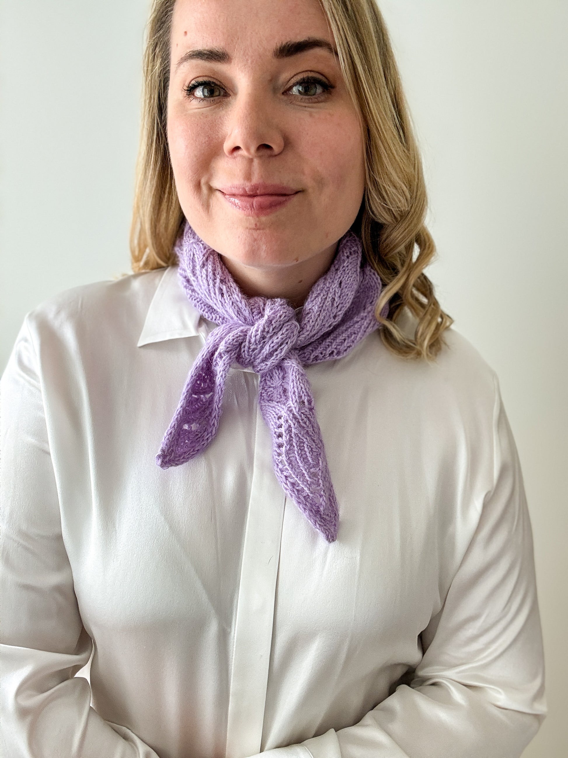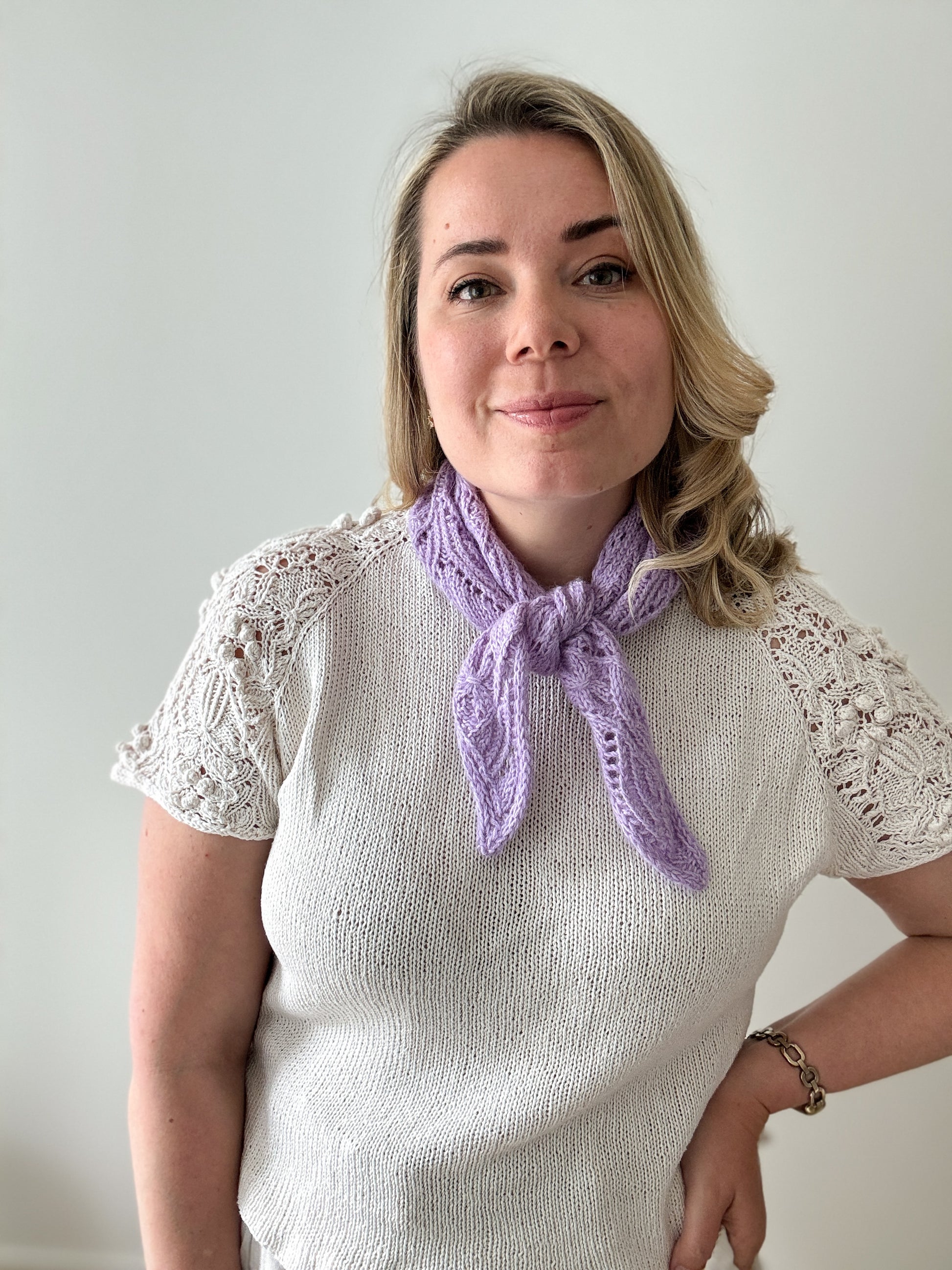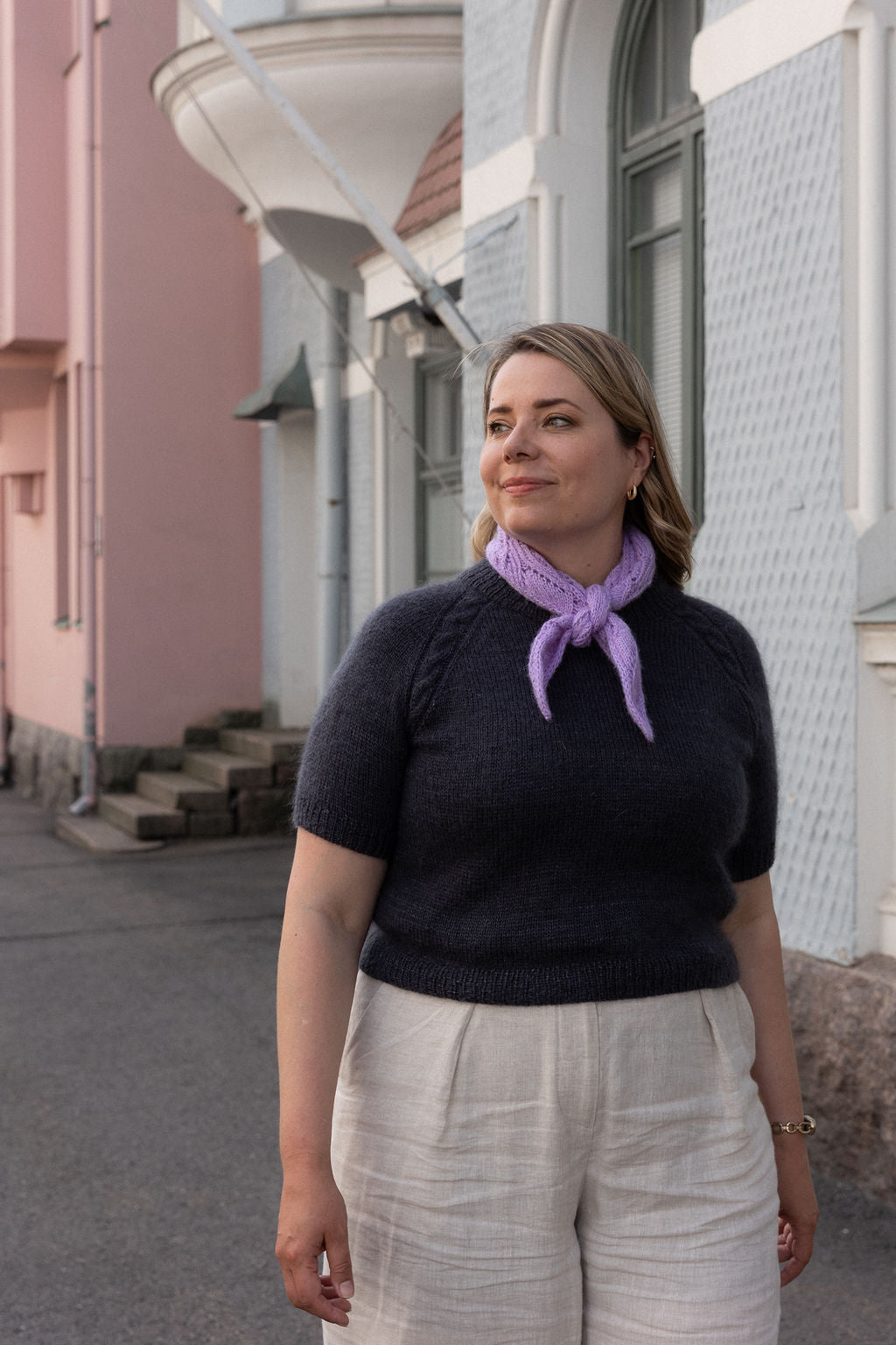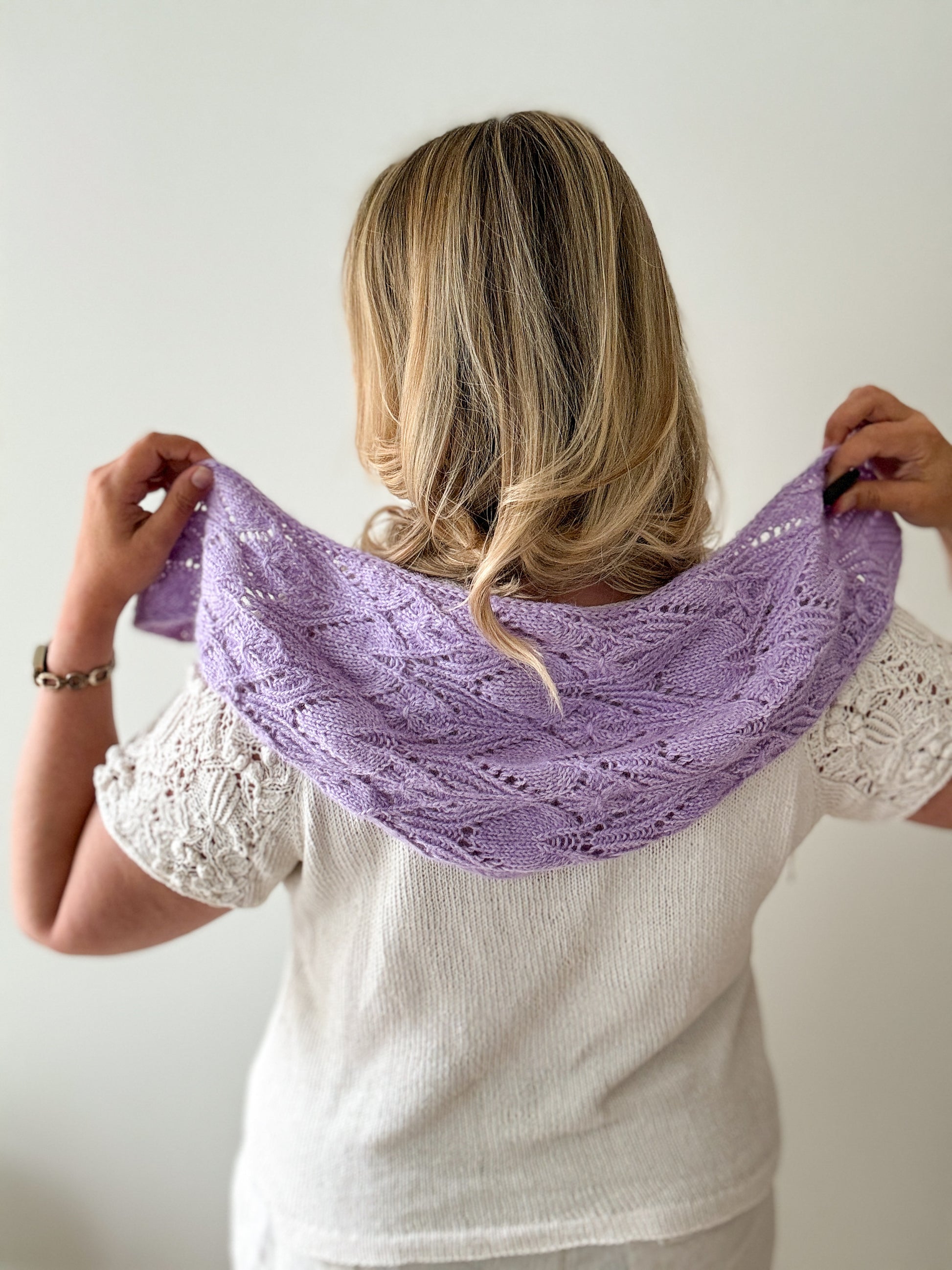 The Kuutar shawl is a little triangular kerchief that can be worn in multiple ways. It is started at the tip of the shawl, then increased on every right side row until the full width before decreasing your way back to the other tip. The size can easily be modified by adding more pattern repeats for a larger shawl.