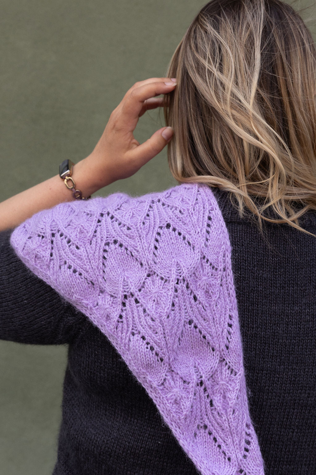 Lilac sample: 1 ball of Kaos Yarn Organic Soft Merino (100% merino; 250 meters / 273 yards per 50 g) shown in the colorway Spiritual and 1 ball of Kaos Yarn Organic Brushed Alpaca (100% organic alpaca; 225 m / 246 yards per 25 g), shown in colorway Spiritual.