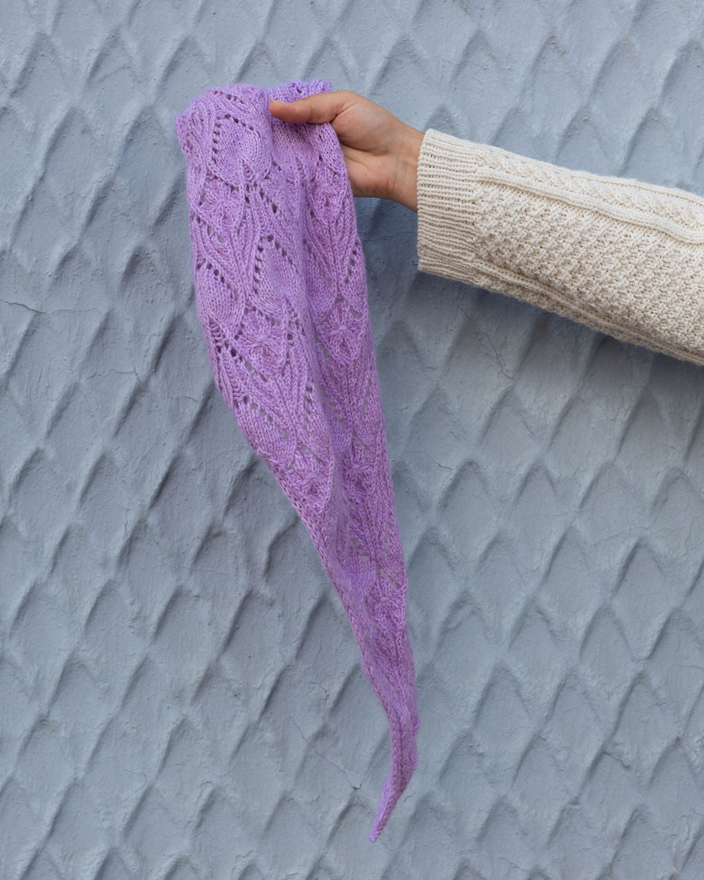 The Kuutar shawl was designed for those odd balls and leftover skeins of fingering weight yarn and mohair we all have in our stashes, but the scarf can also be worked in a single strand of DK weight yarn.