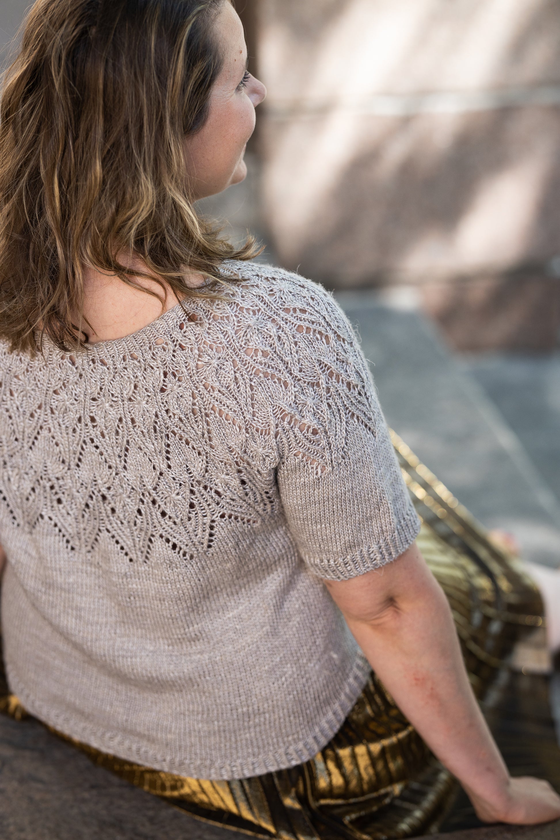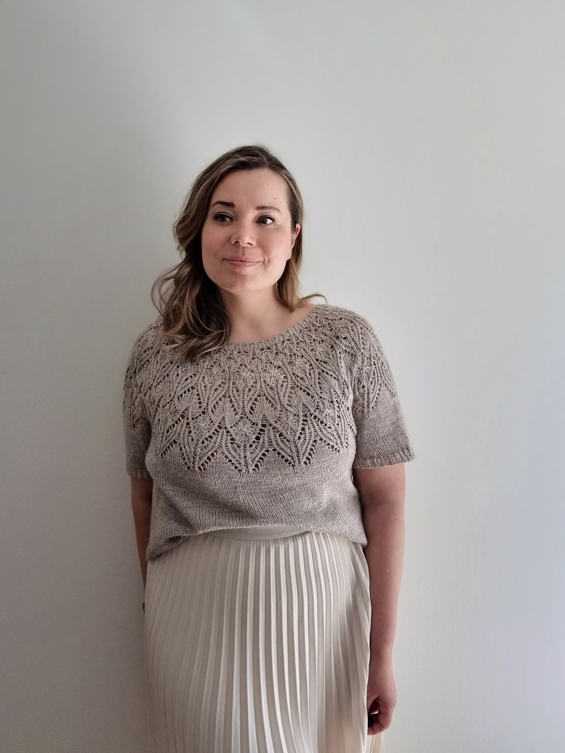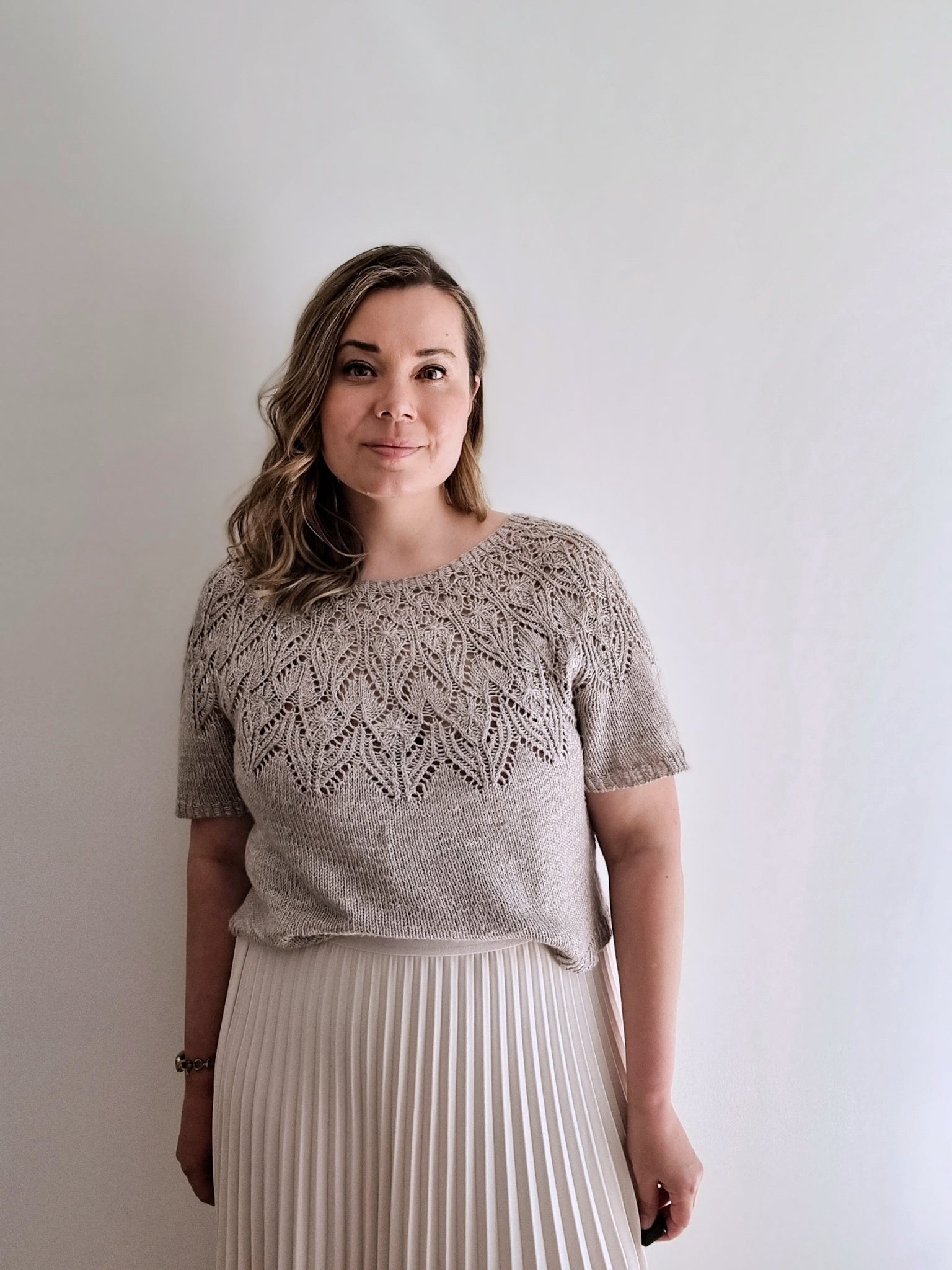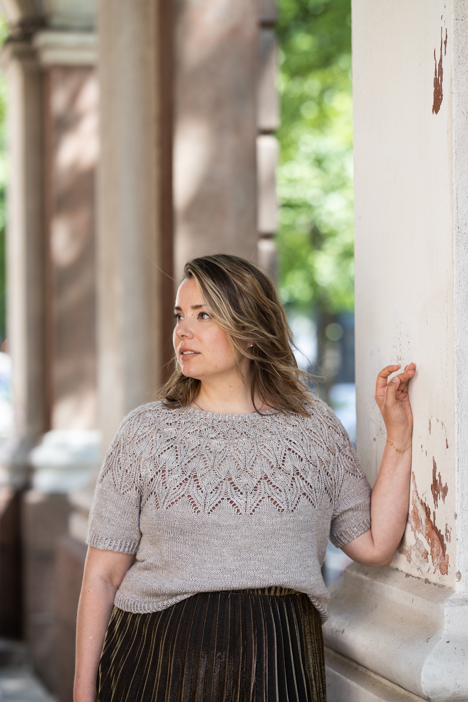 The Kuutar tee is knitted seamlessly top-down starting at the neckband. The sleeves and body are separated at the underarm and knitted separately. The back is shaped with short-rows to give it a bit more length and to improve the fit. The Kuutar tee is a slightly lighter weight and shorter sleeved version of my popular Kuutar pullover. It also has a shorter neckline and a slimmer fit than the original version.