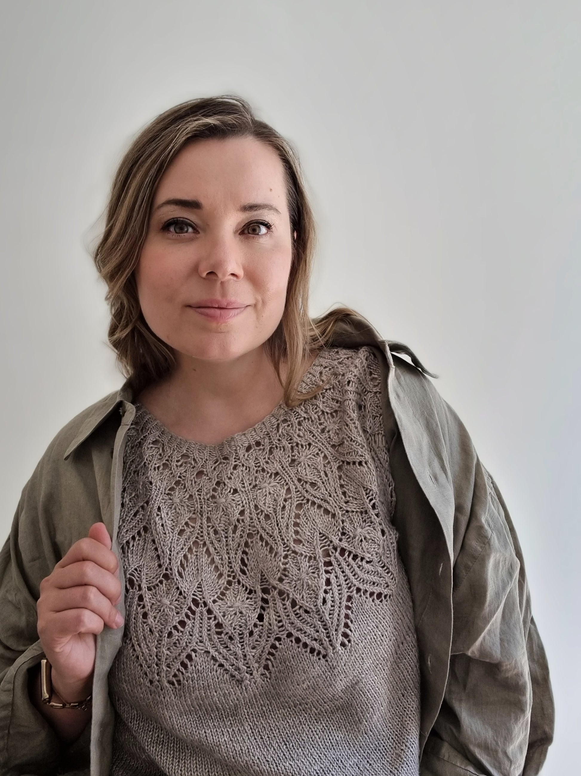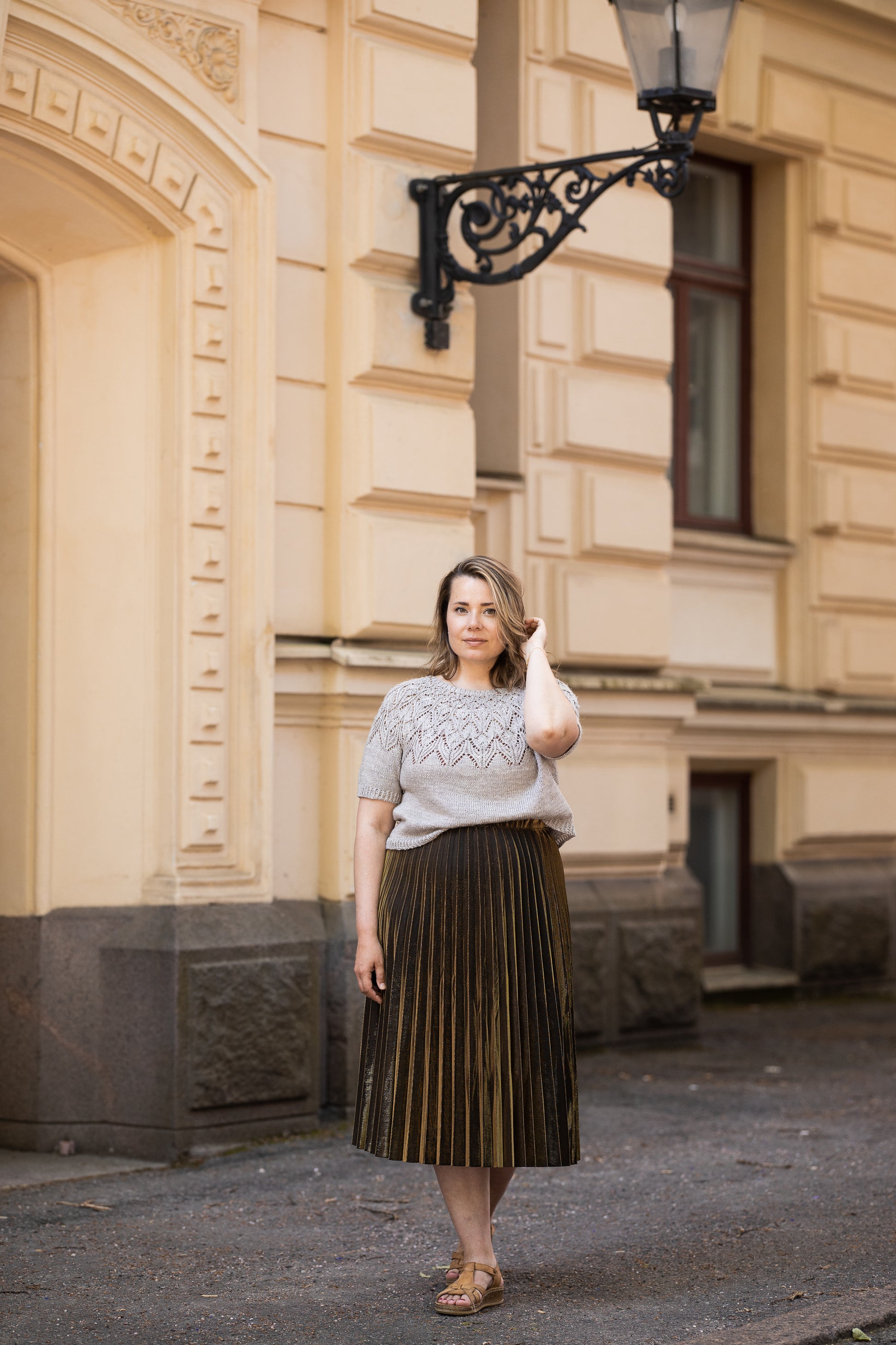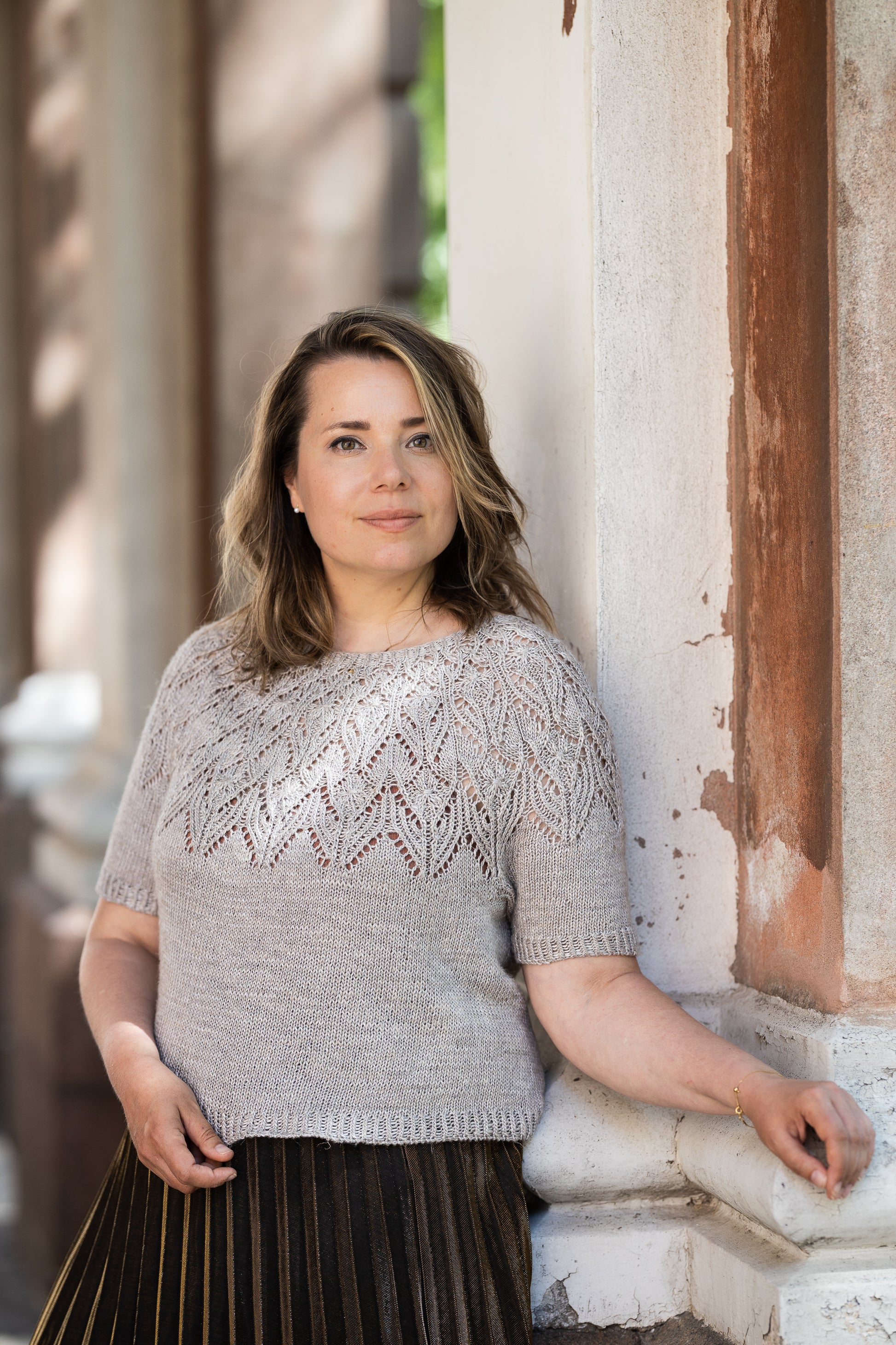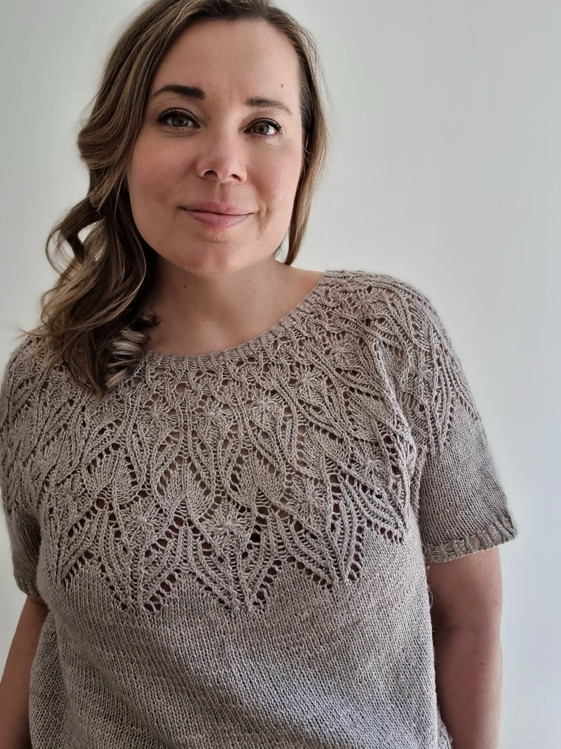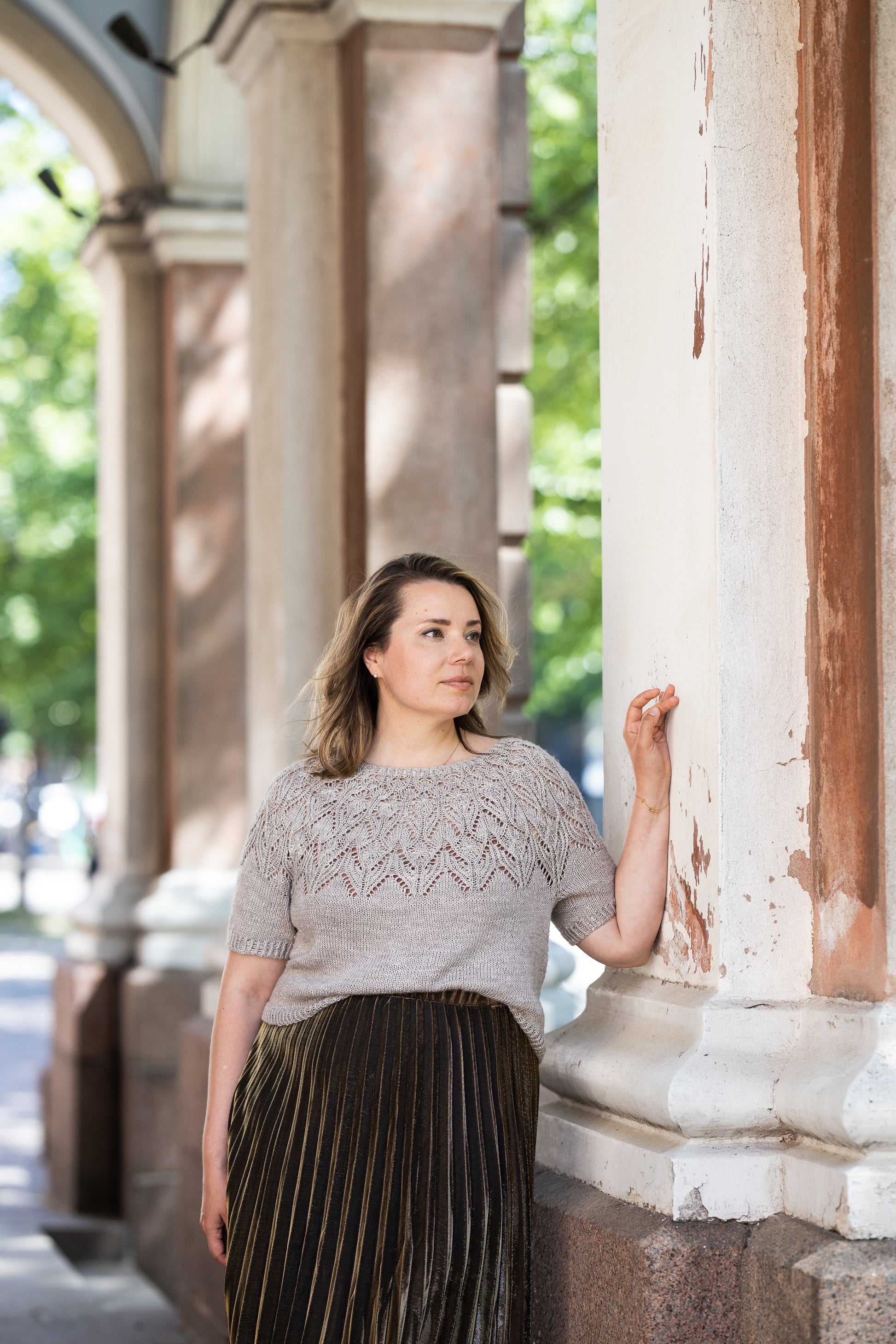 The Kuutar tee is knitted seamlessly top-down starting at the neckband. The sleeves and body are separated at the underarm and knitted separately. The back is shaped with short-rows to give it a bit more length and to improve the fit. The Kuutar tee is a slightly lighter weight and shorter sleeved version of my popular Kuutar pullover. It also has a shorter neckline and a slimmer fit than the original version.