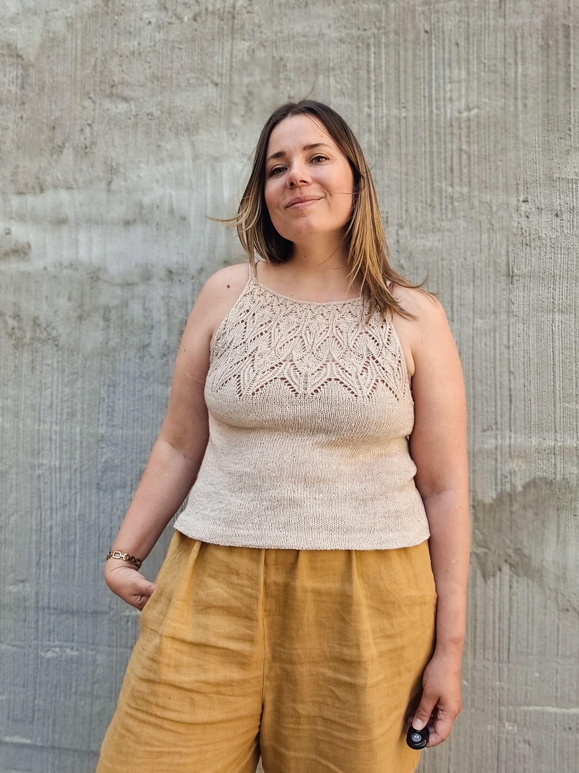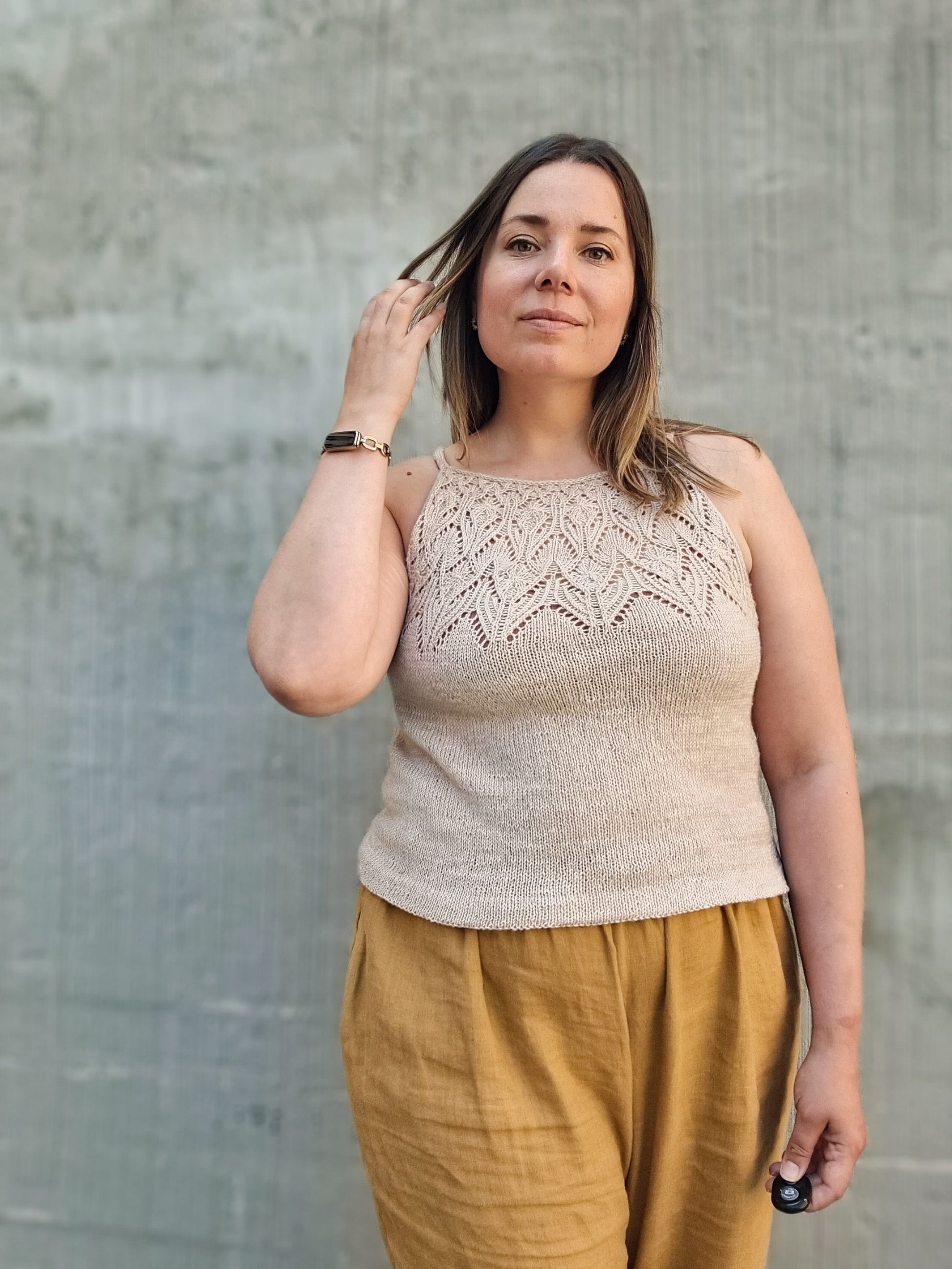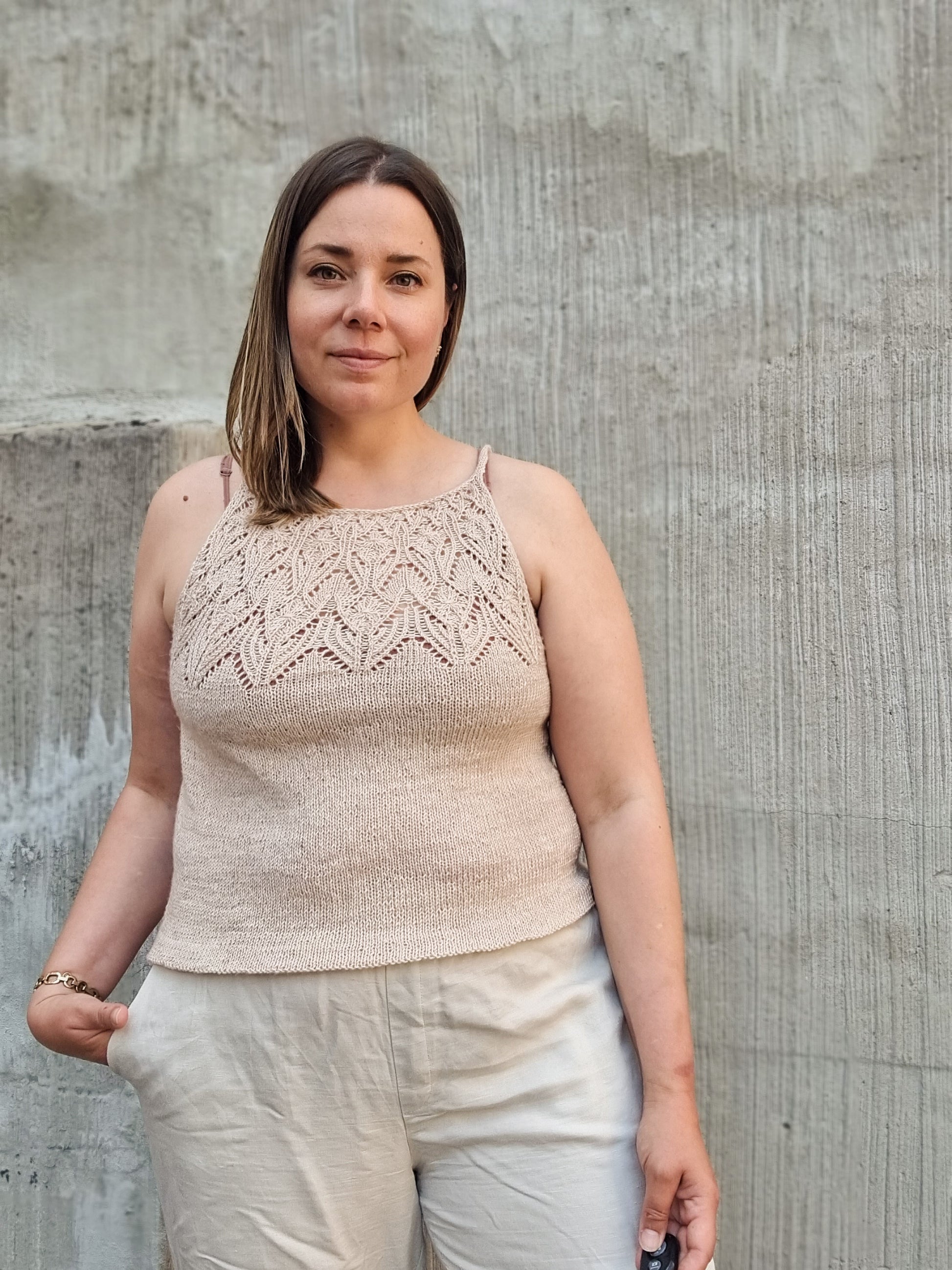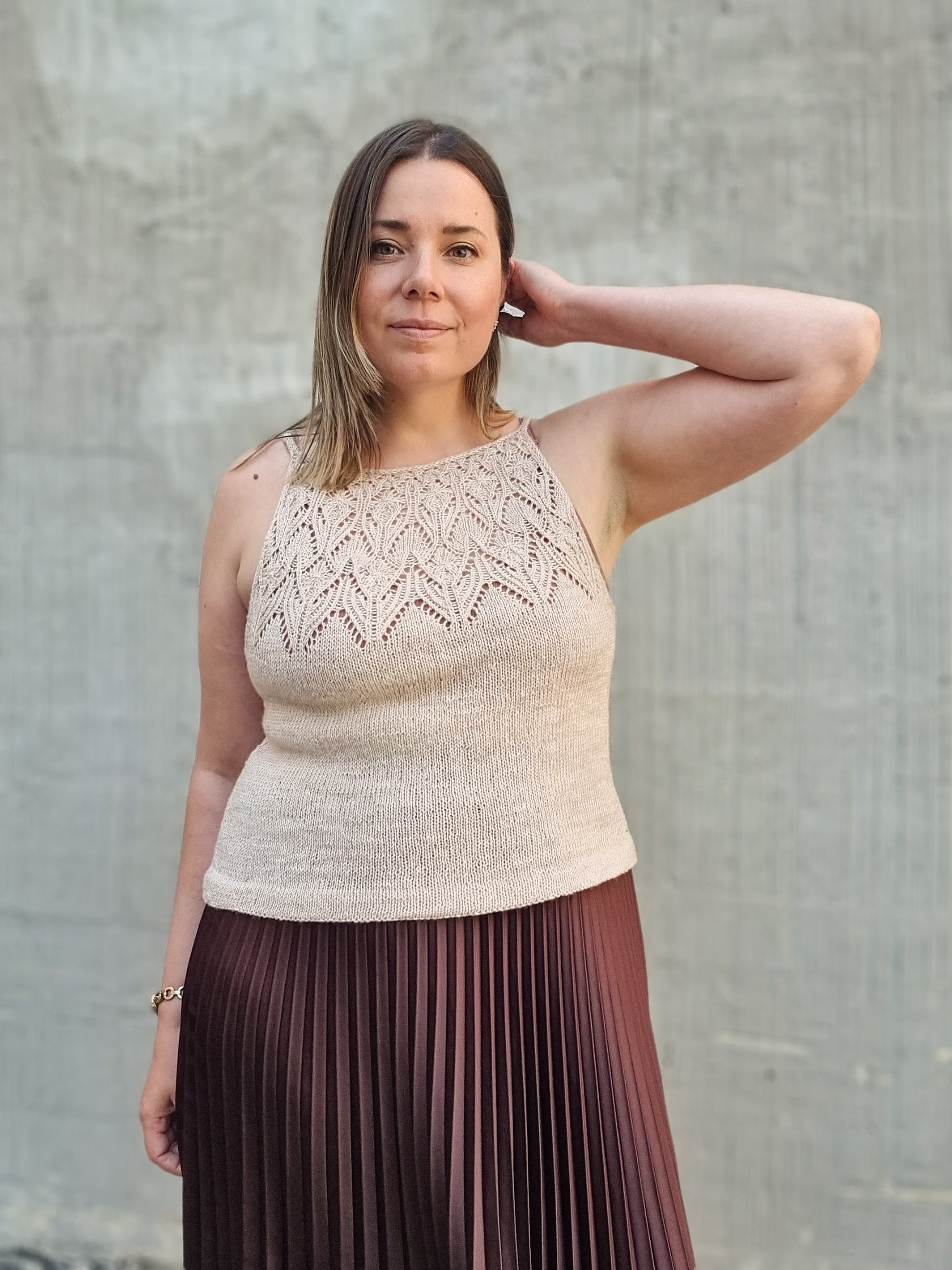 The Kuutar top is knitted seamlessly from the top down with the beautiful lace pattern on the front and back. The back and front are knitted separately down to the armholes. Then the pieces are joined and the body is knitted in the round. The hem is folded double to give the top a neat and finished look. The top of the front and back are finished with an i-cord edging that continues seamlessly into the straps.