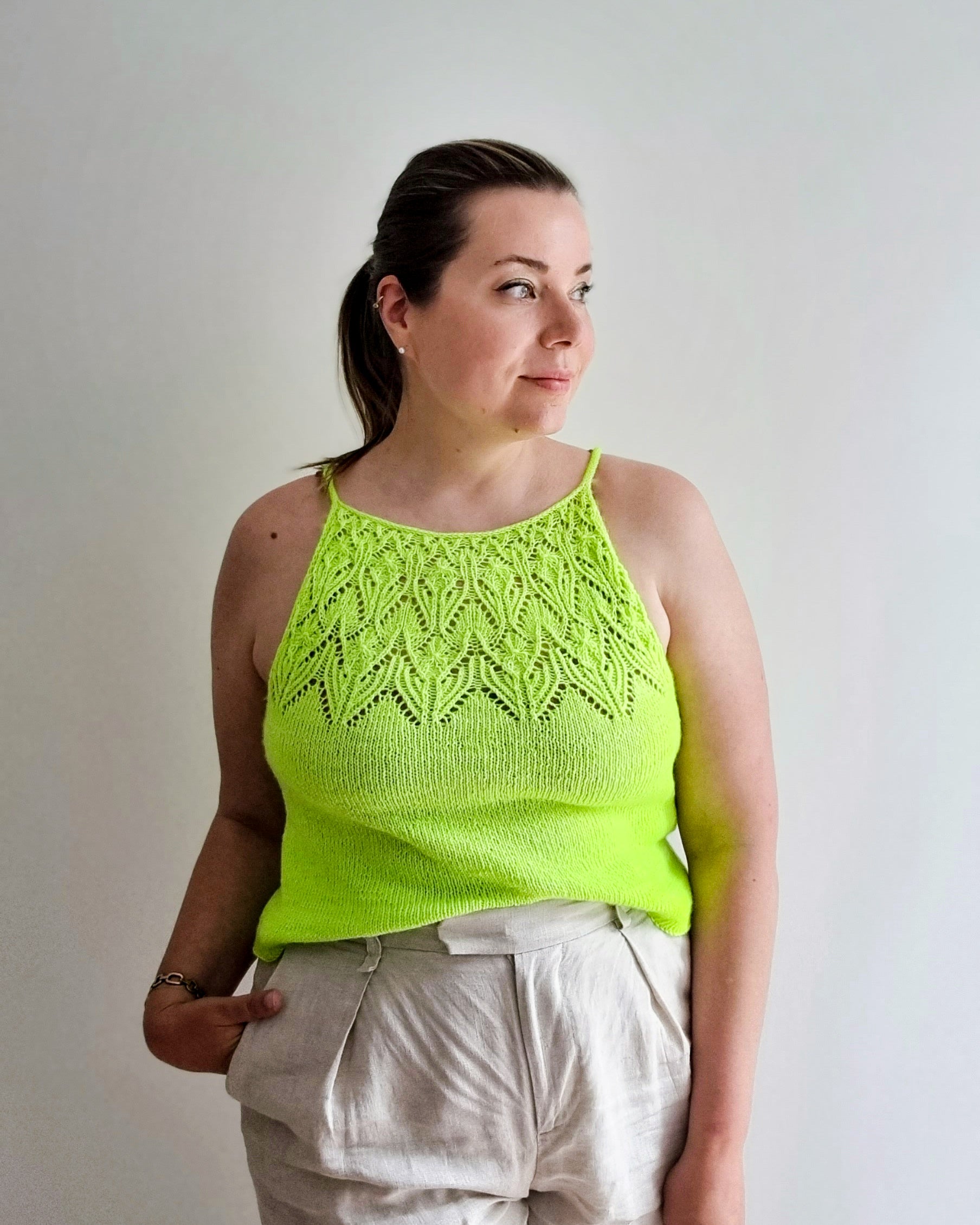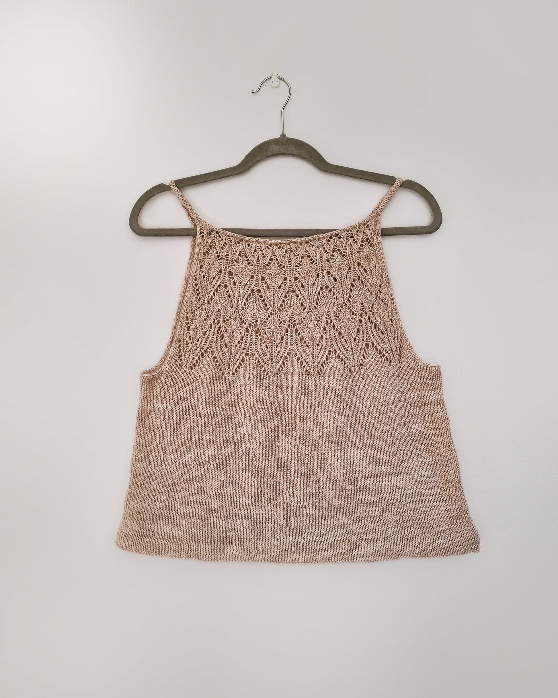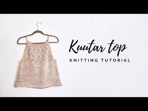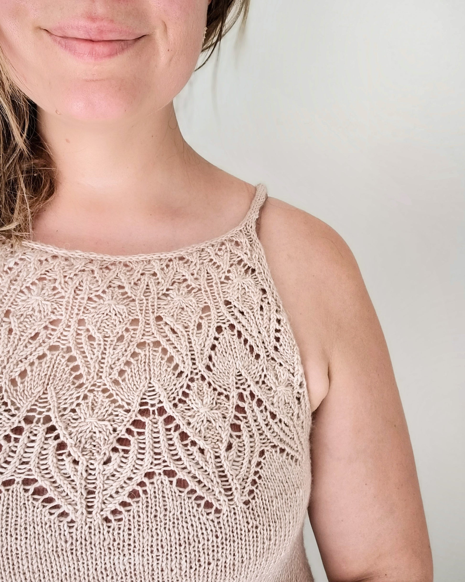 The Kuutar top is knitted seamlessly from the top down with the beautiful lace pattern on the front and back. The back and front are knitted separately down to the armholes. Then the pieces are joined and the body is knitted in the round. The hem is folded double to give the top a neat and finished look. The top of the front and back are finished with an i-cord edging that continues seamlessly into the straps.