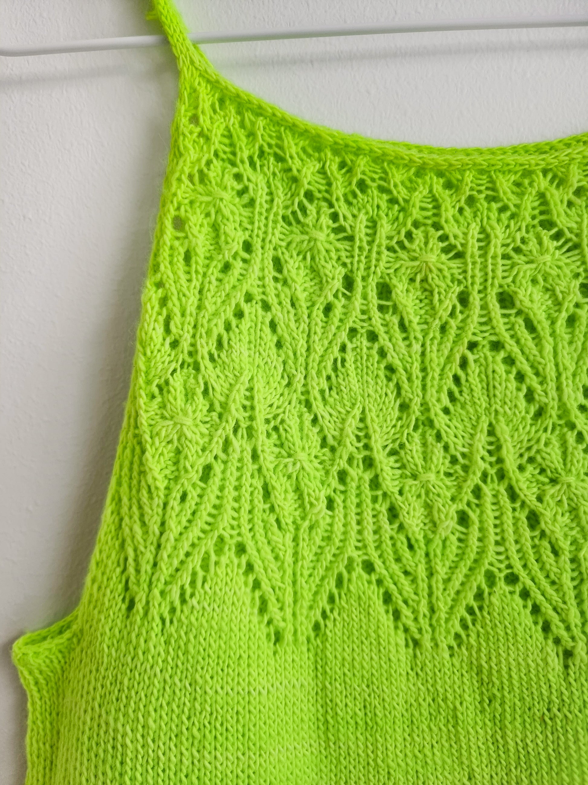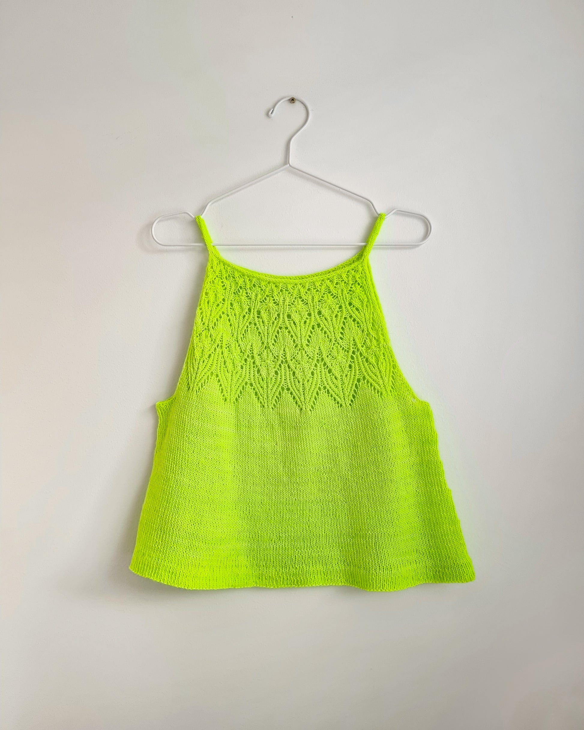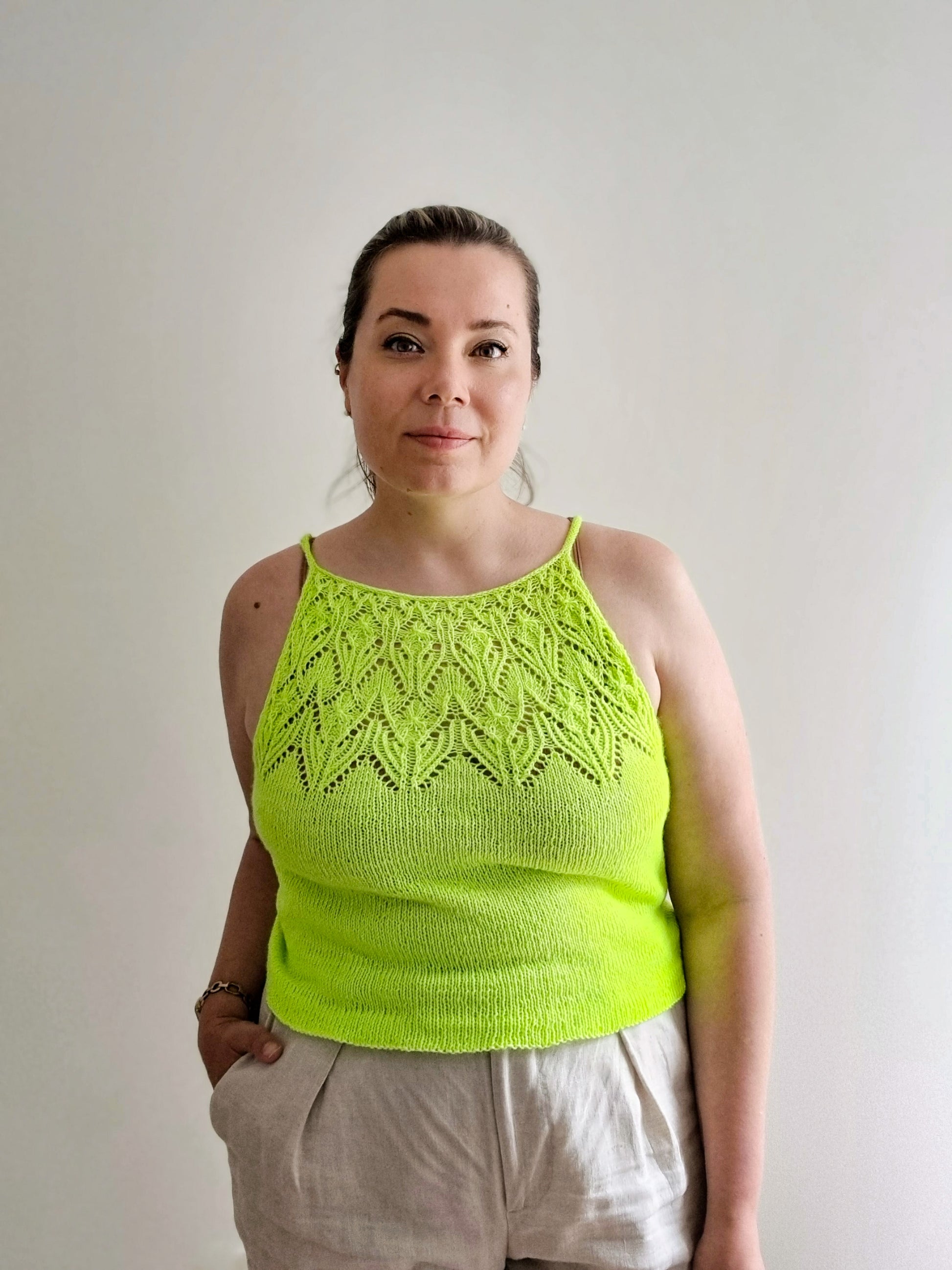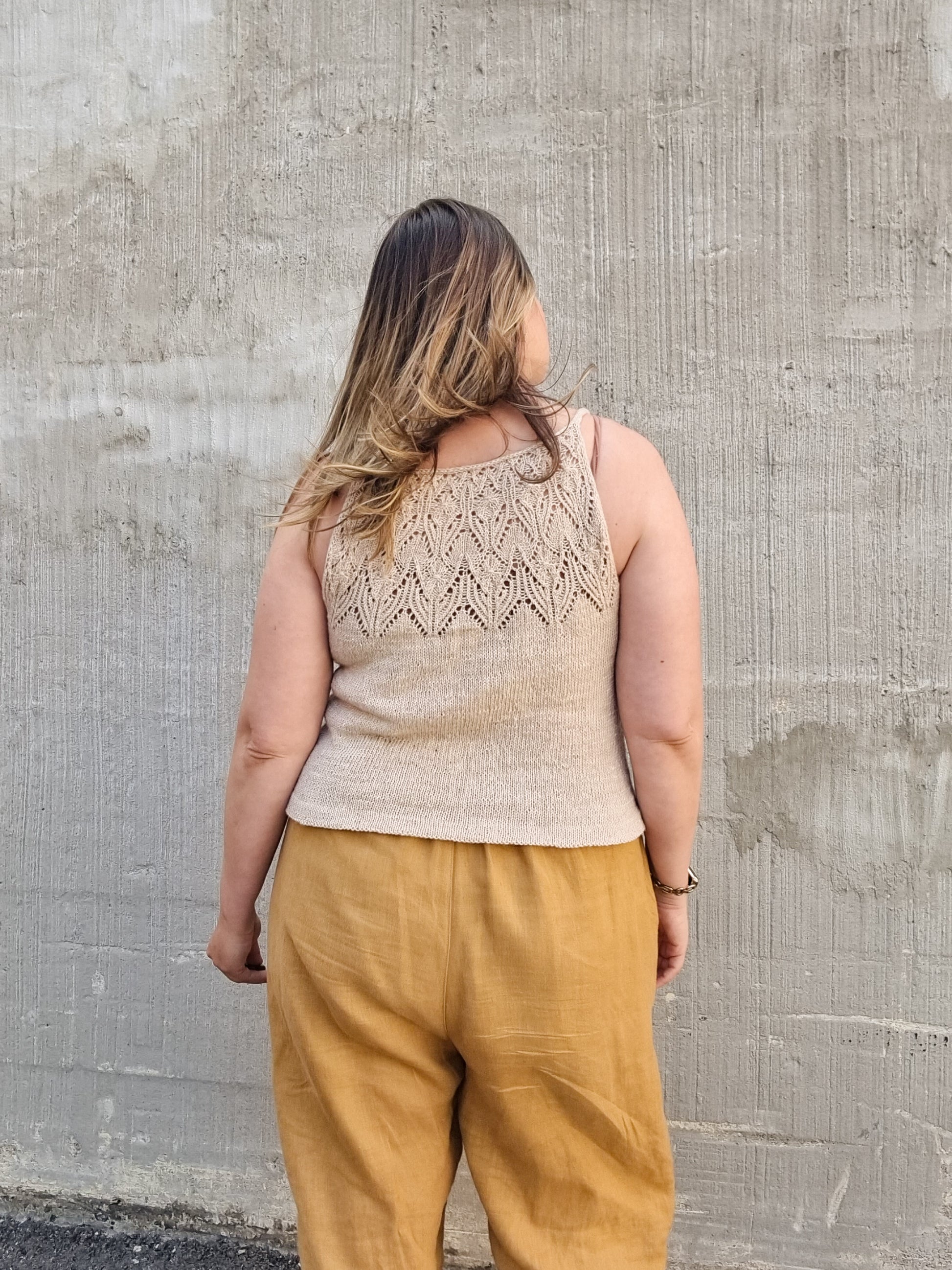 The Kuutar top is knitted seamlessly from the top down with the beautiful lace pattern on the front and back. The back and front are knitted separately down to the armholes. Then the pieces are joined and the body is knitted in the round. The hem is folded double to give the top a neat and finished look. The top of the front and back are finished with an i-cord edging that continues seamlessly into the straps.