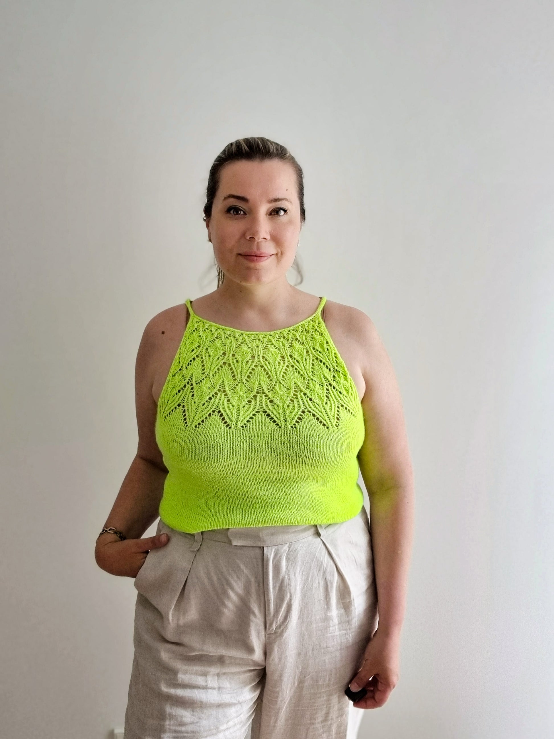 The Kuutar top is best suited for cotton, viscose or linen blend yarns with good stitch definition. I recommend choosing unicolor or slightly tonal colorways for the lace to show.