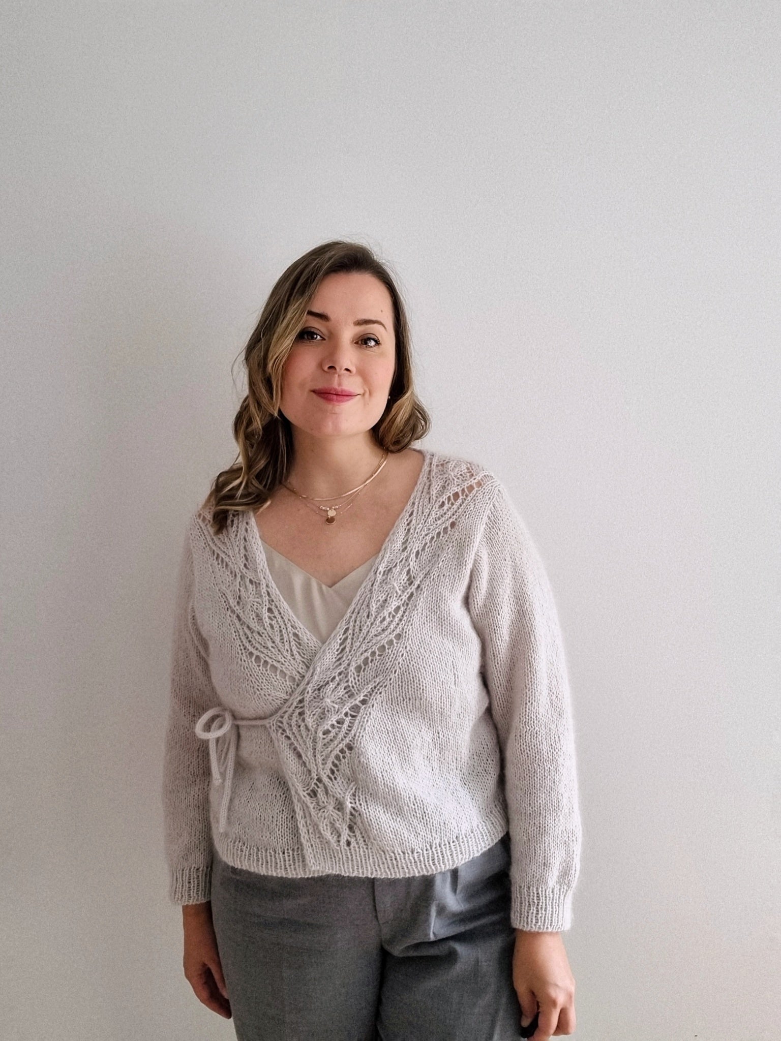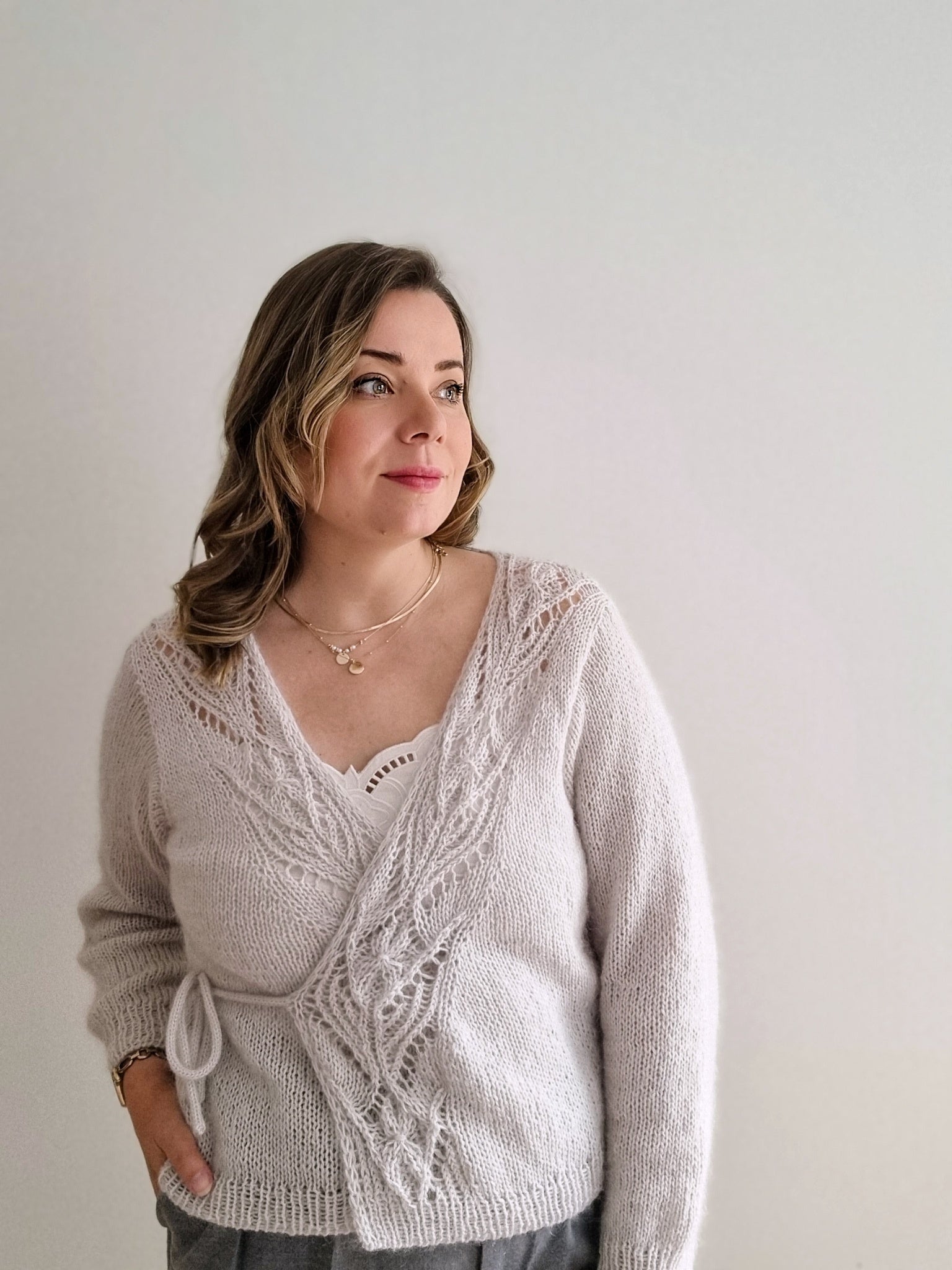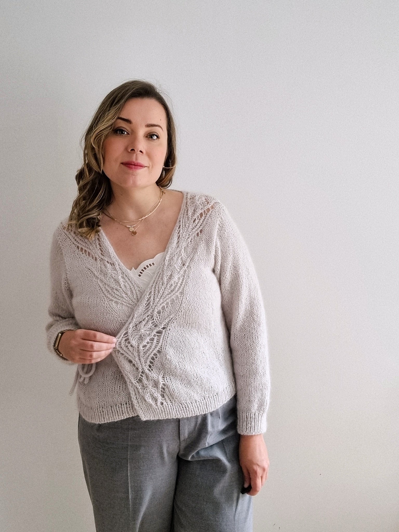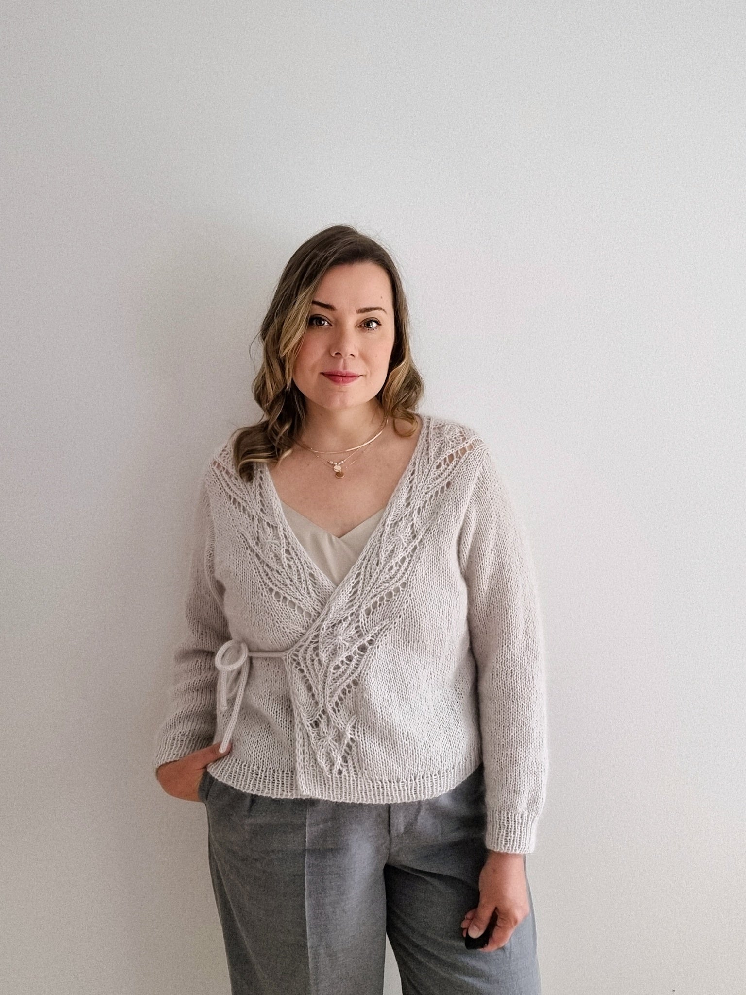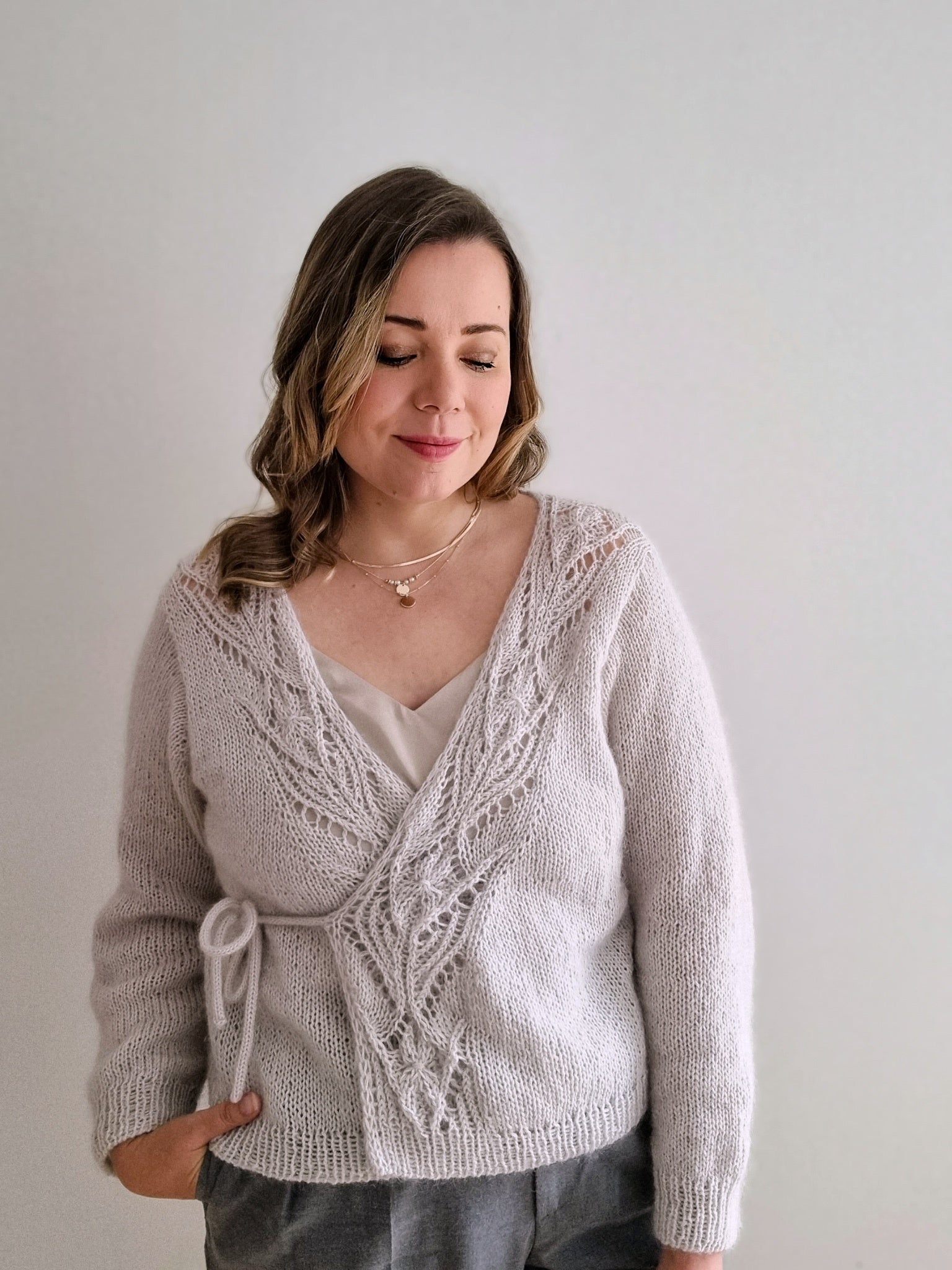 The Kuutar wrap is knitted seamlessly top down. The back is first knitted flat until the armholes, then the stitches for the fronts are picked up from the shoulders and worked separately until the armholes, before joining all pieces together. The body is worked in one piece until the hem. A lace pattern is knitted at the edge of both fronts. The increases for the fronts and the armholes are easily tracked using a row-by-row cheat sheet.