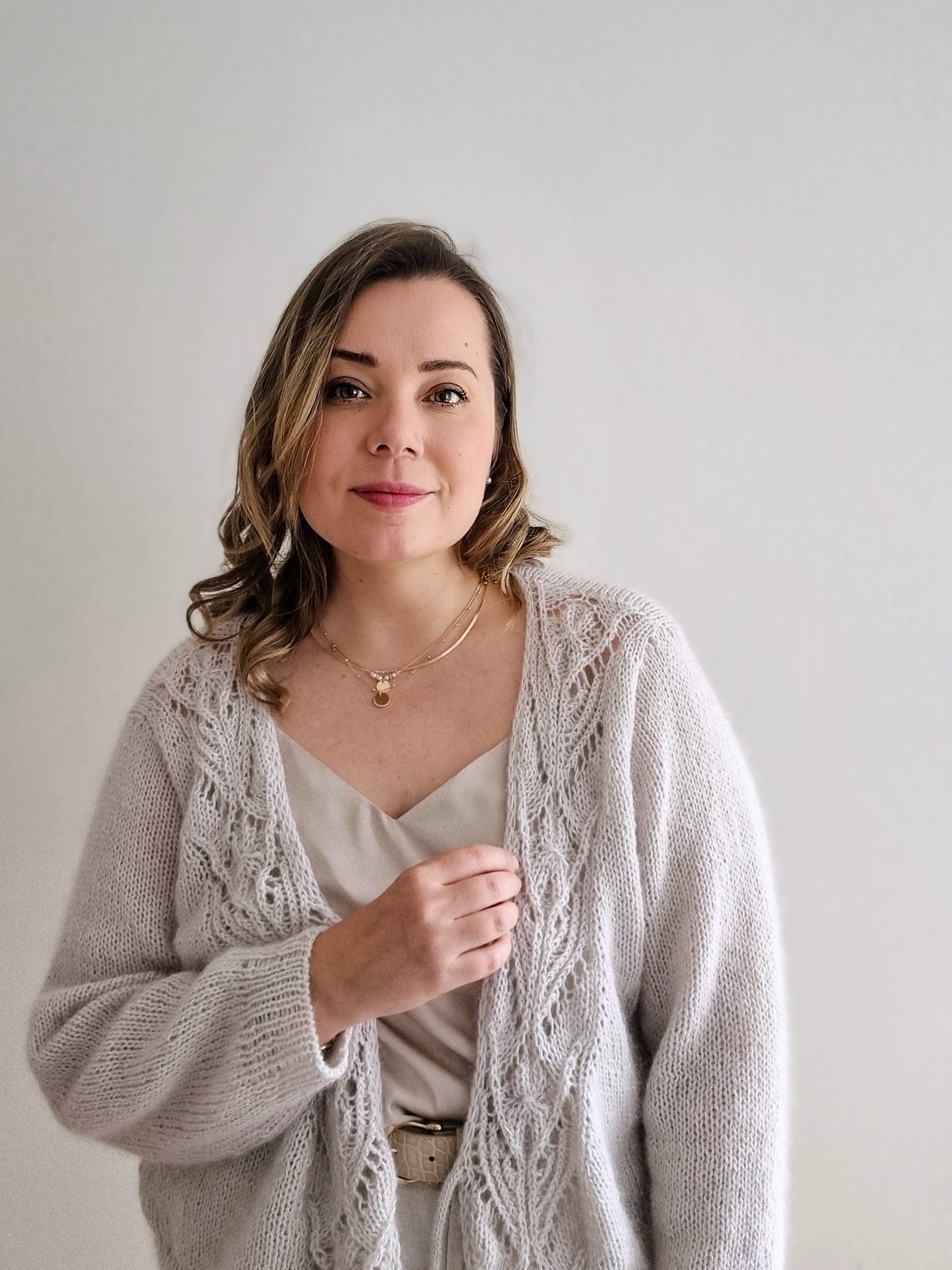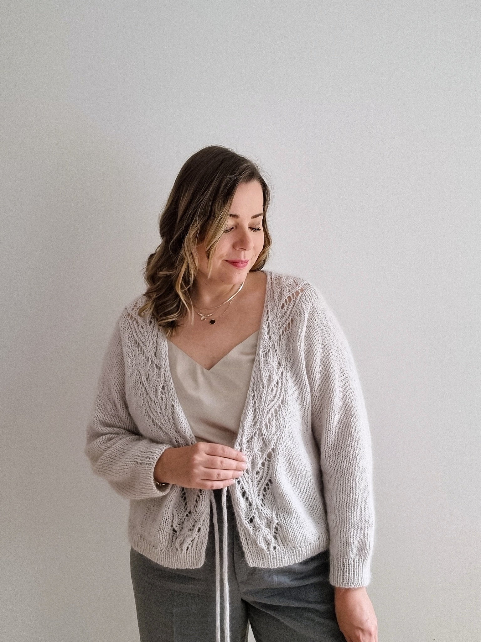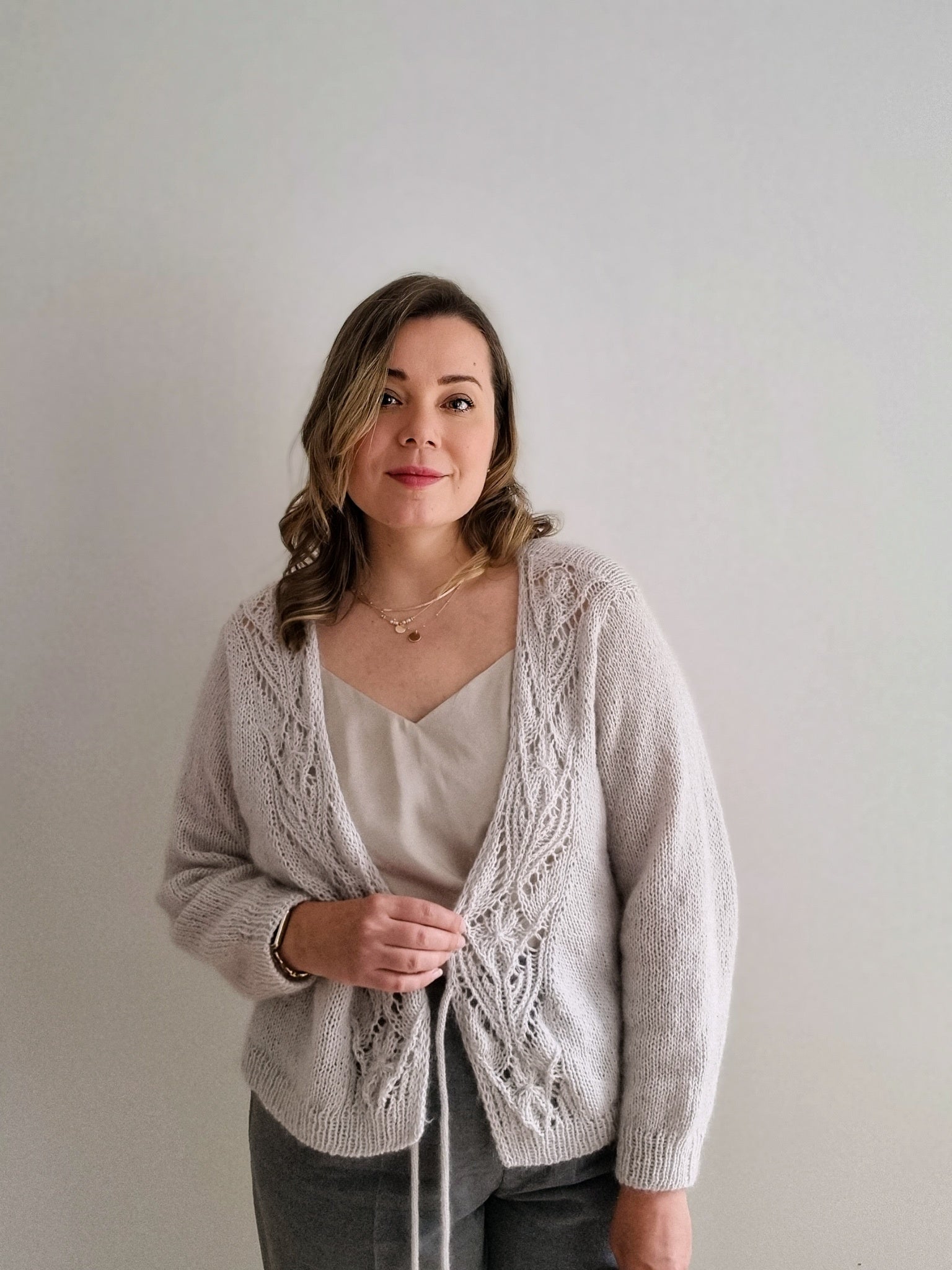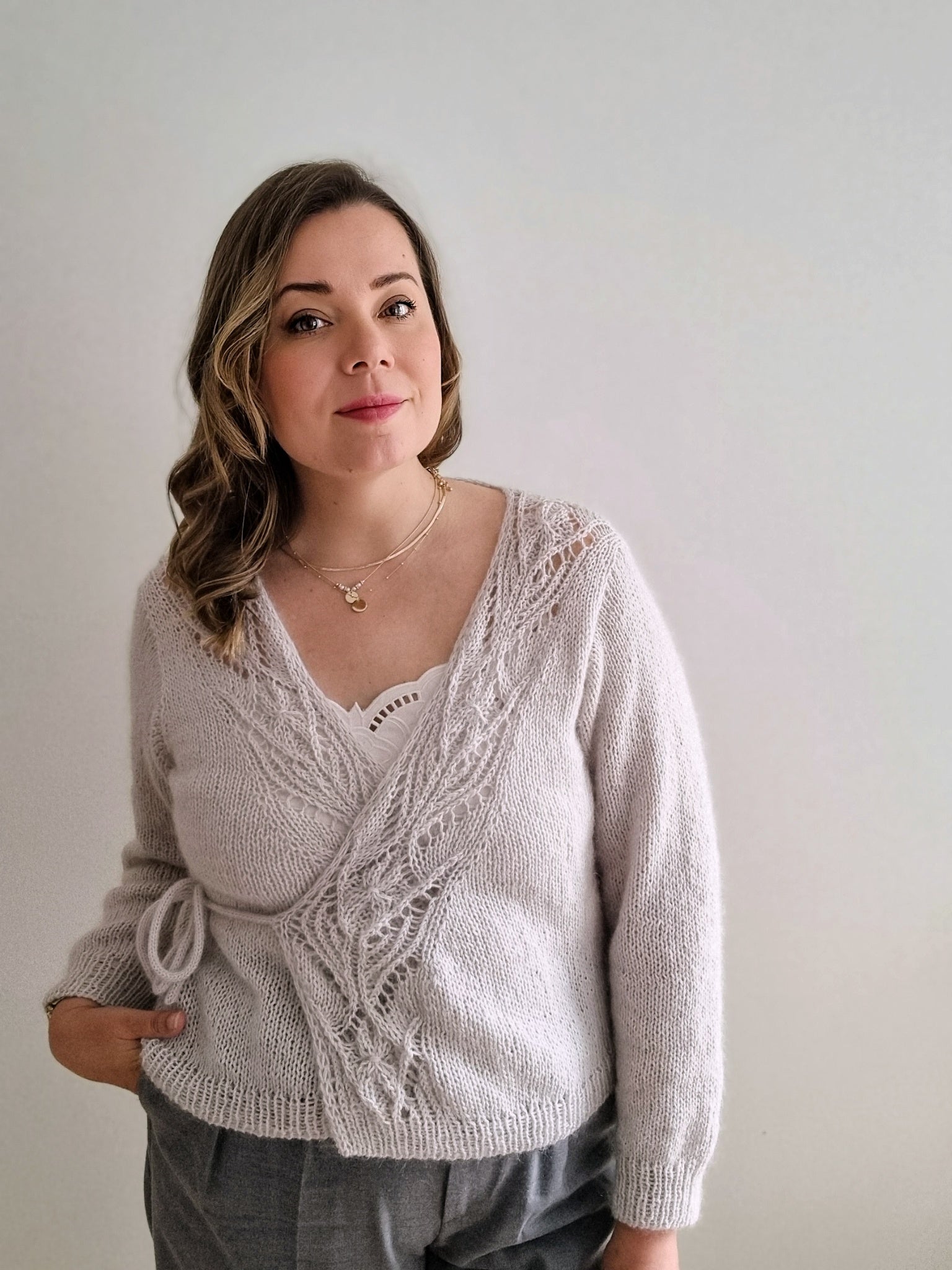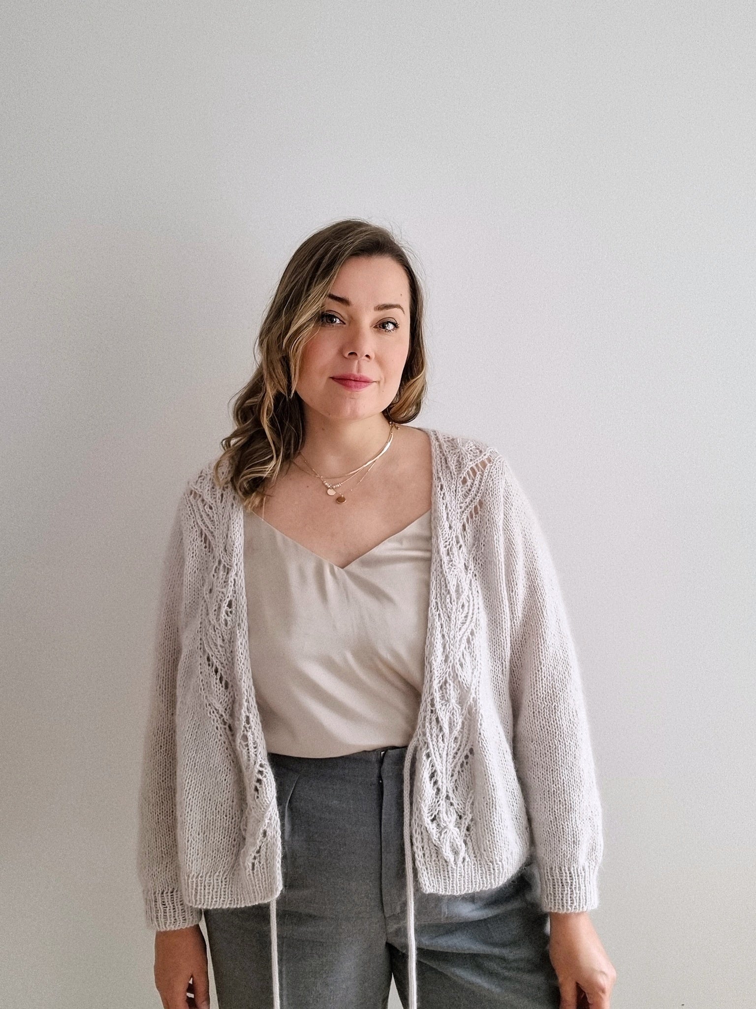 The Kuutar wrap is knitted seamlessly top down. The back is first knitted flat until the armholes, then the stitches for the fronts are picked up from the shoulders and worked separately until the armholes, before joining all pieces together. The body is worked in one piece until the hem. A lace pattern is knitted at the edge of both fronts. The increases for the fronts and the armholes are easily tracked using a row-by-row cheat sheet.