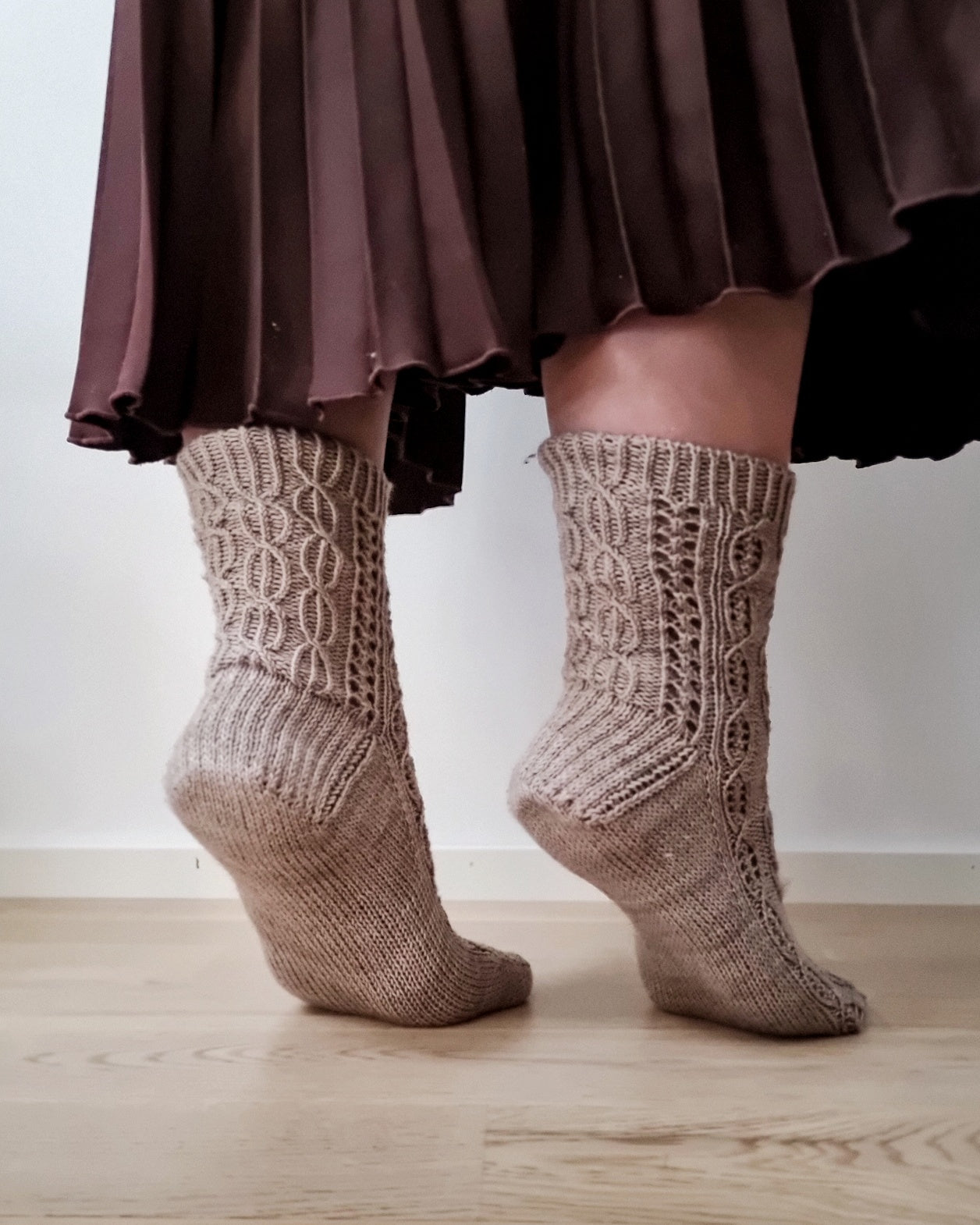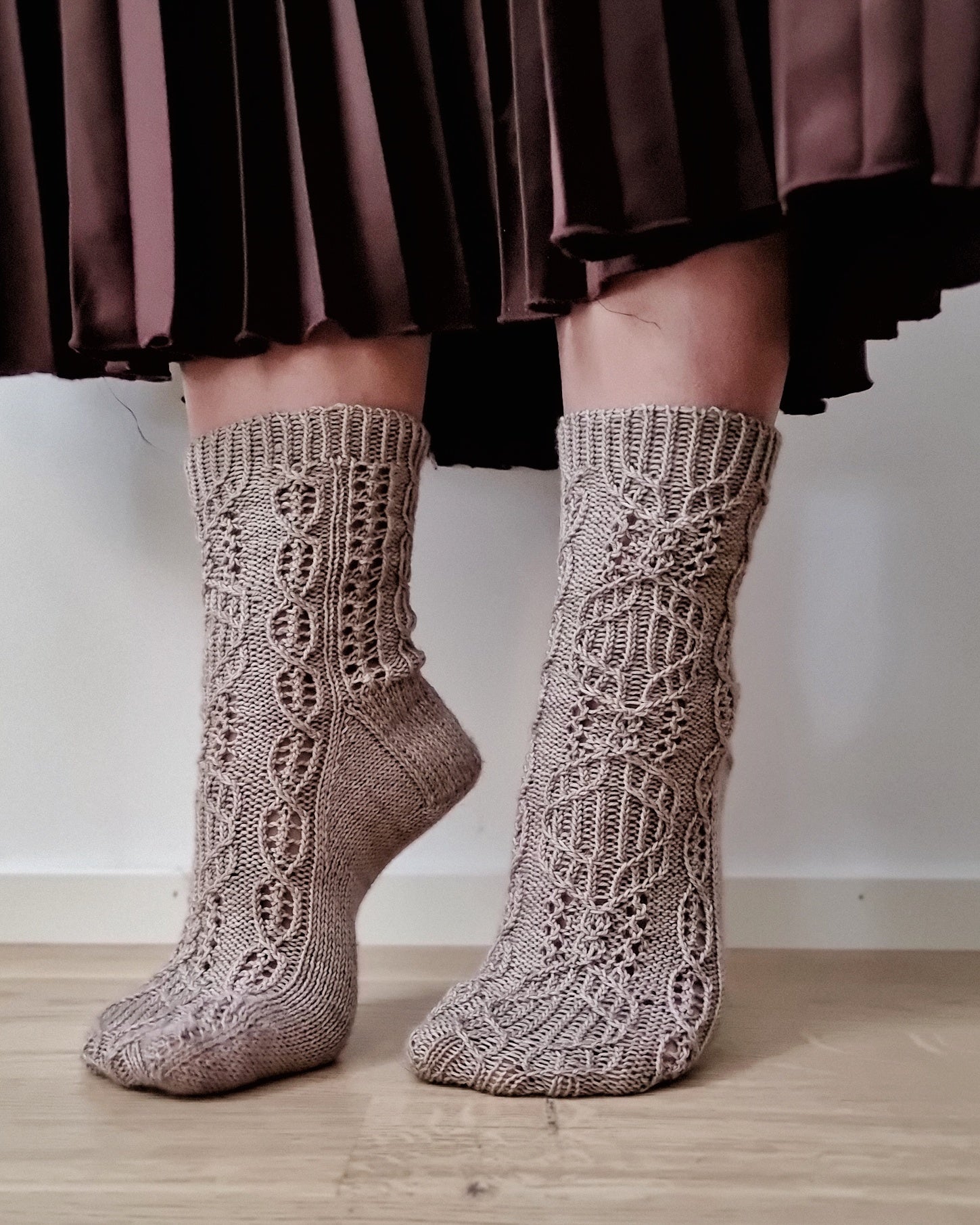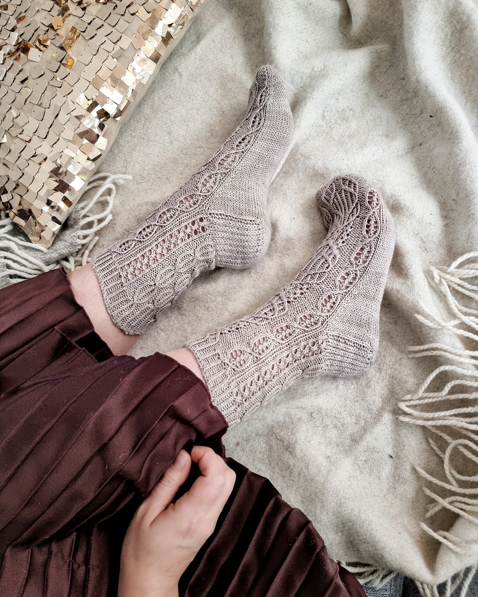 The Lucia socks look best in solid or slightly variegated colors for the stitch pattern to show in its full glory.