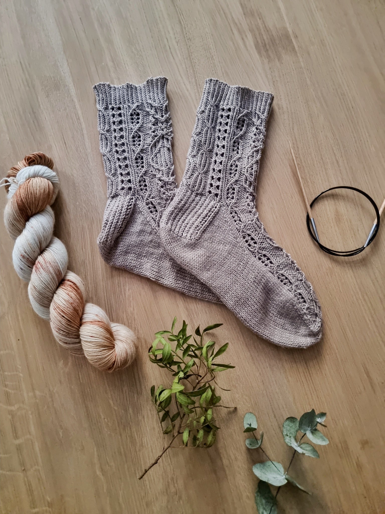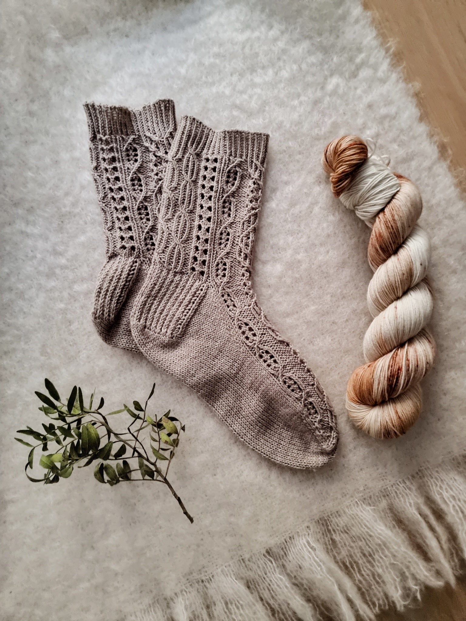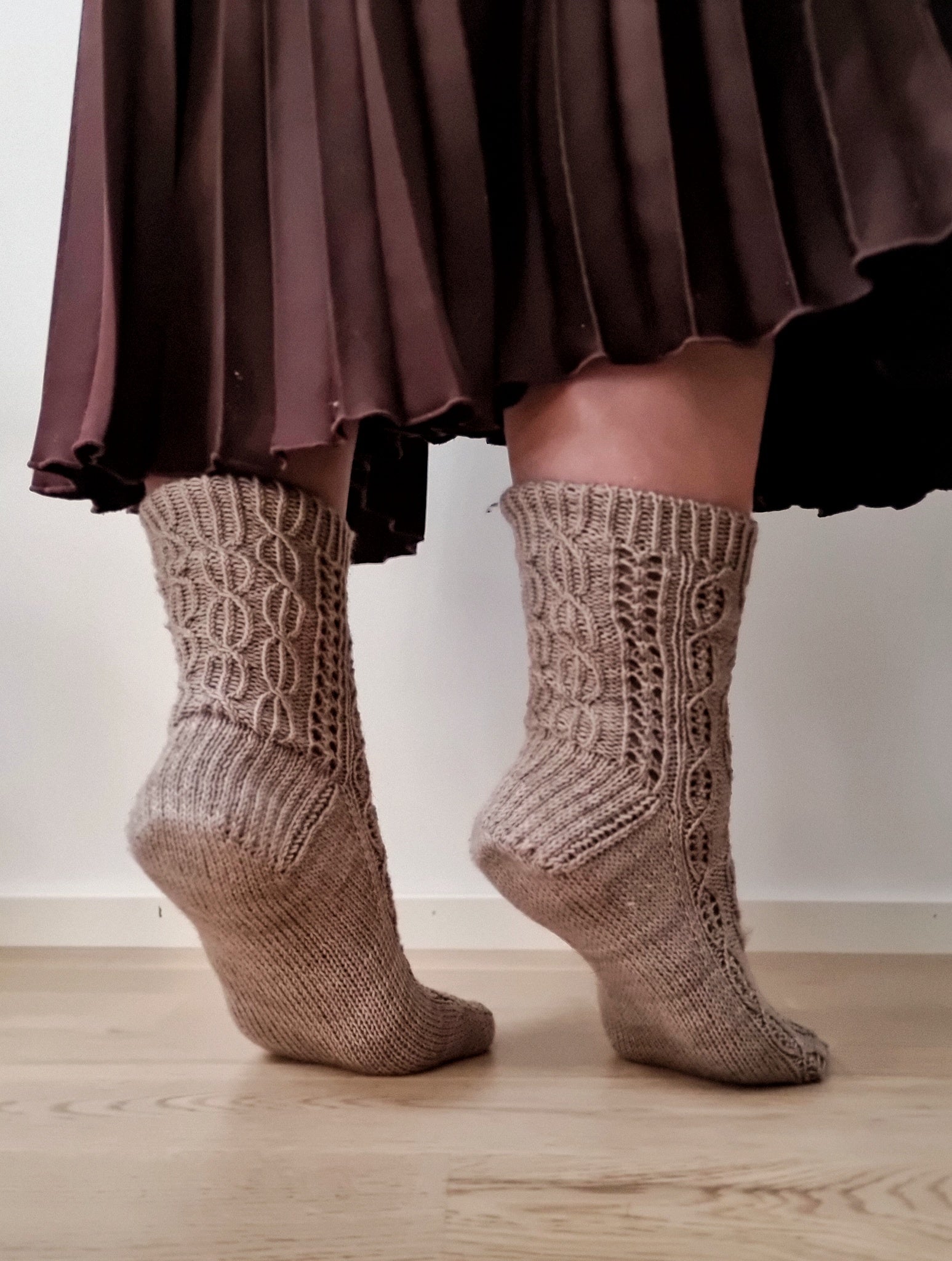 The Lucia socks look best in solid or slightly variegated colors for the stitch pattern to show in its full glory.