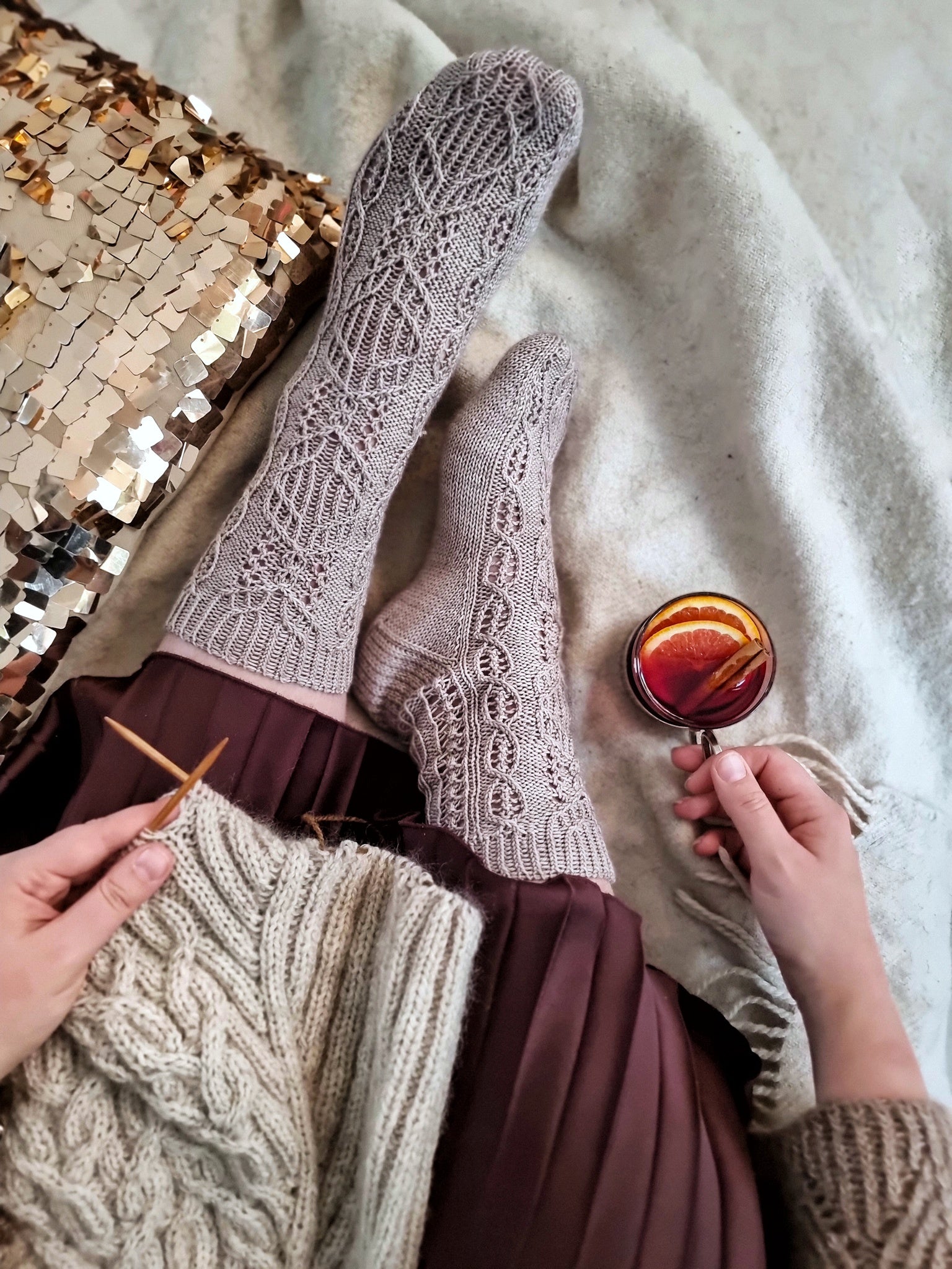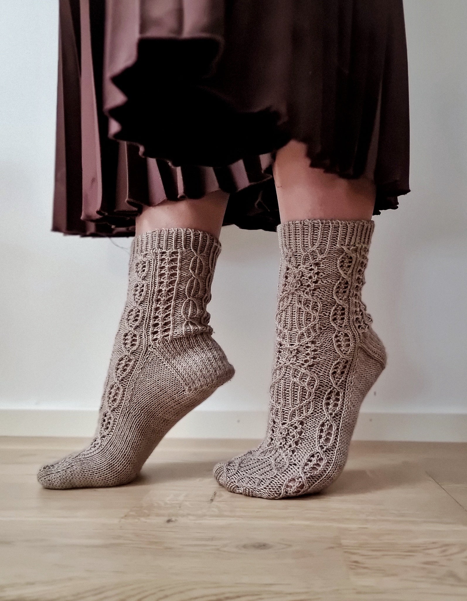 The Lucia socks are knitted toe up with a lace and cable pattern. The socks are started with Judy’s magic cast on and are best worked with the magic loop technique. The instep and later on the back of the leg are worked in beautiful lace and cable patterns with twisted stitches. The heels are worked with gussets and a heel construction that mimics the French heel. The heel flaps are knitted in a reinforced stitch pattern to give them durability. All techniques needed for completing these socks are explained in this pattern.