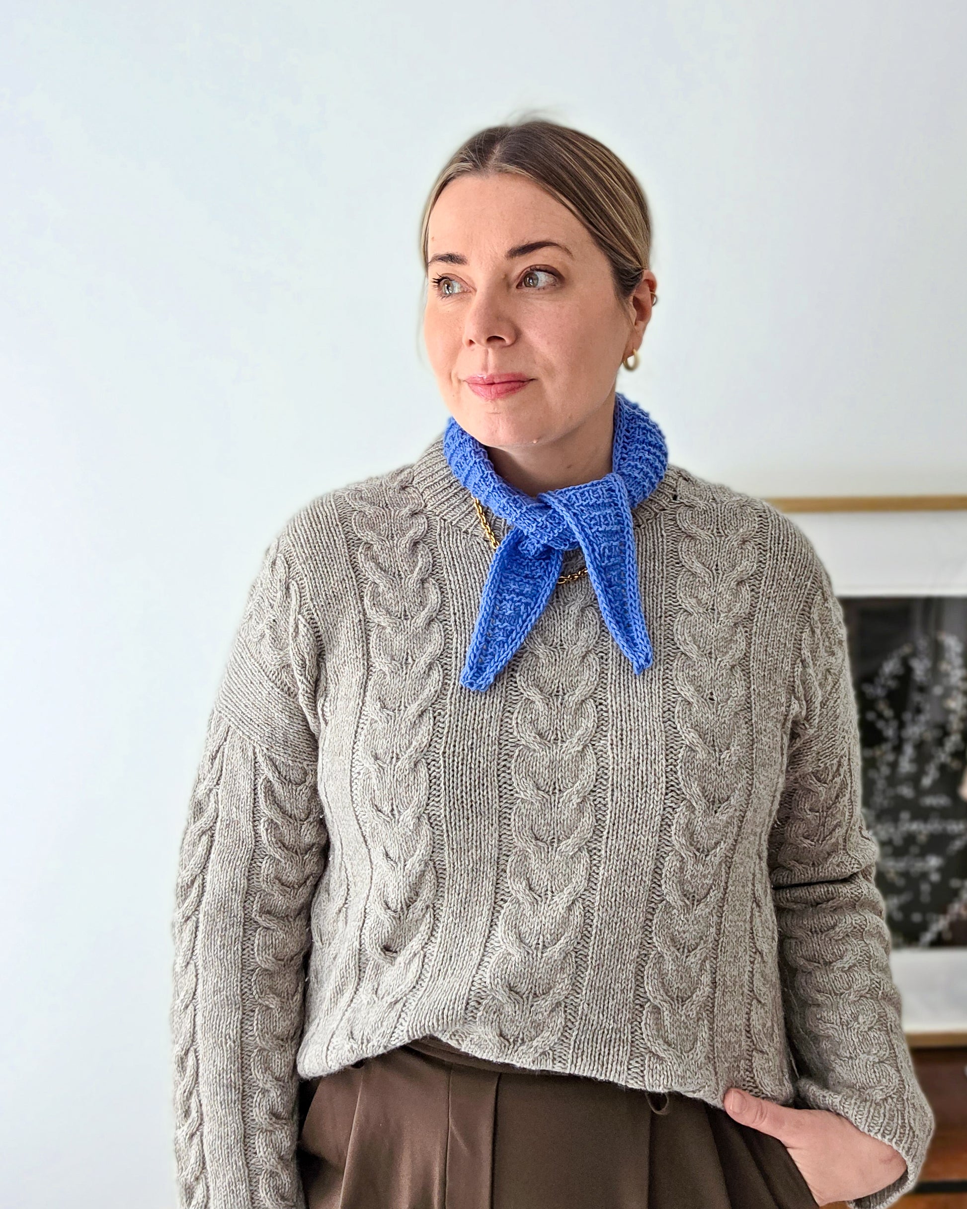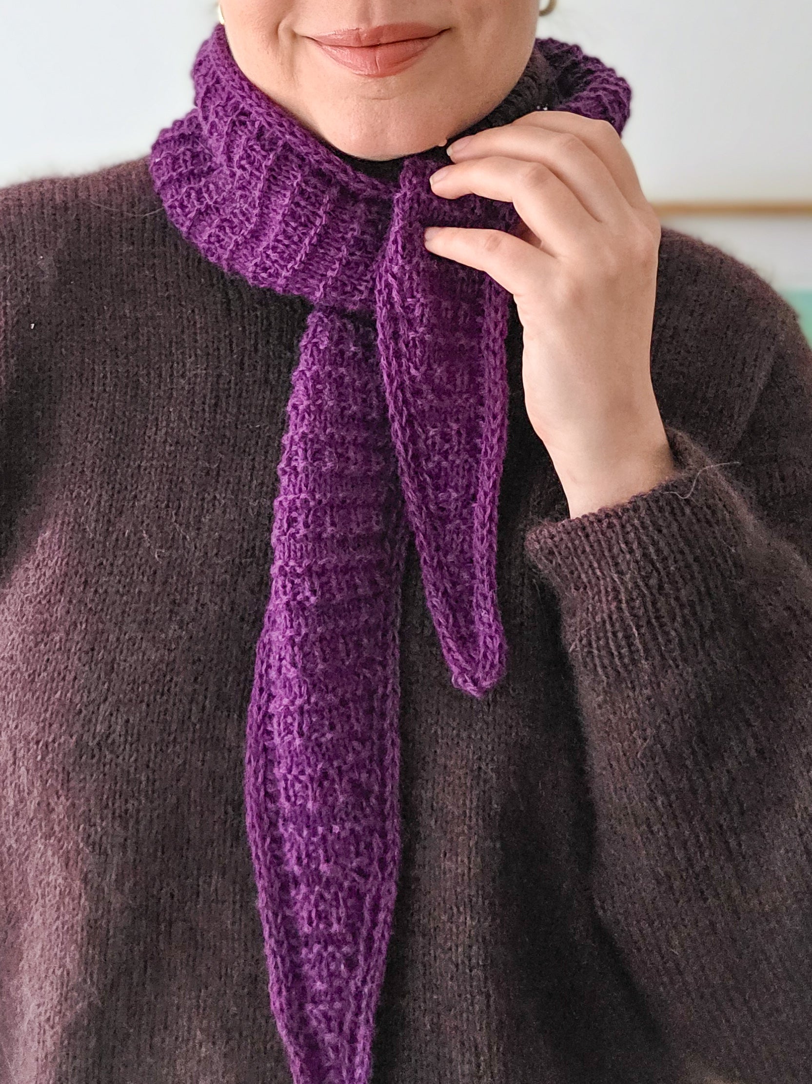 The Lucy Shawl is a small triangular kerchief designed to be worn in multiple ways. It comes in two sizes: Size 1 is a slimmer, shorter version that wraps comfortably around the neck once, while Size 2 is longer and allows for a cozy double wrap.