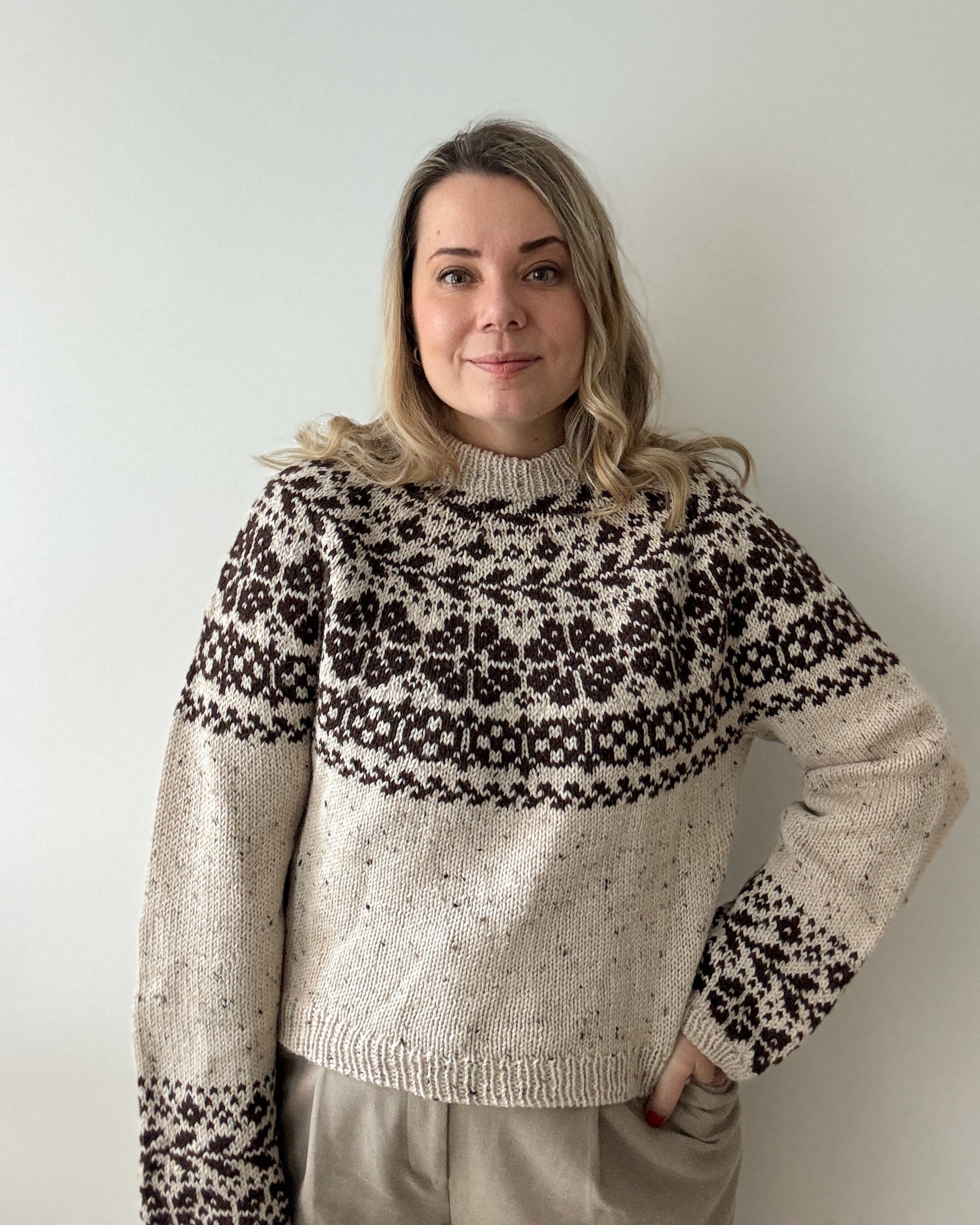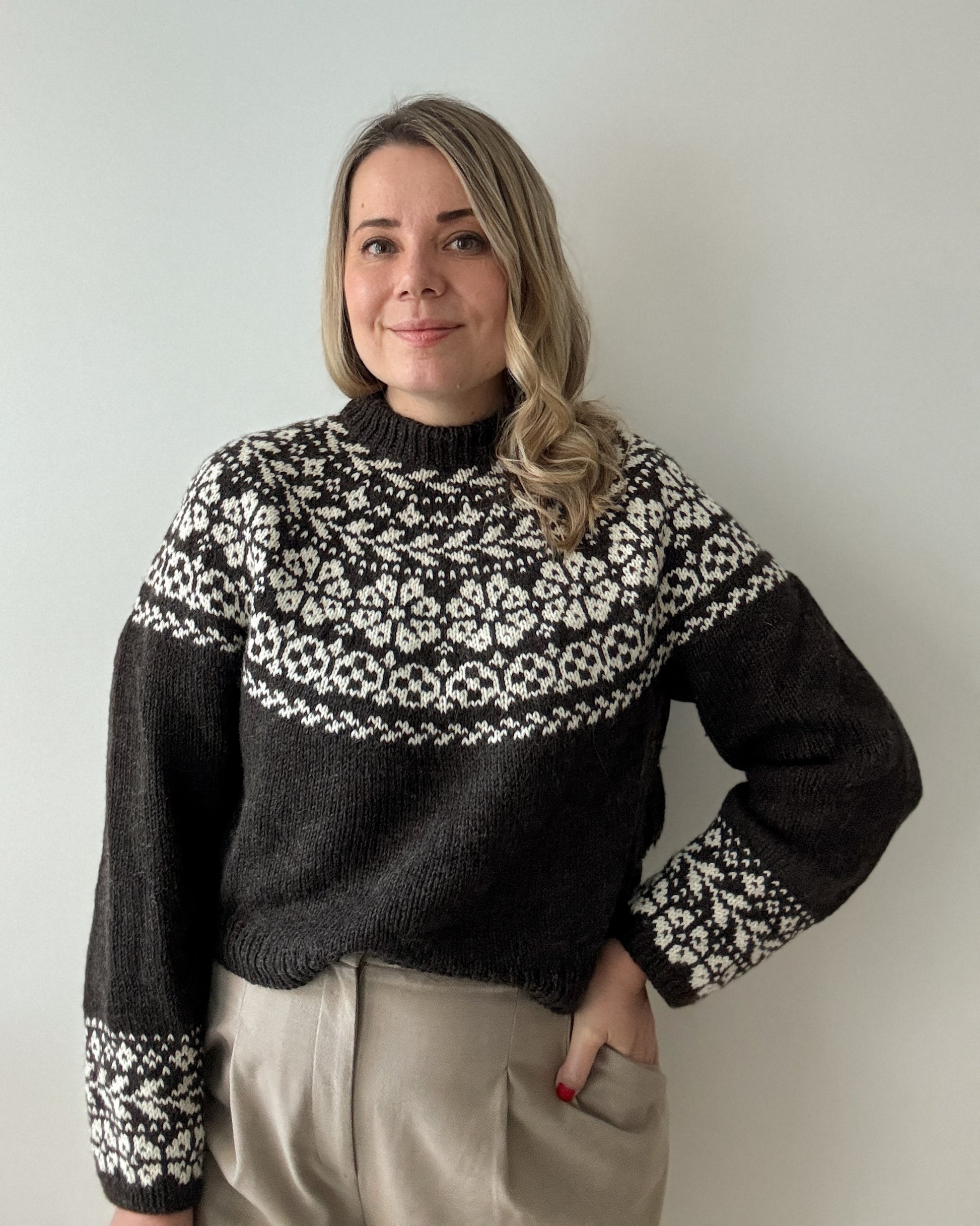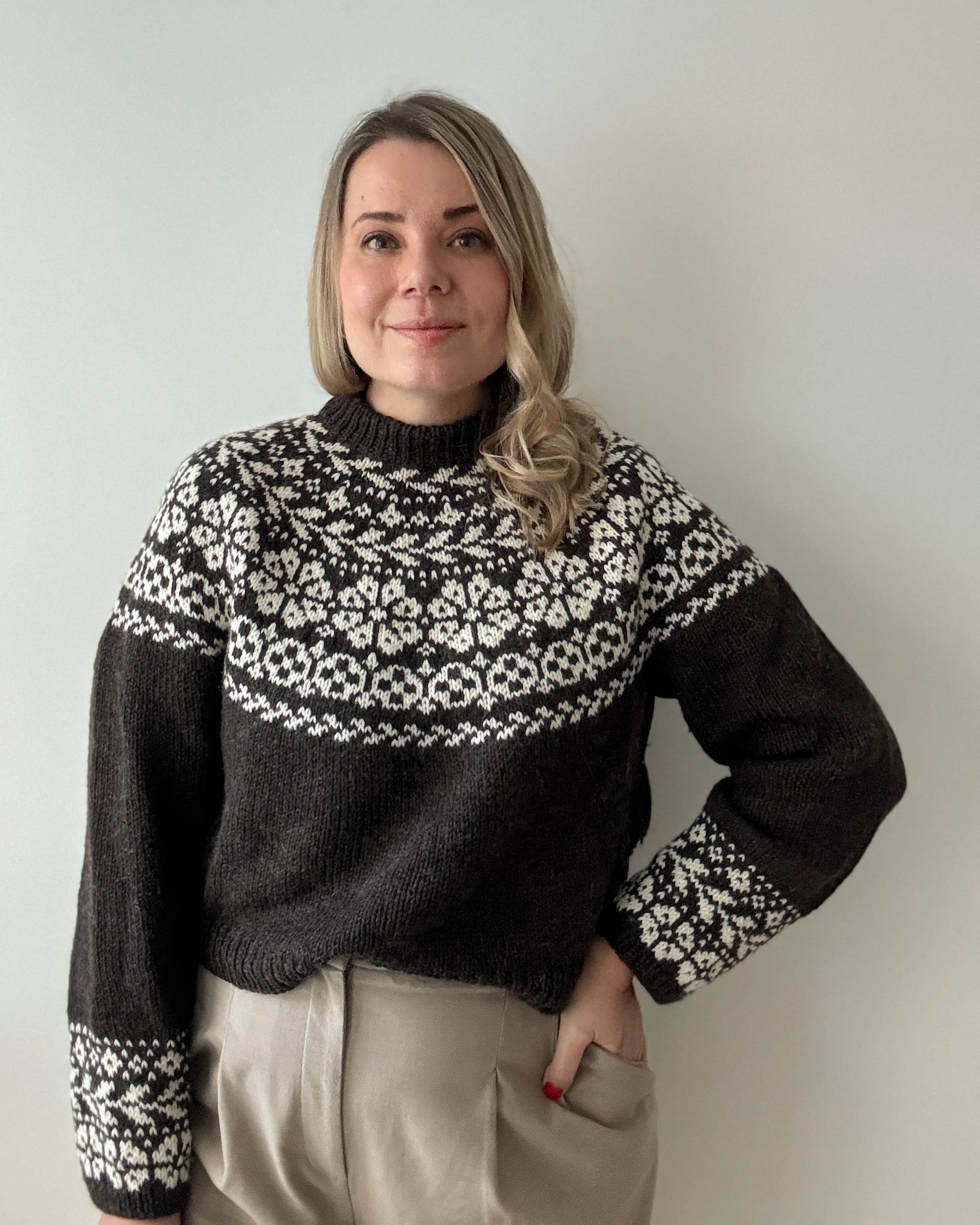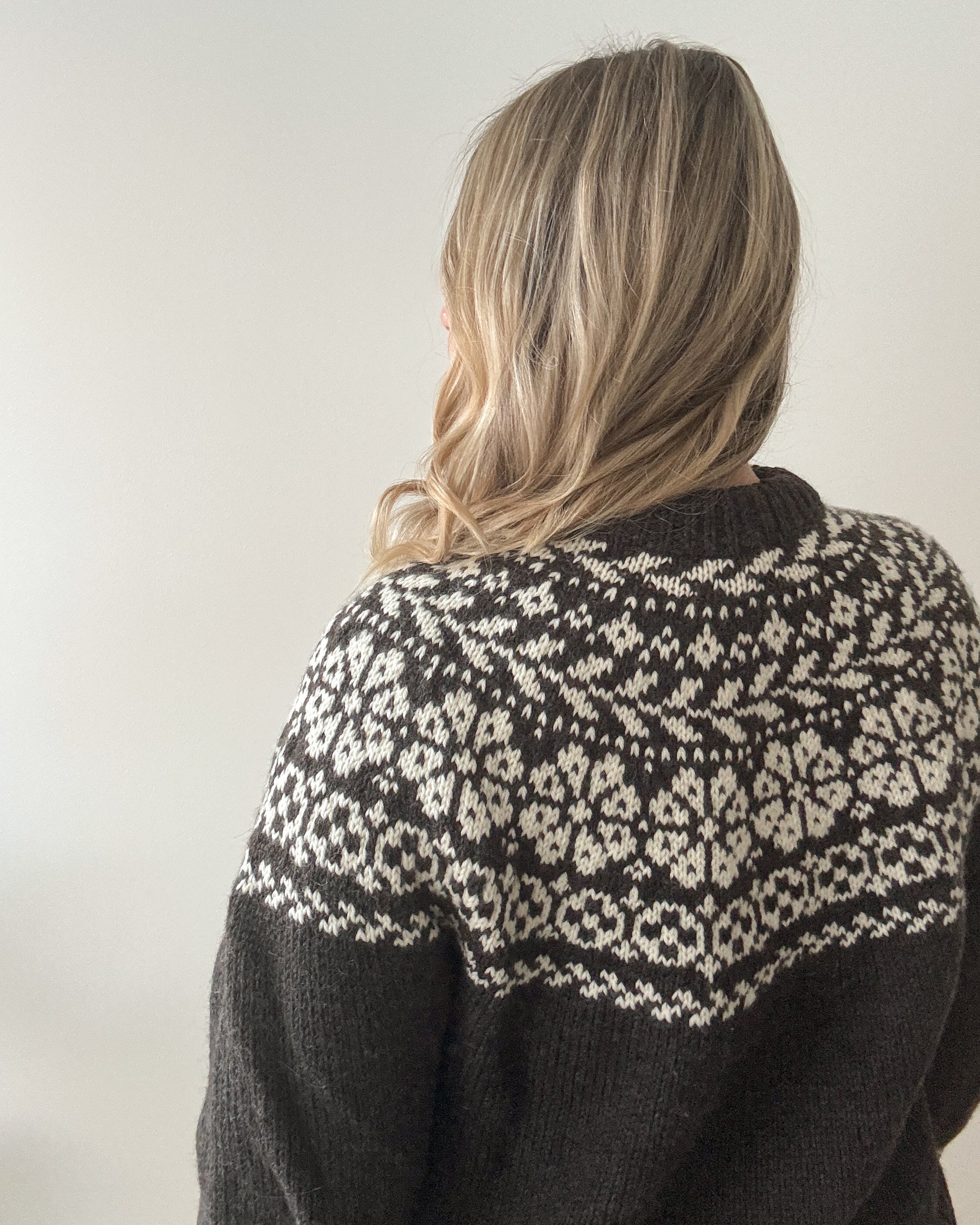 The yoke is knitted in stranded colorwork with increases incorporated into the pattern. Choose 2 colors with enough contrast for the best result.