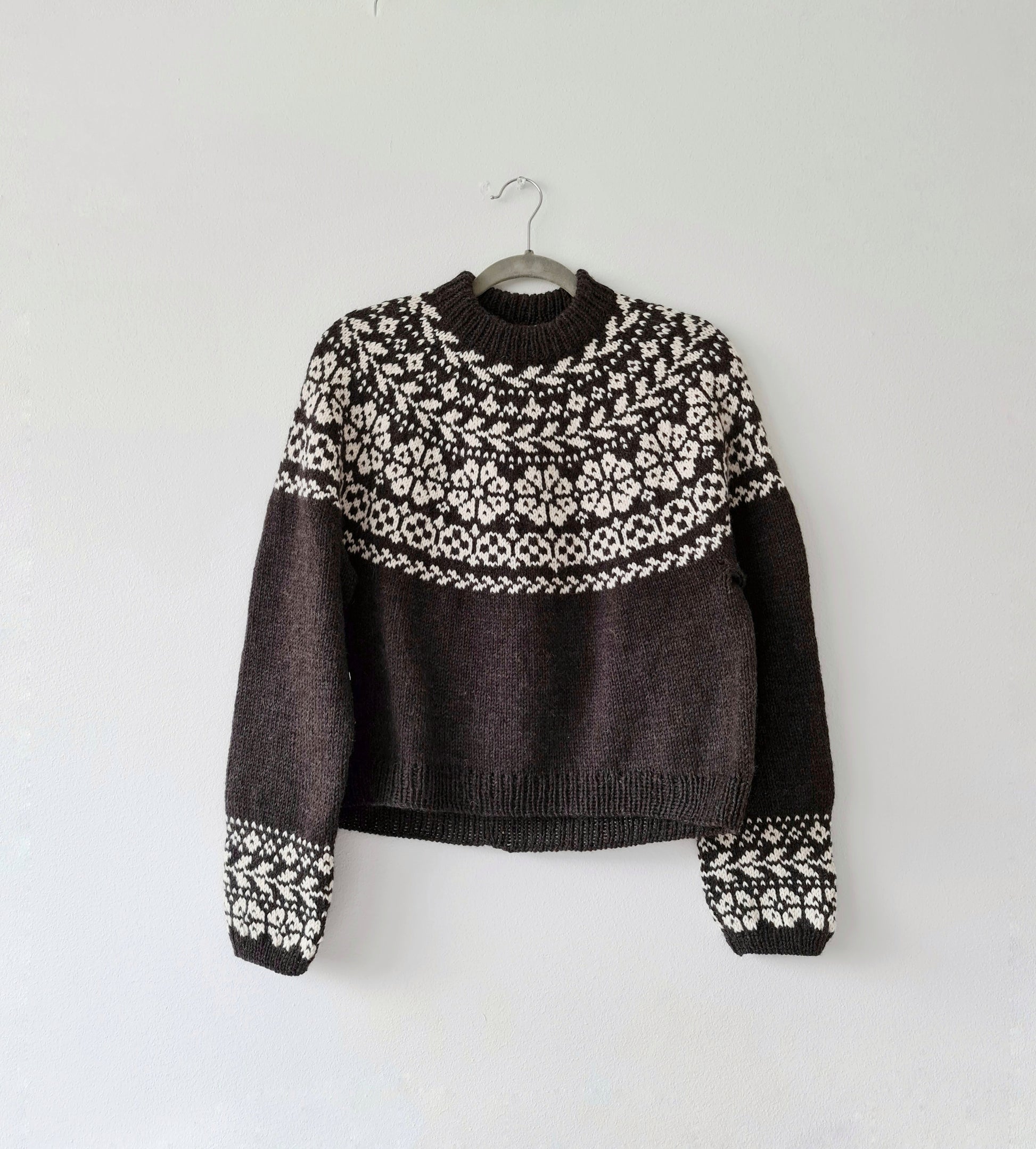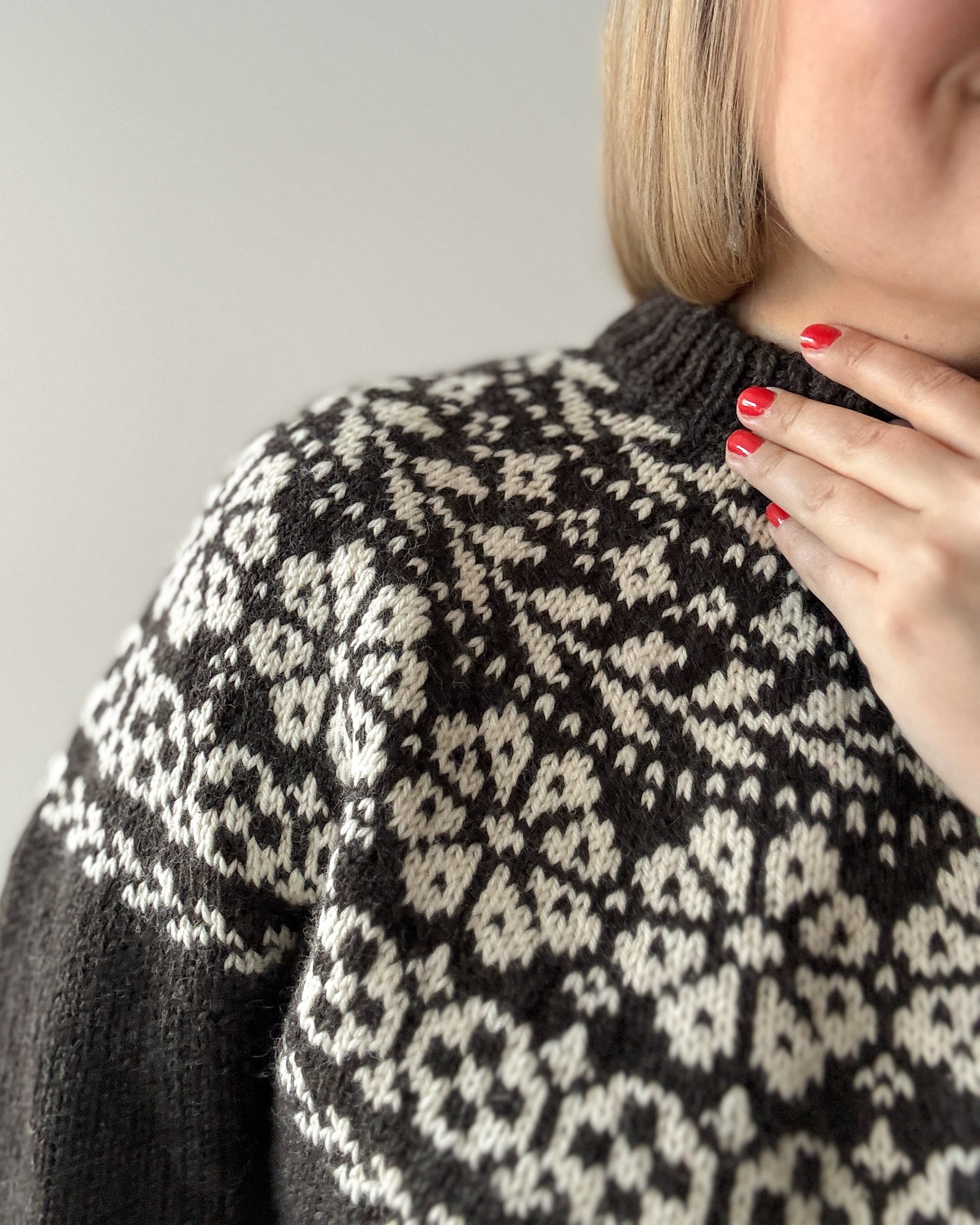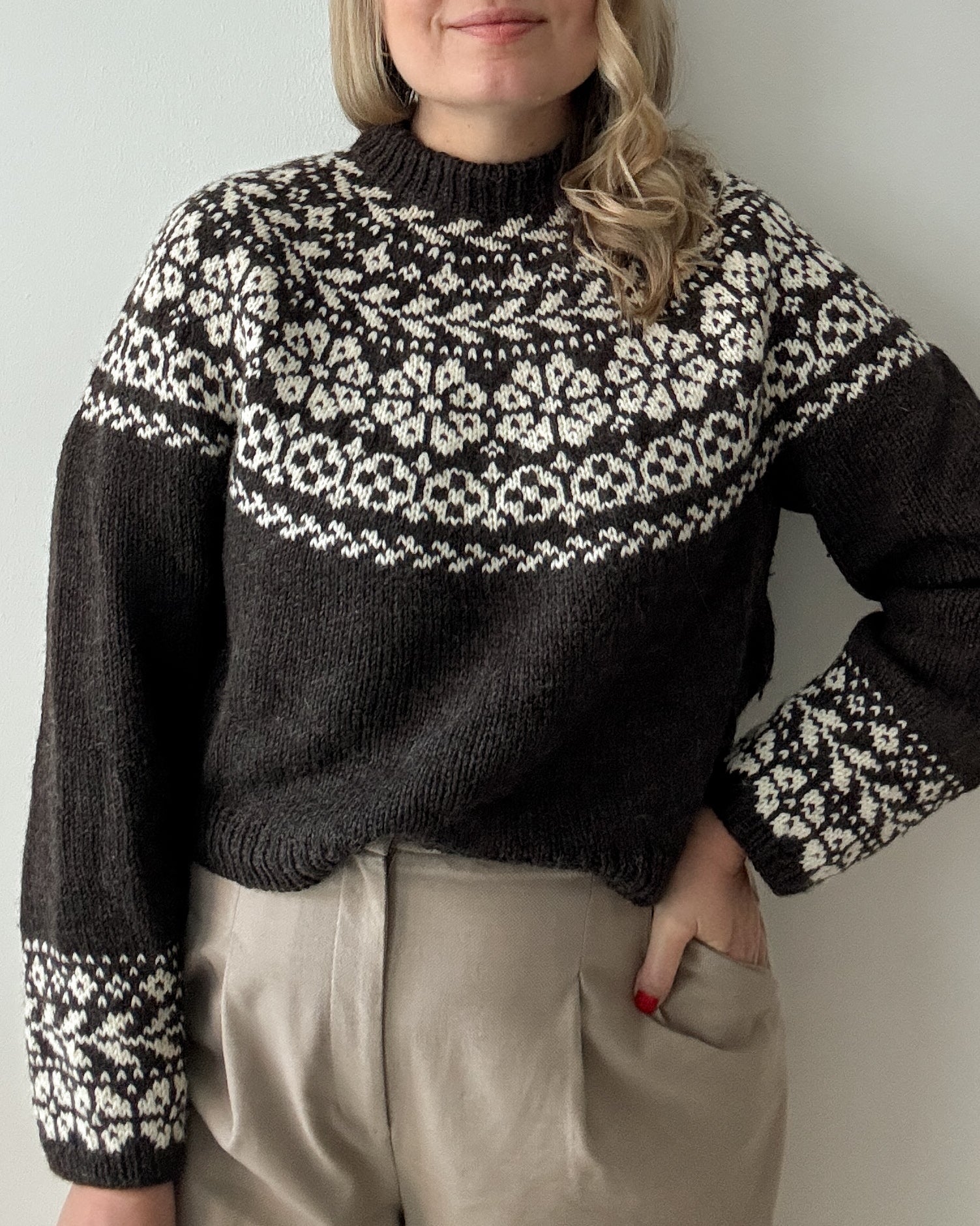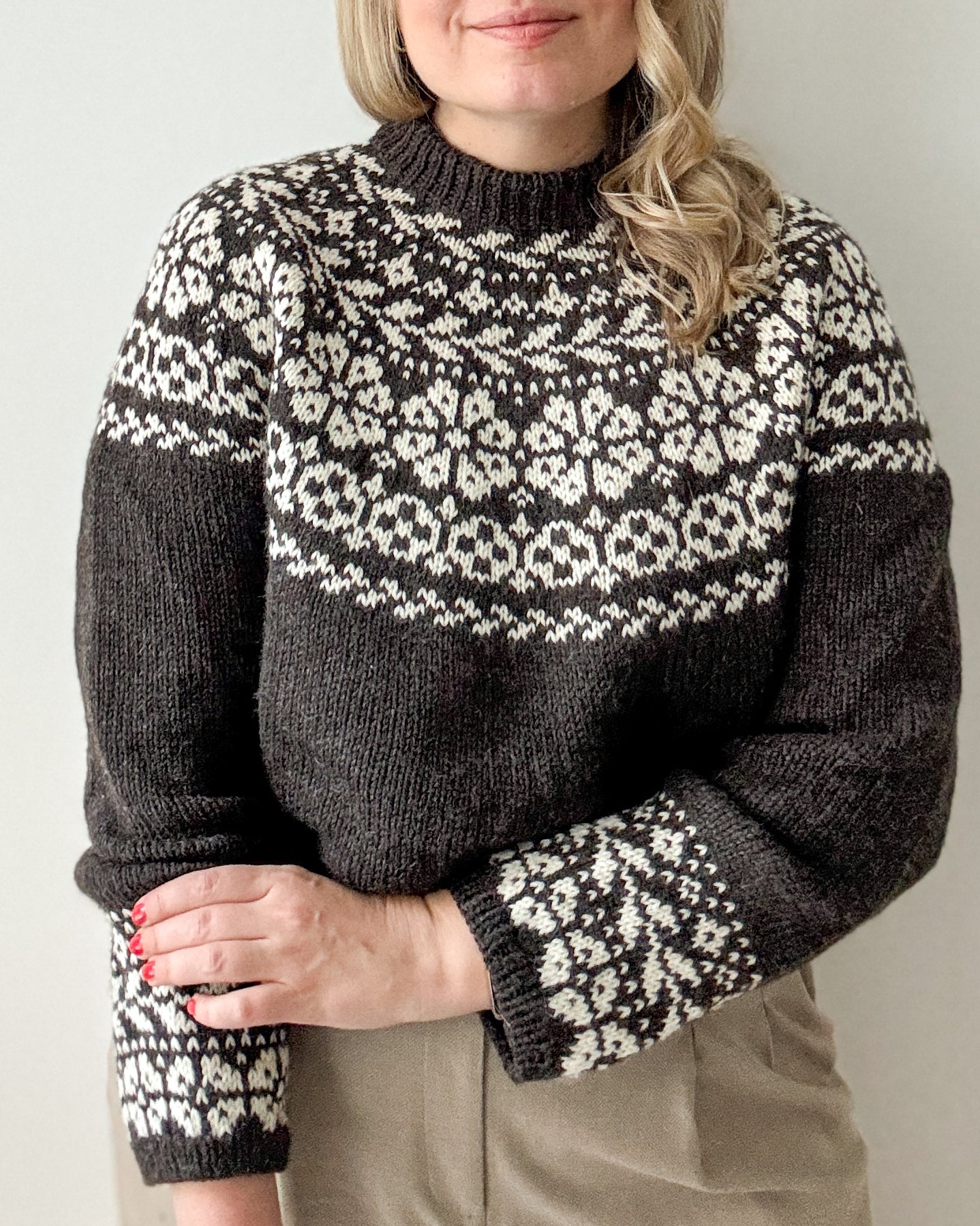 The yoke is knitted in stranded colorwork with increases incorporated into the pattern. Choose 2 colors with enough contrast for the best result.