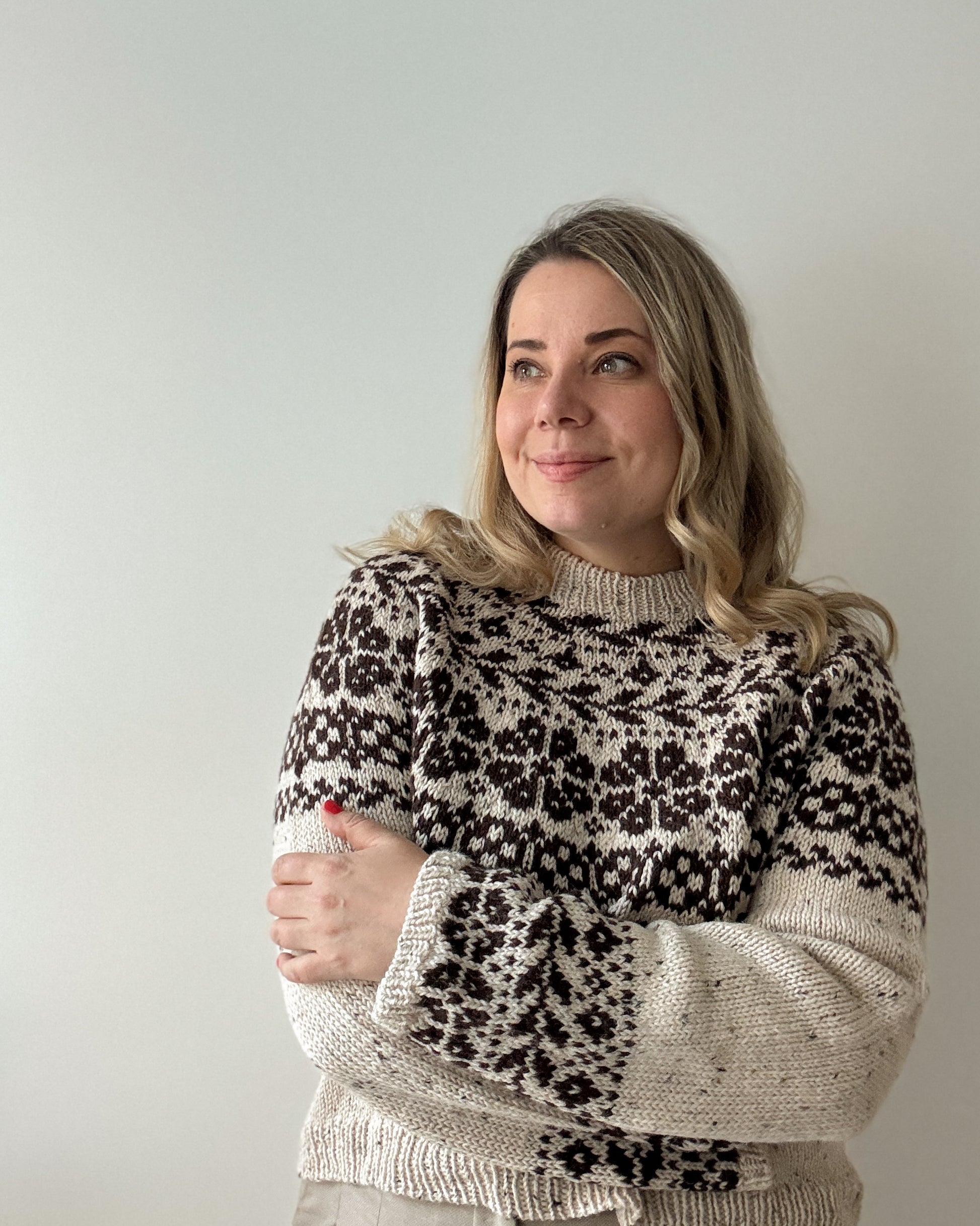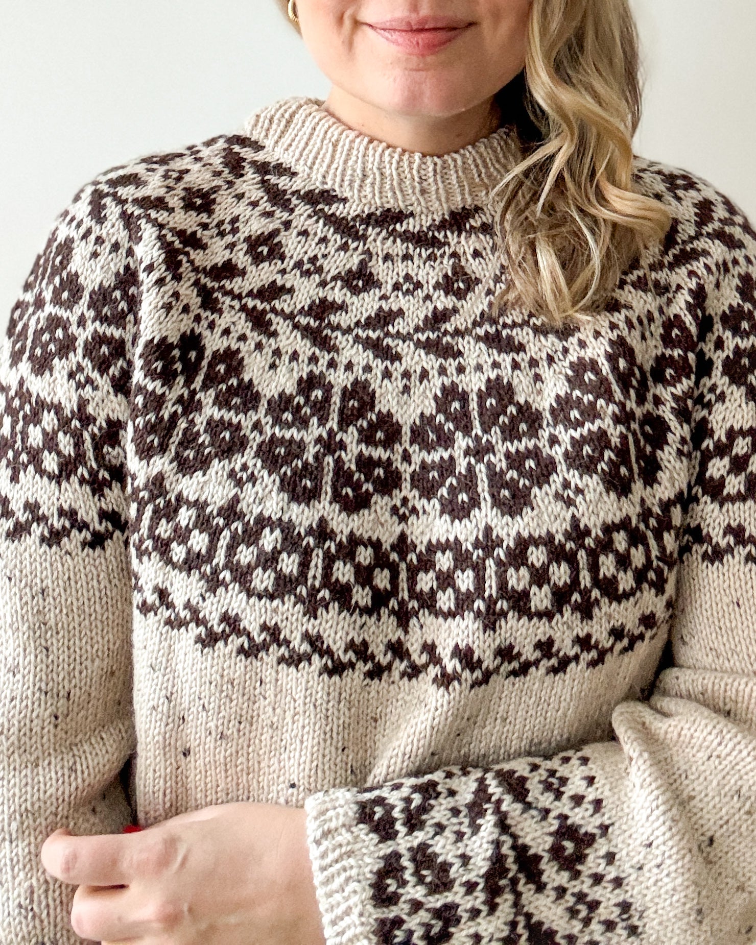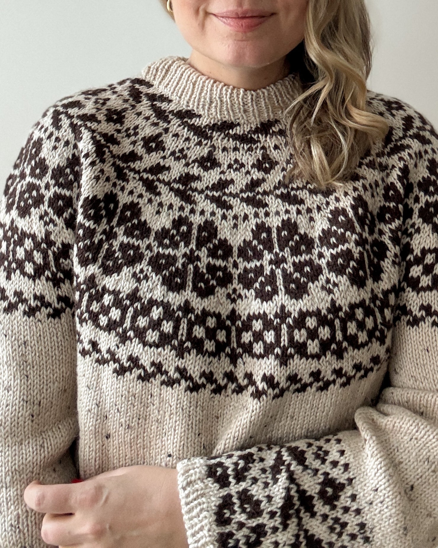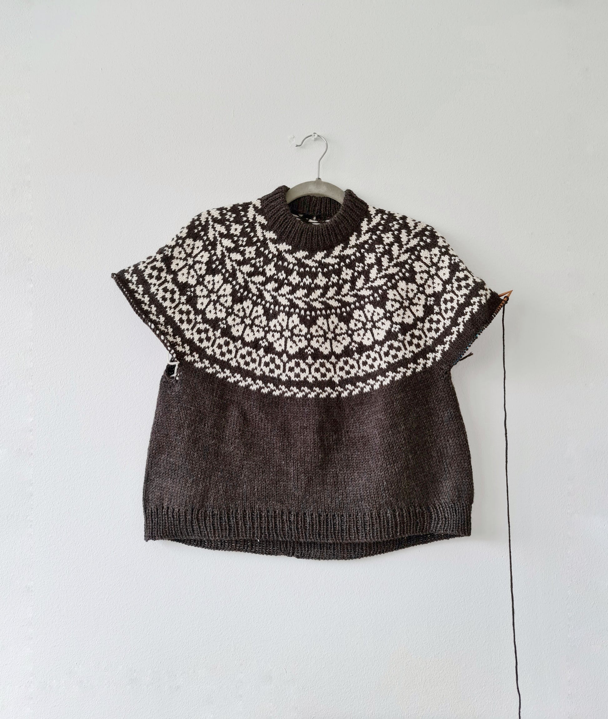 The yoke is knitted in stranded colorwork with increases incorporated into the pattern. Choose 2 colors with enough contrast for the best result.