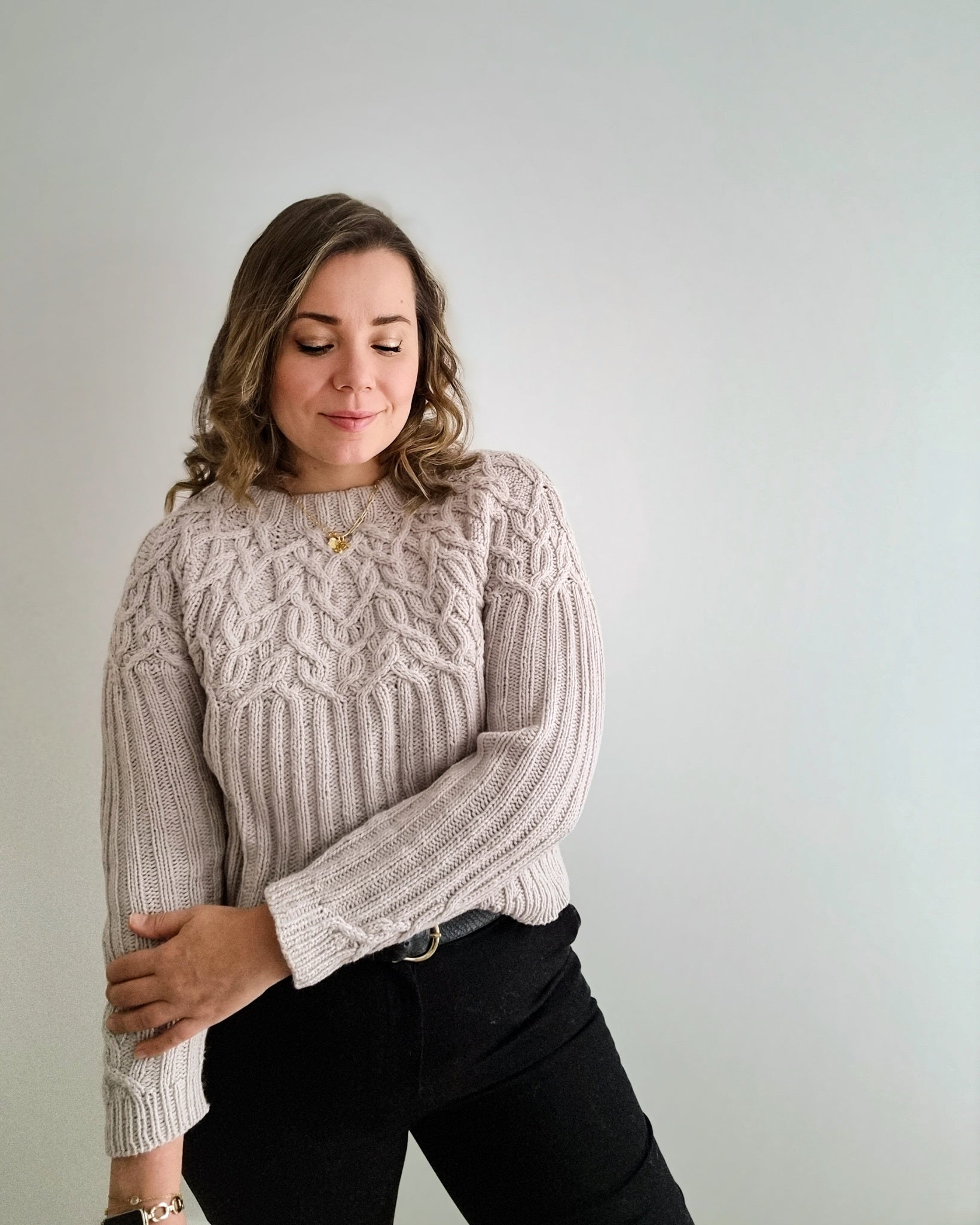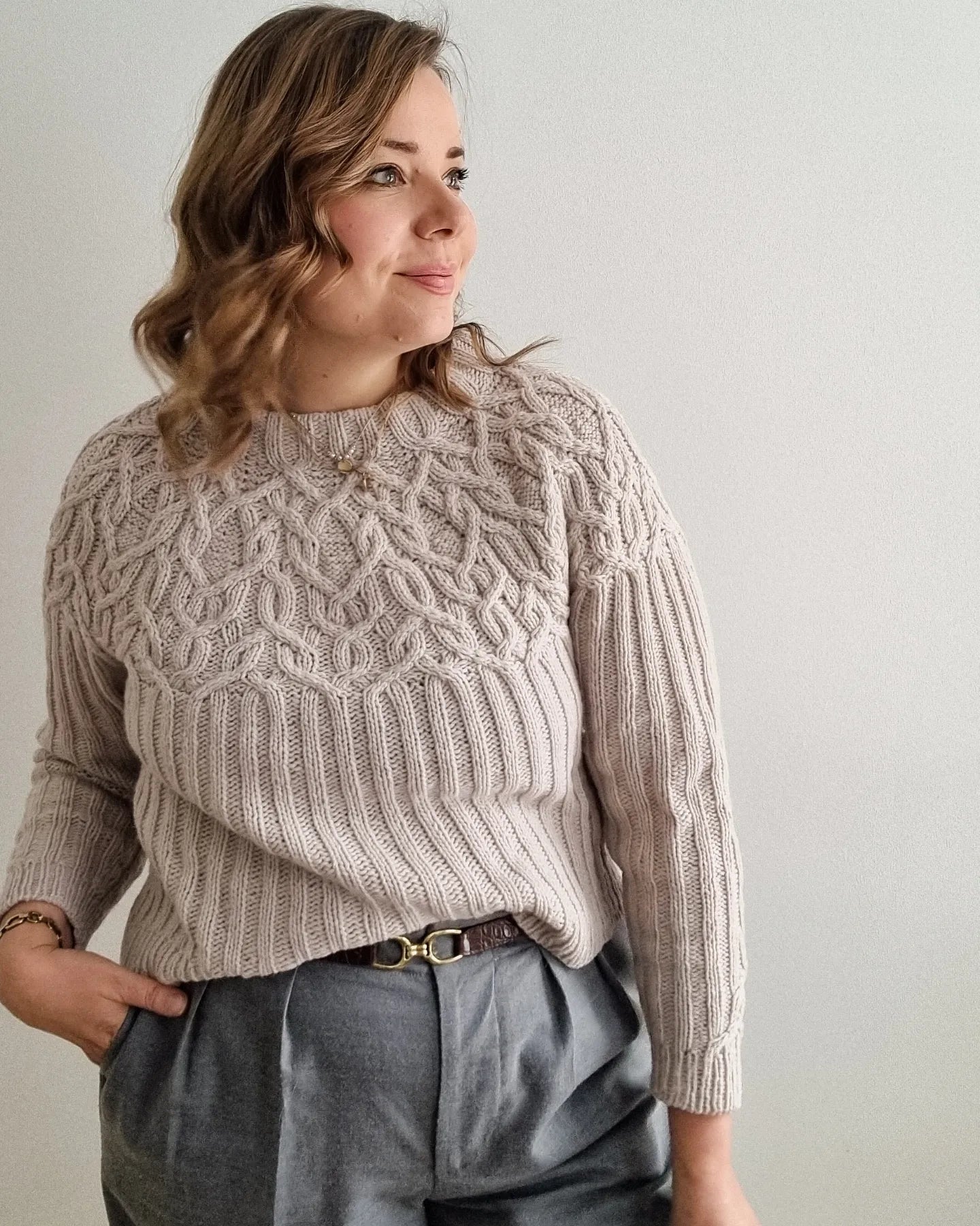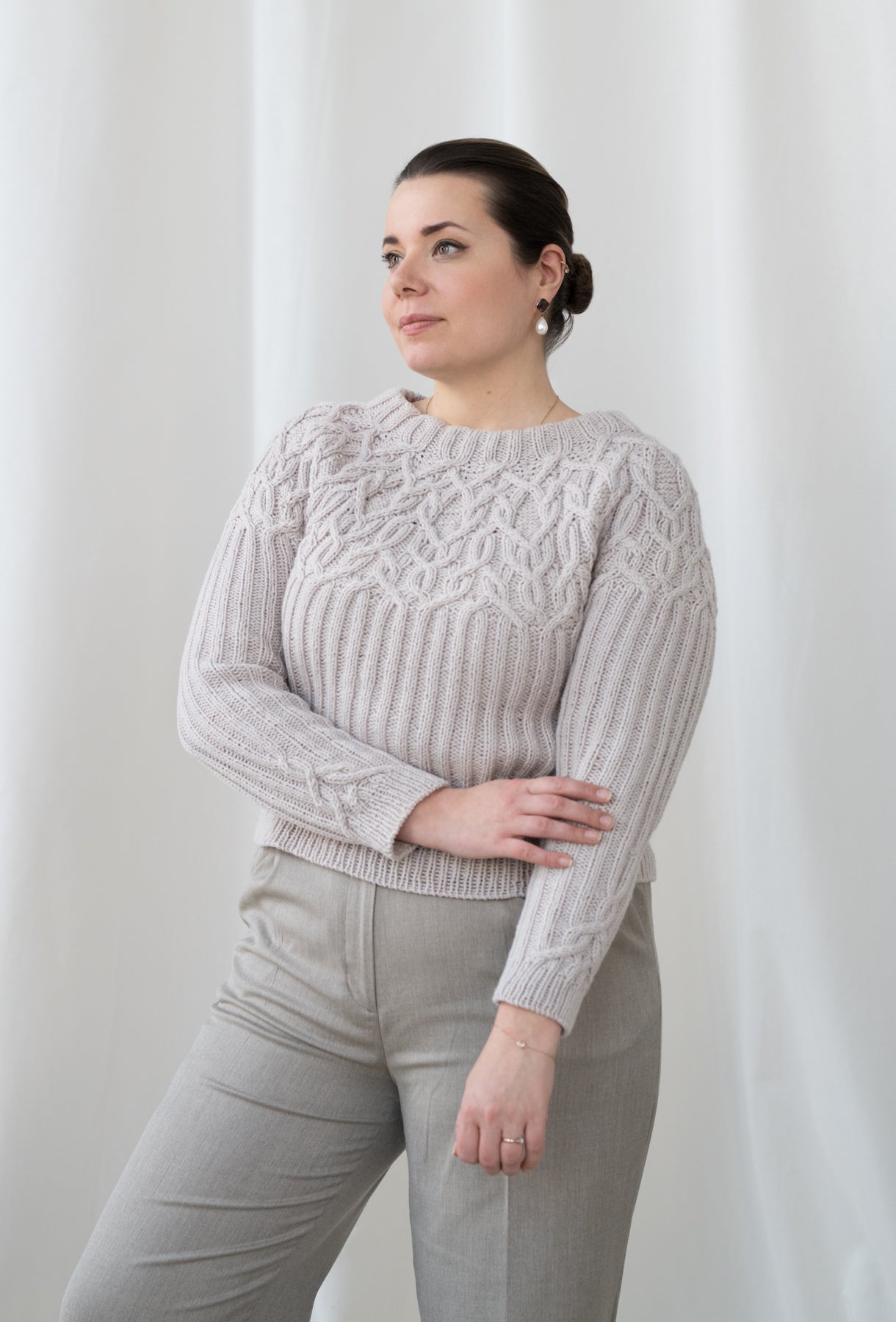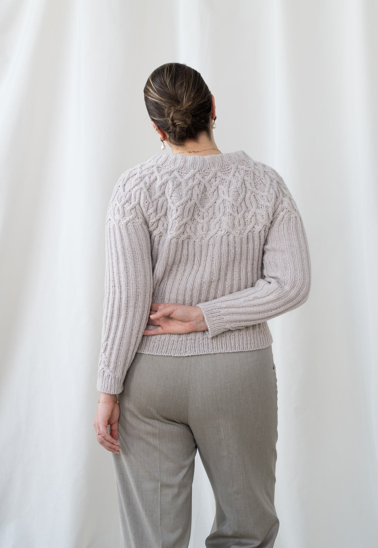 The Marzipan pullover is knitted seamlessly top-down starting at the neckband. The yoke is knitted in a twisting cable pattern that flows into a 2x2 ribbing for the body and the sleeves. The sleeves and body are separated at the end of the circular yoke and knitted separately. The back is shaped with optional short-rows to improve the fit.