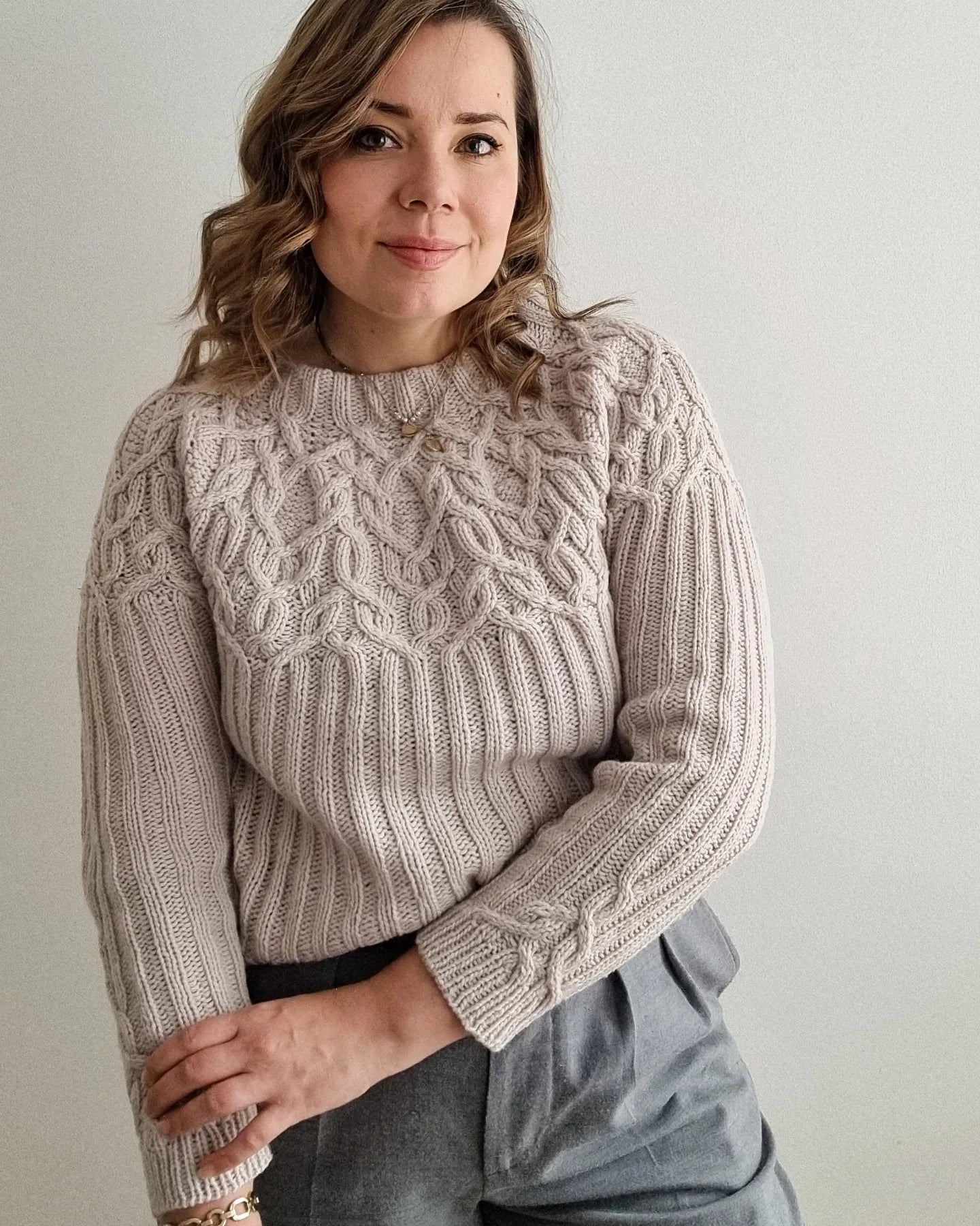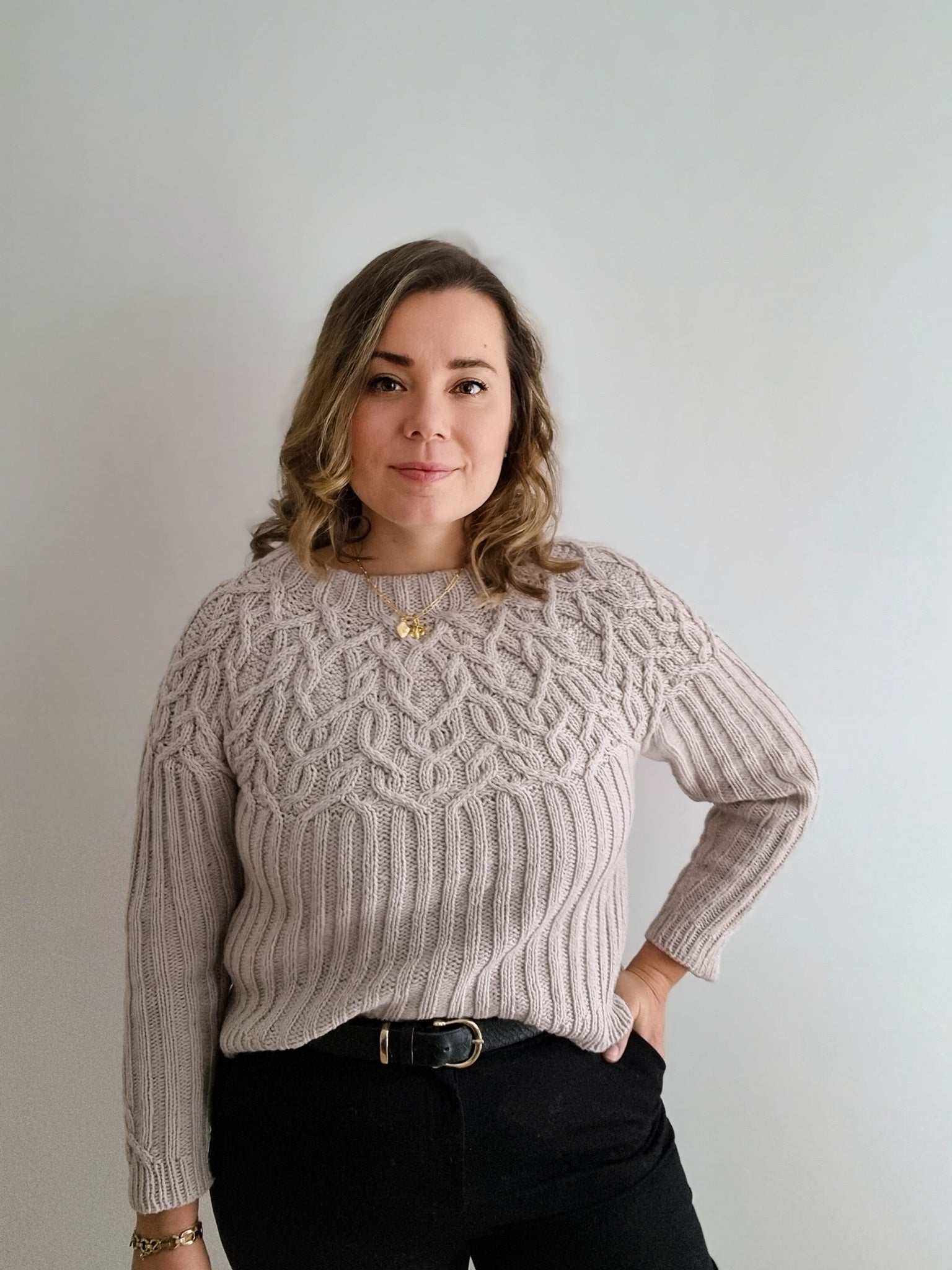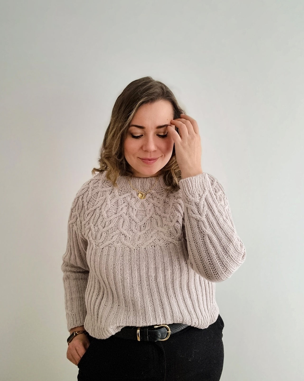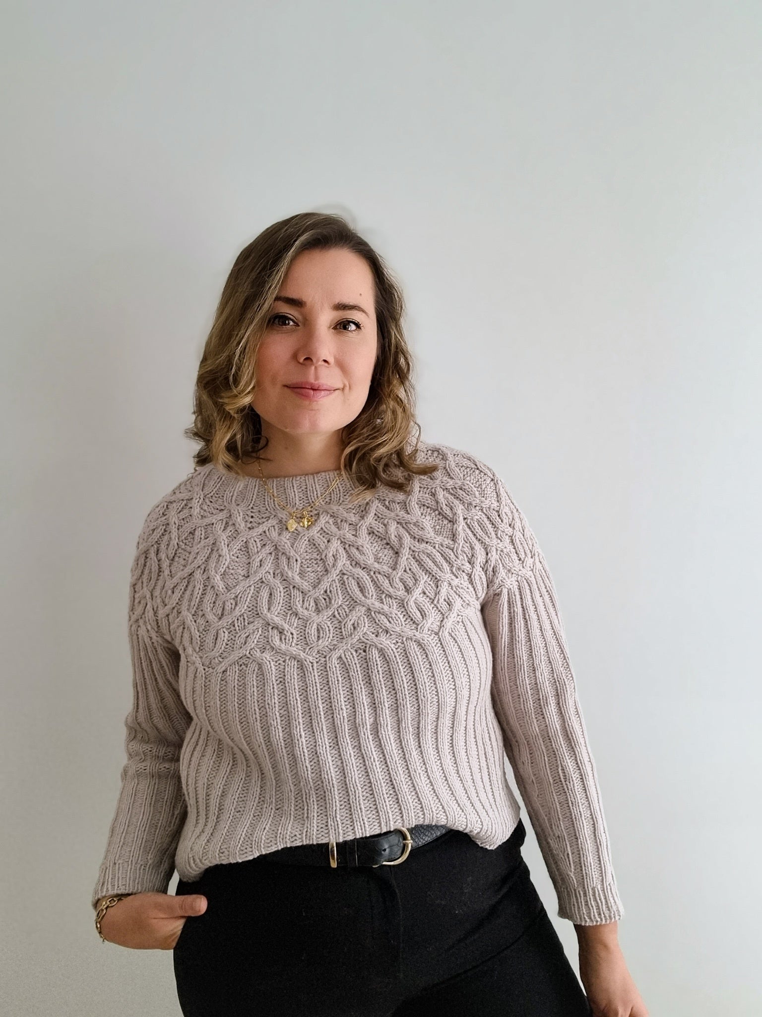 The Marzipan pullover is knitted seamlessly top-down starting at the neckband. The yoke is knitted in a twisting cable pattern that flows into a 2x2 ribbing for the body and the sleeves. The sleeves and body are separated at the end of the circular yoke and knitted separately. The back is shaped with optional short-rows to improve the fit.