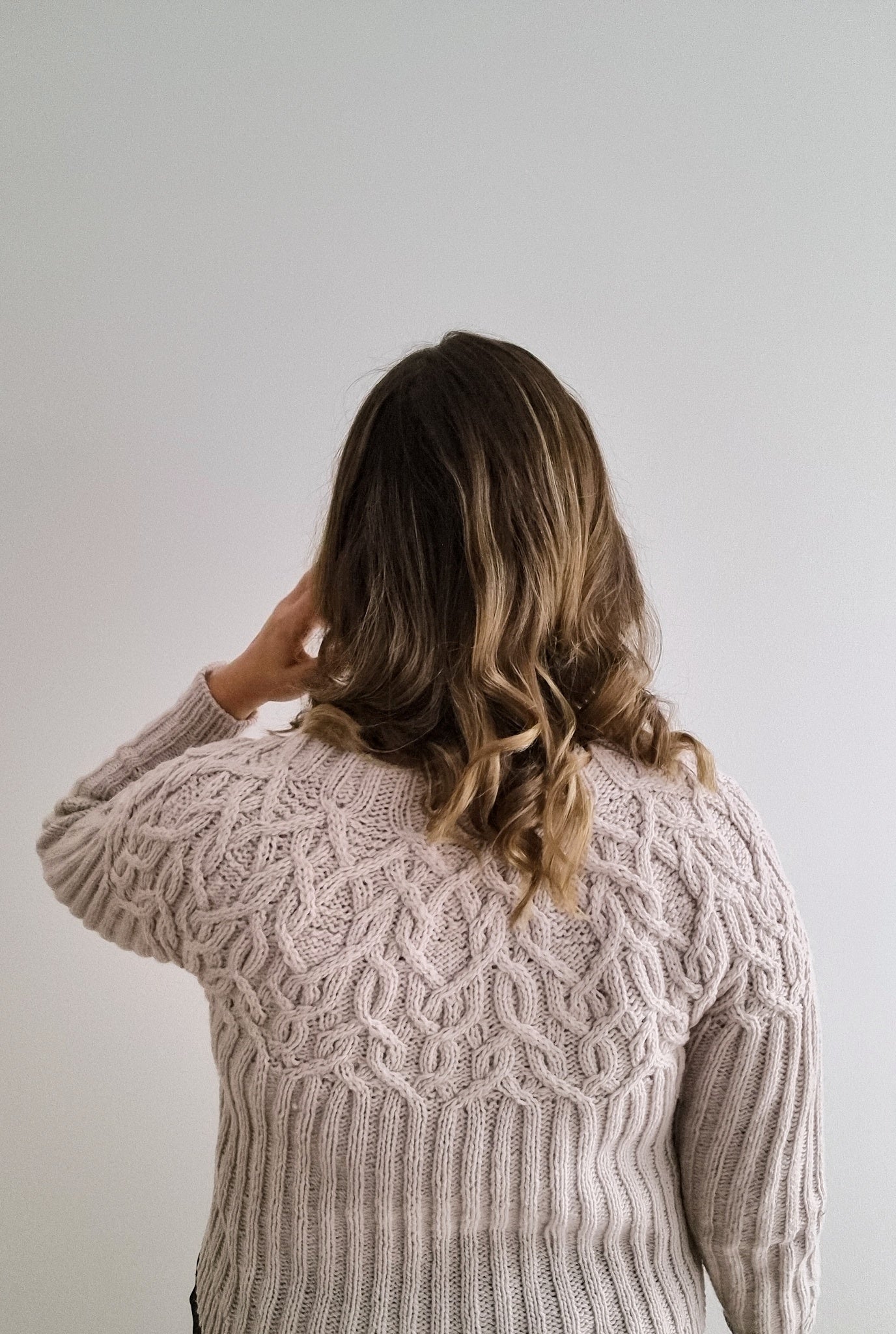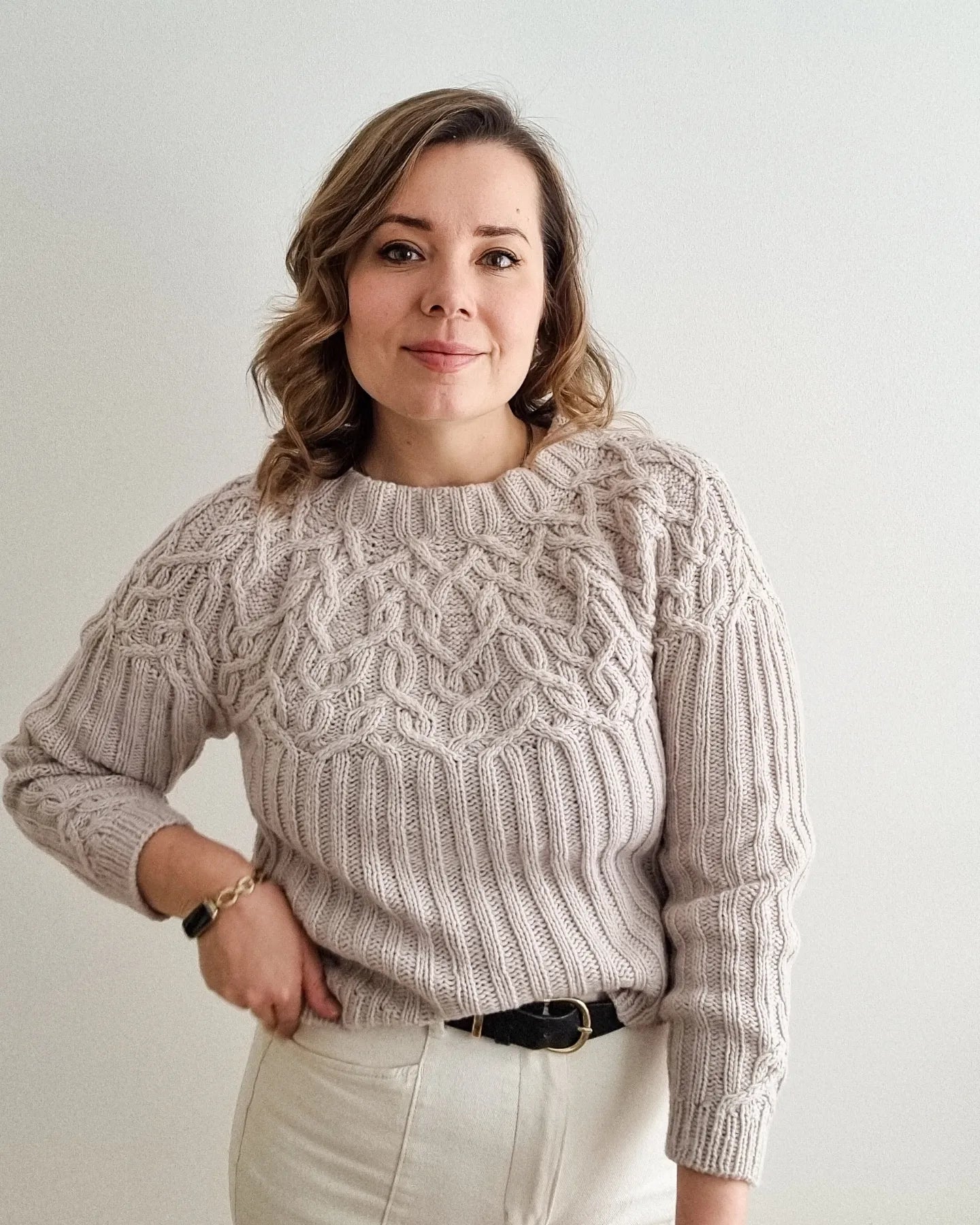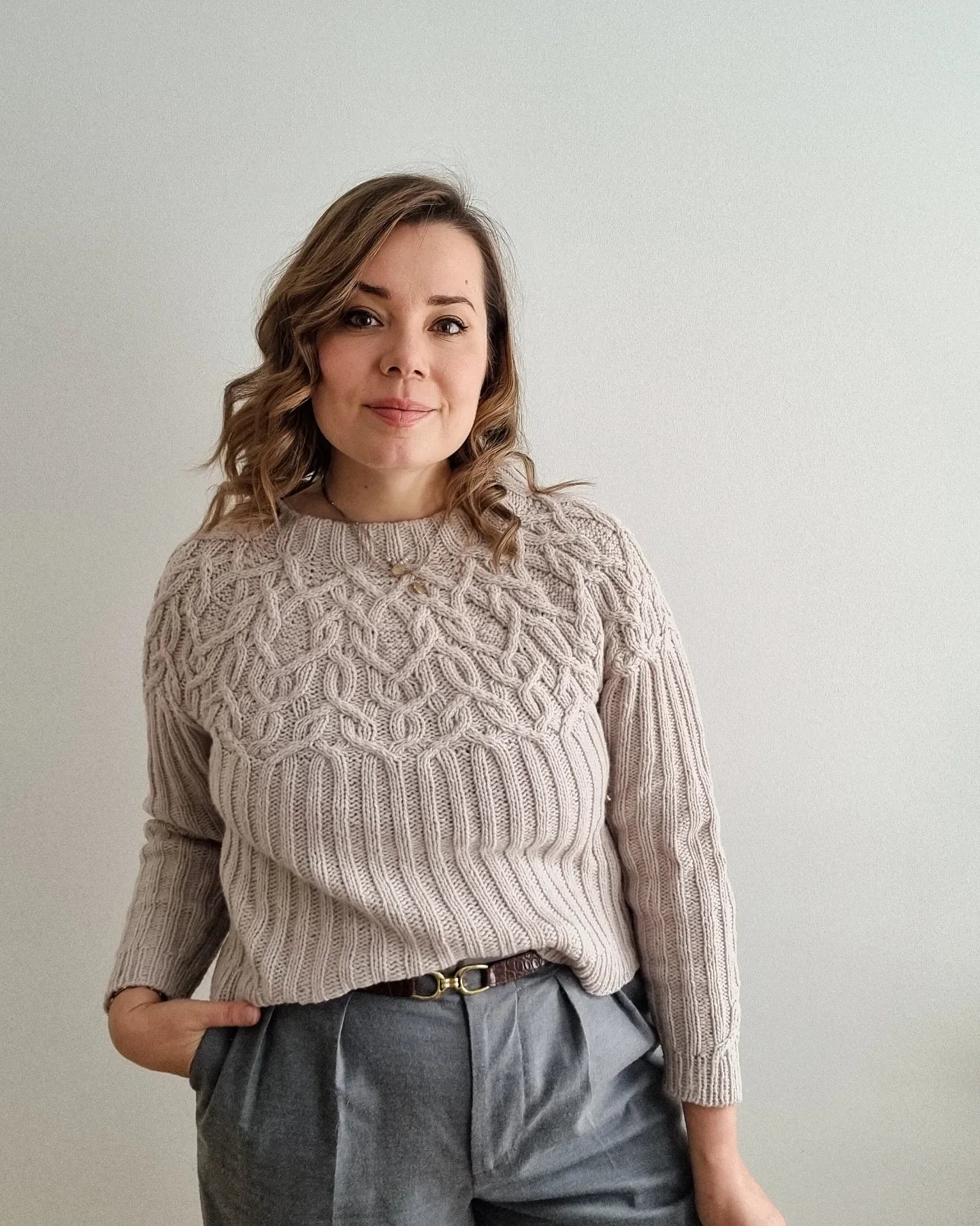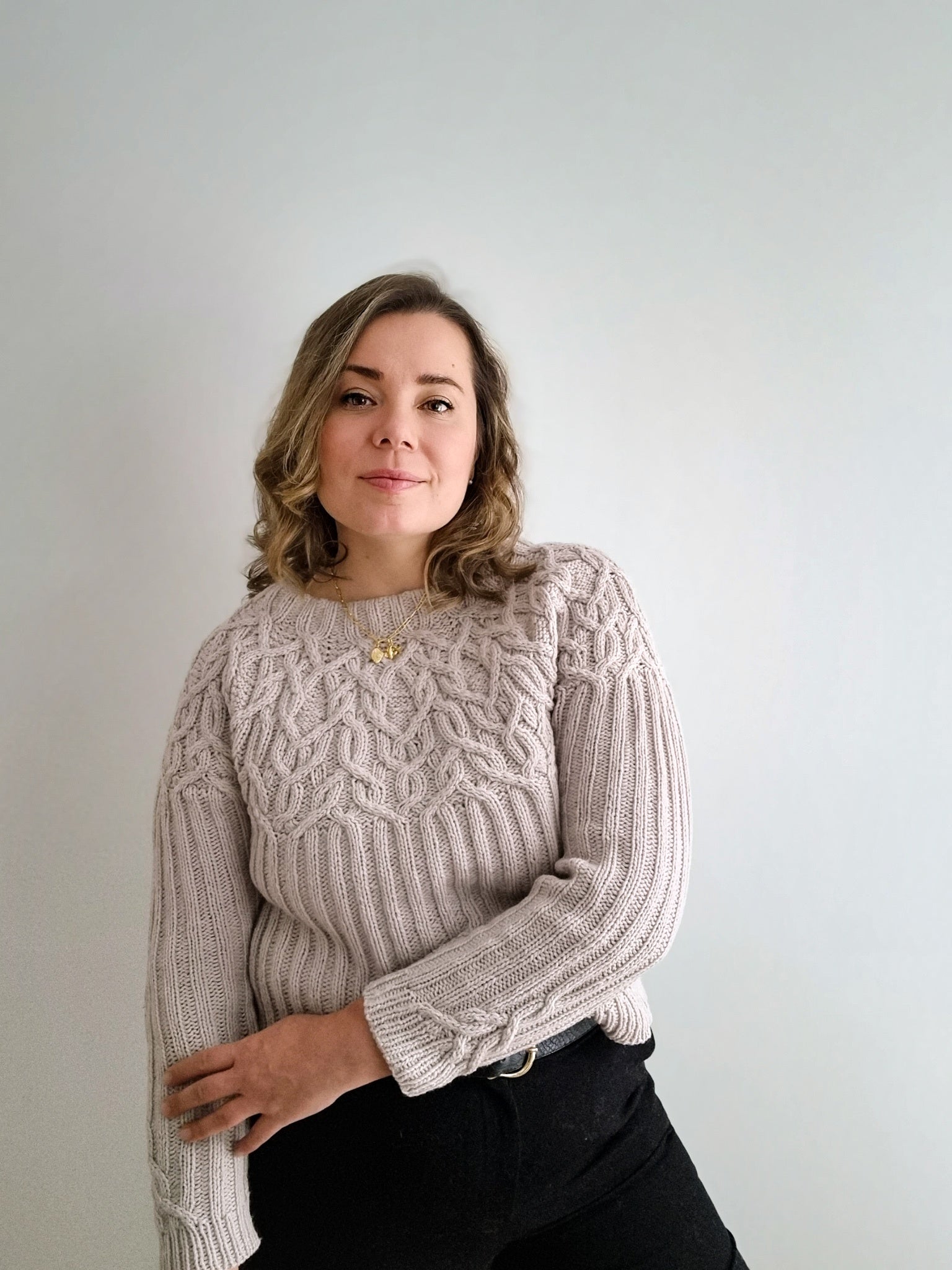 The Marzipan pullover is knitted seamlessly top-down starting at the neckband. The yoke is knitted in a twisting cable pattern that flows into a 2x2 ribbing for the body and the sleeves. The sleeves and body are separated at the end of the circular yoke and knitted separately. The back is shaped with optional short-rows to improve the fit.
