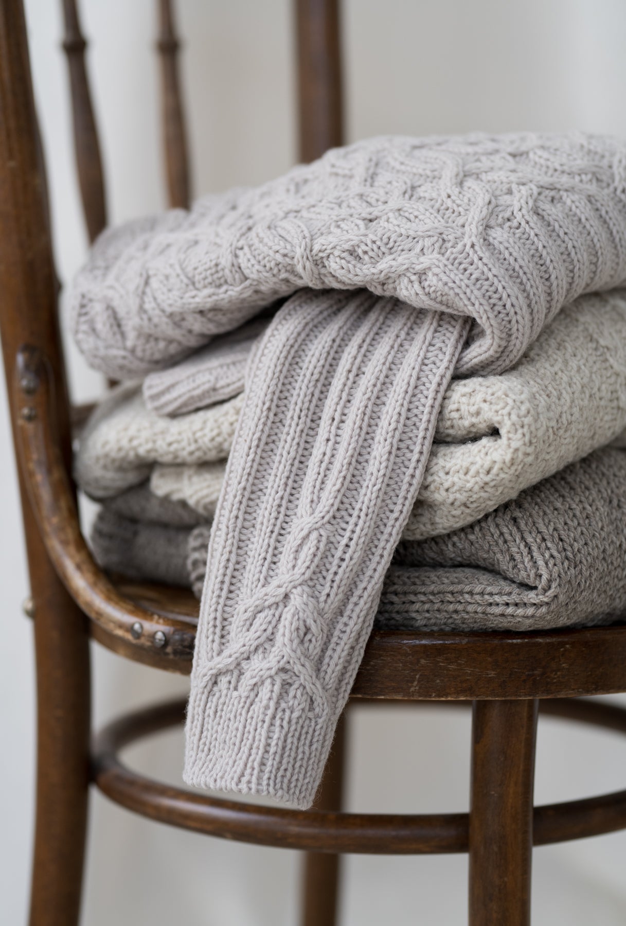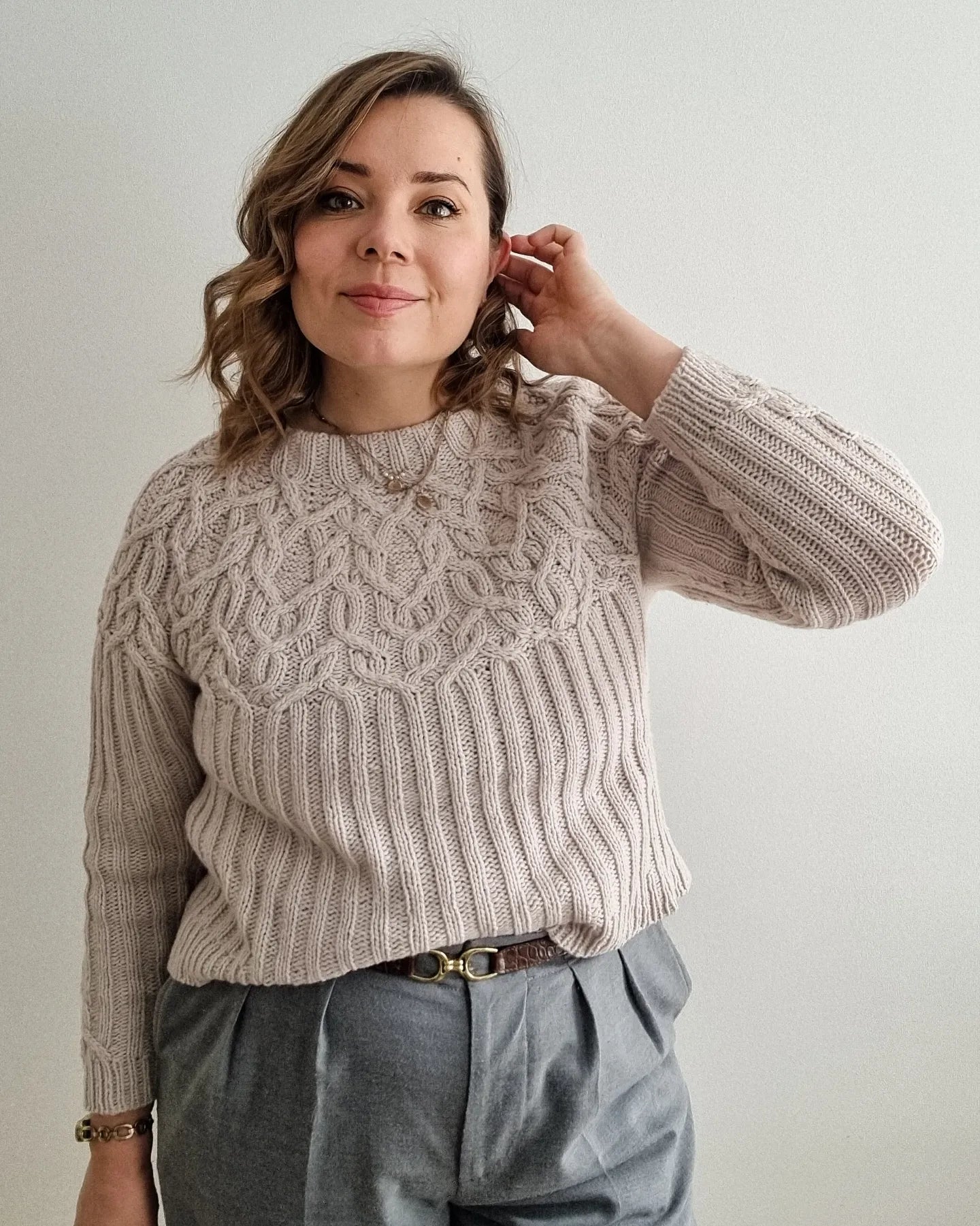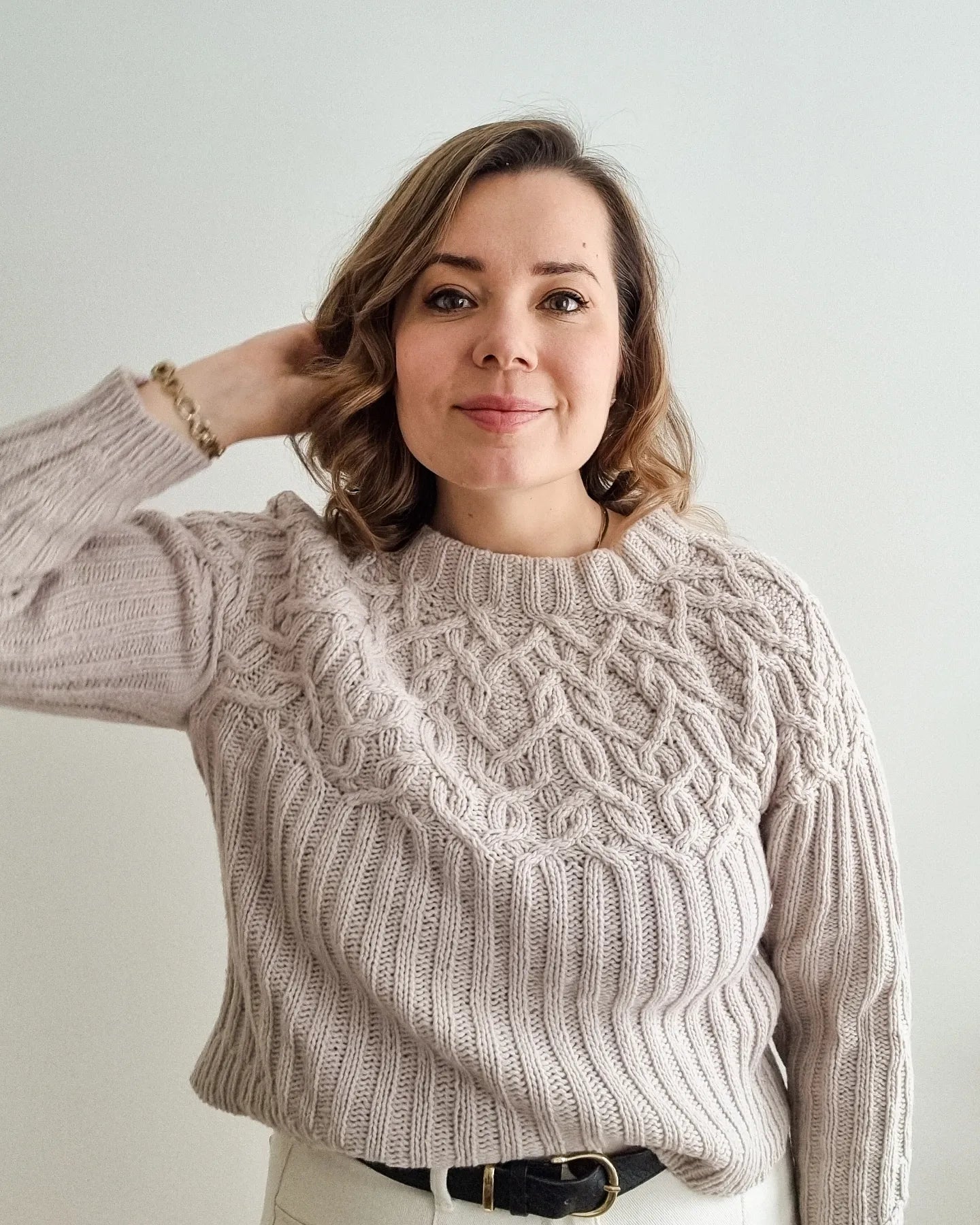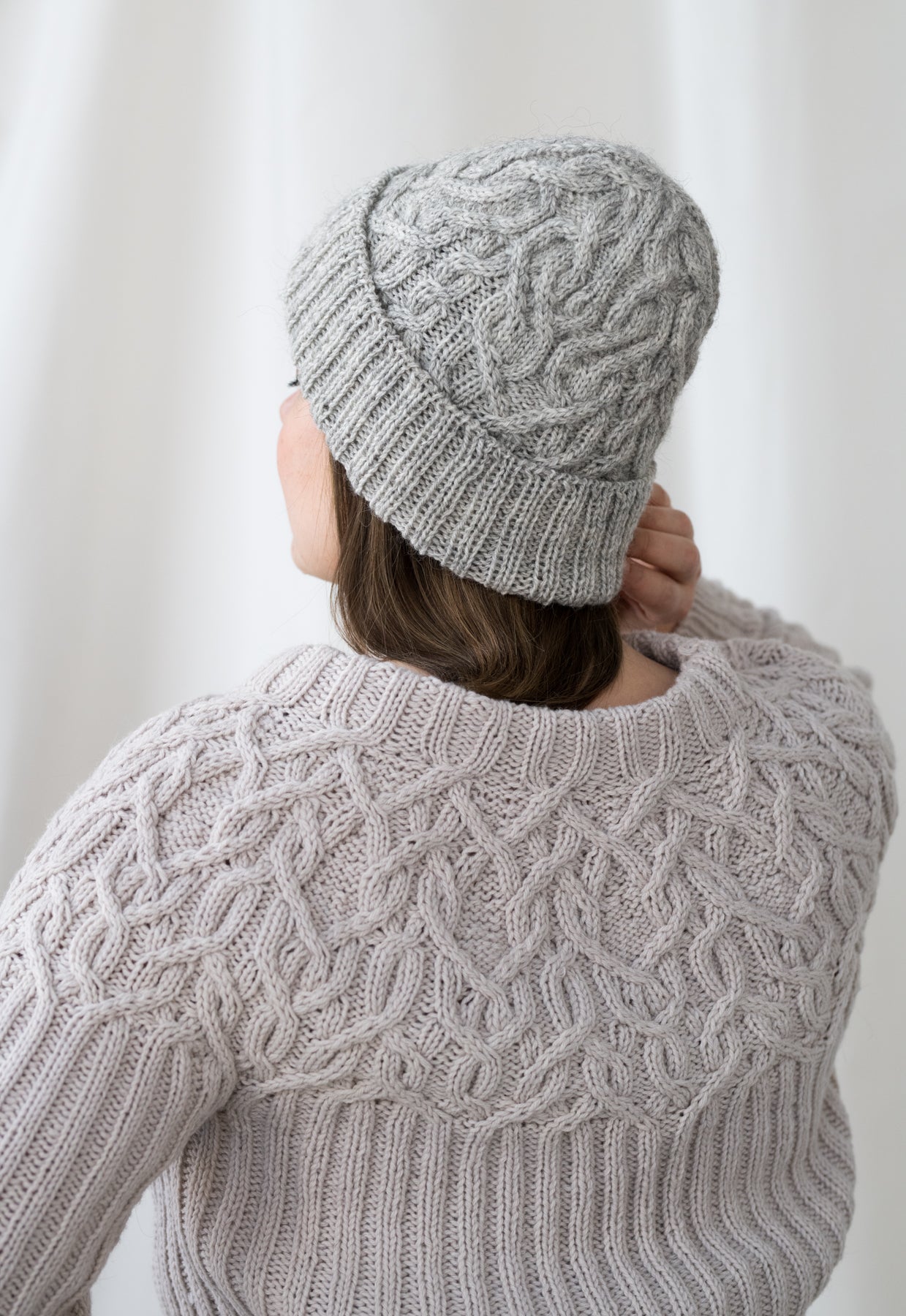 The Marzipan pullover is knitted seamlessly top-down starting at the neckband. The yoke is knitted in a twisting cable pattern that flows into a 2x2 ribbing for the body and the sleeves. The sleeves and body are separated at the end of the circular yoke and knitted separately. The back is shaped with optional short-rows to improve the fit.