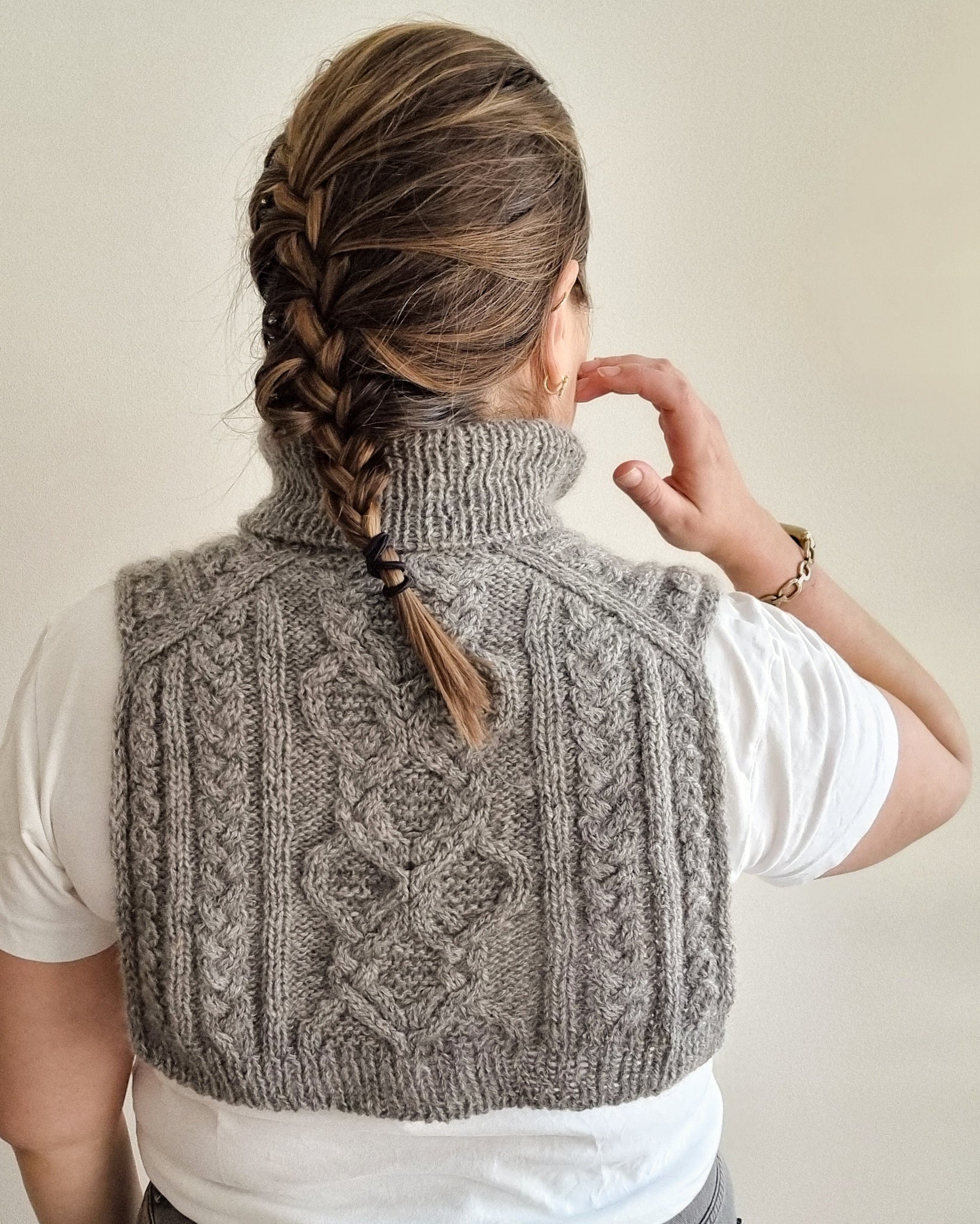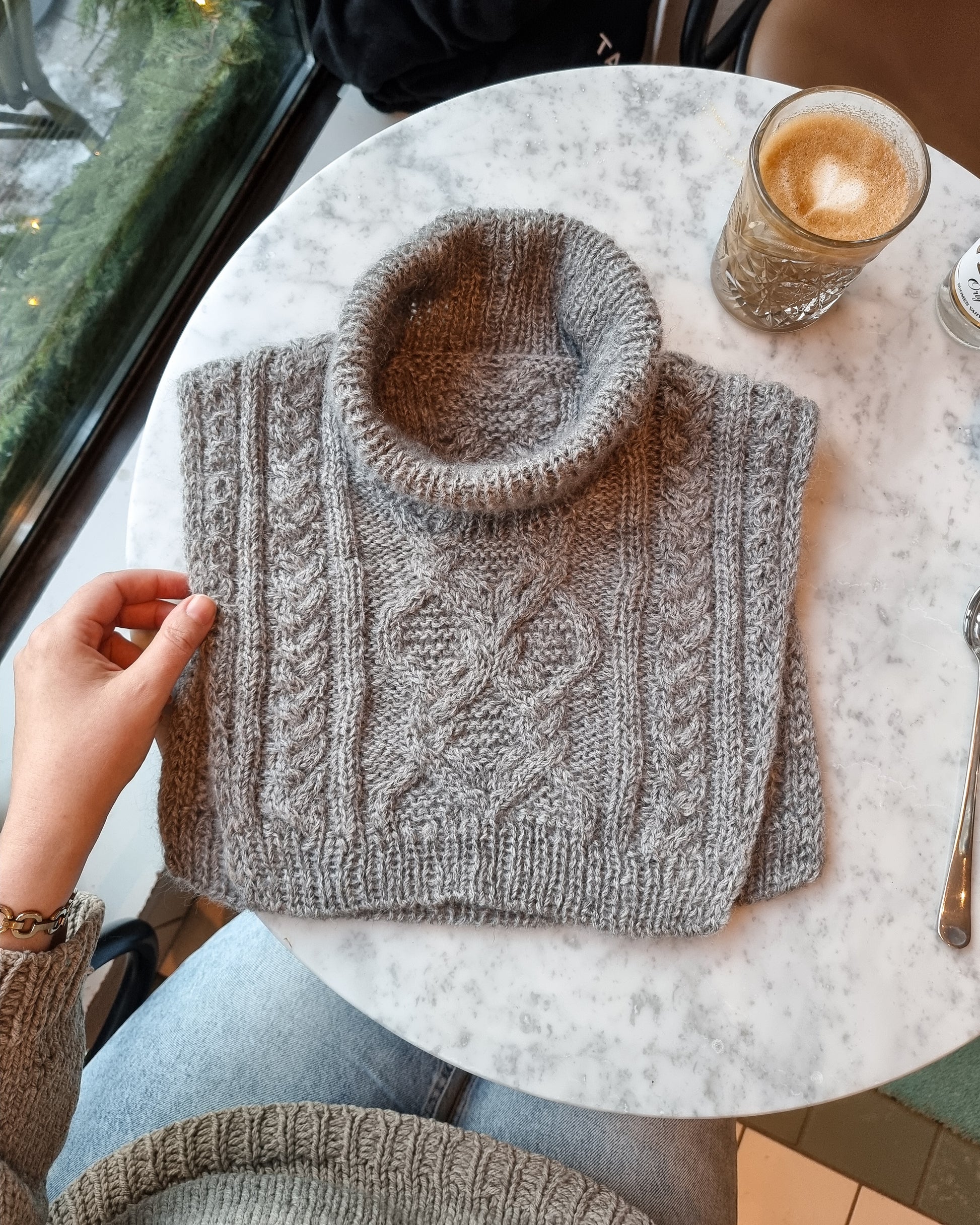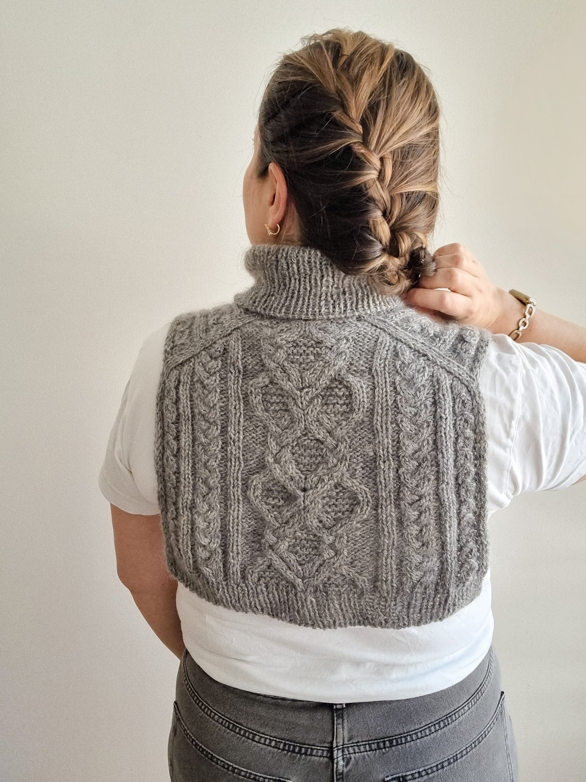 The pattern is written for using DK weight yarn with a strand of silk mohair, but you can substitute the yarns for a single strand of aran weight yarn. In that case, omit all instructions where it says “hold both yarns together” and follow the yarn requirements for DK weight yarn only.