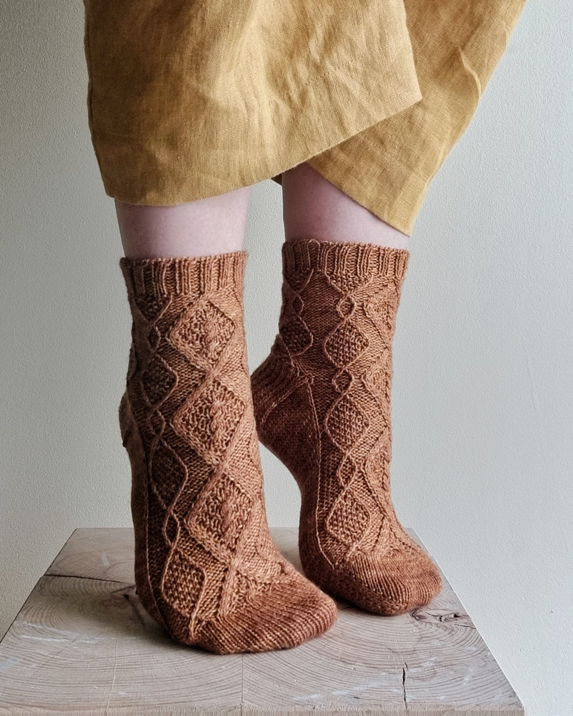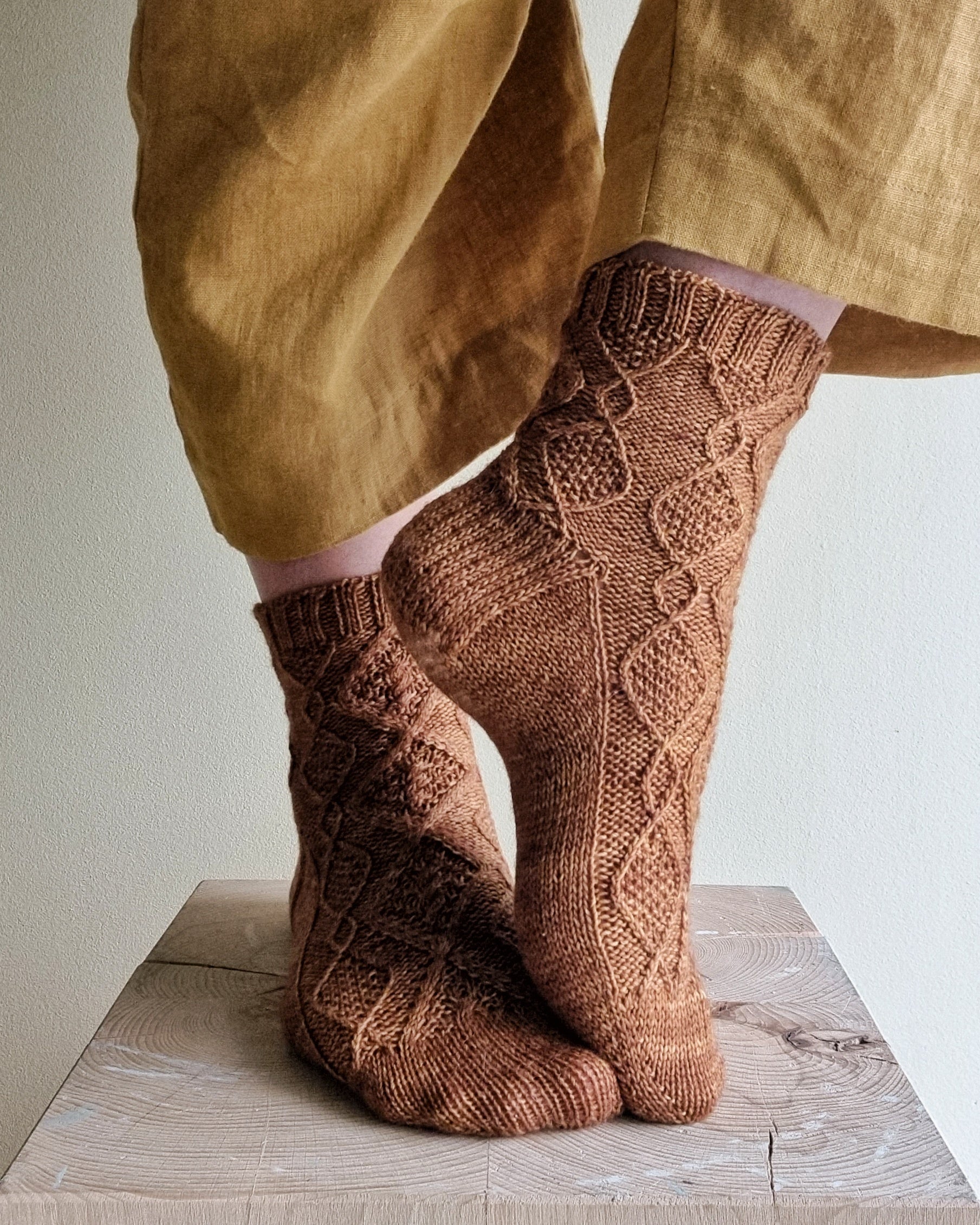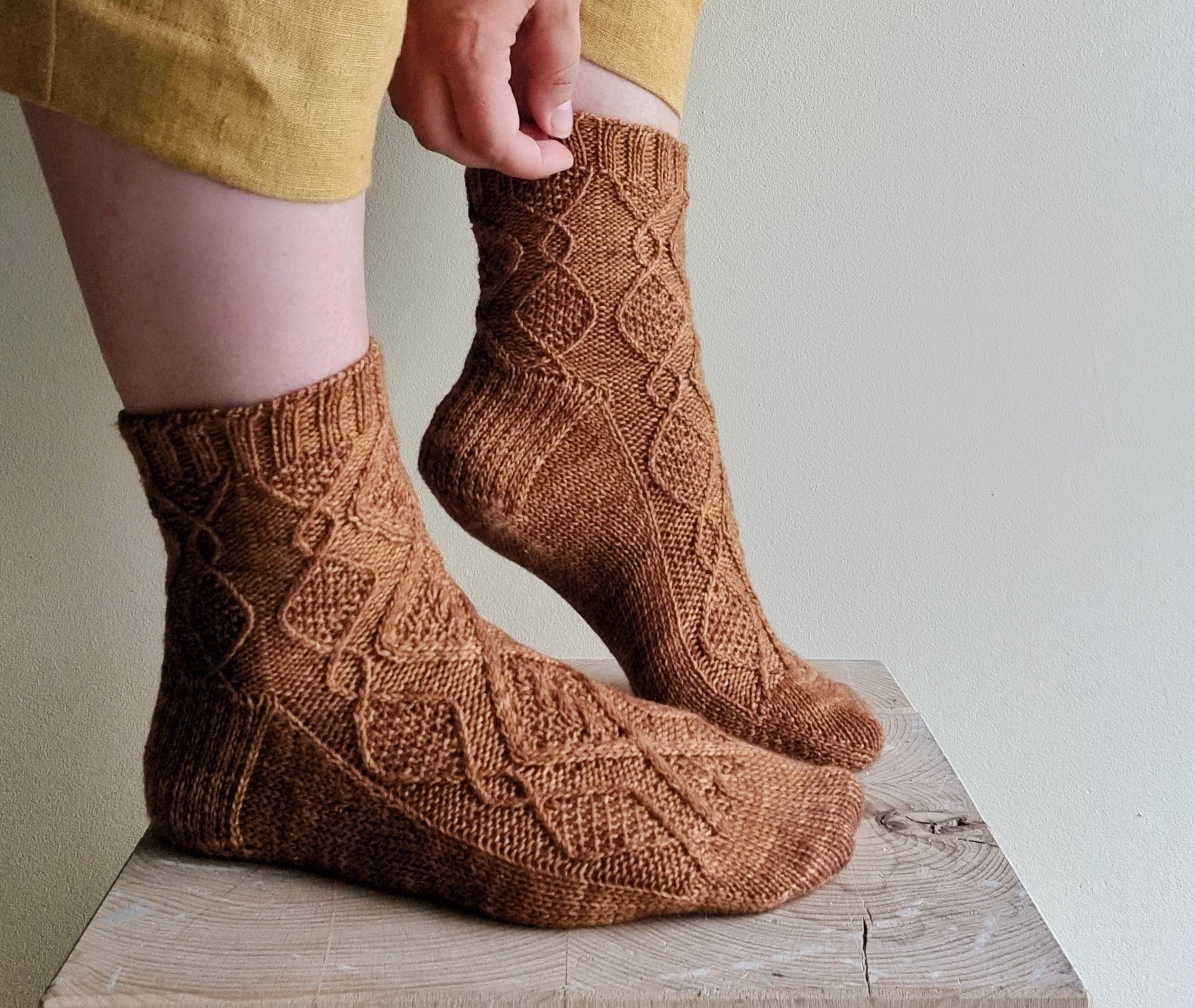 The Peregrin socks look best in solid or slightly variegated colors for the stitch pattern to show in its full glory.