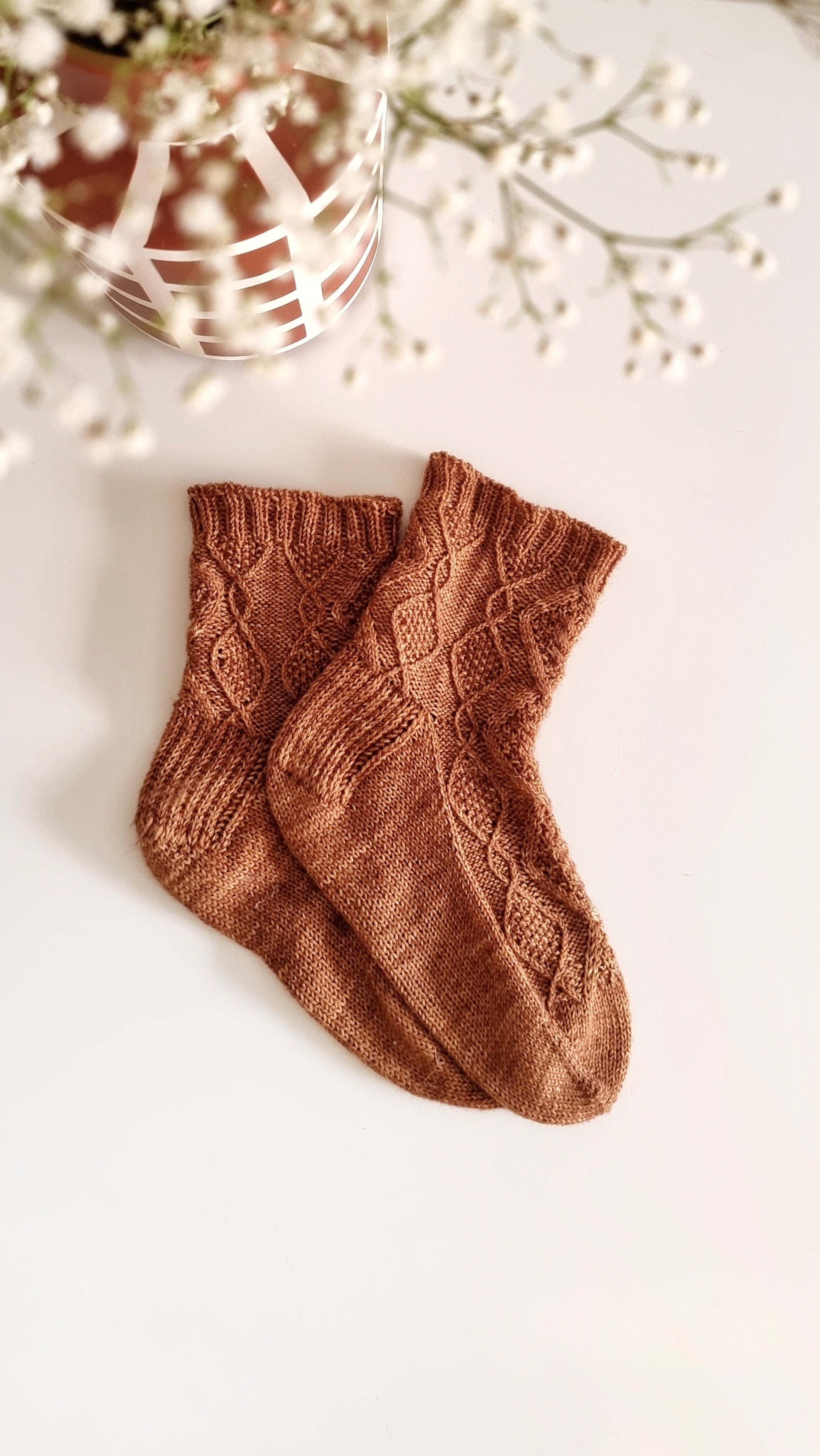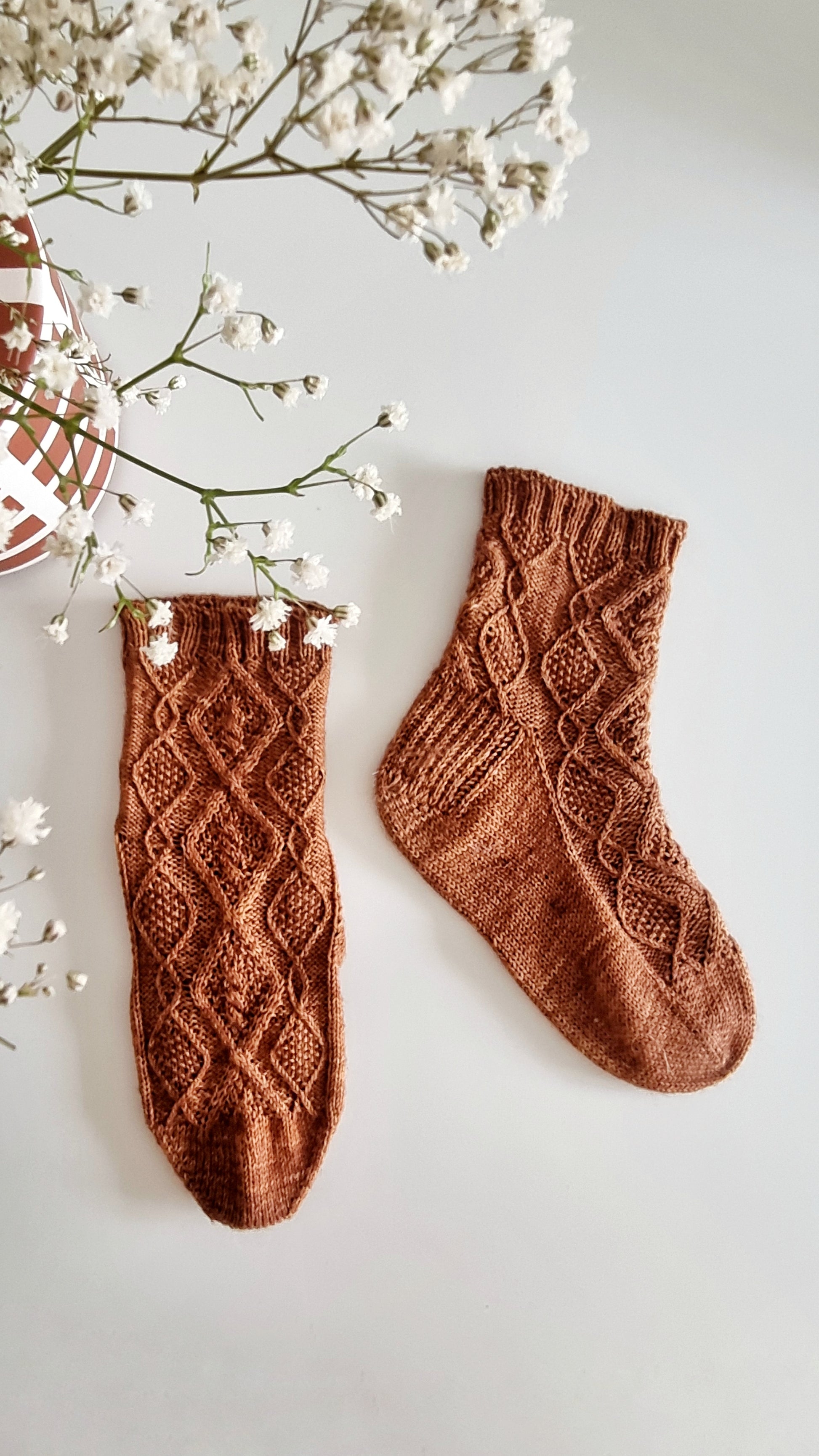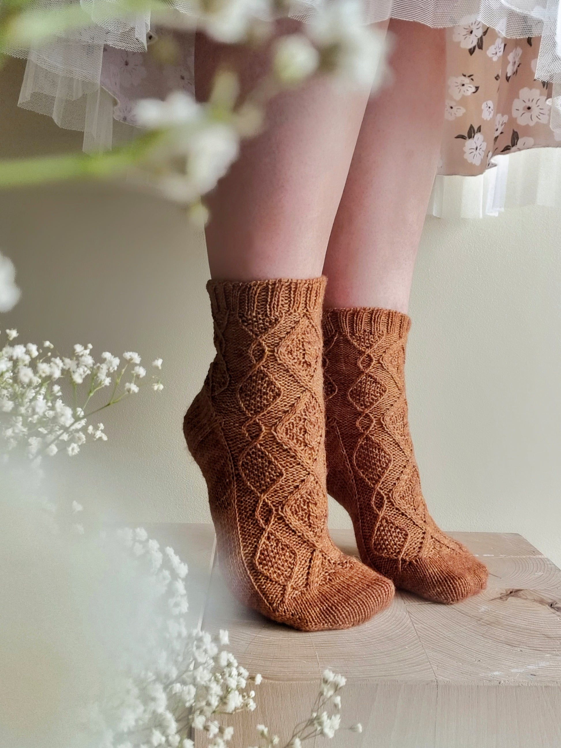 The Peregrin socks look best in solid or slightly variegated colors for the stitch pattern to show in its full glory.
