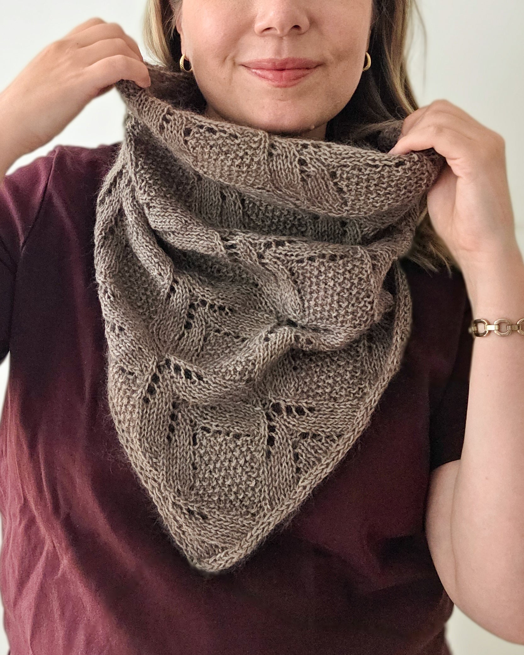 The cowl is knitted flat on the bias, starting at the back neck and gradually increasing to its full width. The lace pattern flows seamlessly with the shaping and is charted only (not written out). Slipped-stitch edges create the look of i-cord edging, while the small seam at the back neck is finished invisibly with mattress stitch.