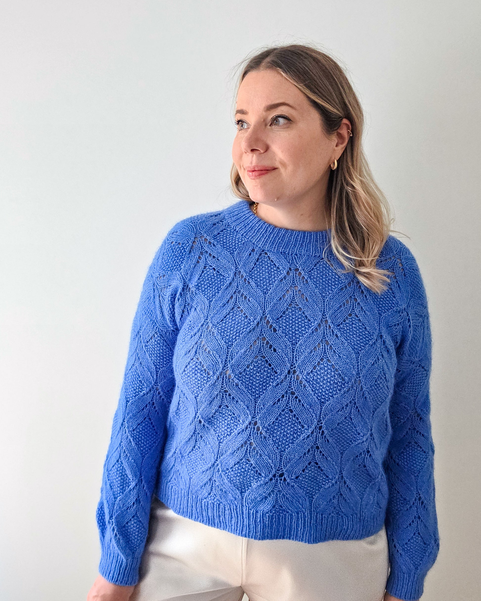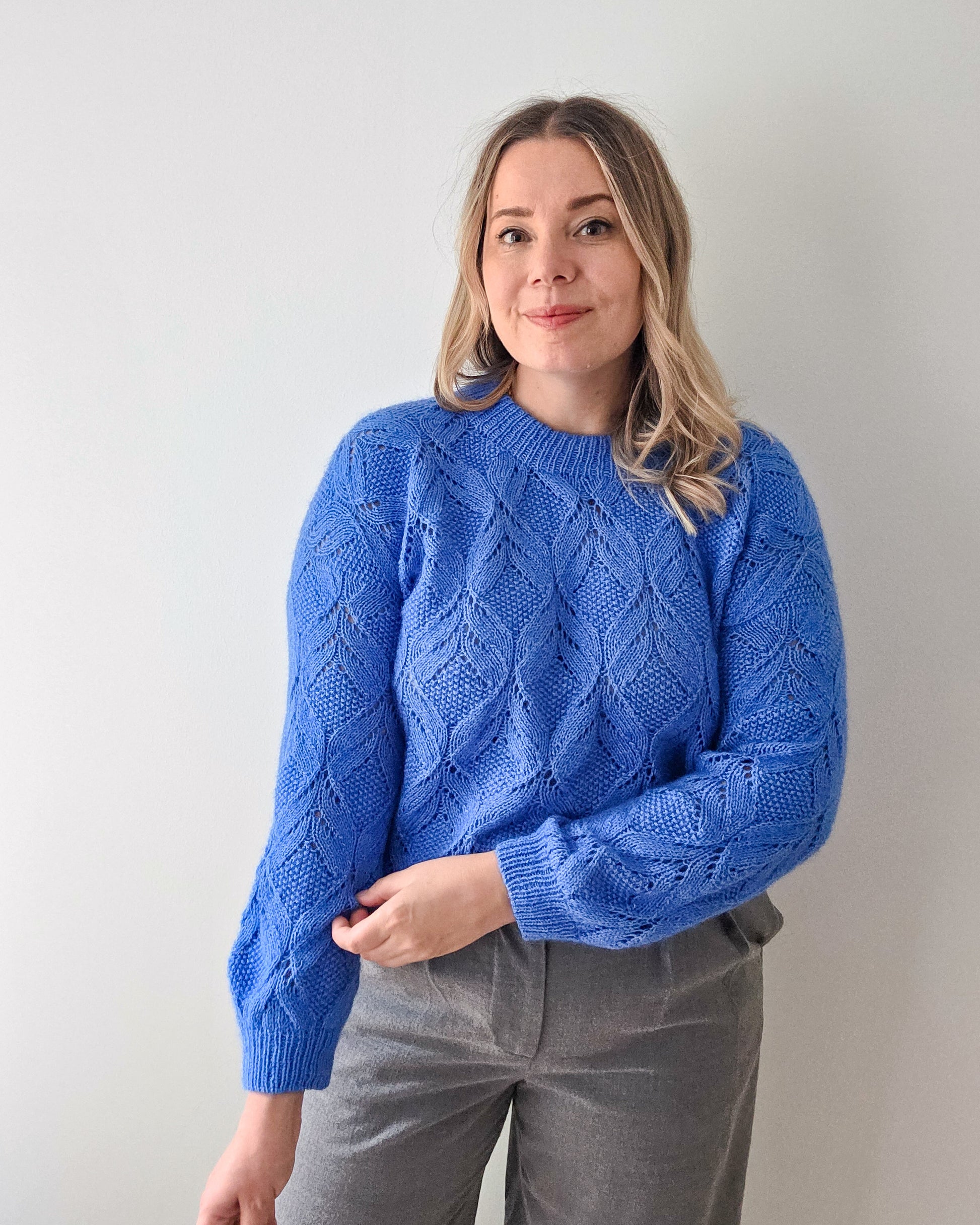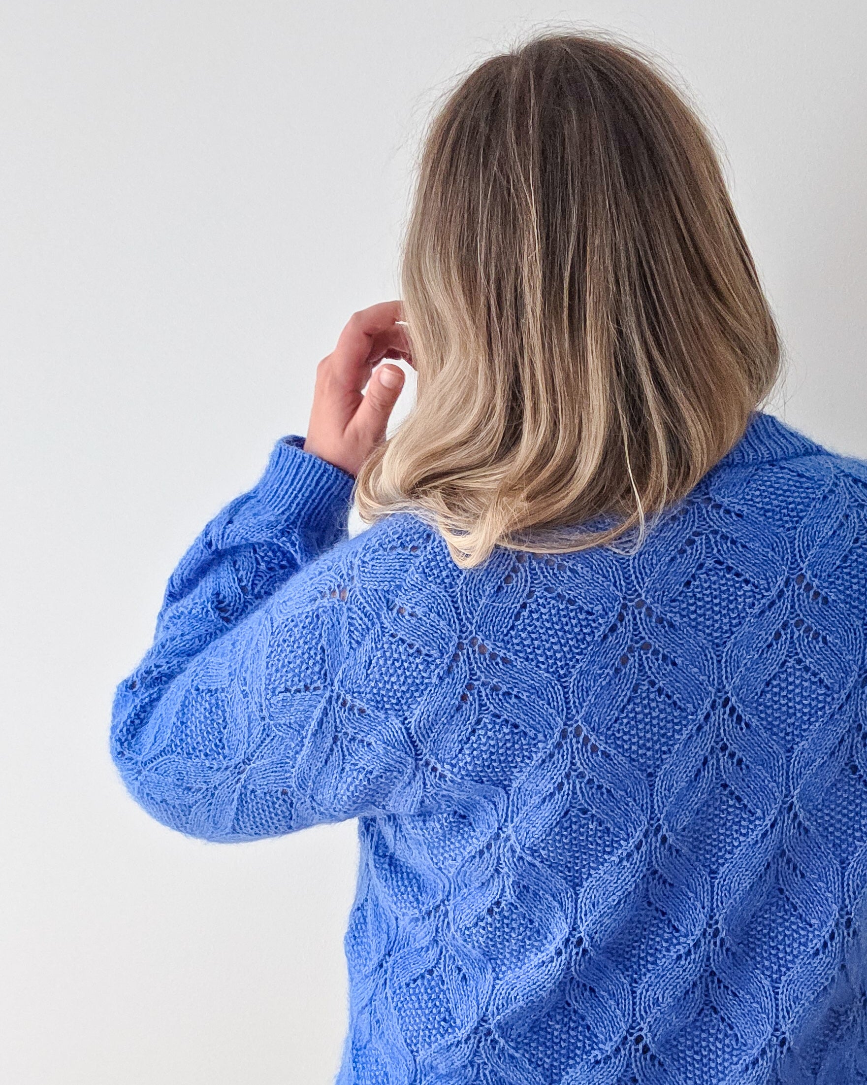 The pullover is worked seamlessly from the top down. It begins at the back neck, where increases are charted into the lace pattern before the shoulders are picked up and the front is worked. Front and back are joined at the underarm, and the body is then knitted in the round. Stitches are picked up along the armholes for the sleeves, and the neckline is finished with a folded double collar for a polished look. Hem and cuffs are completed with a tubular bind off, creating a neat, stretchy edge that flows seamlessly from the lace into the ribbing.