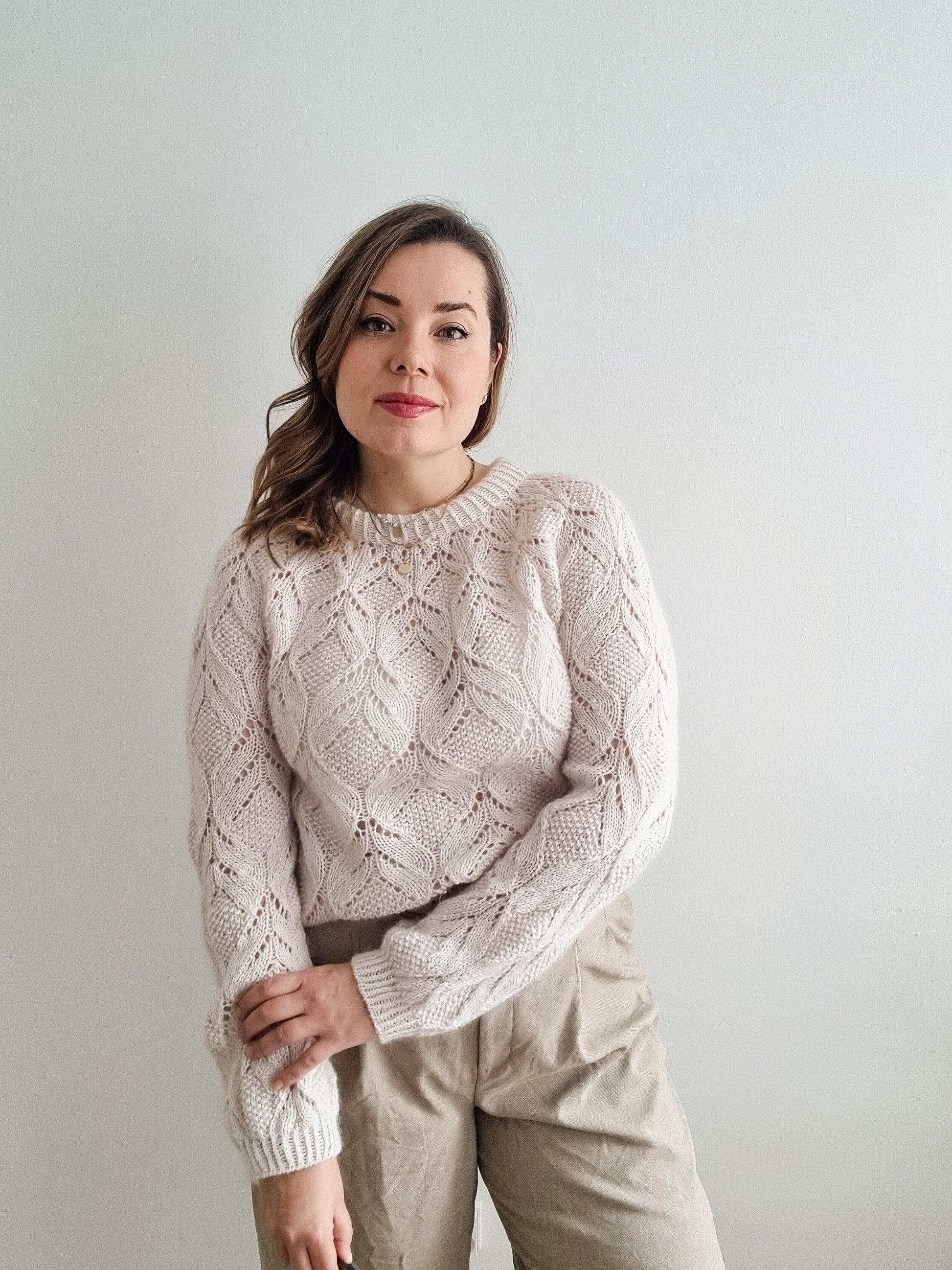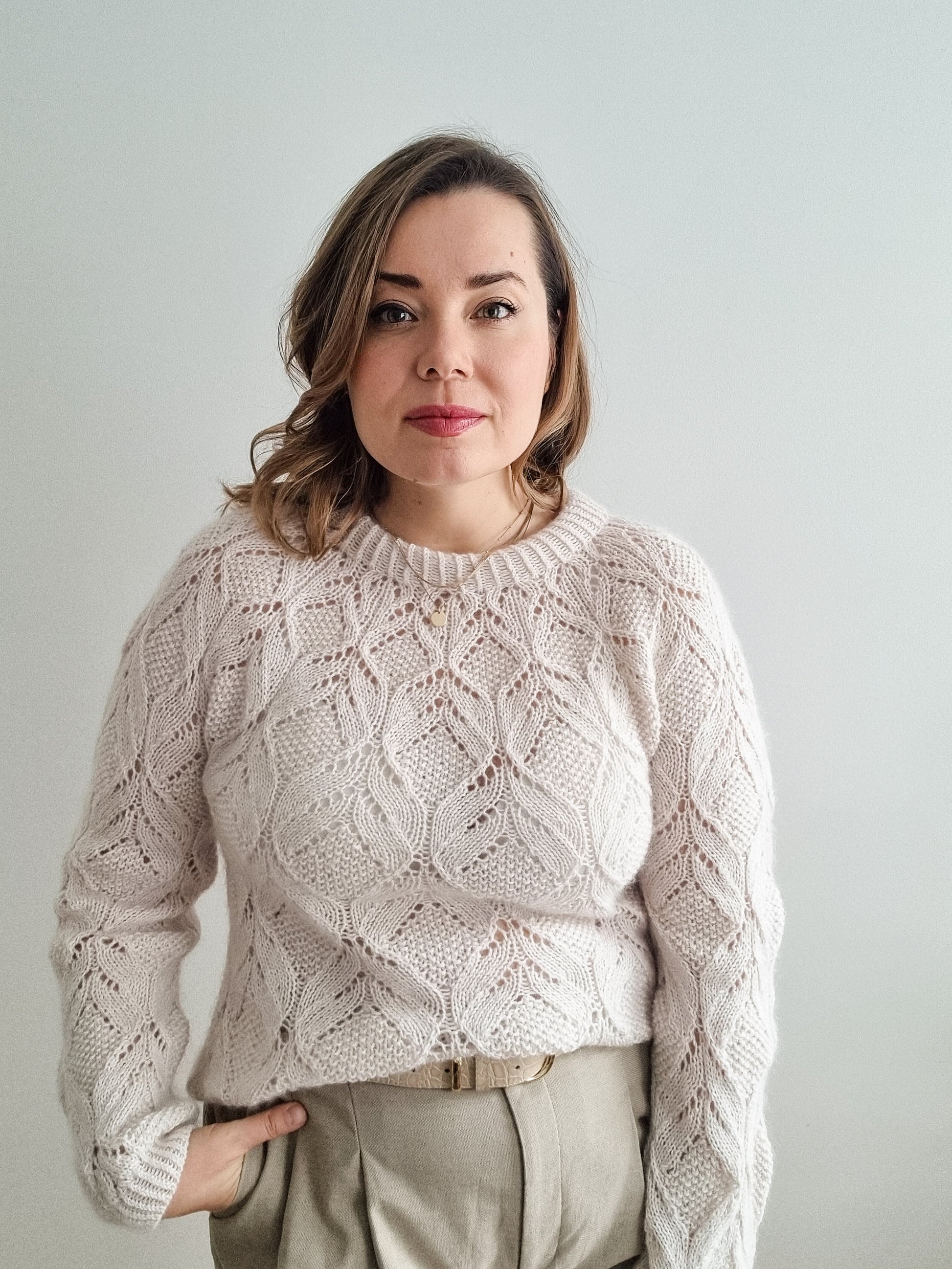 The Poetry pullover is a sister design of my popular Poet and Poetria patterns. The familiar Poet lace stitch pattern has been reworked to fit the circular yoke, and then worked over the whole body and the sleeves.