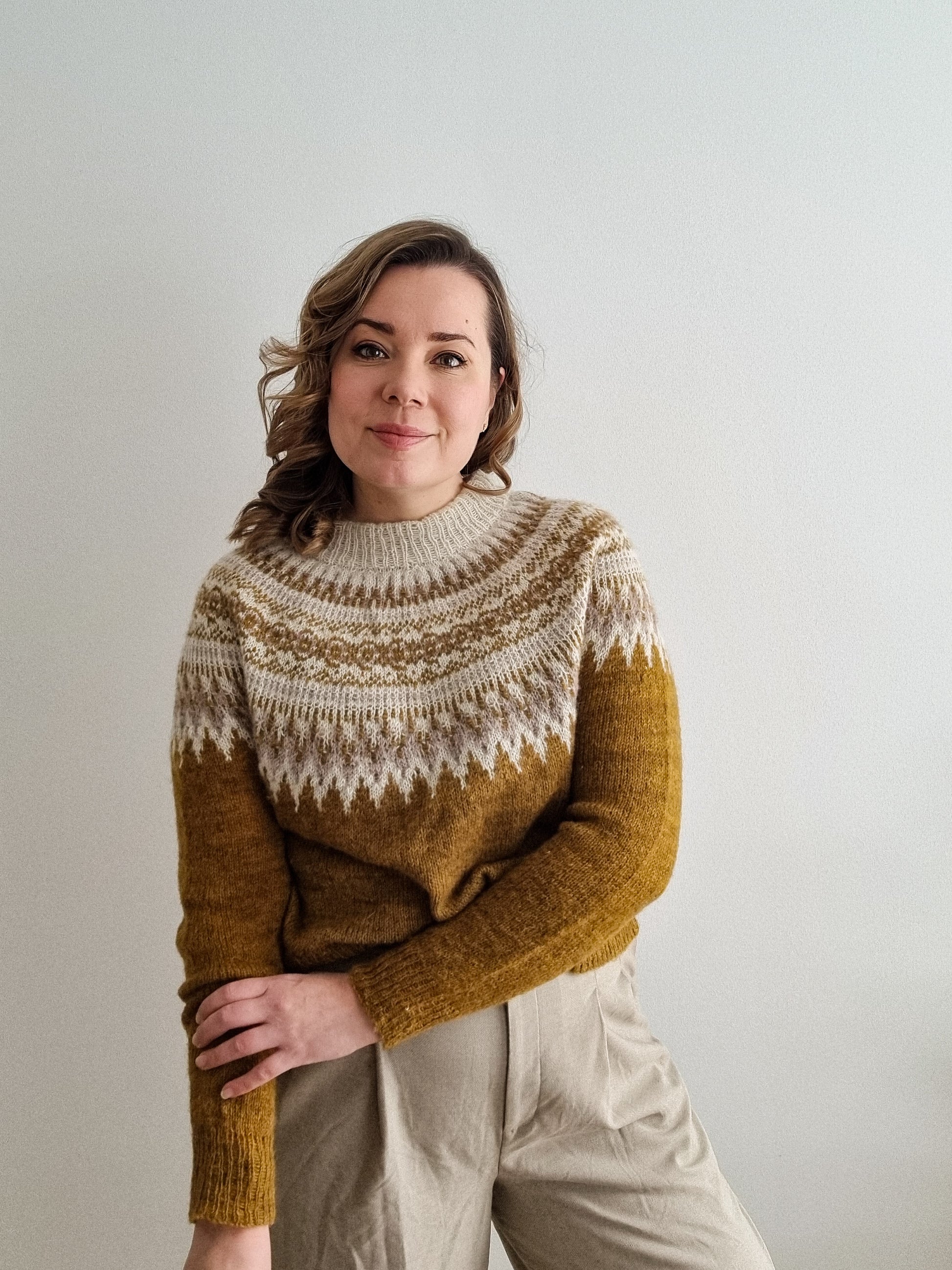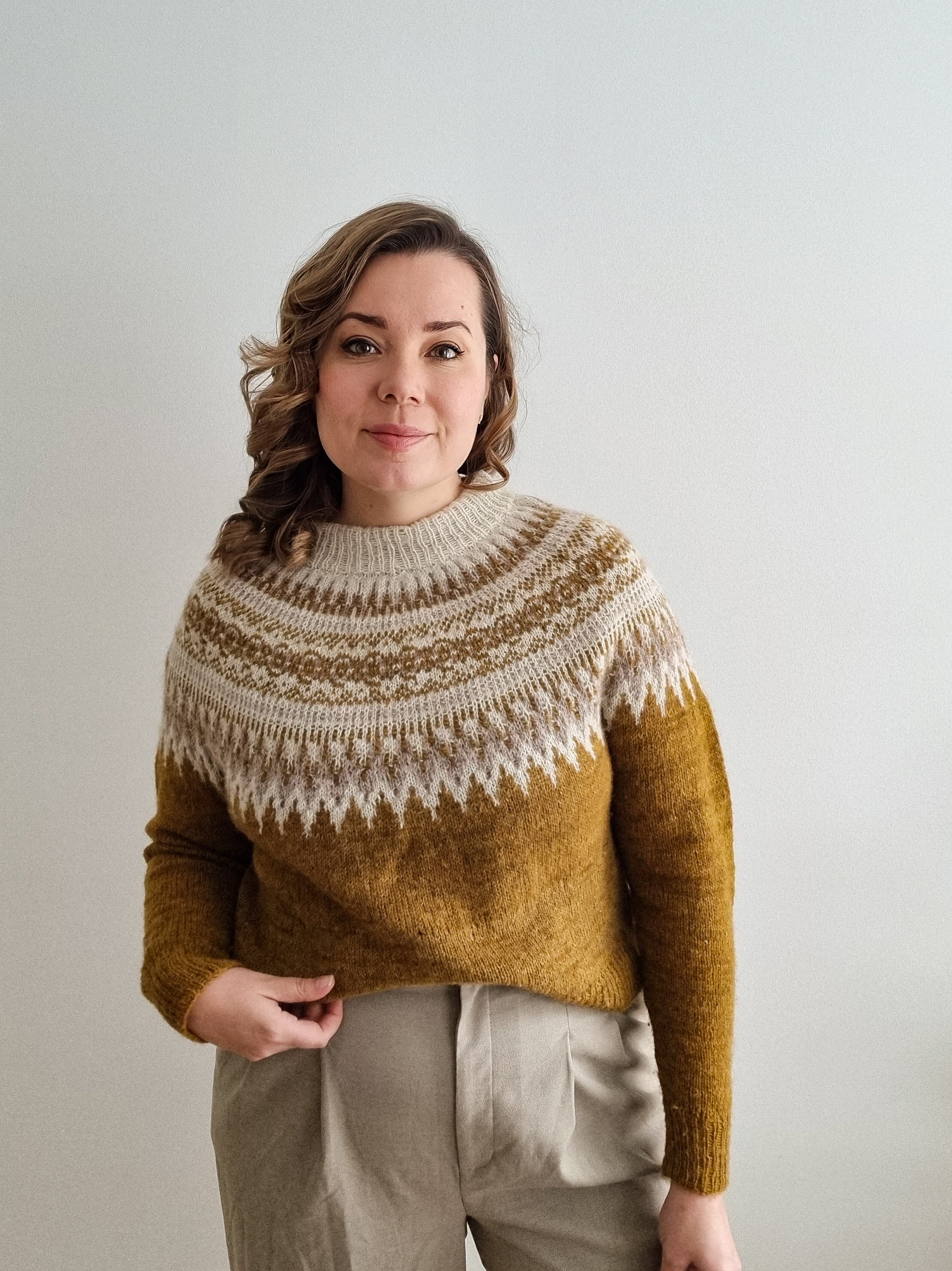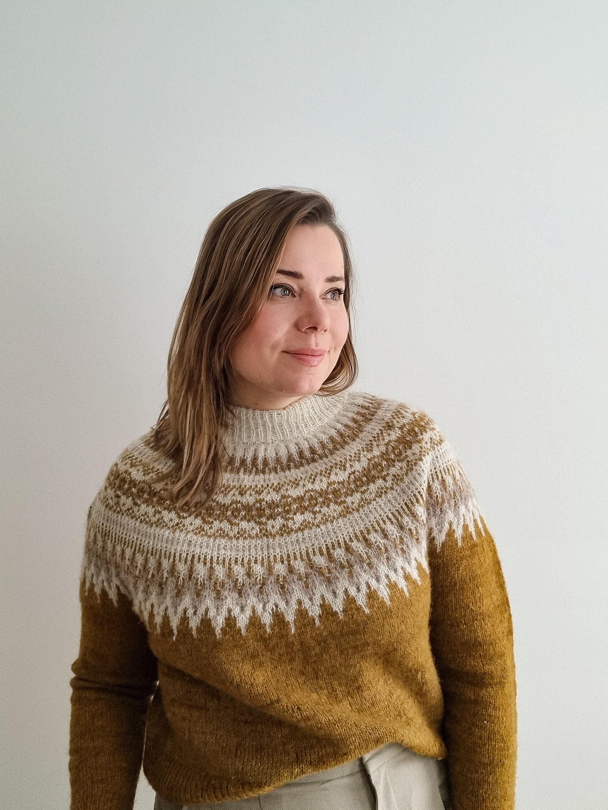The Pohjola pullover is knitted seamlessly top-down starting at the neckband. The circular yoke is knitted with stranded colorwork that was inspired by the auroras. The back is made longer than the front by adding short-rows below the colorwork. The short-rows are optional but improve the fit of the sweater. The body and the sleeves are worked in just Stockinette stitch. There’s an option of adding colorwork also to the cuffs.