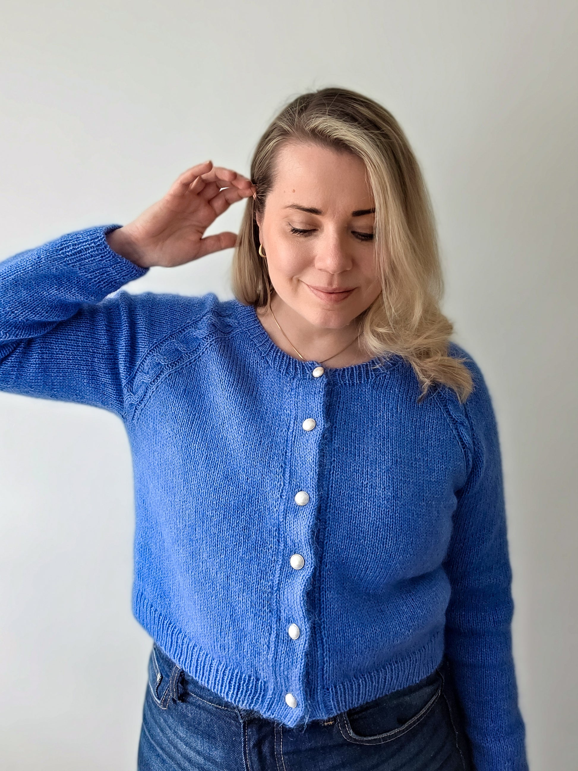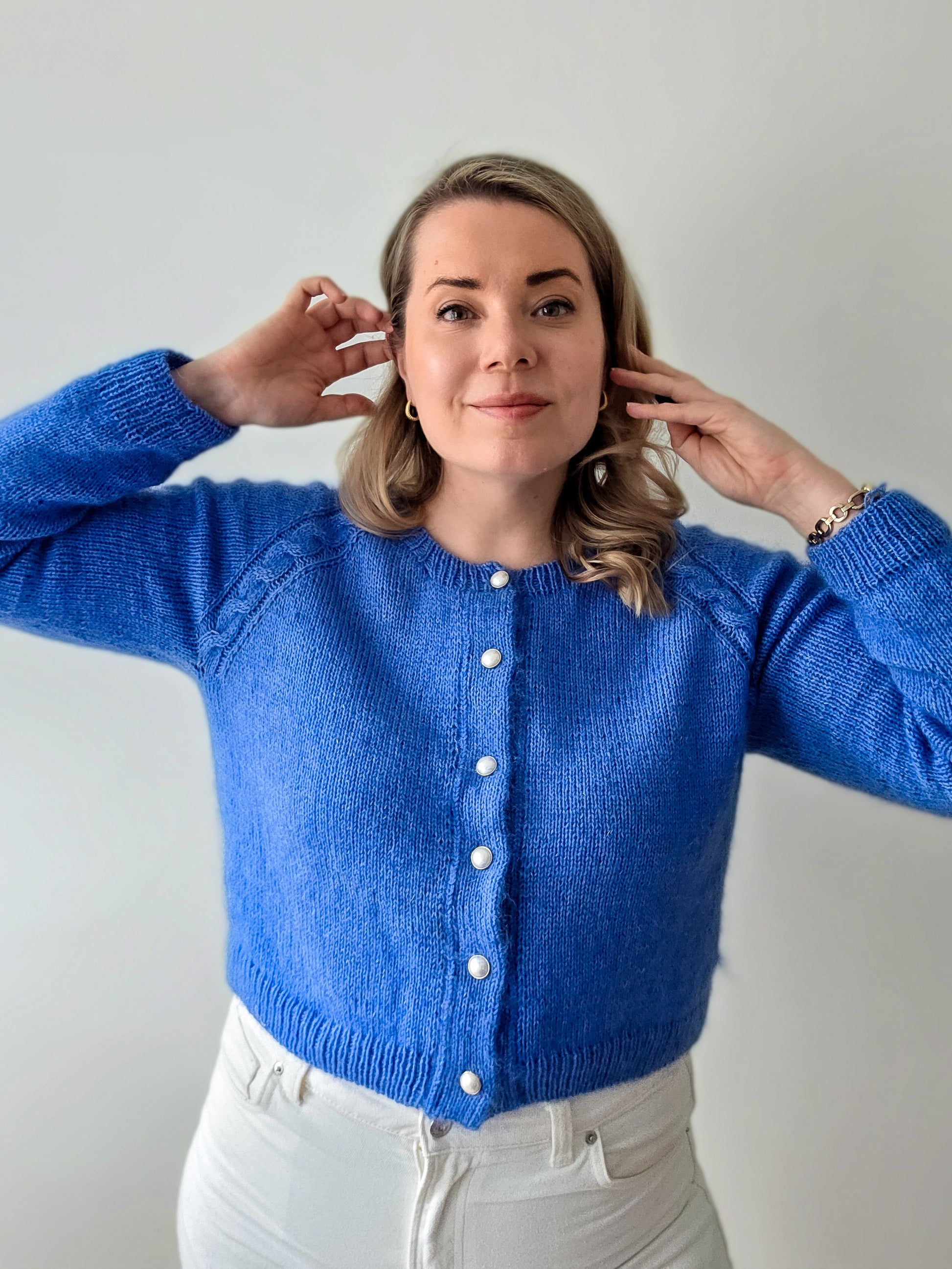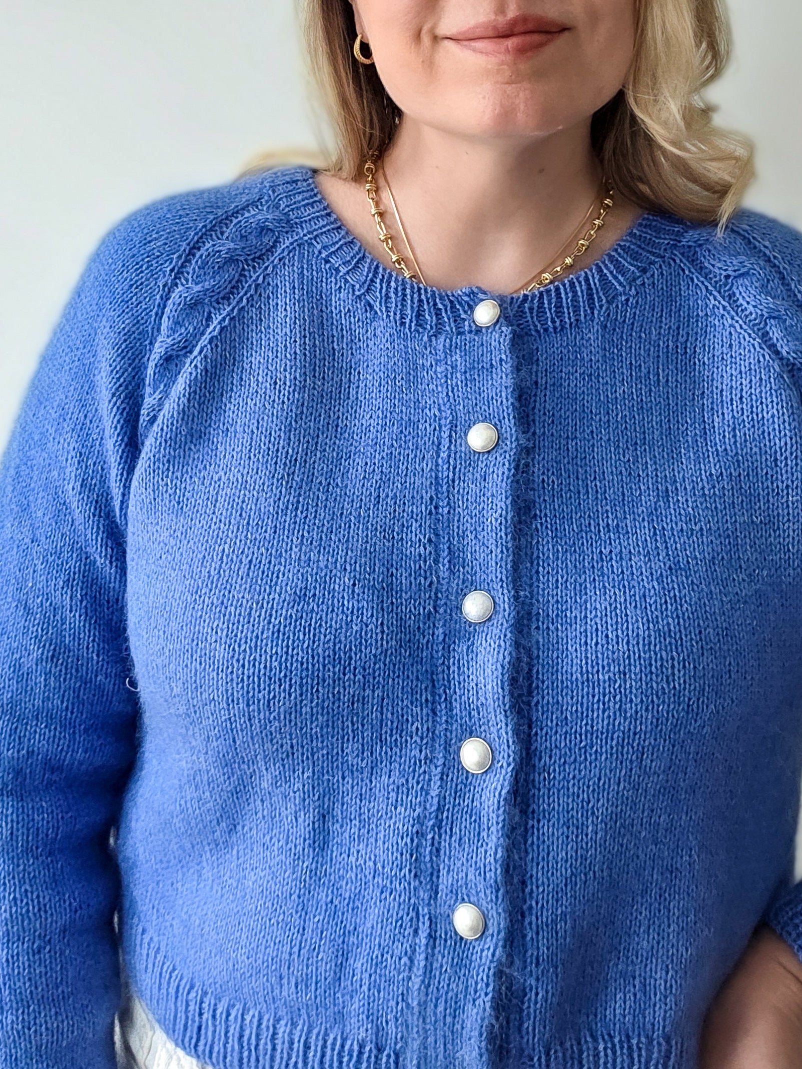 The Rainy day cardigan is knitted seamlessly top-down starting at the neckline. A simple cable pattern is worked at each raglan. The cable pattern is easy to memorize and suitable for knitters who are just learning to knit cables. The sleeves and body are separated at the underarm and knitted separately. Lastly the neckband is picked up from the body and knitted flat.