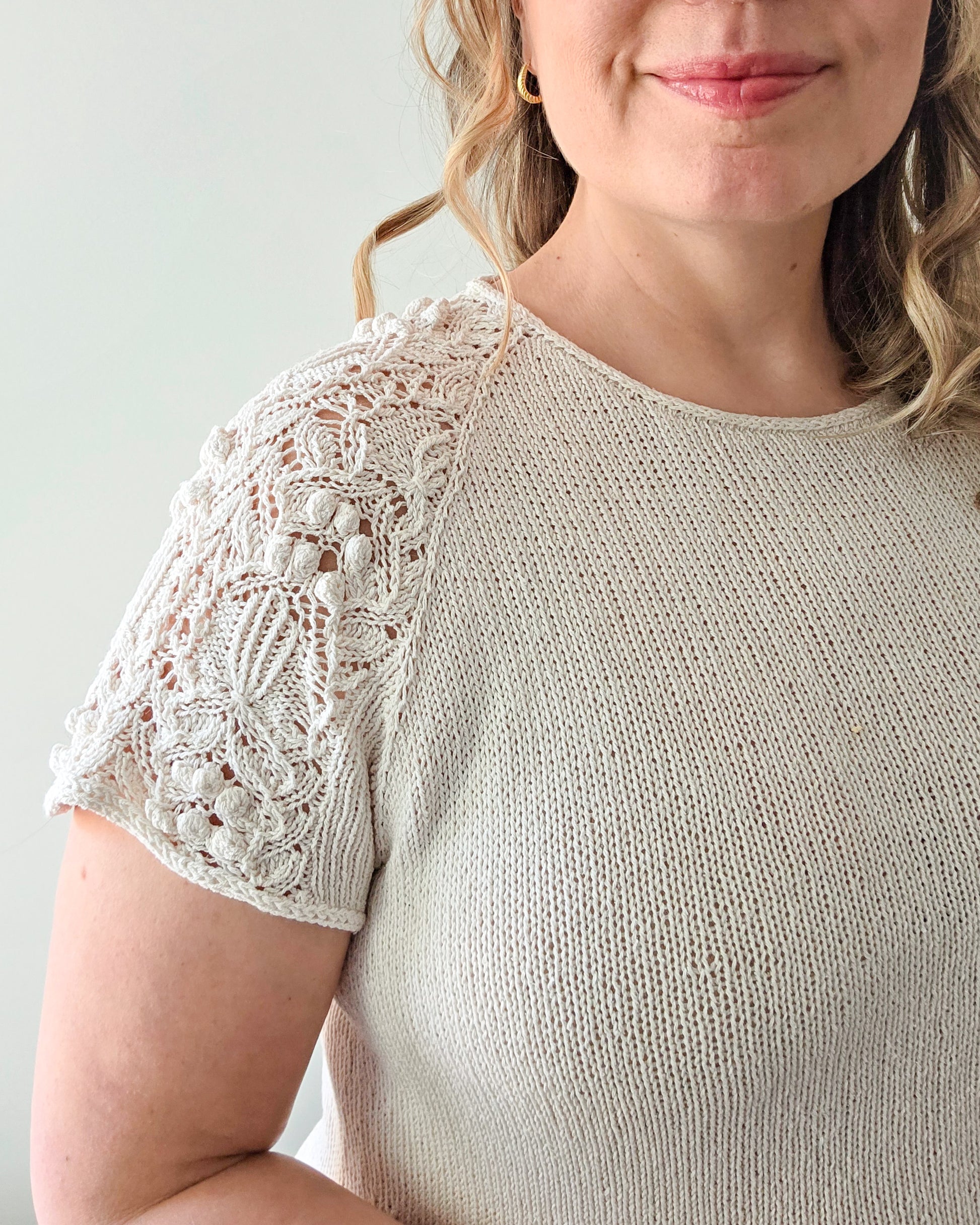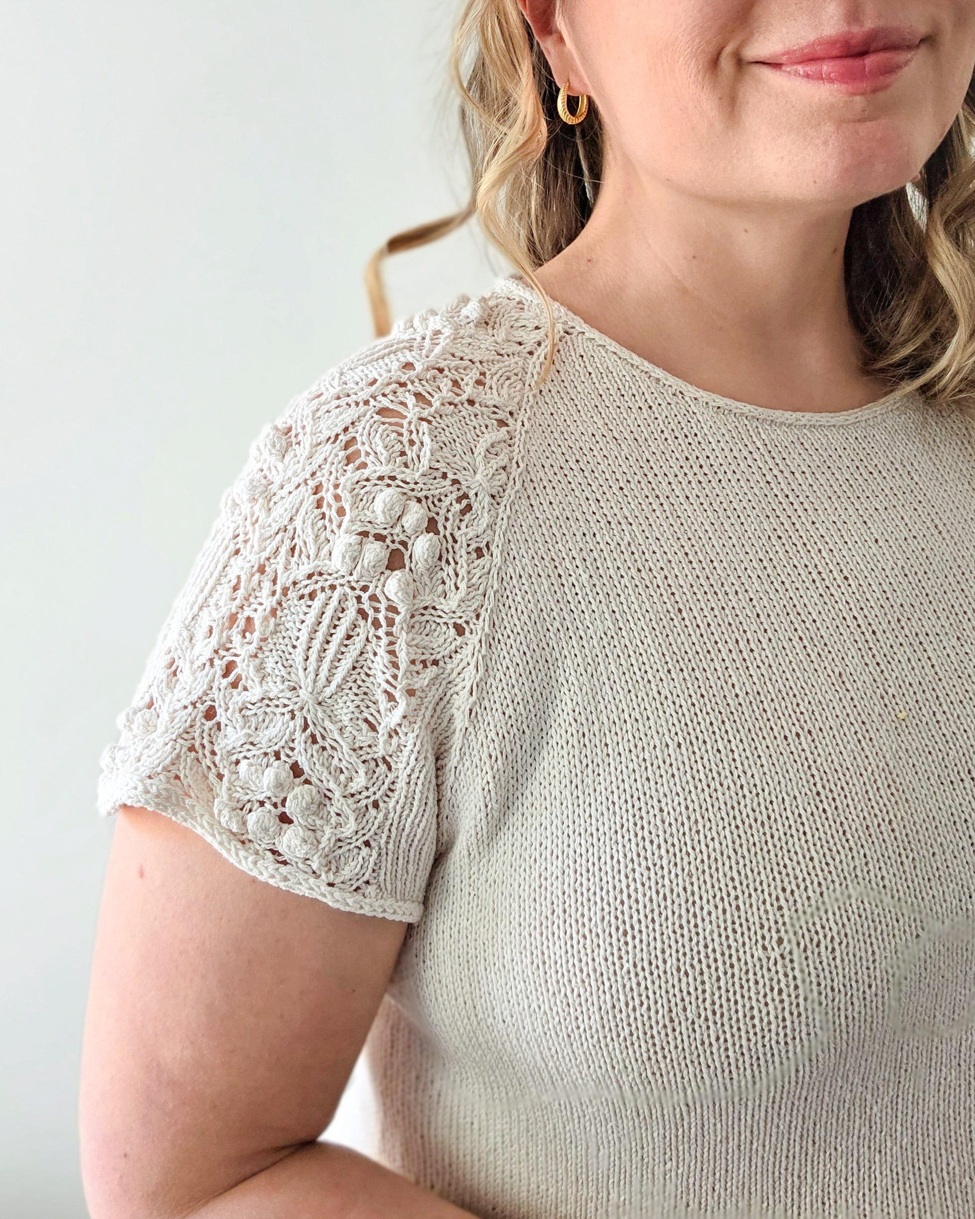 The Rococo Raglan tee is knitted seamlessly from the top down. The neck shaping is worked flat after which the rest of the tee is worked in the round. The lace pattern is knitted on the sleeves and the front and back of the tee is in Stockinette stitch. The hem is folded double to give the tee a neat and finished look. The neckband and sleeve edges are finished with i-cord bind off. The lace pattern is both charted and written.