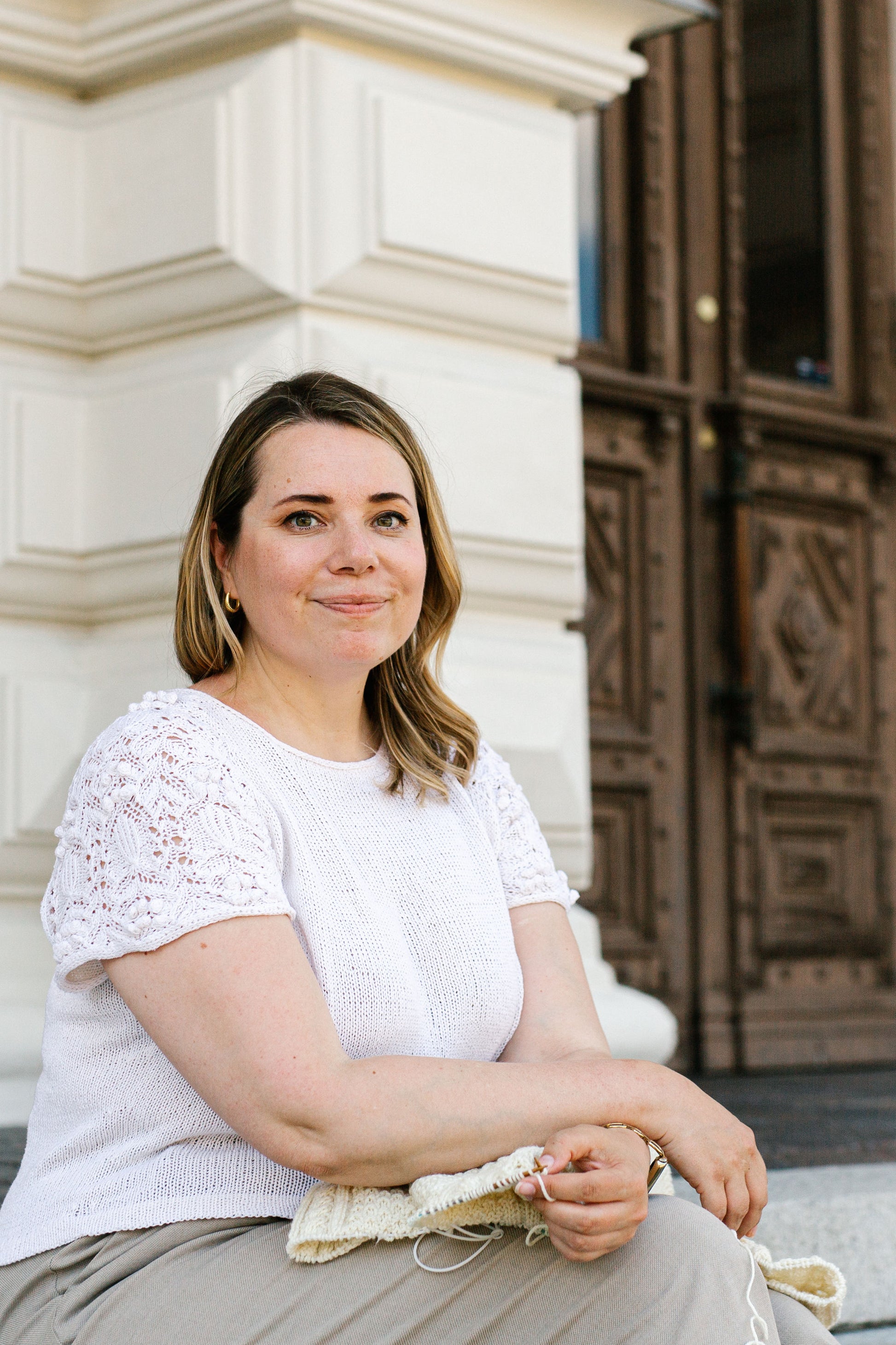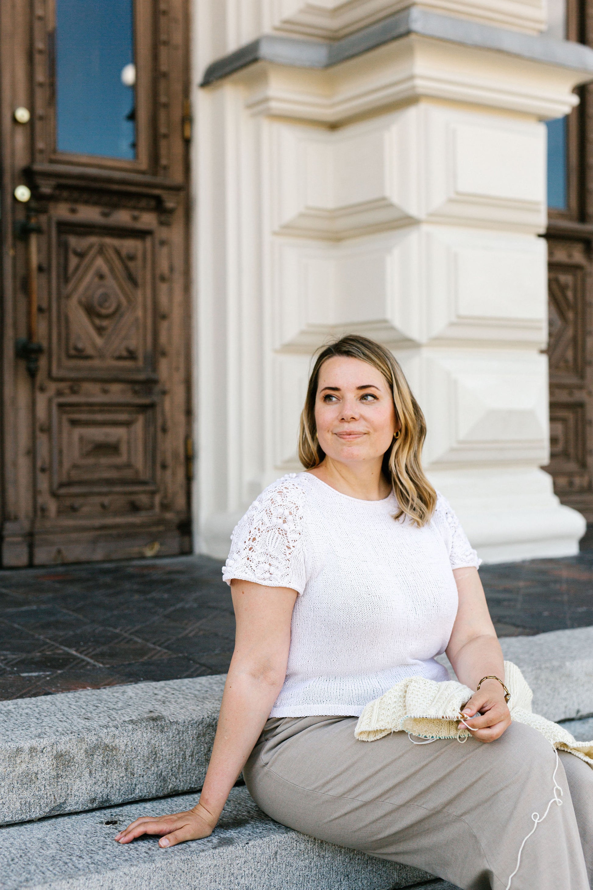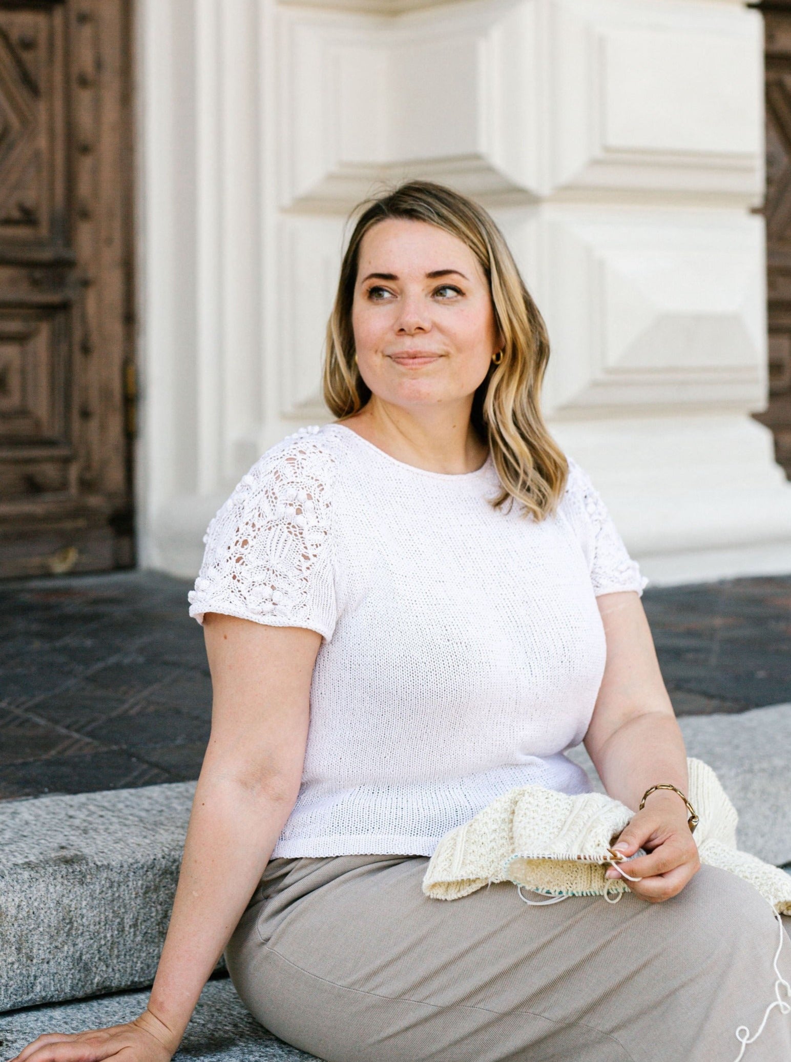 My inspiration for this tee were the slightly irregular and curvy carvings from the Rococo era, and the wrapped stitches remind me of the seashells typical for Rococo style. The lace pattern is modified from a lace chart found in the Japanese knitting stitch bible by Hitomi Shida.