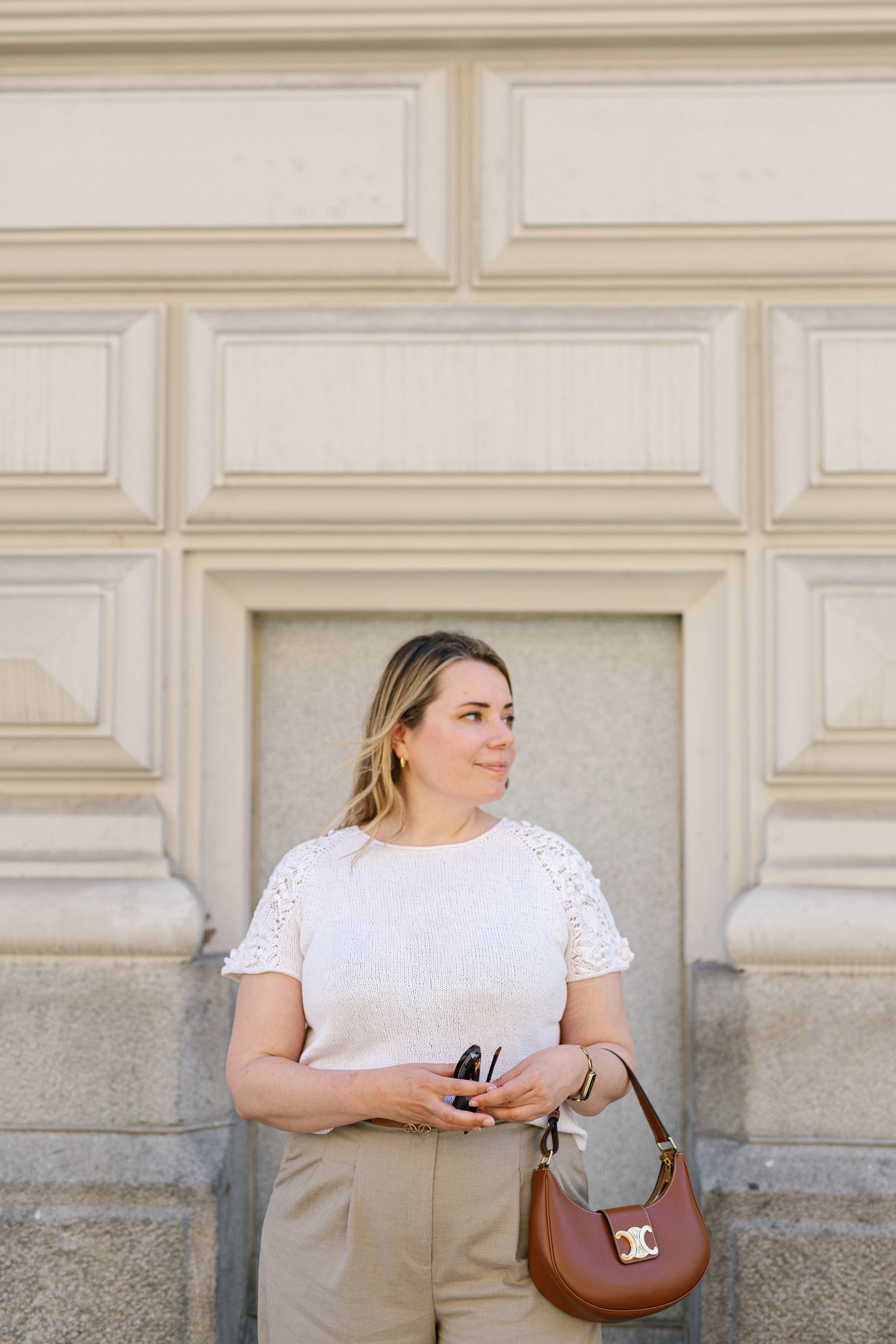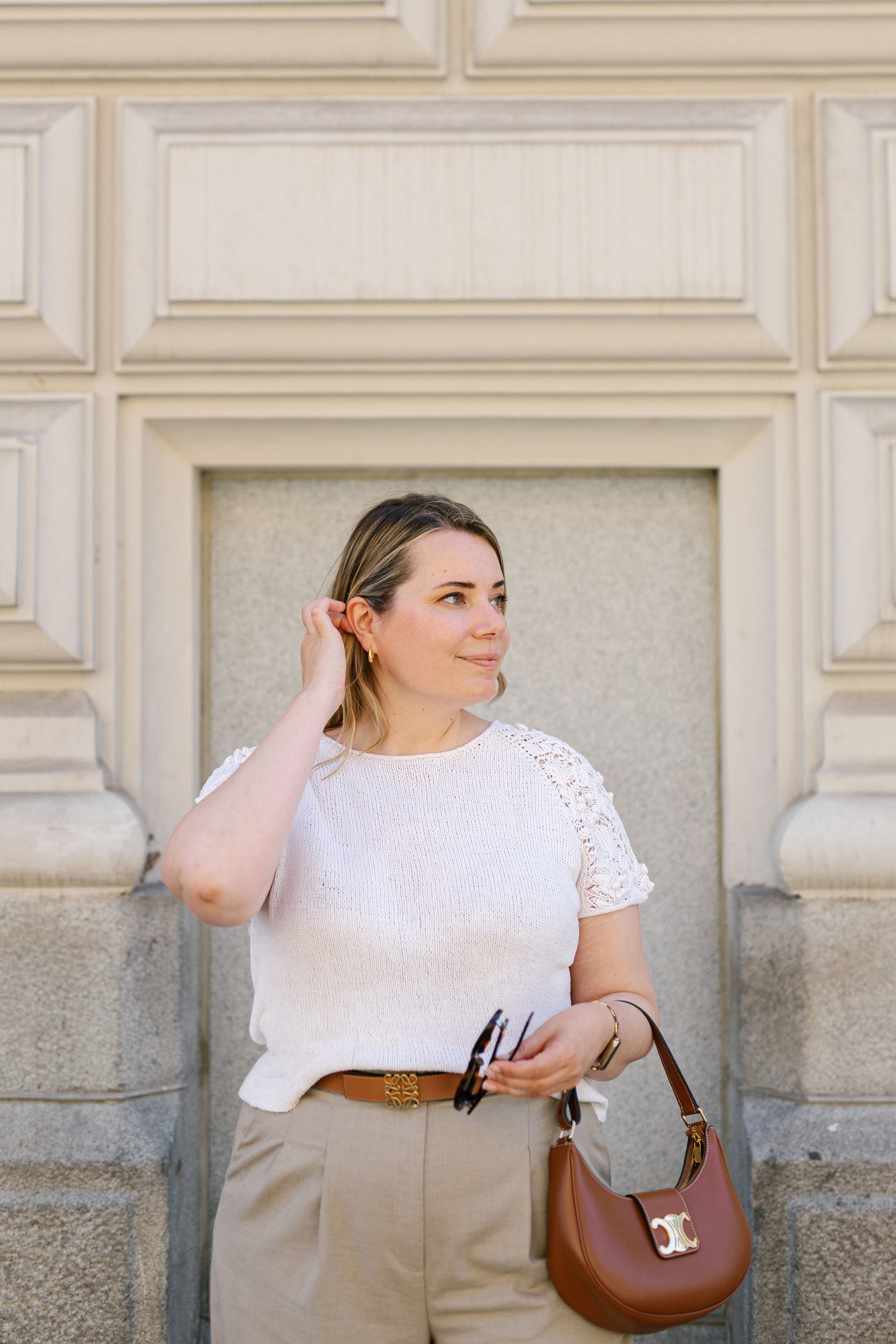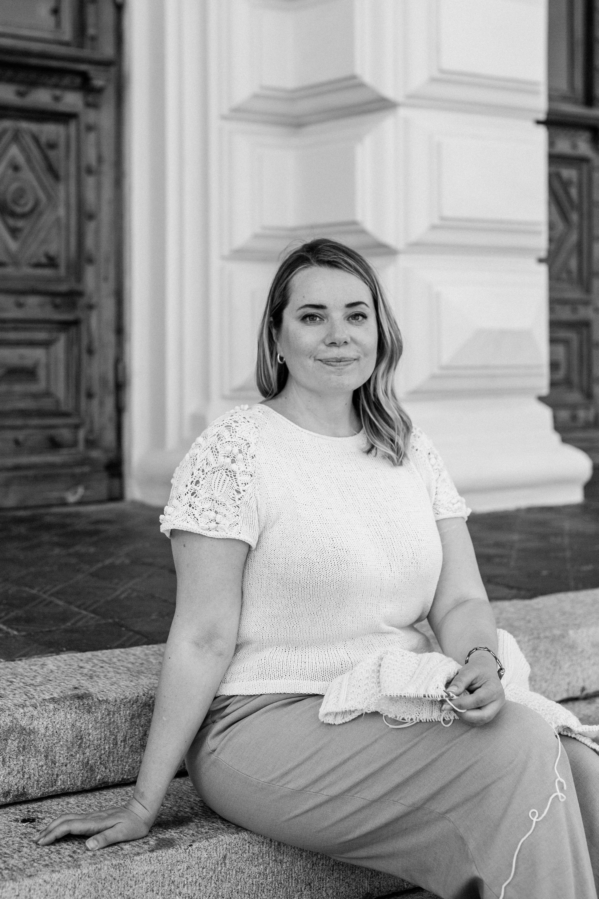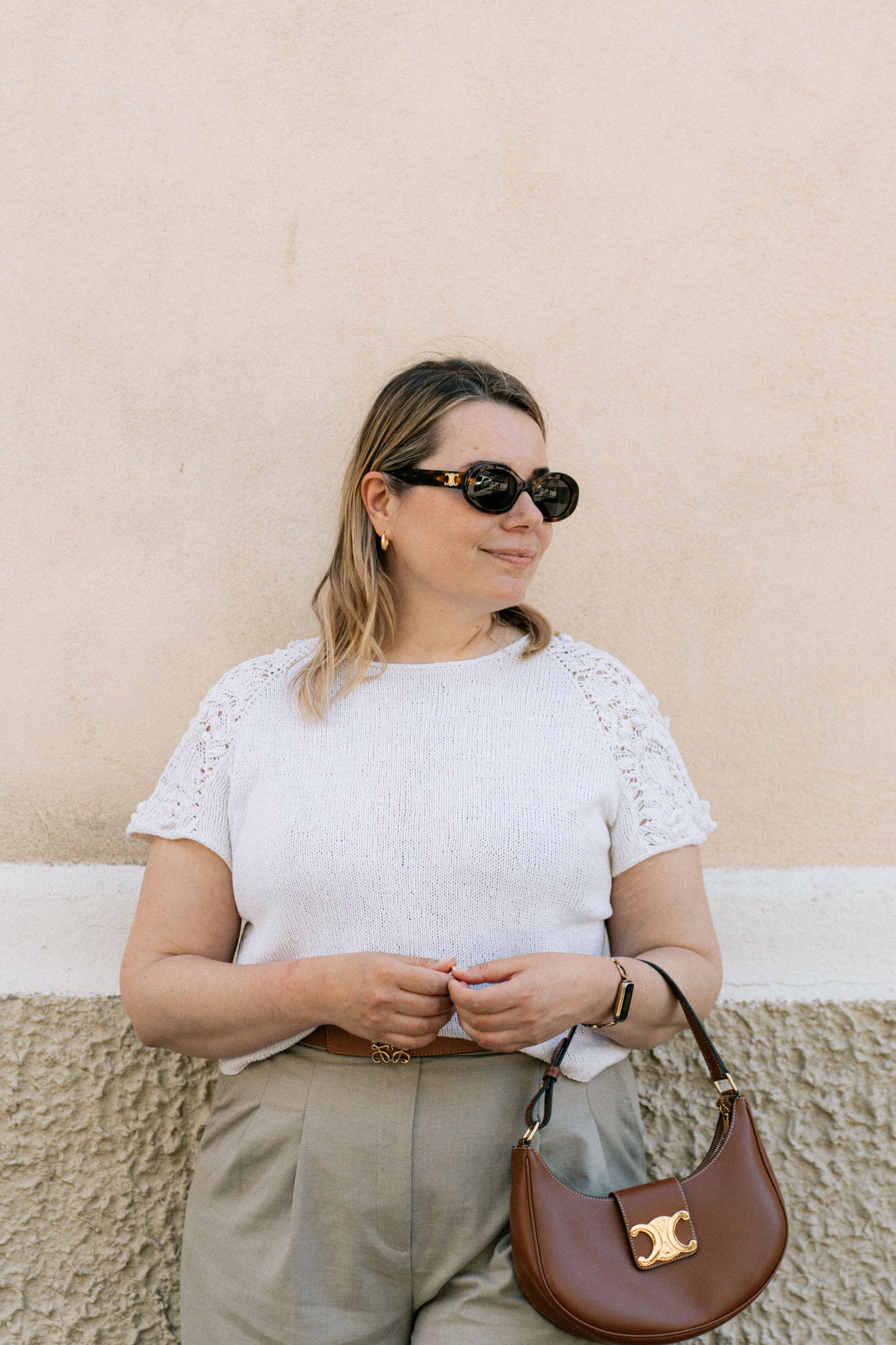 My inspiration for this tee were the slightly irregular and curvy carvings from the Rococo era, and the wrapped stitches remind me of the seashells typical for Rococo style. The lace pattern is modified from a lace chart found in the Japanese knitting stitch bible by Hitomi Shida.