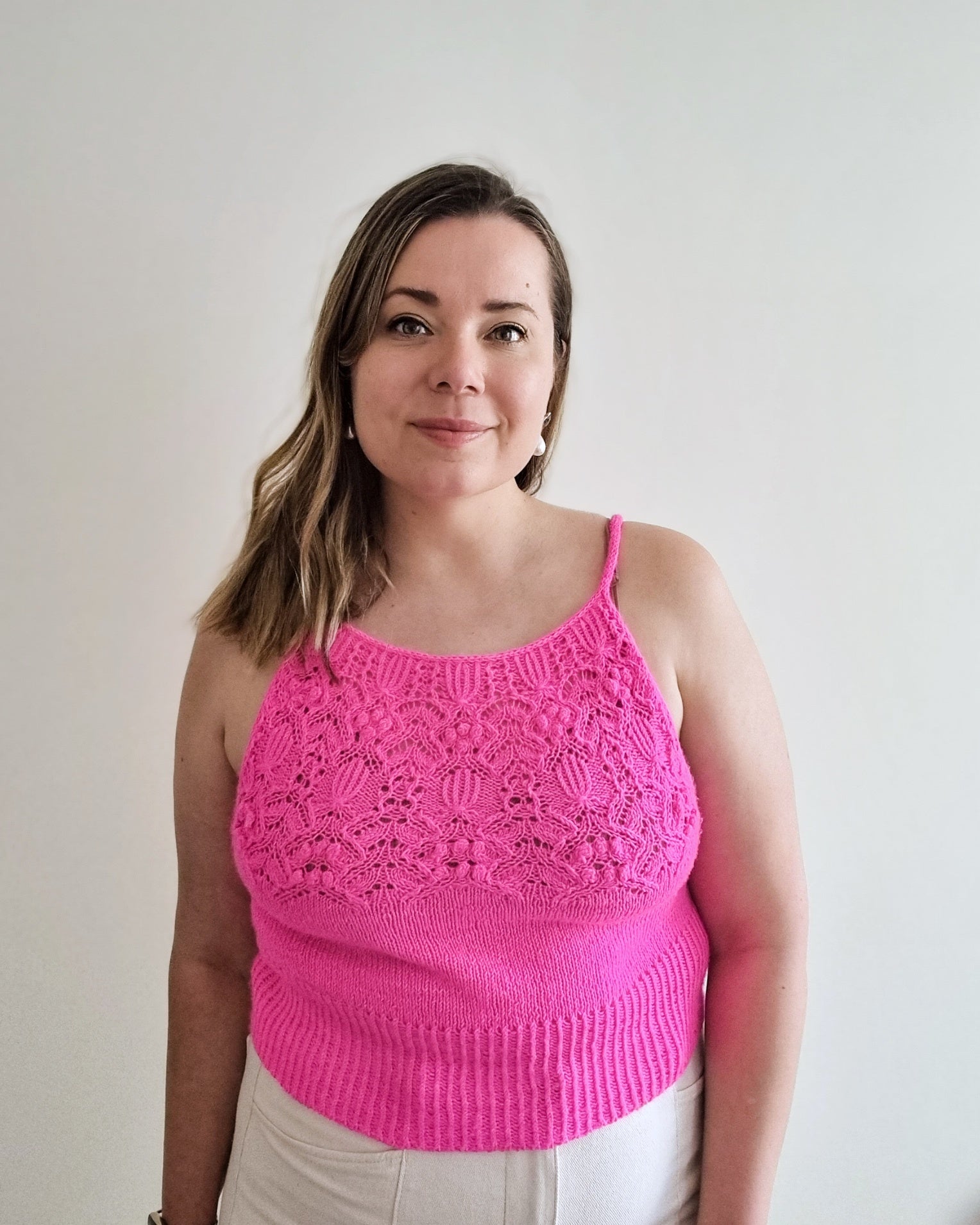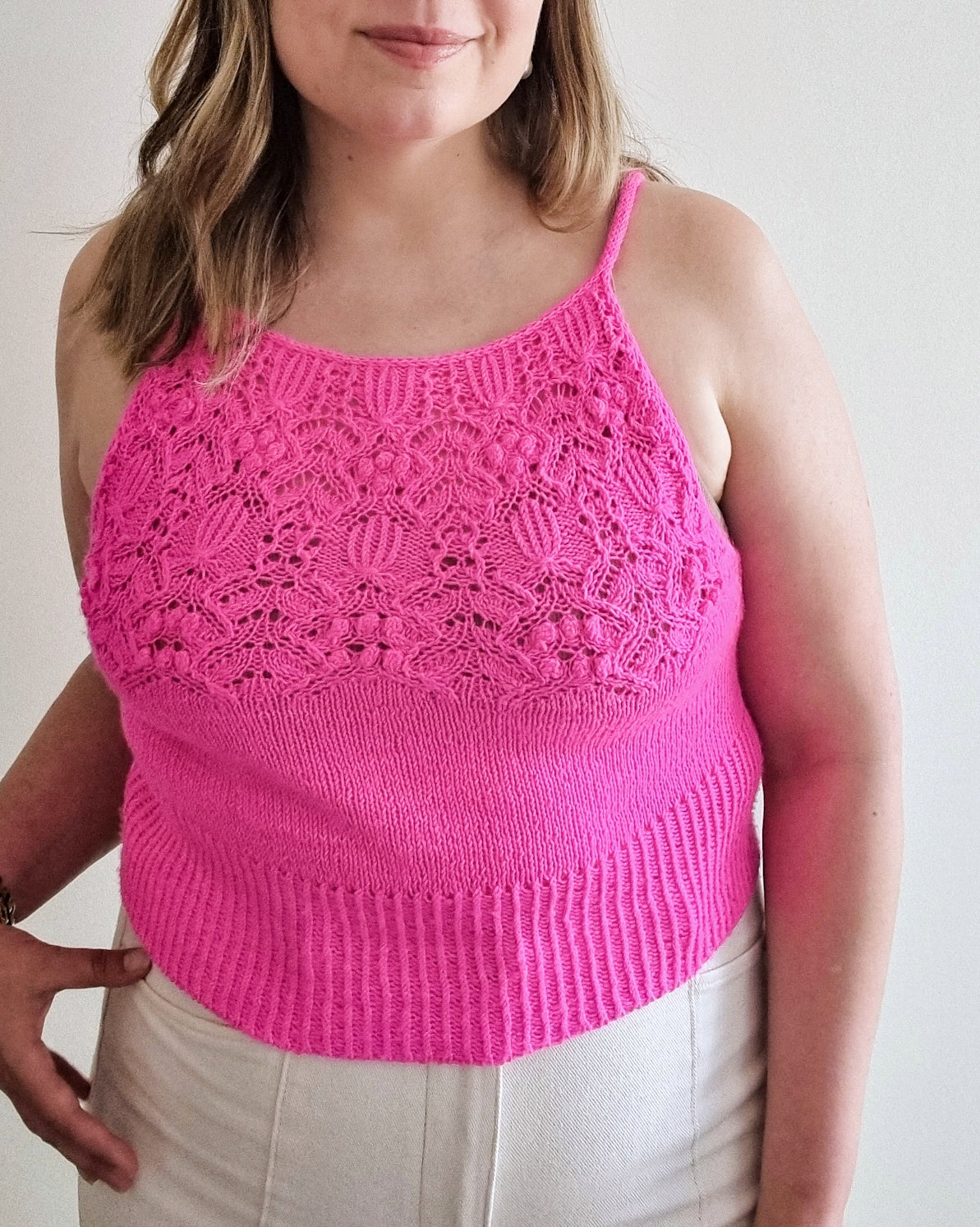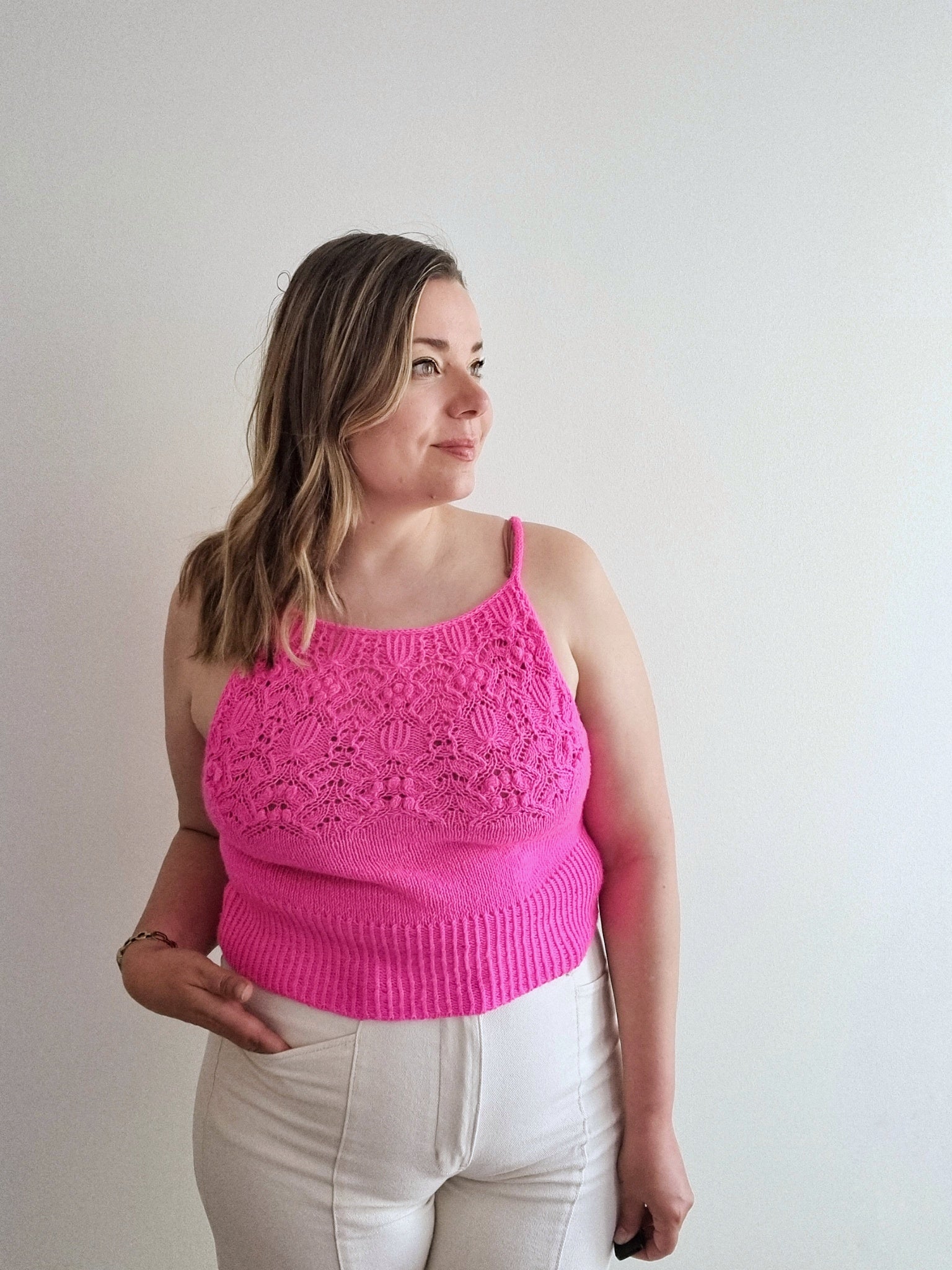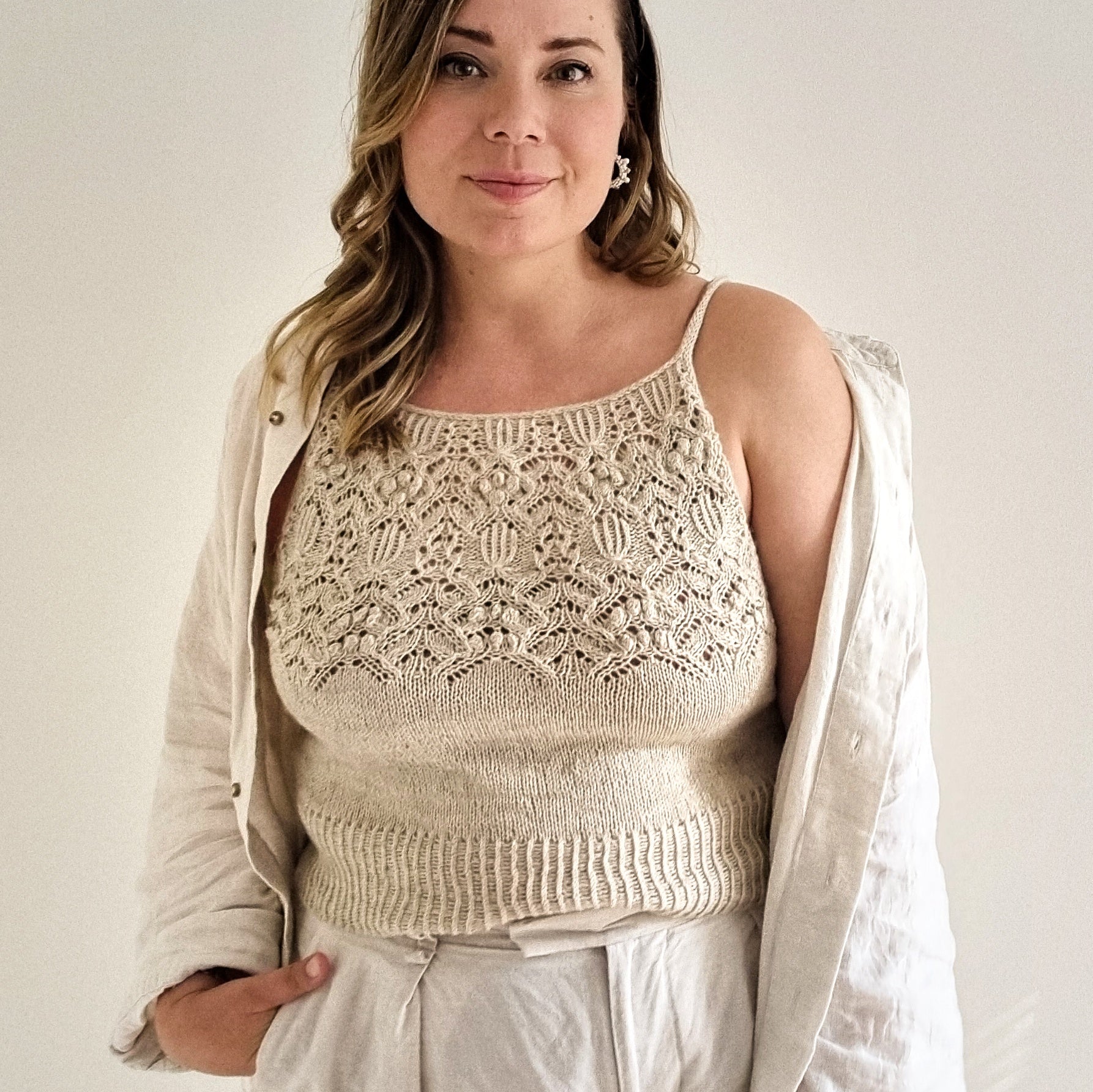 The Rococo top is knitted seamlessly from the top down with the beautiful lace pattern on the front and back. The back and front are knitted separately down to the armholes. Then the pieces are joined and the body is knitted in the round. The hem is knitted in twisted ribbing. The top of the front and back are finished with an i-cord edging that continues seamlessly into the straps.
