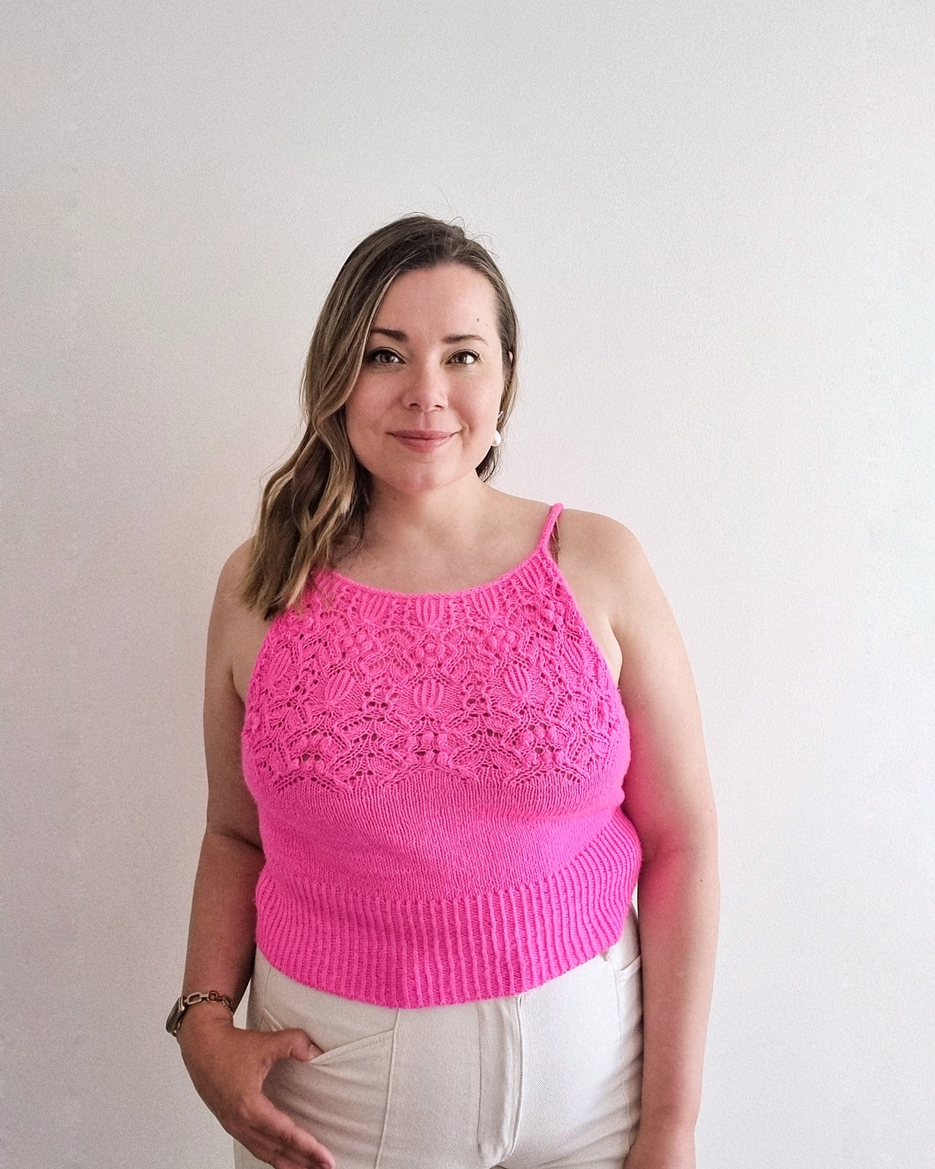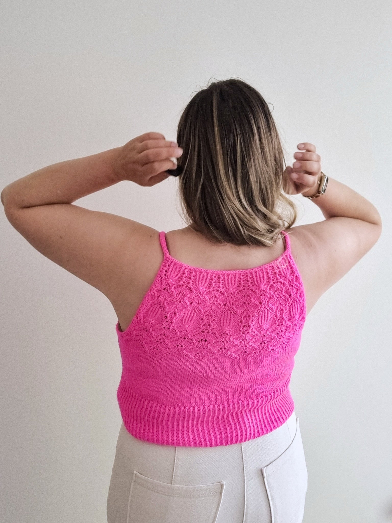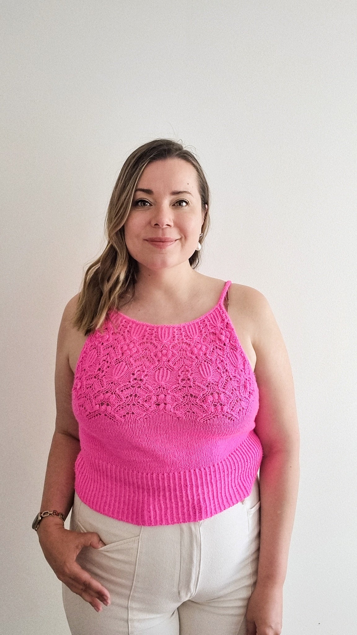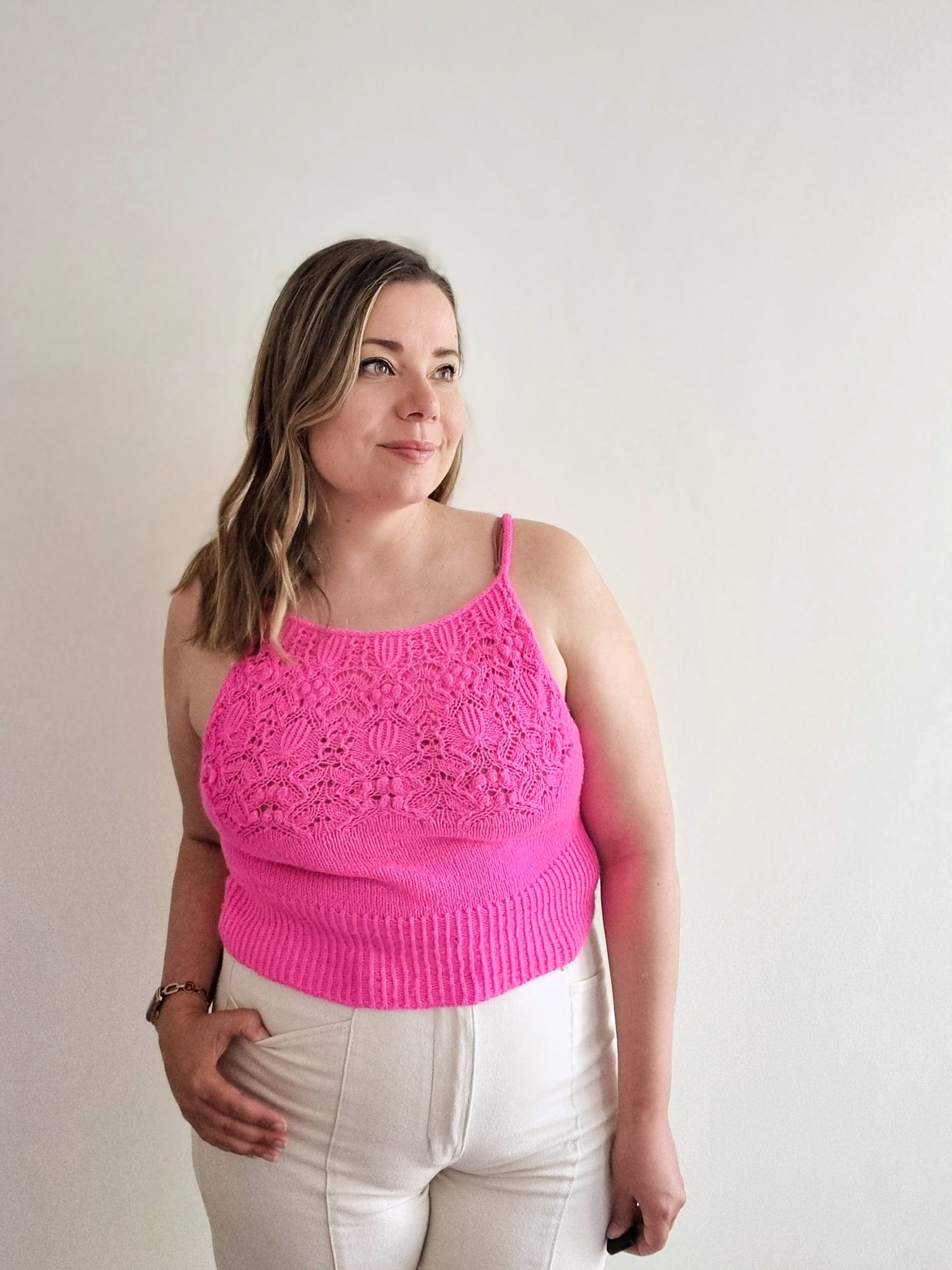 The Rococo top is knitted seamlessly from the top down with the beautiful lace pattern on the front and back. The back and front are knitted separately down to the armholes. Then the pieces are joined and the body is knitted in the round. The hem is knitted in twisted ribbing. The top of the front and back are finished with an i-cord edging that continues seamlessly into the straps.