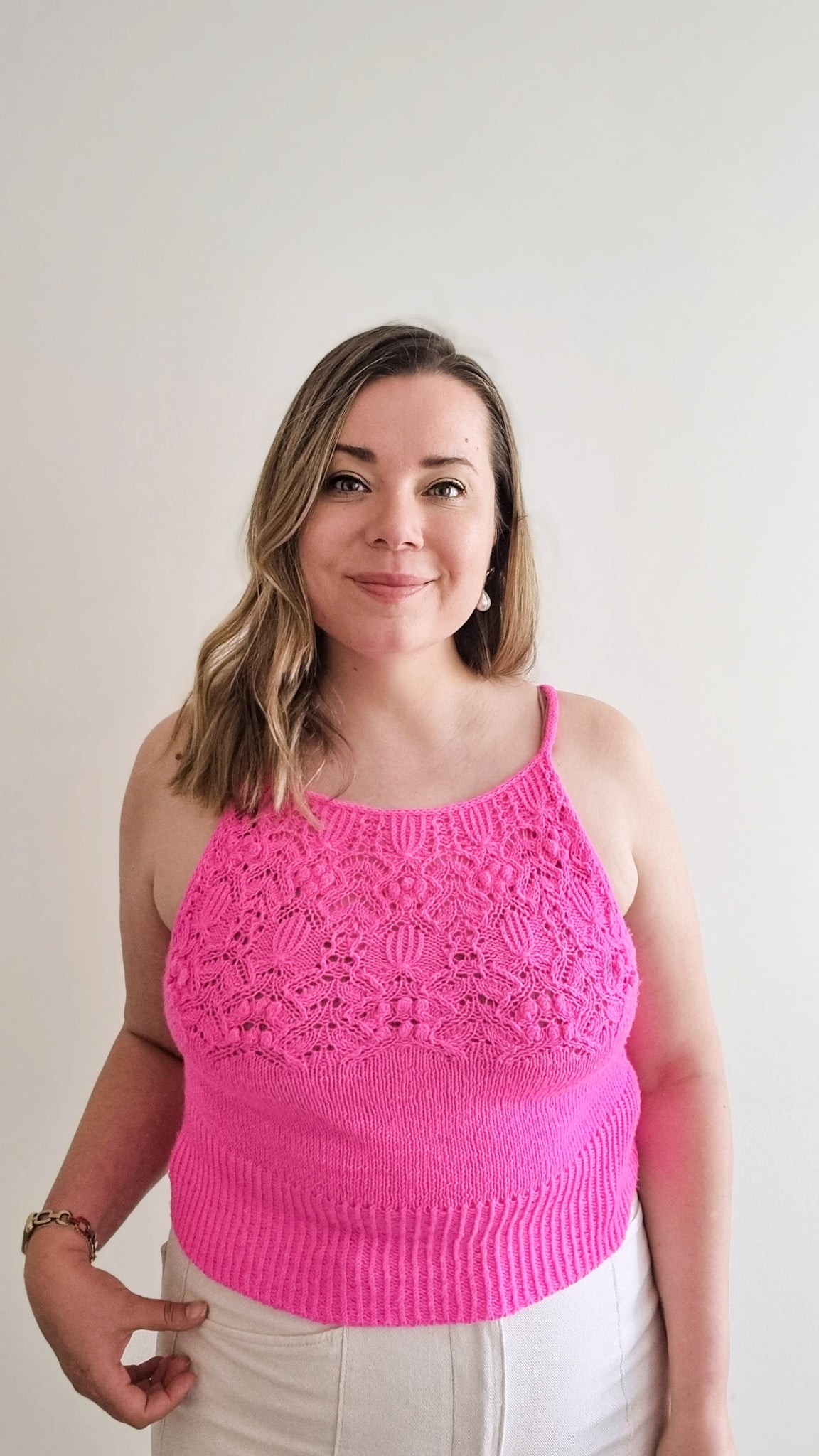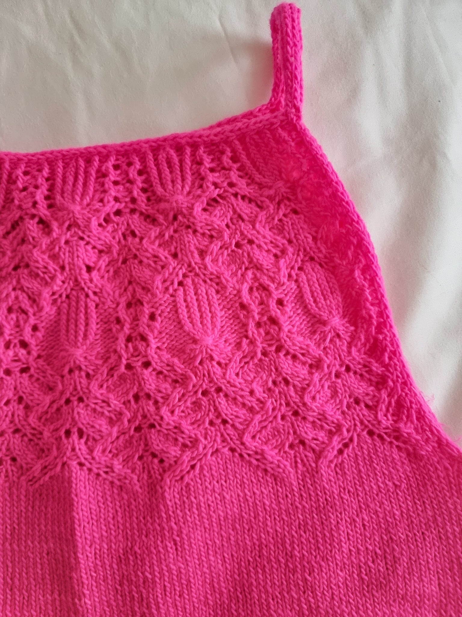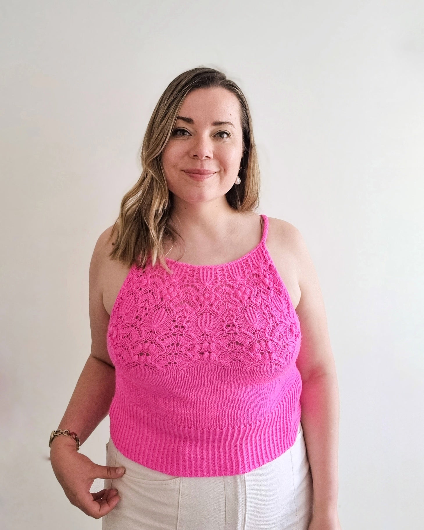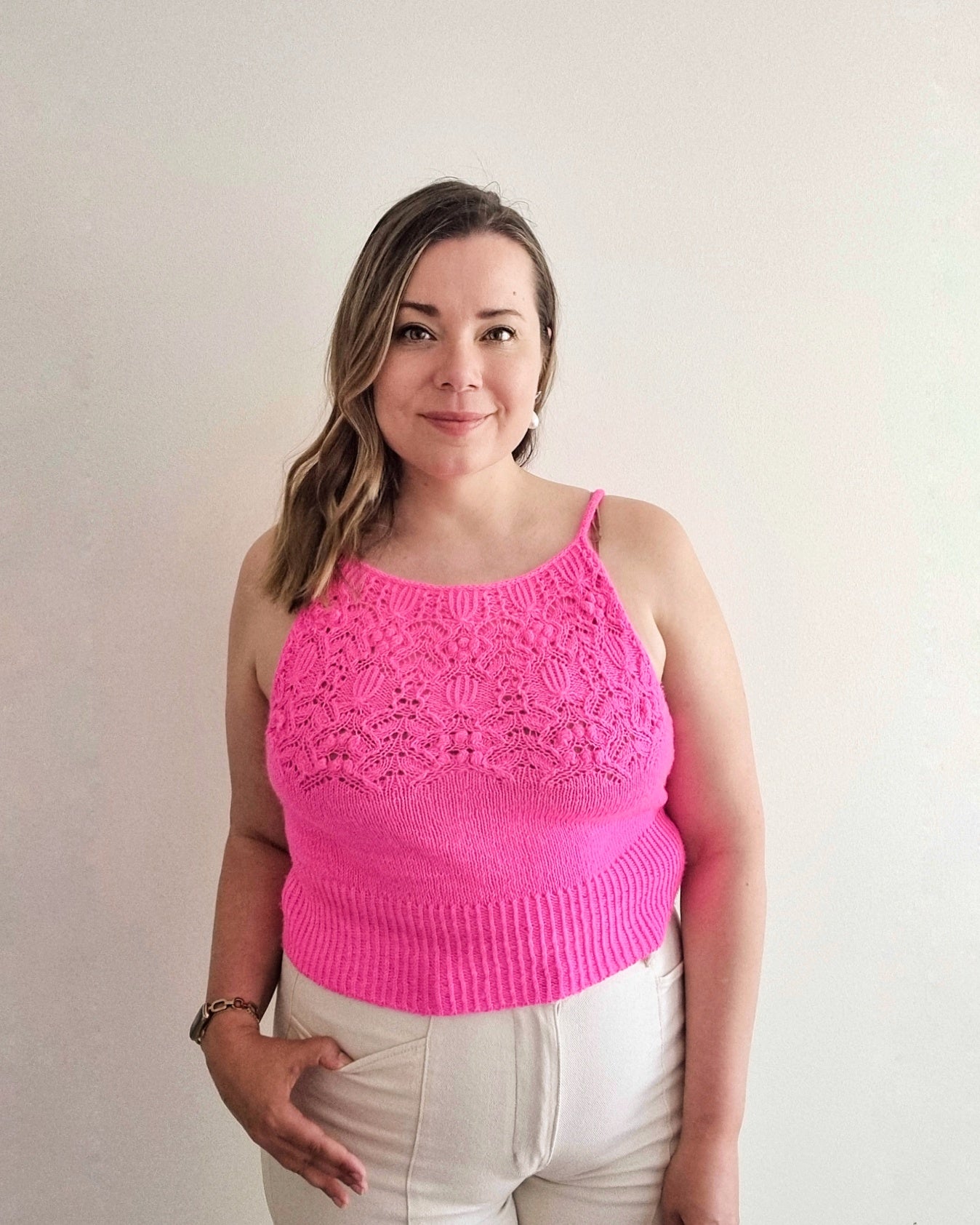 The Rococo top is knitted seamlessly from the top down with the beautiful lace pattern on the front and back. The back and front are knitted separately down to the armholes. Then the pieces are joined and the body is knitted in the round. The hem is knitted in twisted ribbing. The top of the front and back are finished with an i-cord edging that continues seamlessly into the straps.