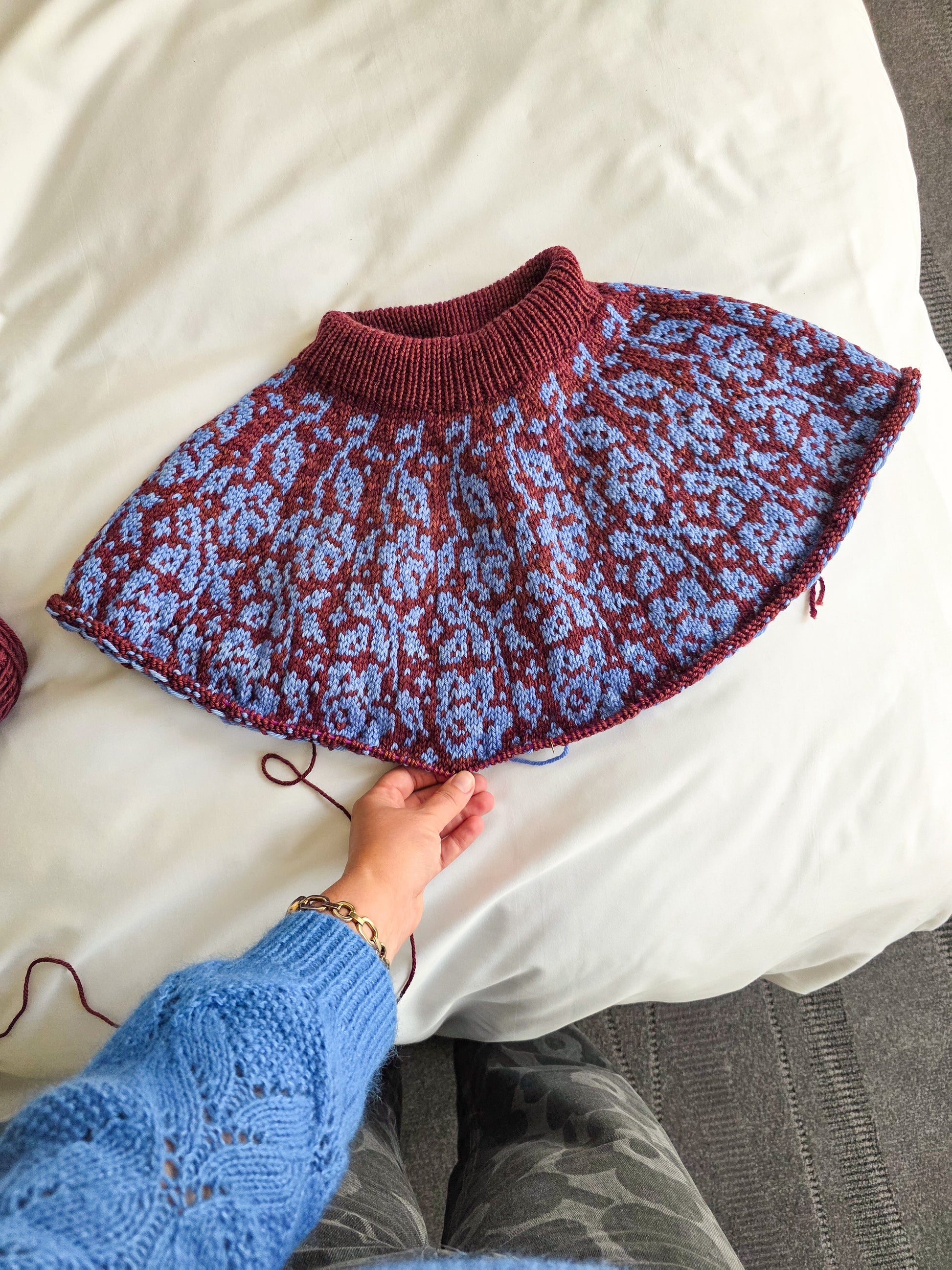 The Rose City Pullover is a seamless top-down sweater featuring a beautifully stranded rose motif across the yoke. Inspired by Portland—affectionately known as the City of Roses—this design captures the charm and creative spirit of its namesake city. The sweater begins at the neckband and is worked in the round with a circular yoke construction. The stranded colorwork incorporates the yoke increases into the rose pattern, creating a smooth, uninterrupted design.