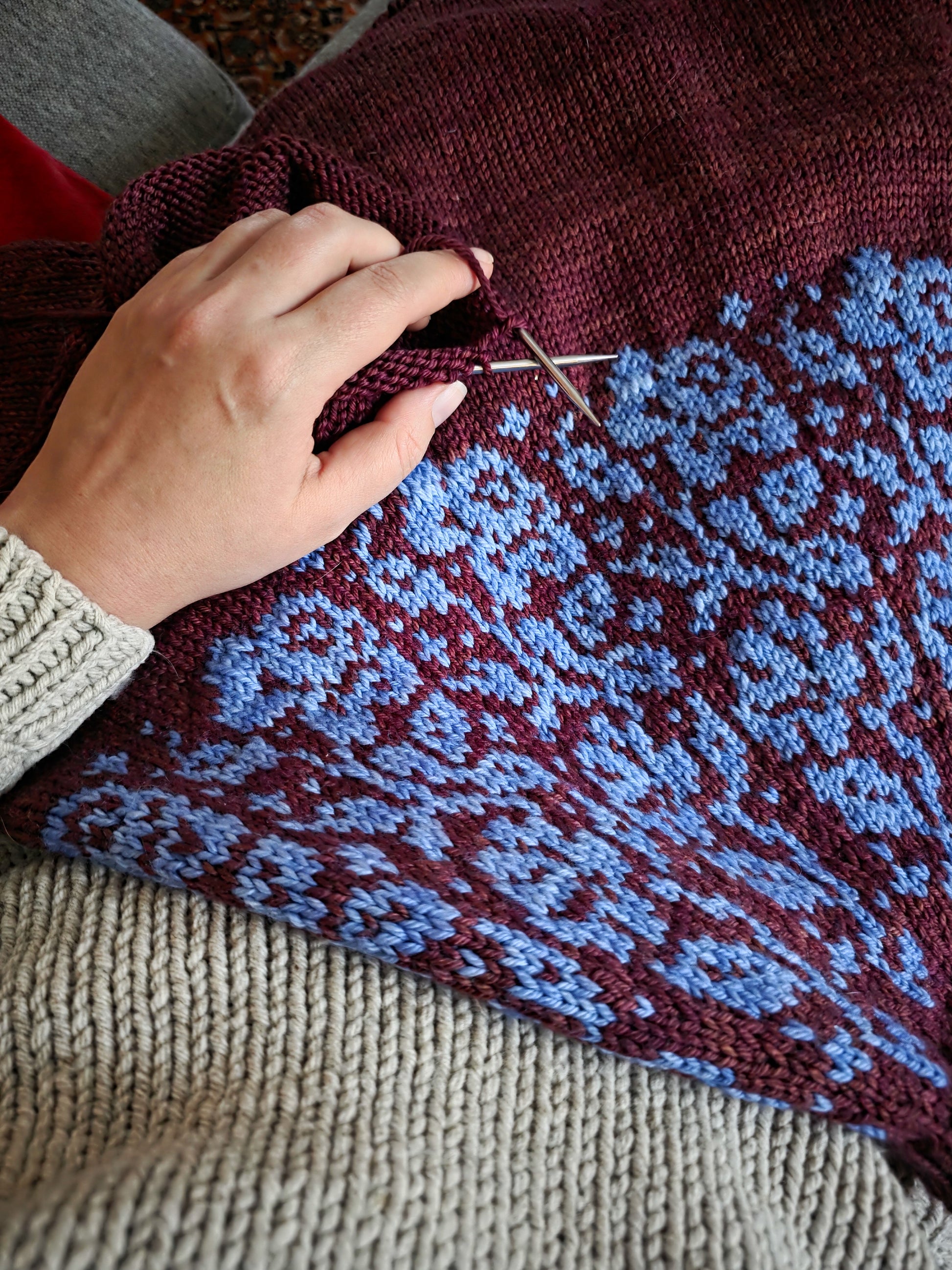 Note: Always use the needle size that gets you the right gauge! I recommend knitting the colorwork using a needle one size larger than you would normally use for Stockinette stitch with the same yarn weight.